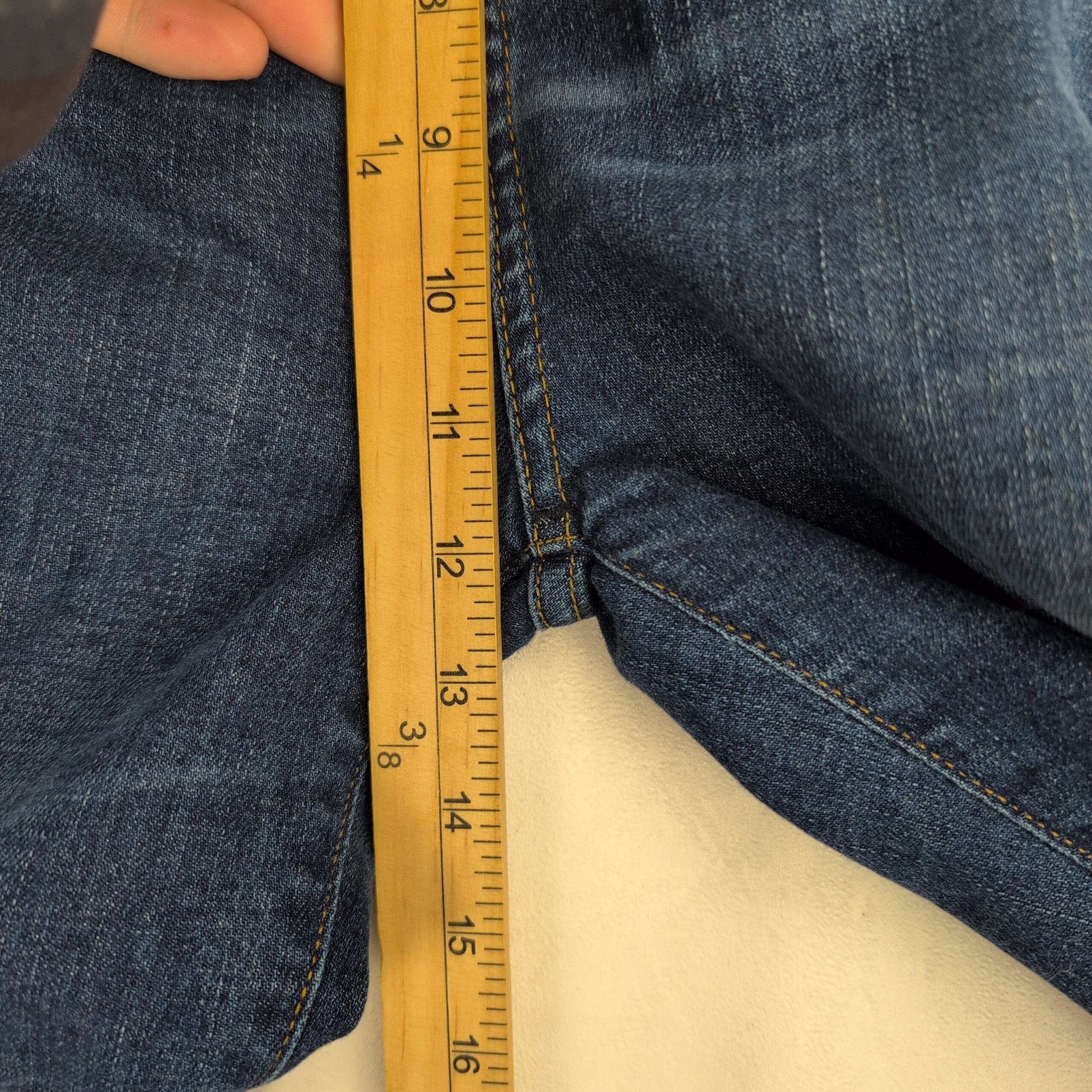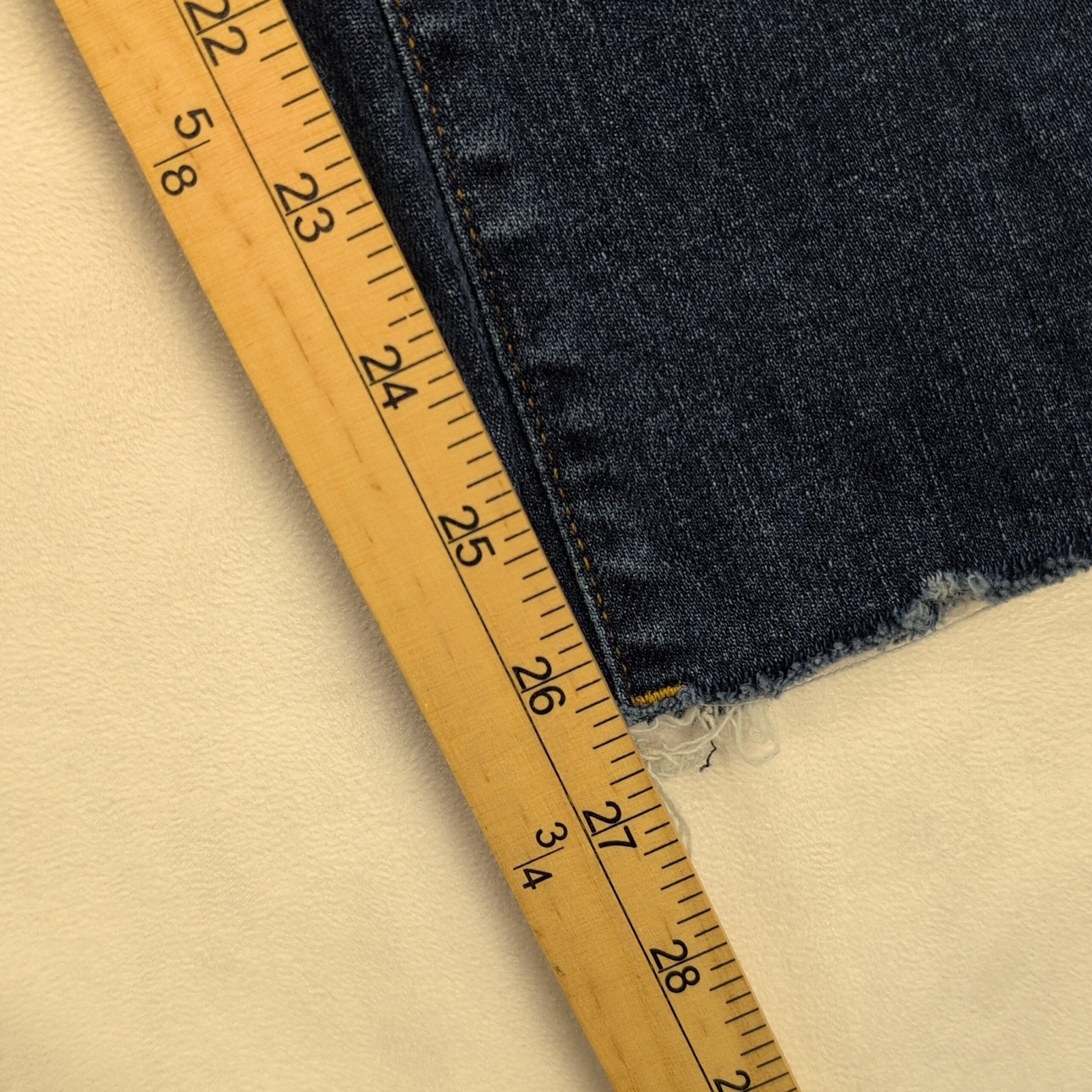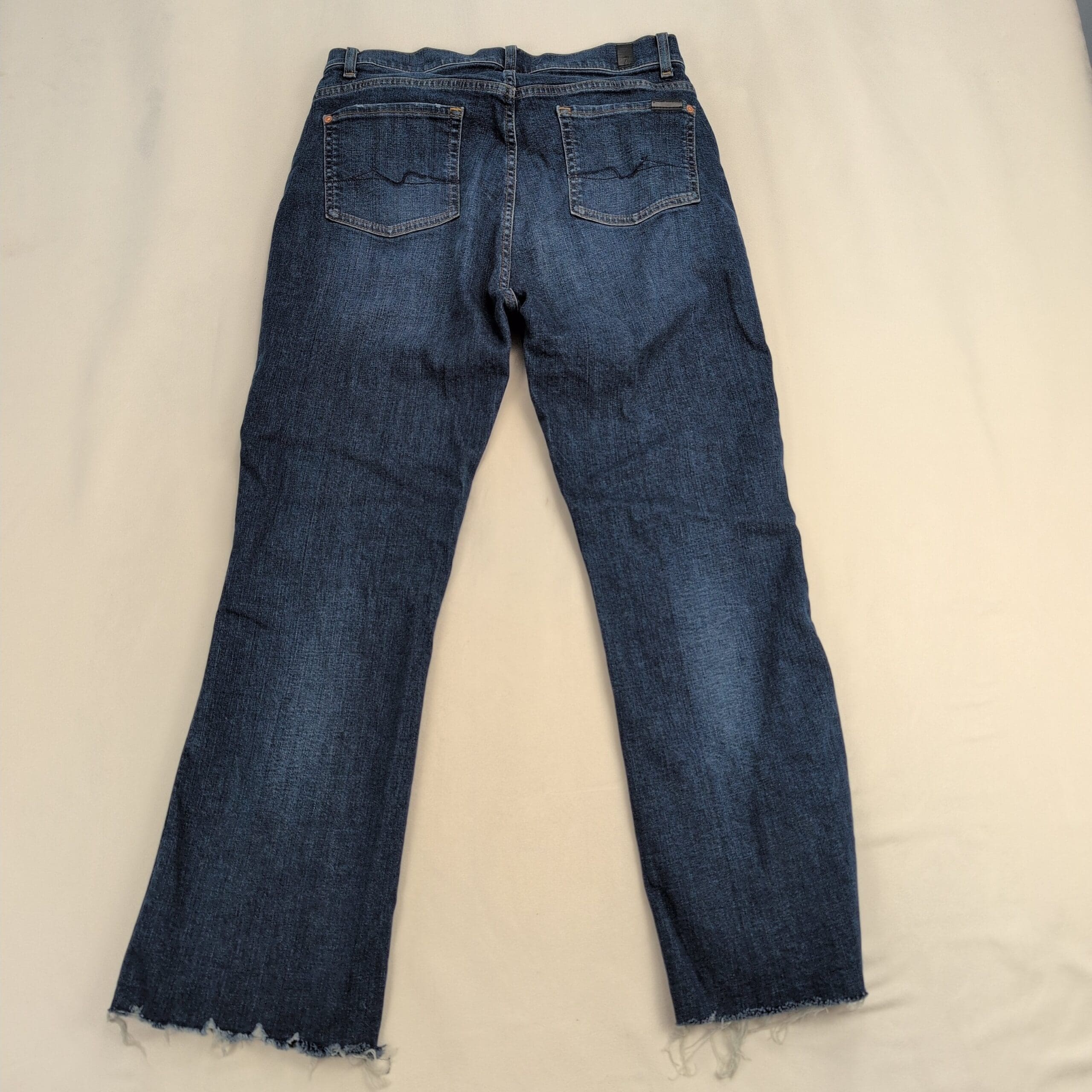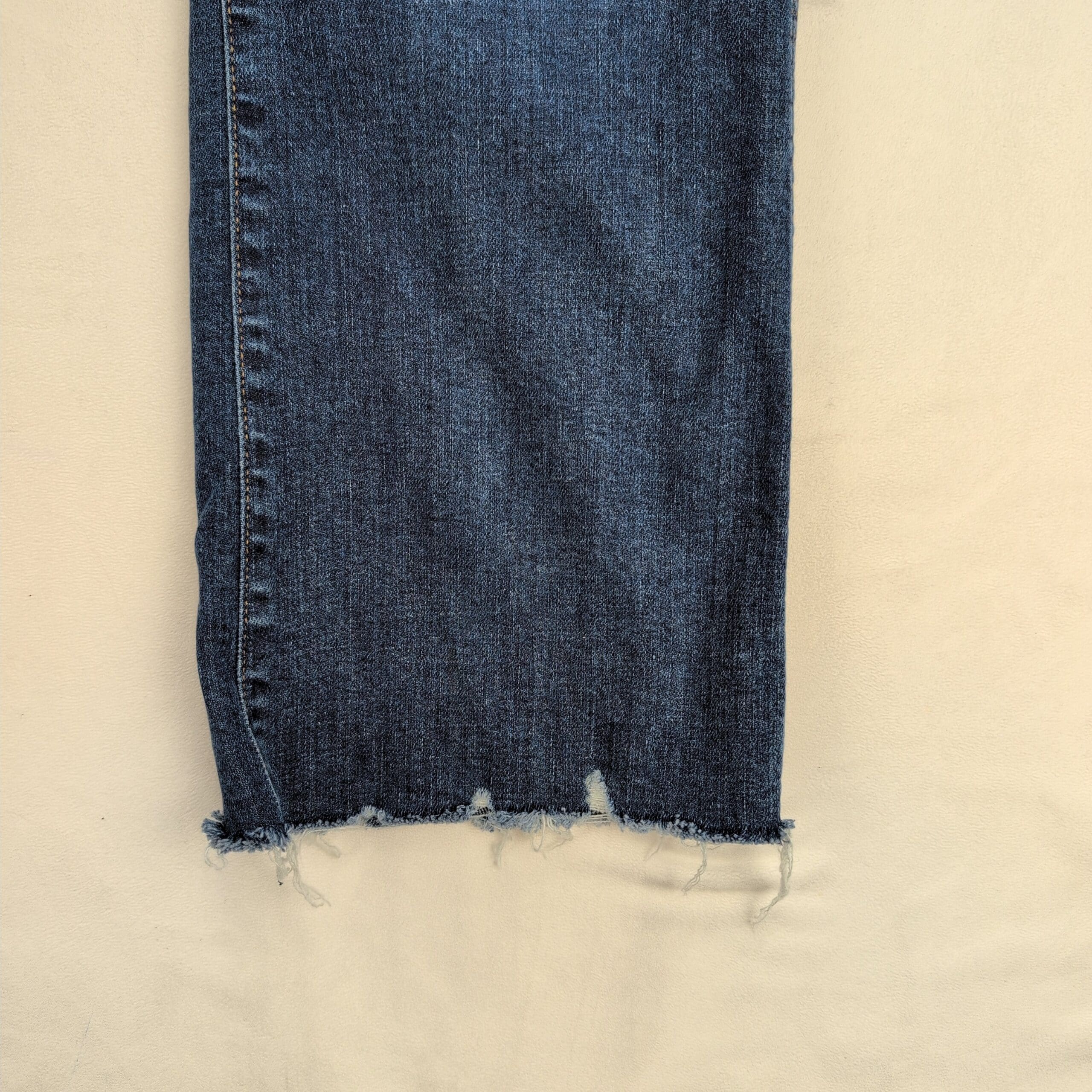 Condition: Excellent used condition with light overall wear. Note: raw/frayed hem at the ankles (stylistic and from wear) — no major rips, stains, or other flaws visible.
