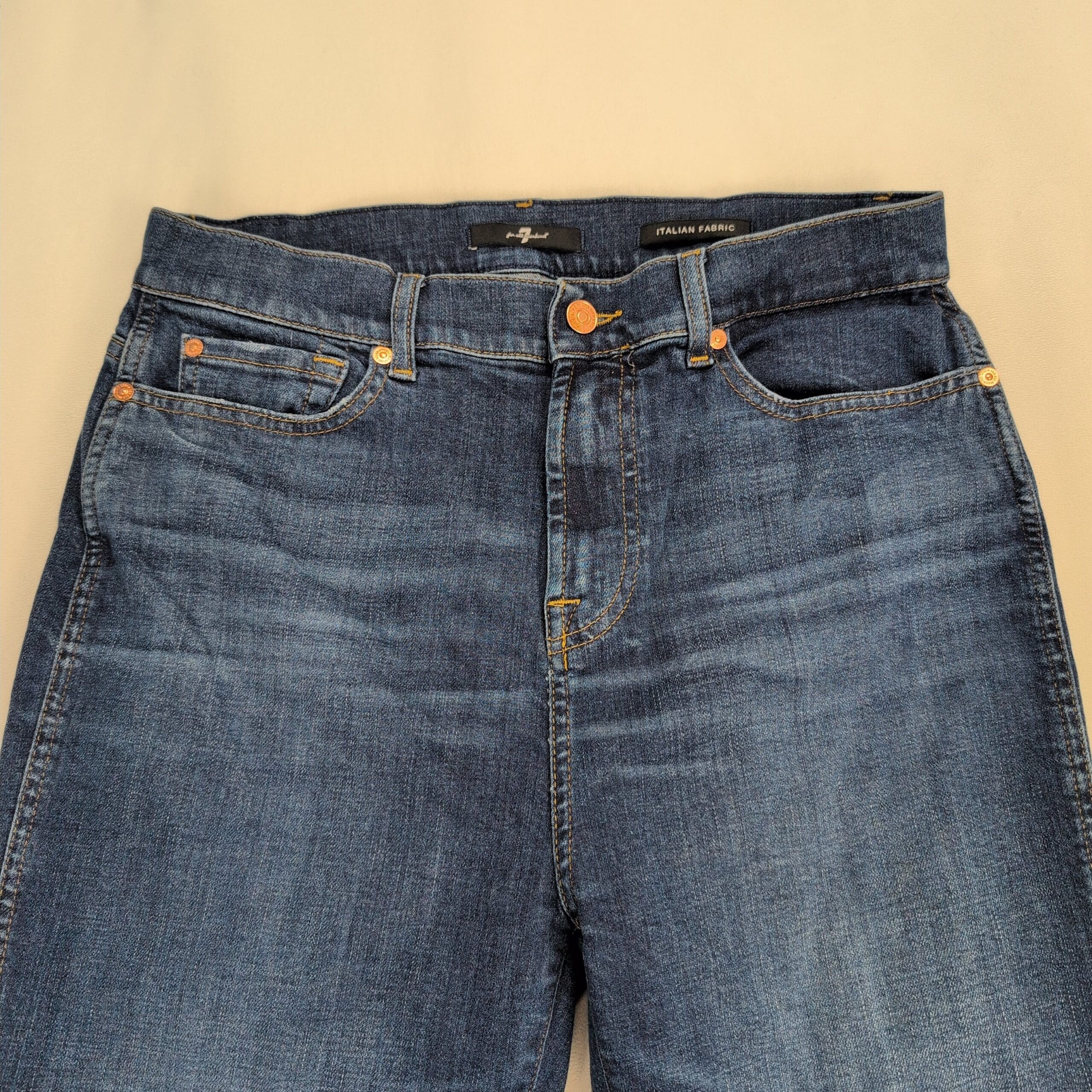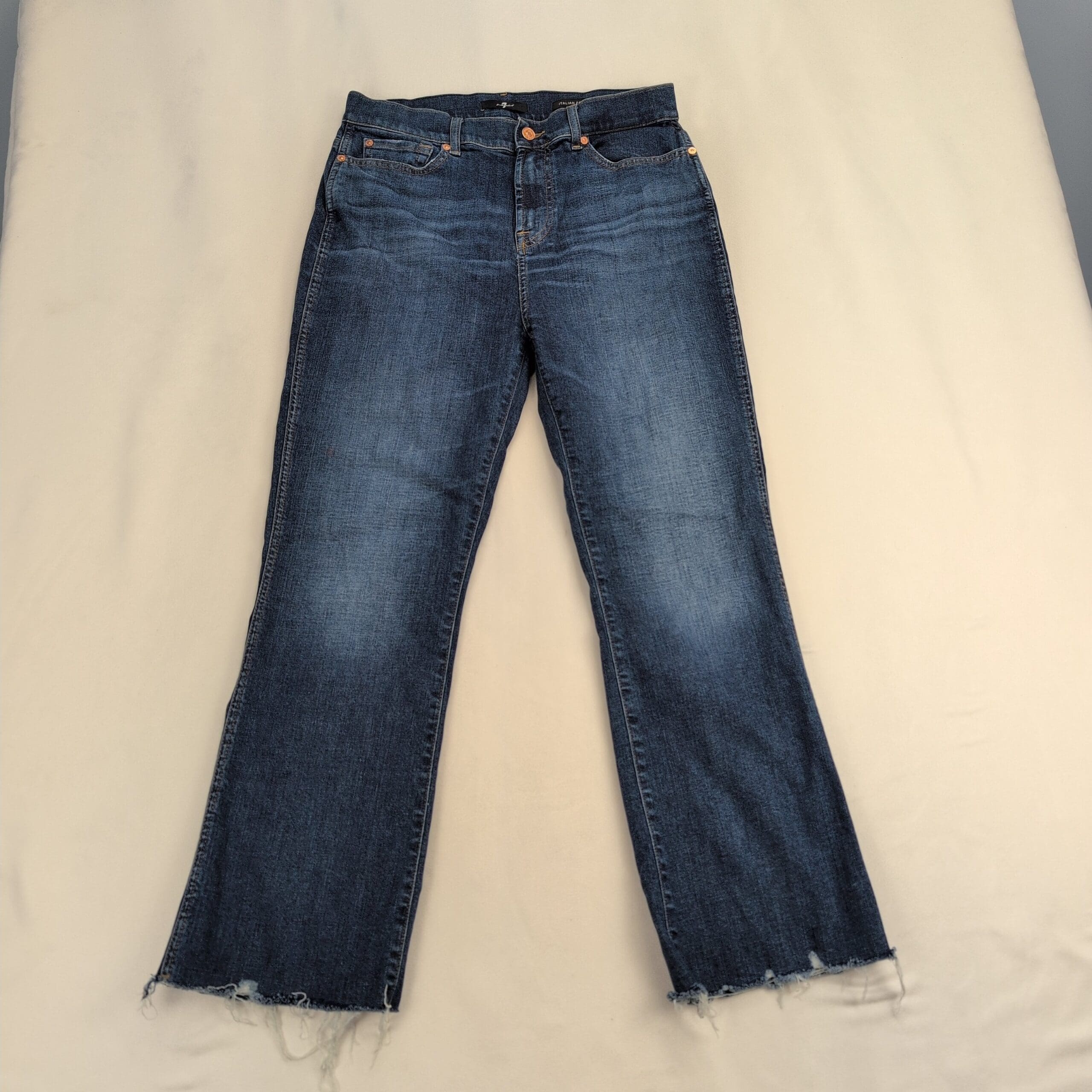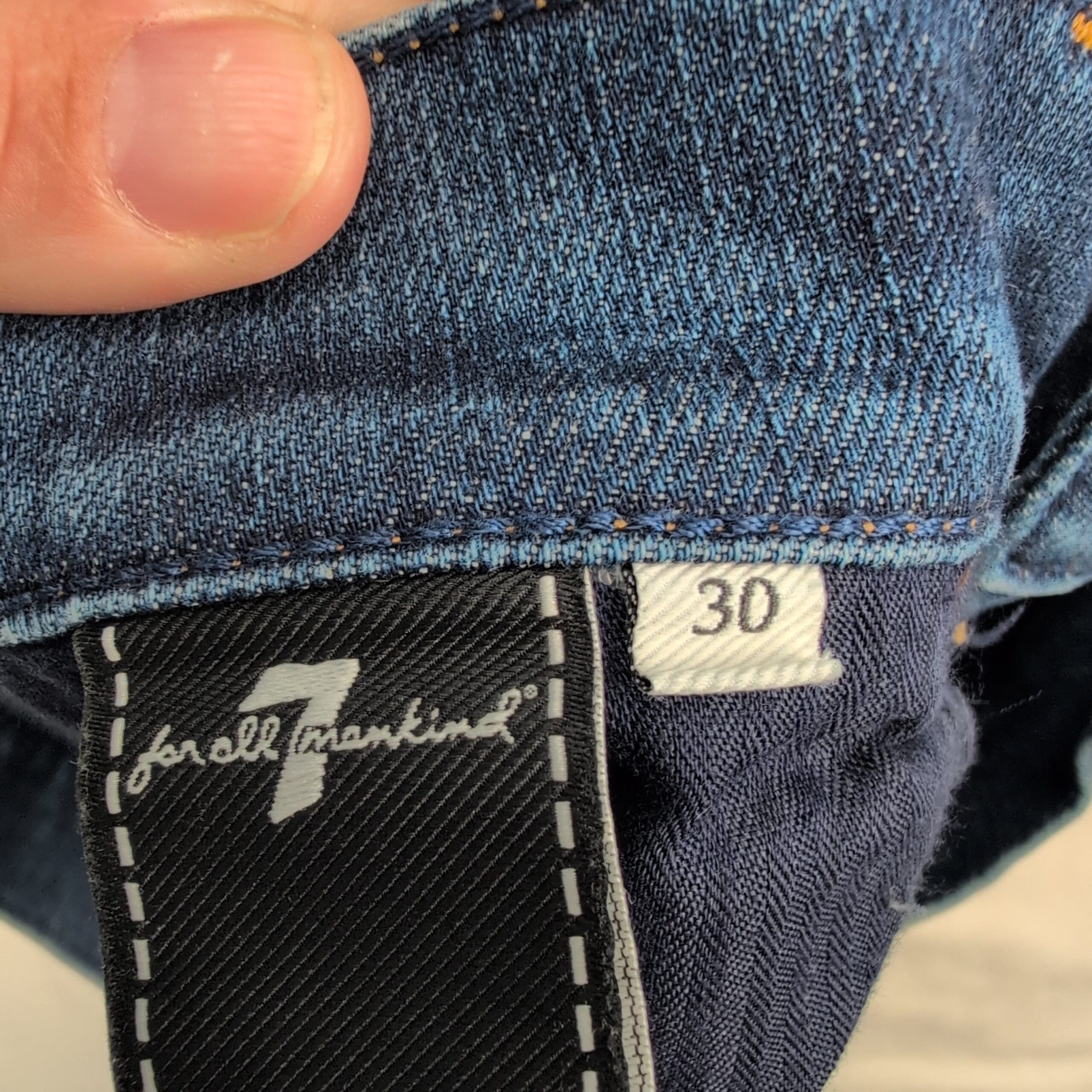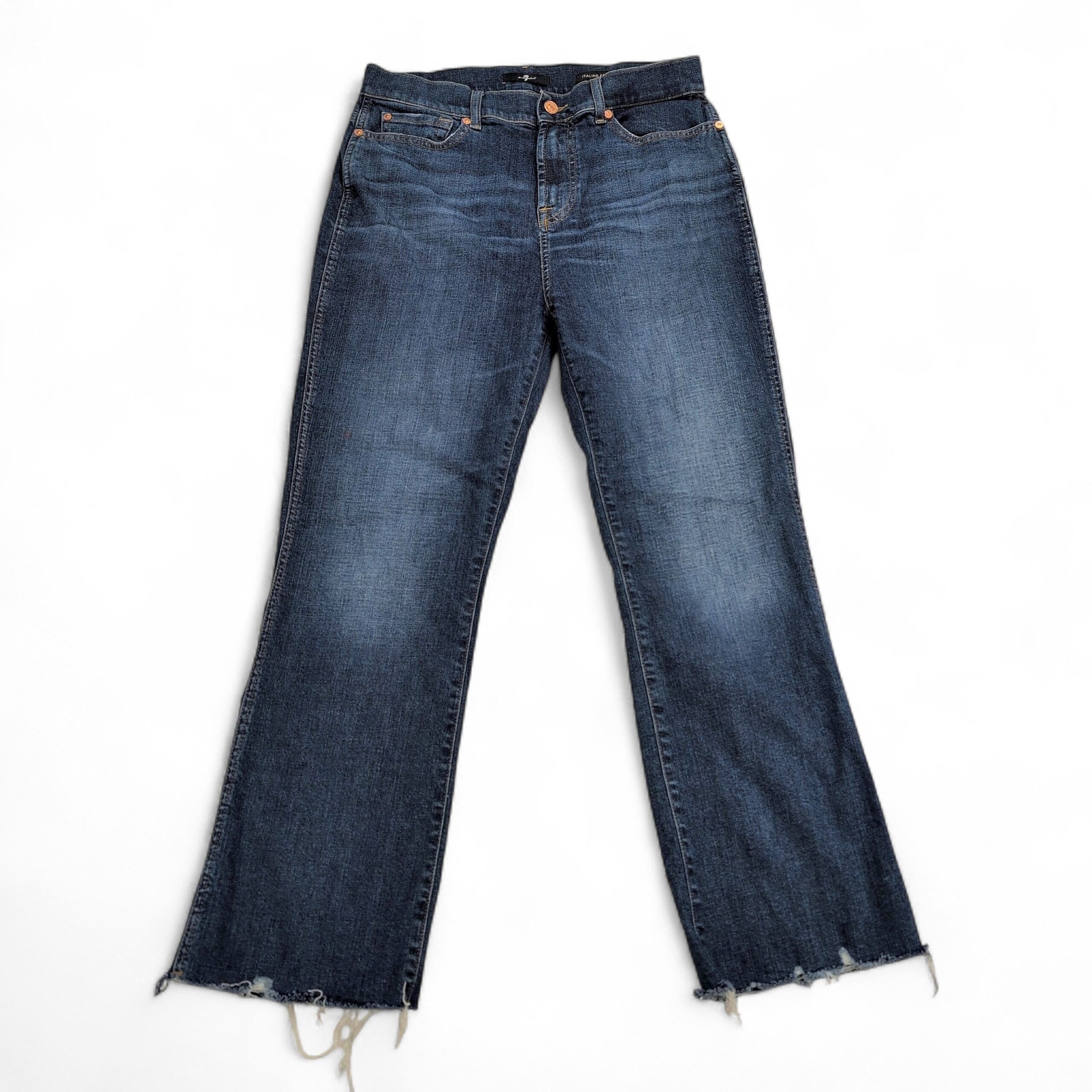 7 For All Mankind high-waist slim kick jeans in Italian fabric. Size 30 (standard). Medium indigo wash with subtle whiskering and lived-in fading. Slim through the thigh with a slight kick at the hem for a modern silhouette.