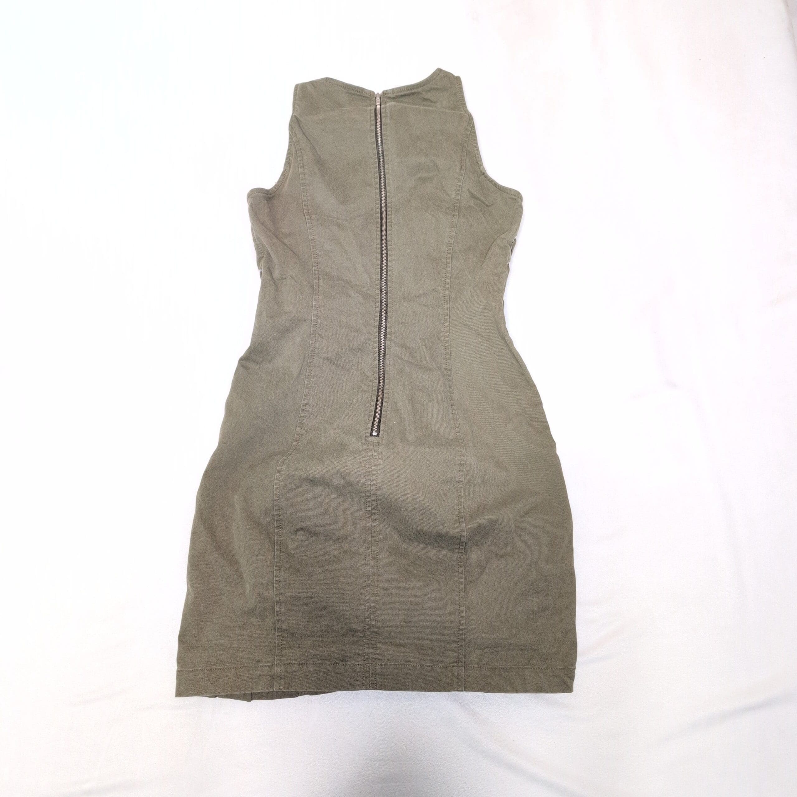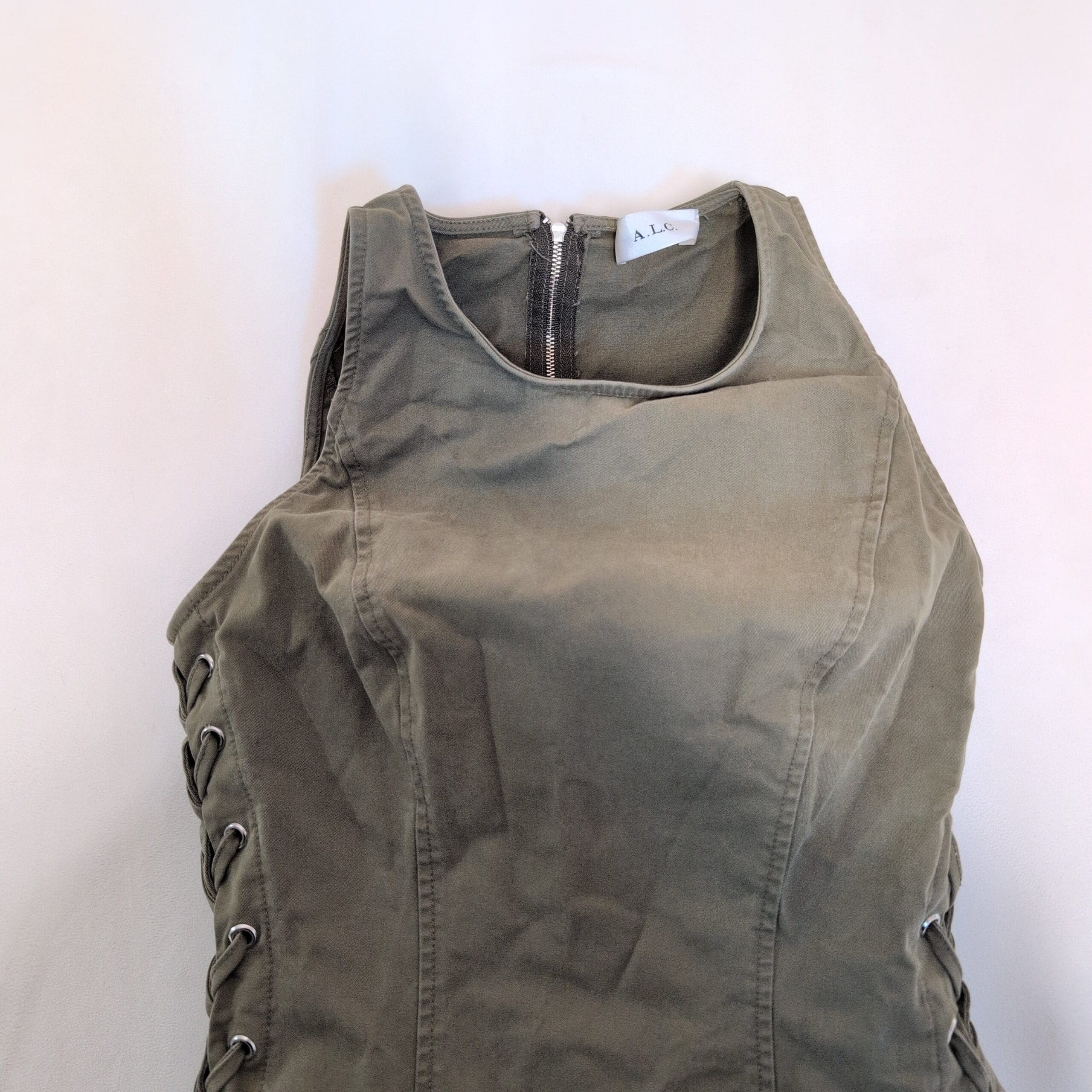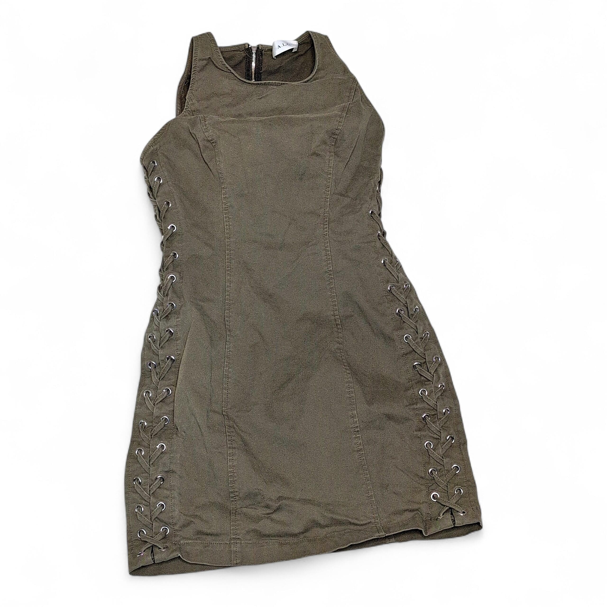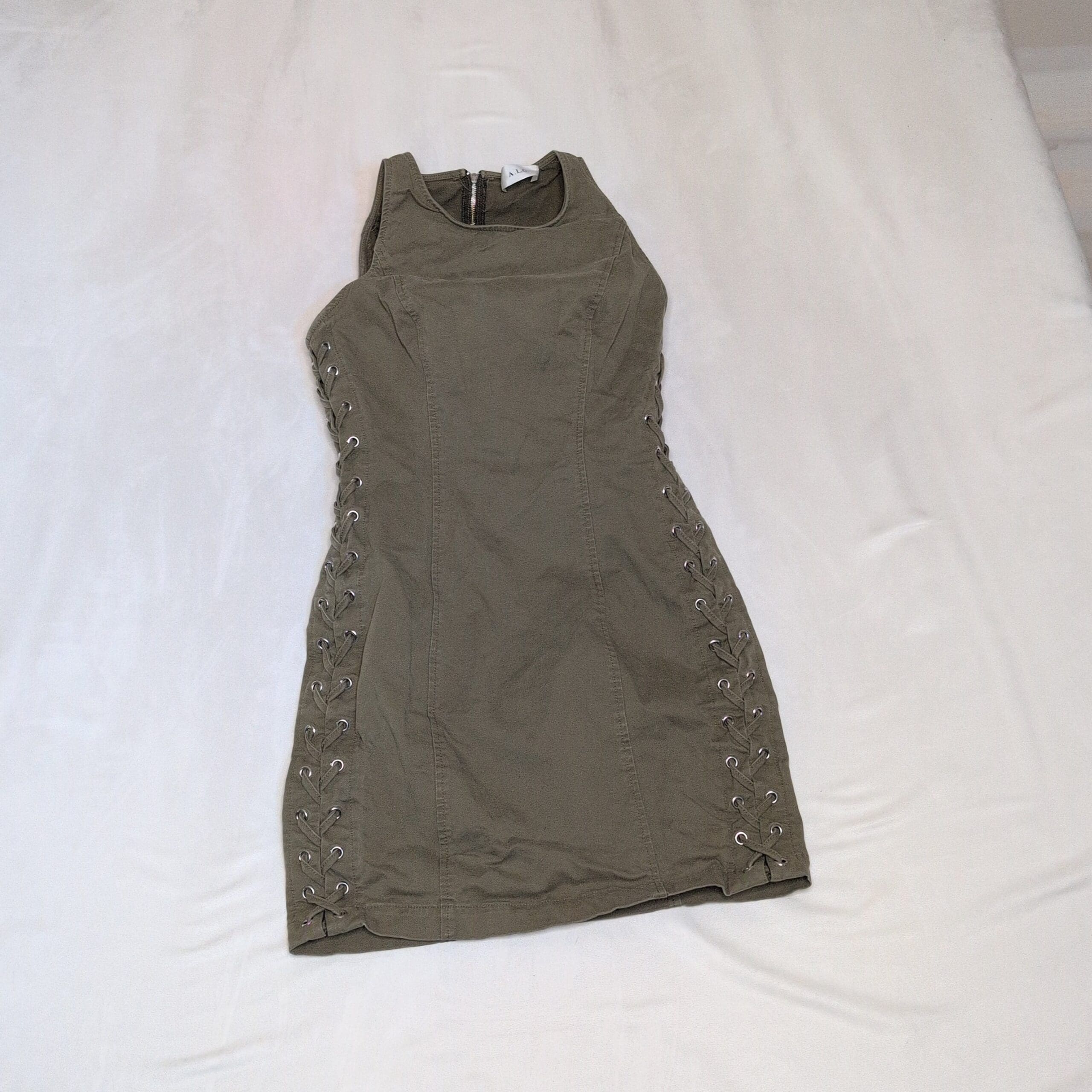 A.L.C. olive-green sleeveless mini dress in a tailored, body-skimming silhouette. Features eyelet lace-up detailing down both sides, structured seaming for a flattering fit, and a back zipper closure for easy wear. Versatile piece that can be dressed up with heels or dressed down with boots.