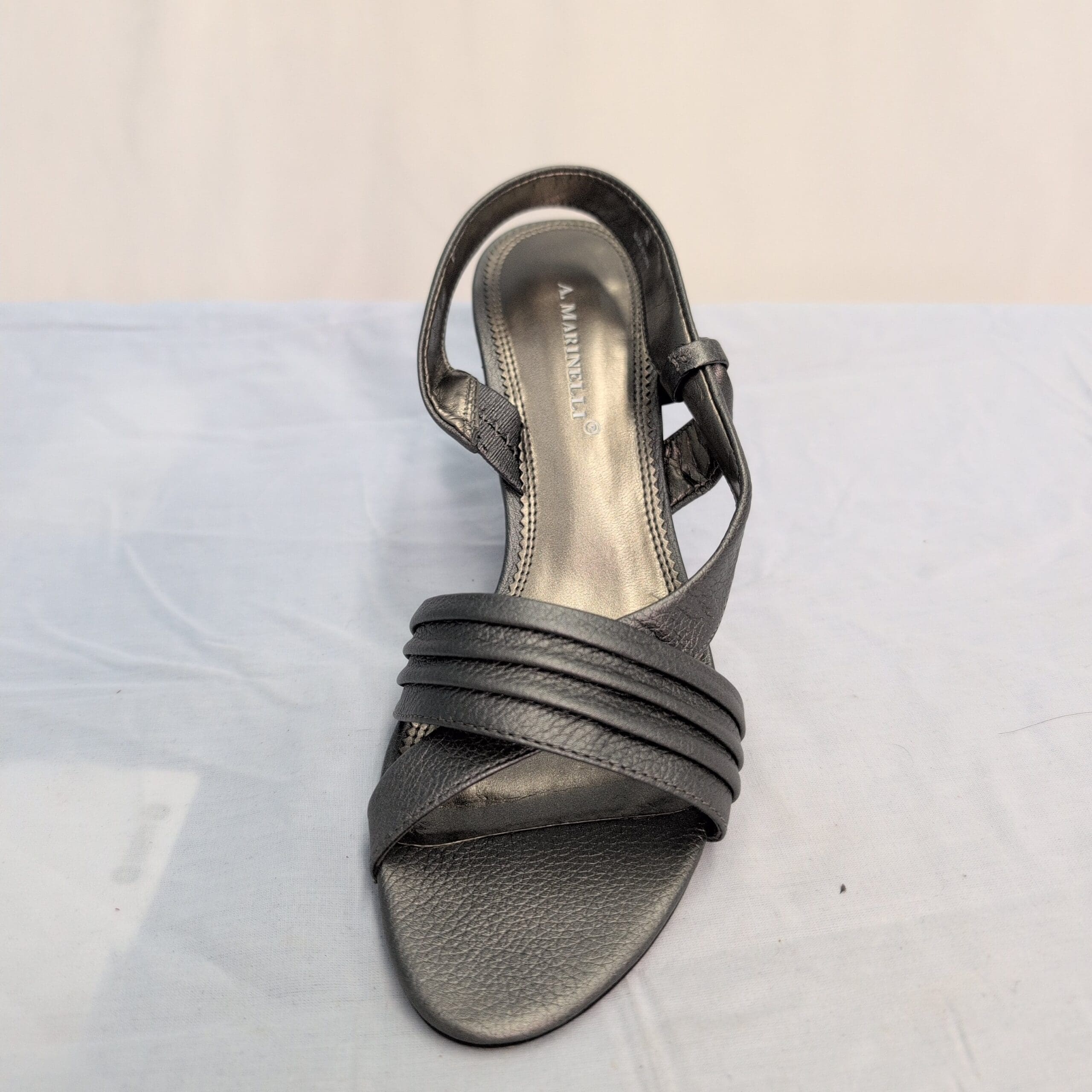 Classic A. Marinelli women’s slingback heels in gray leather. Features crossed front straps, adjustable slingback, and textured leather upper with the A. Marinelli logo on the insole. Gently used and free of major rips, tears, stains, or flaws; typical wear includes light creasing on the straps, minor scuffs on the soles and heel tips, and slight footbed wear. Please review photos for condition details and message with any questions.