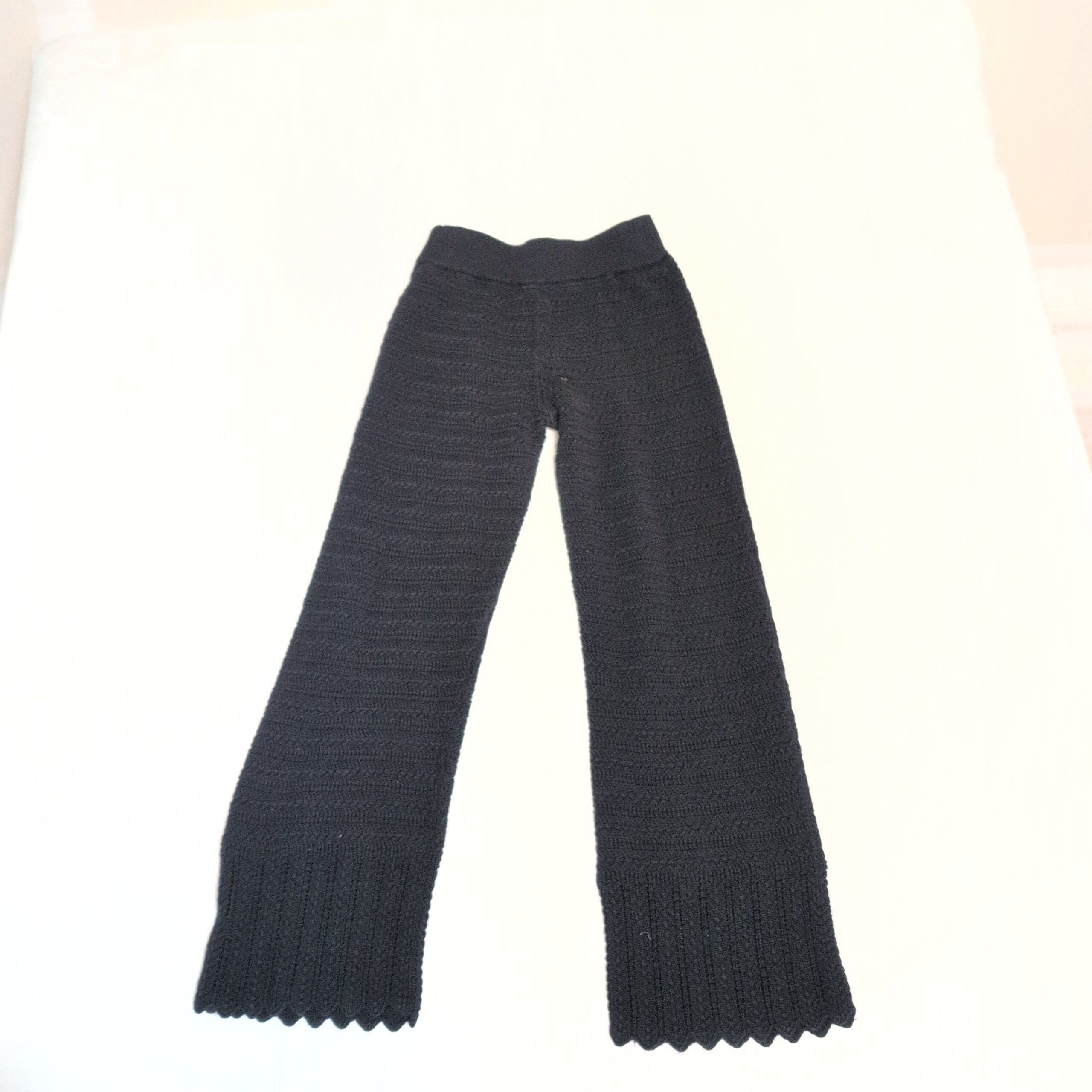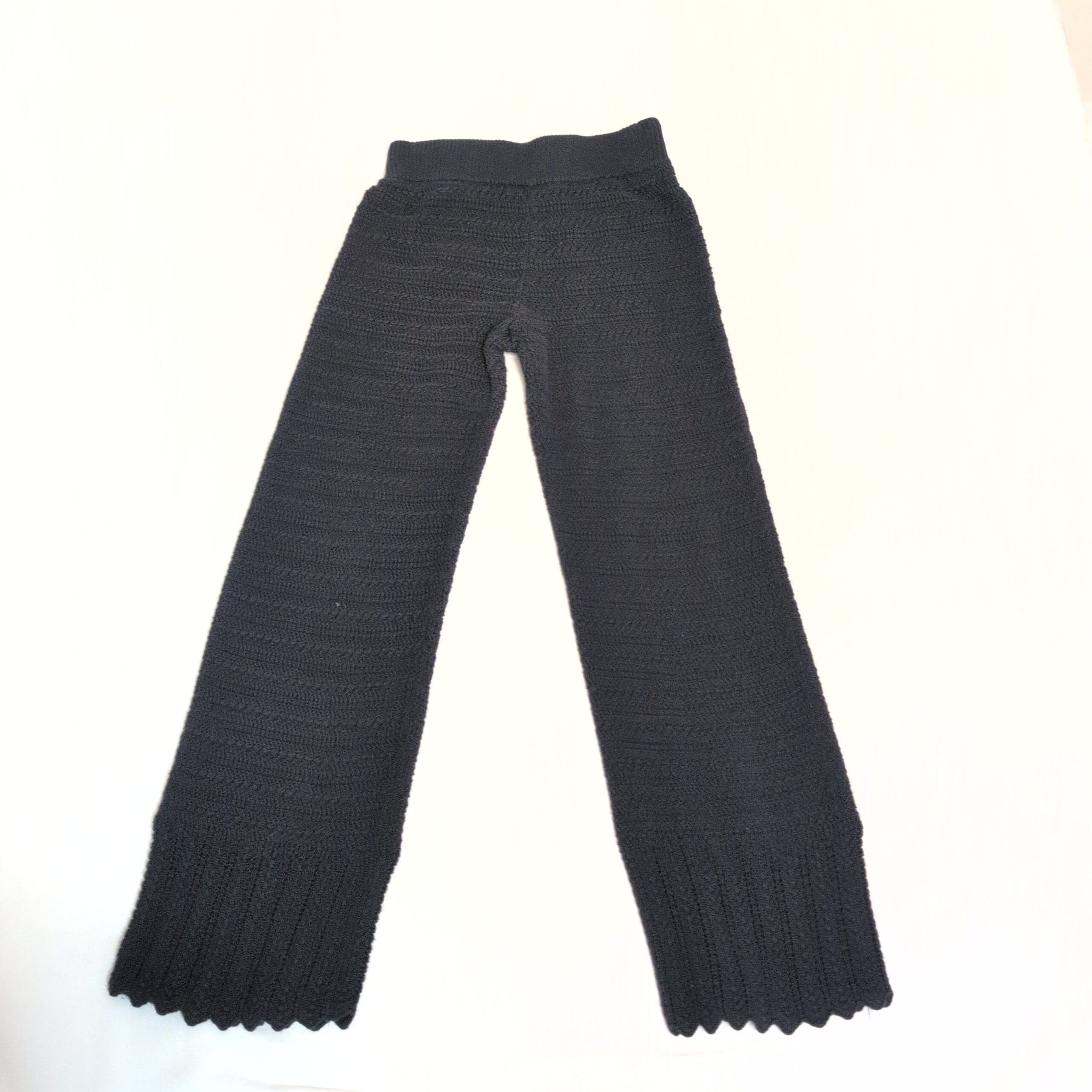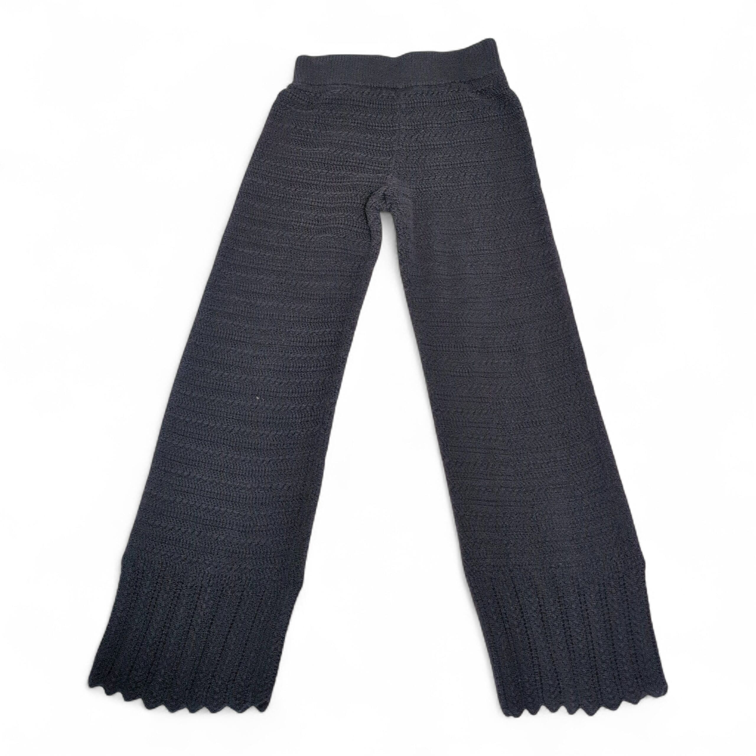 Black knit straight-leg pants by Abercrombie & Fitch in women’s XXS. Textured knit construction with an elasticized waistband and full-length straight legs that finish in a wide ribbed scalloped hem — cozy and polished for everyday wear. Versatile for casual looks or dressed up with boots and a blazer.