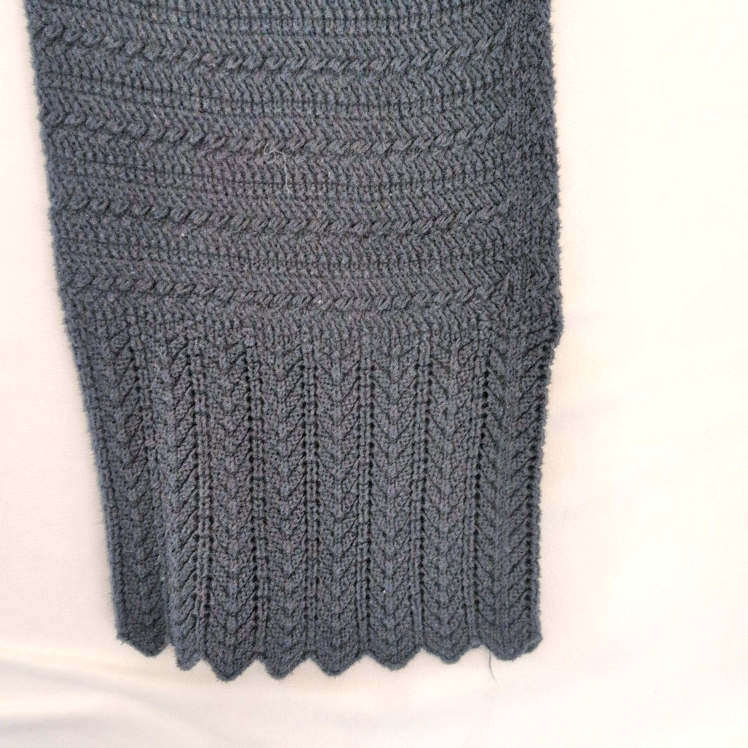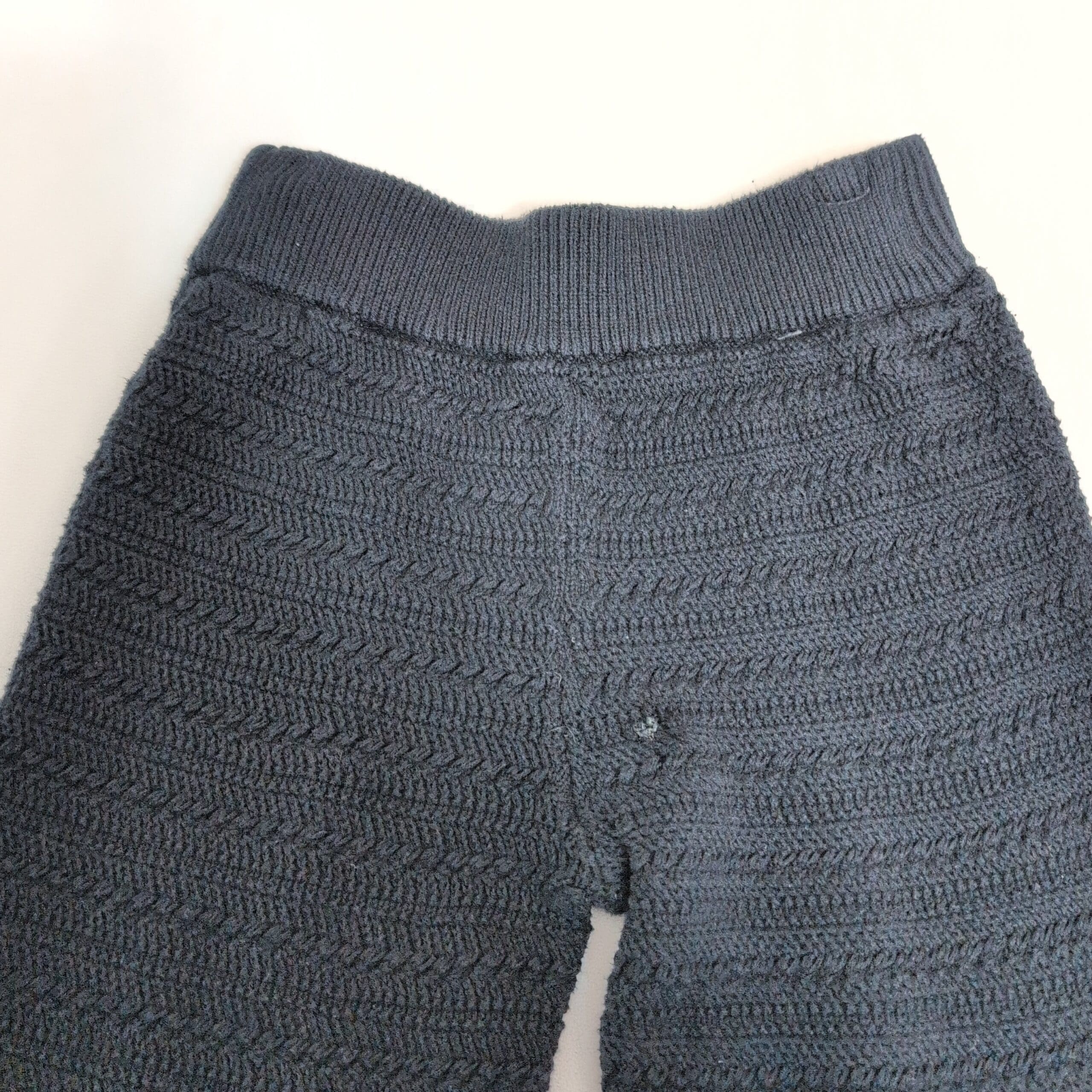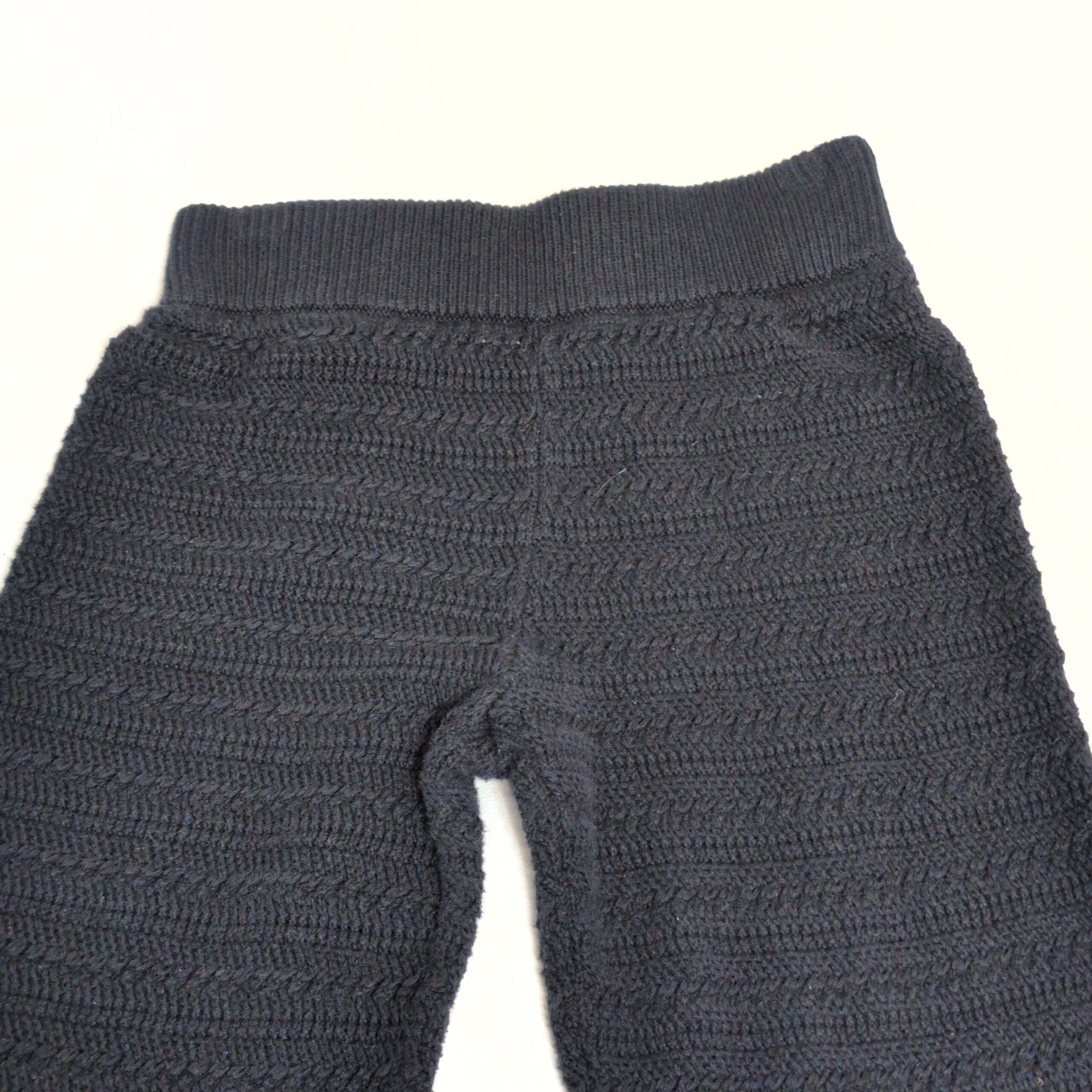 Black knit straight-leg pants by Abercrombie & Fitch in women’s XXS. Textured knit construction with an elasticized waistband and full-length straight legs that finish in a wide ribbed scalloped hem — cozy and polished for everyday wear. Versatile for casual looks or dressed up with boots and a blazer.