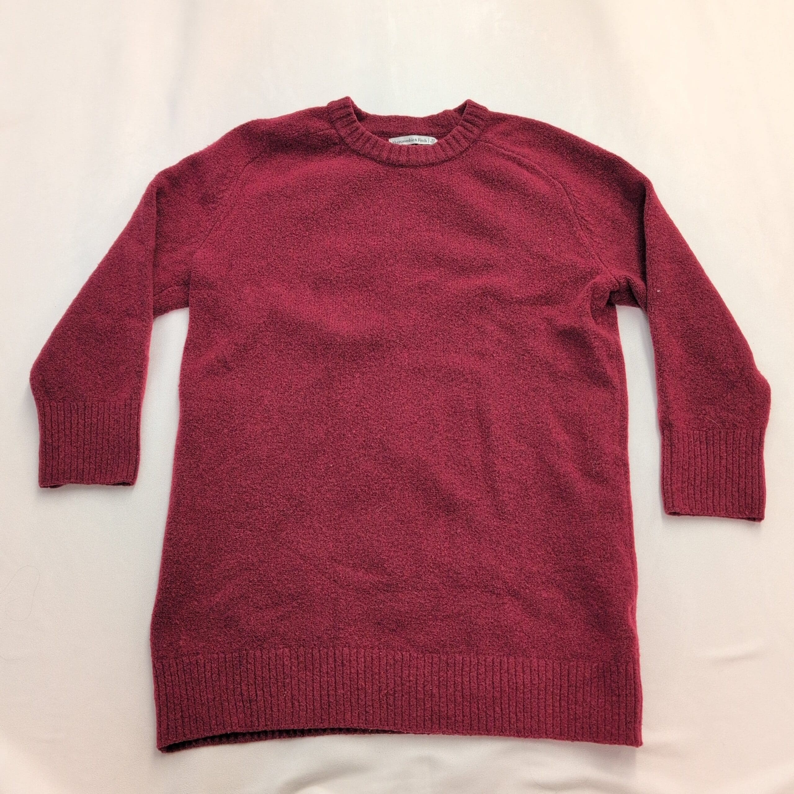 Abercrombie & Fitch women’s crewneck sweater dress in a deep burgundy wine color. Size XS (standard) with long sleeves, ribbed cuffs and hem, and a relaxed tunic length — versatile to wear as a cozy sweater or layered as a dress. Soft knit texture with classic crew neckline; great for casual or dressed-up looks. Excellent used condition: free of major rips, tears, stains, or flaws, though typical light wear may be present.