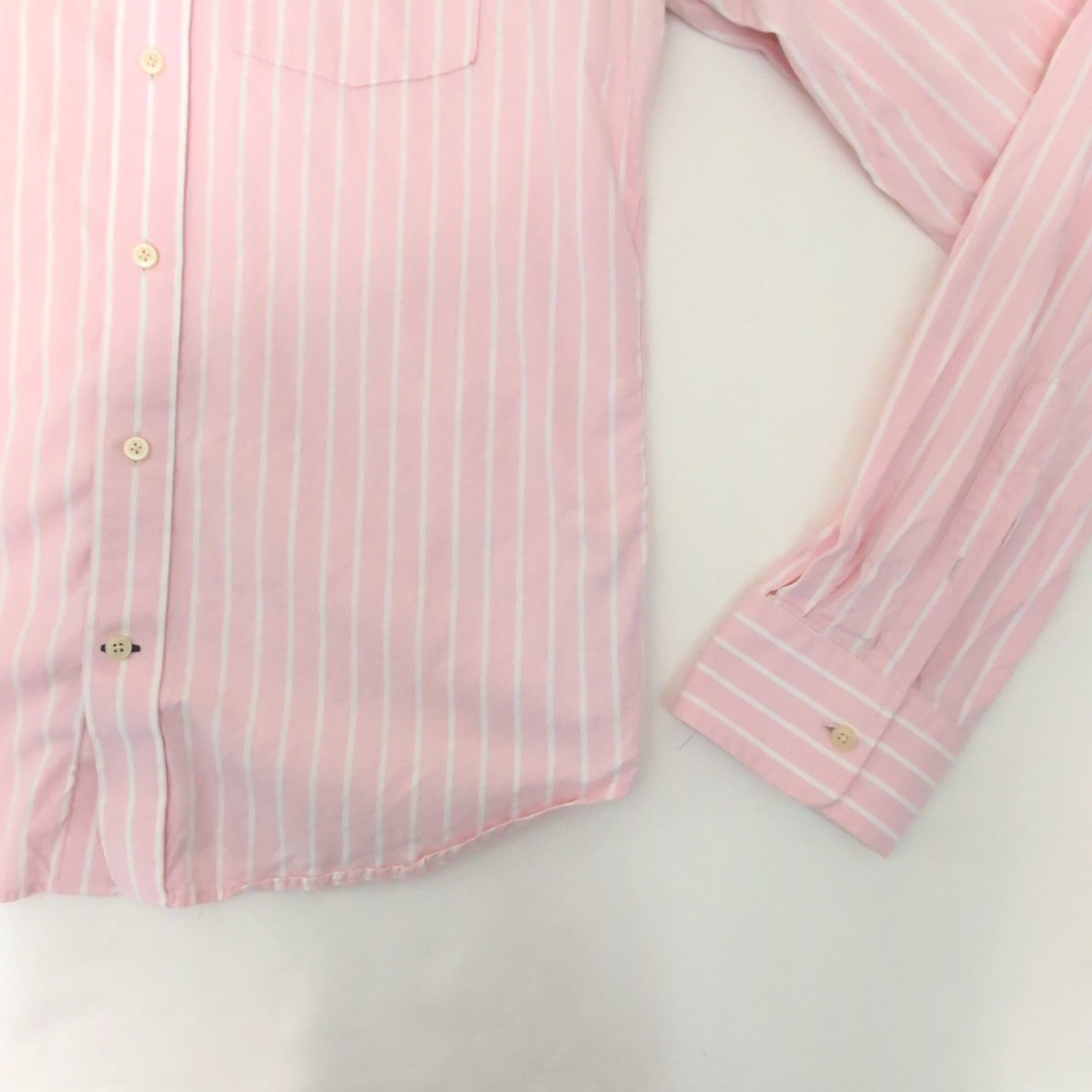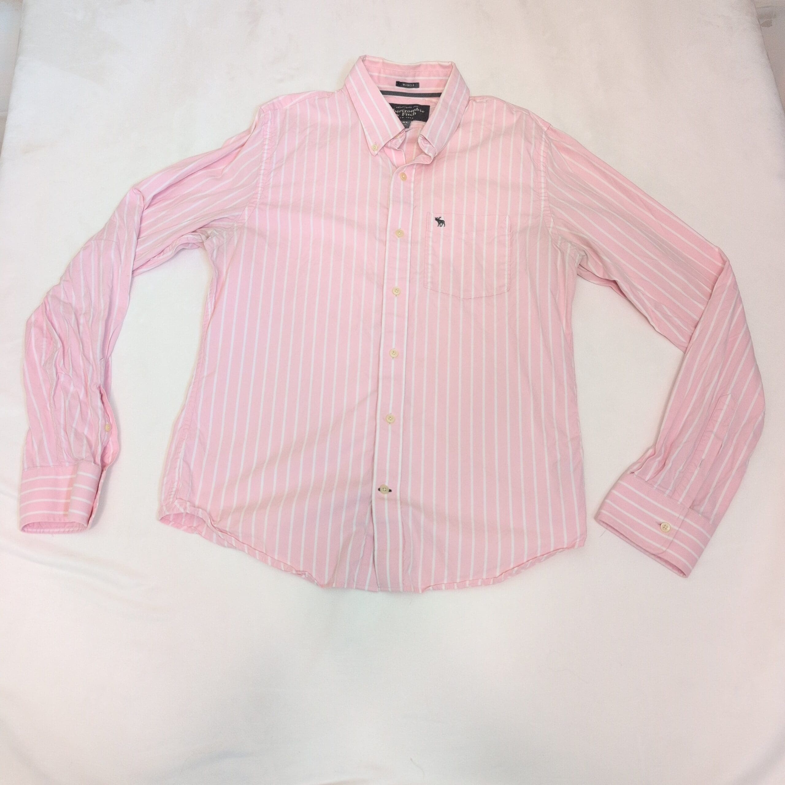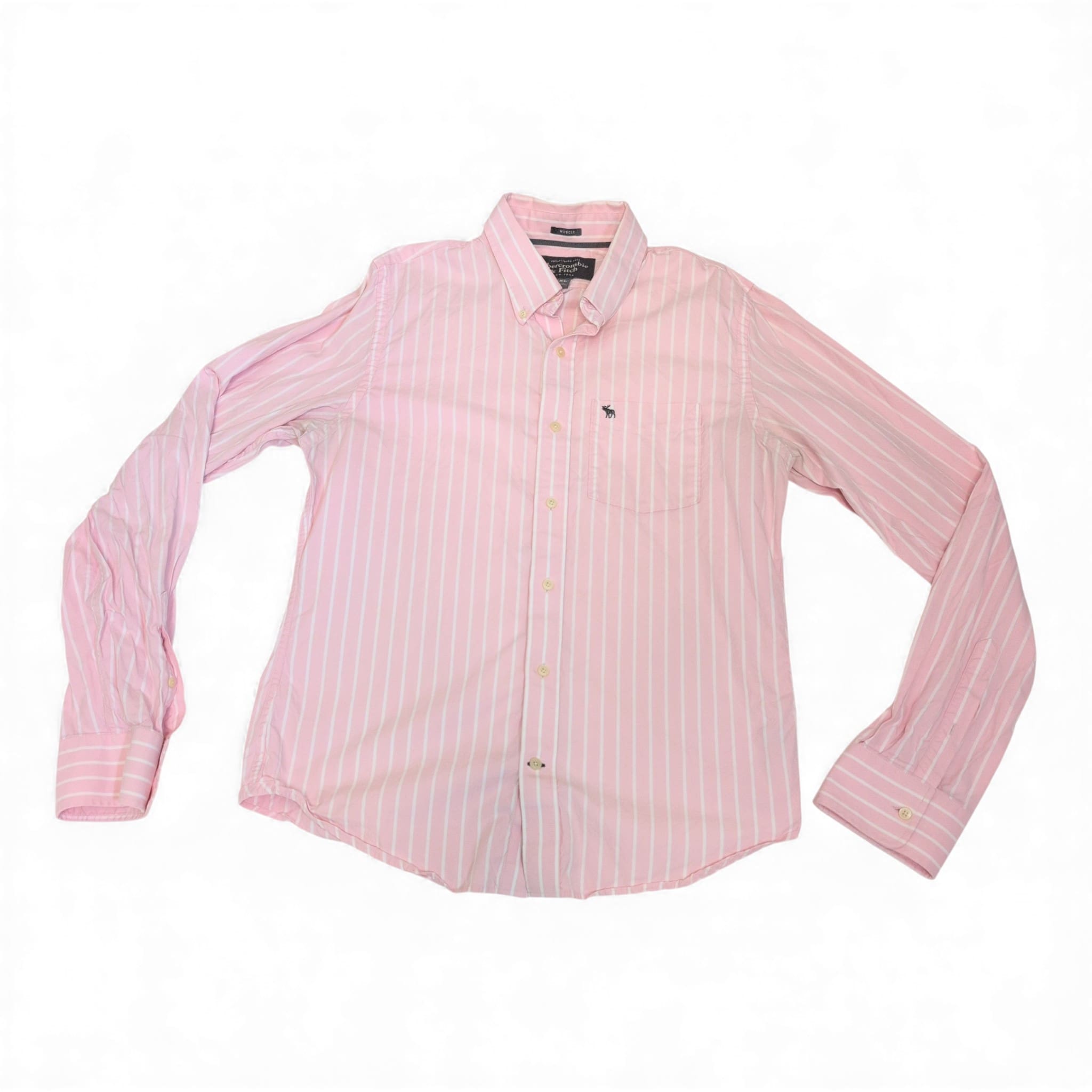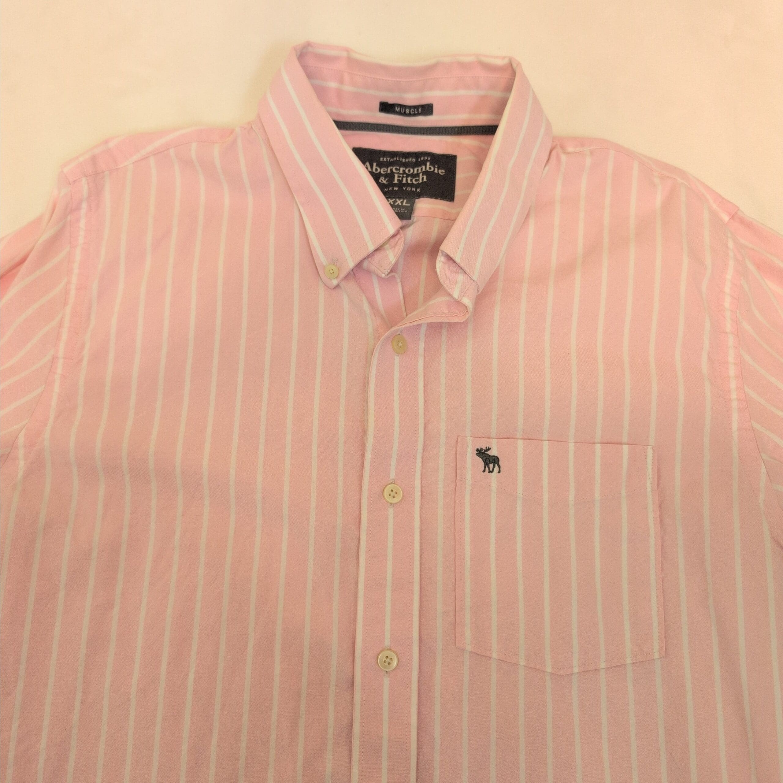 Abercrombie & Fitch men’s long-sleeve button-down shirt in soft pink with white vertical stripes. Size XXL (Big & Tall). Features a button-down collar, single chest pocket with embroidered moose logo, full button placket, and button cuffs — a versatile piece for casual or smart-casual wear.