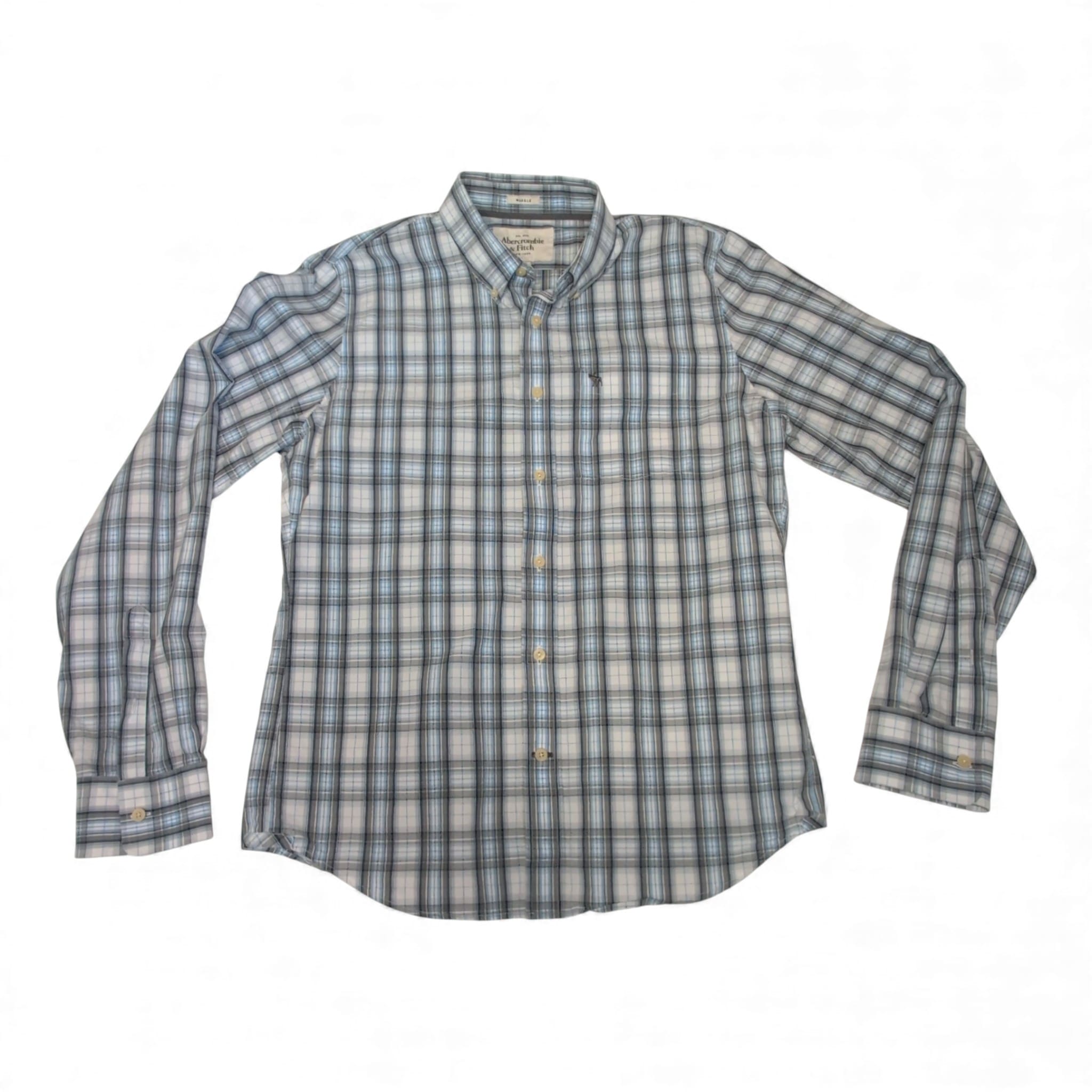 Abercrombie & Fitch men’s long-sleeve button-down dress shirt in size XXL (Big & Tall). Classic blue, white, and gray plaid pattern with a button-down collar and a single chest pocket featuring the embroidered Abercrombie logo. Button-front closure and button cuffs make this a versatile option for office or casual wear. Pre-owned, gently worn — please review photos for condition and ask any questions before purchasing.