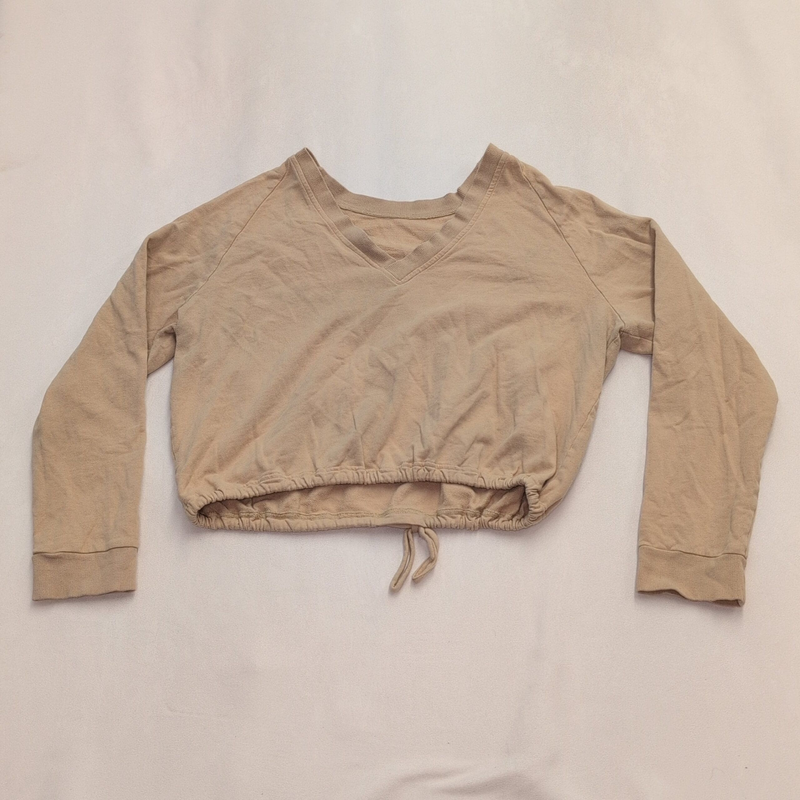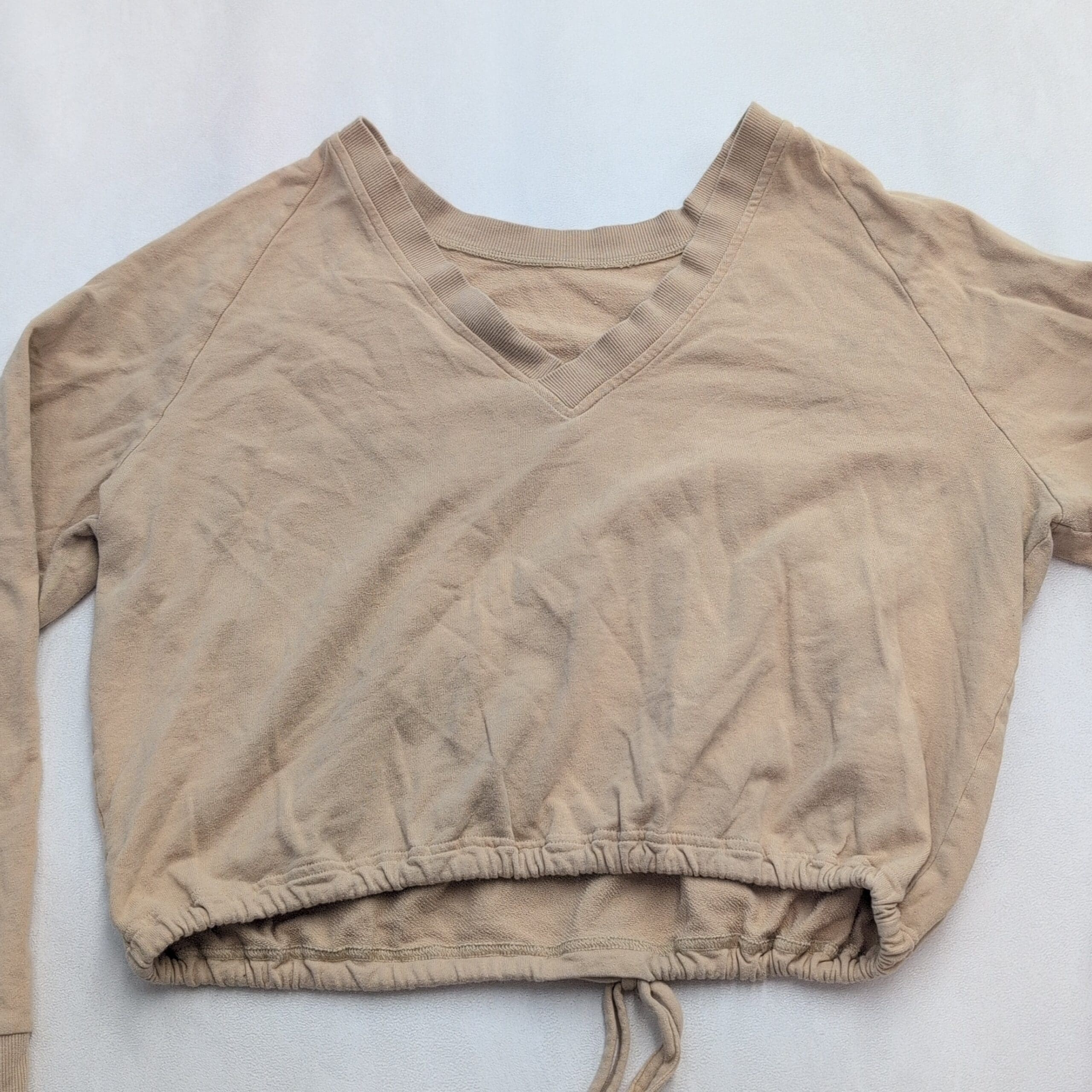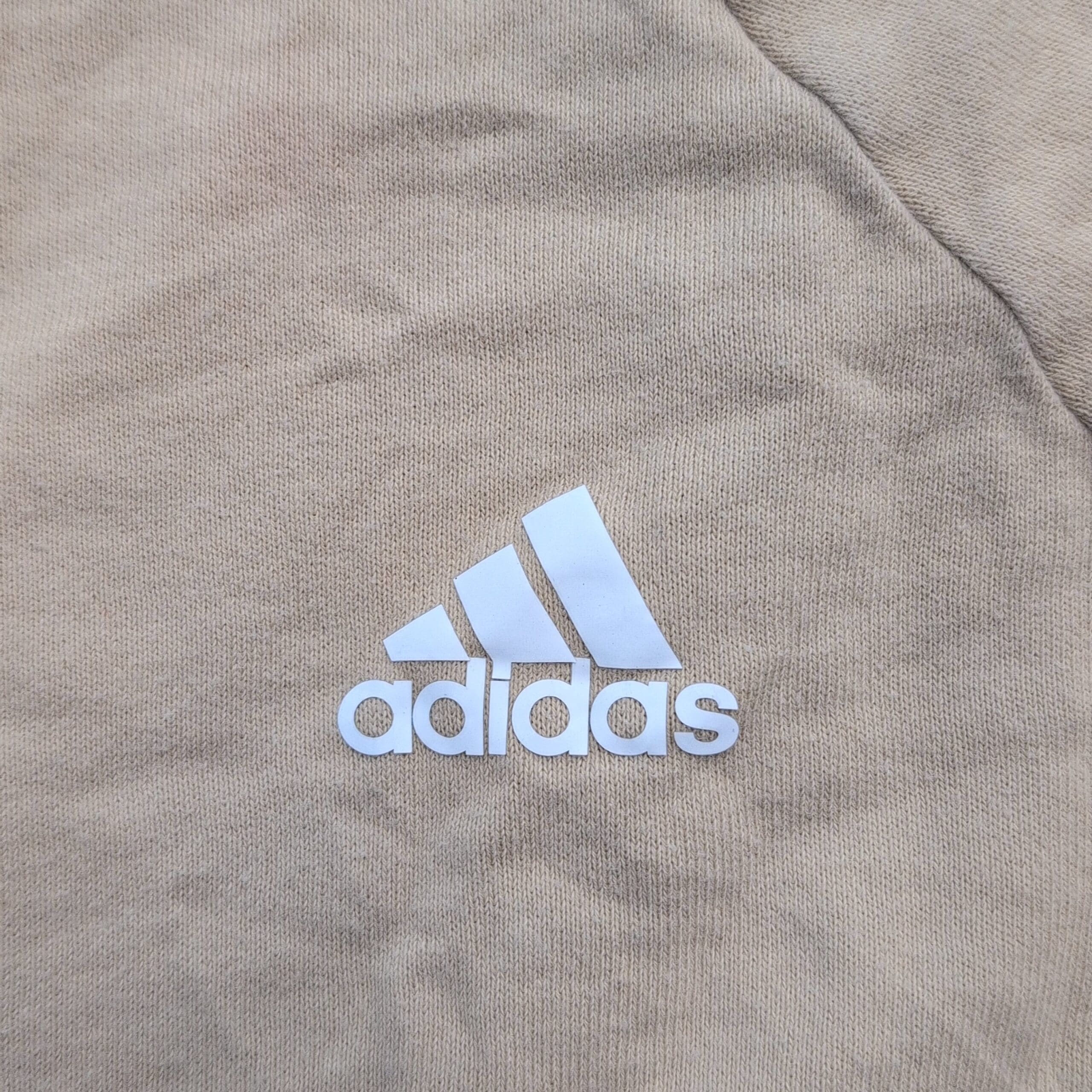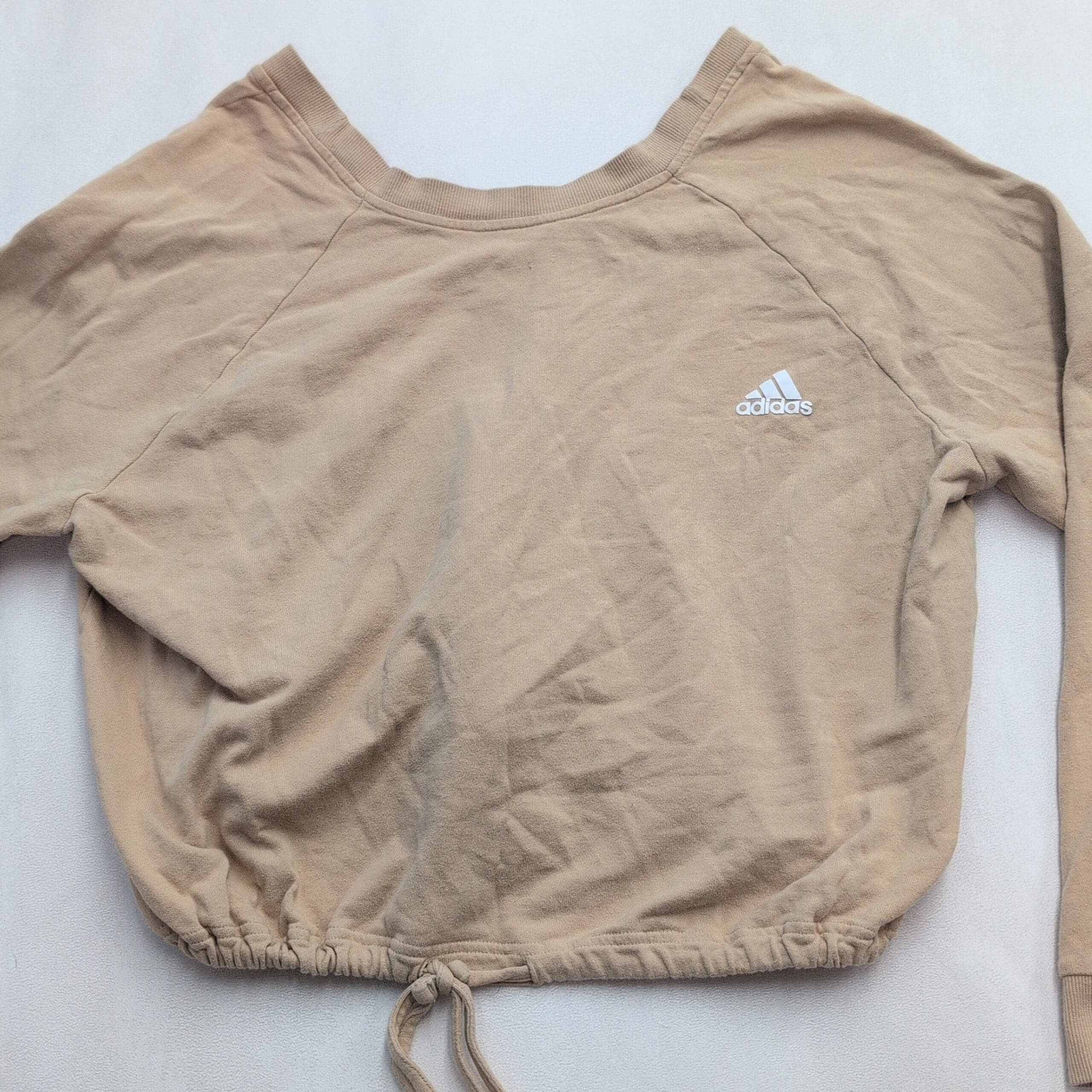 Adidas women’s cropped sweatshirt, size XL. Light beige/tan with small embroidered Adidas logo on front left. Features a cropped silhouette with adjustable drawstring hem, long raglan sleeves, wide neckline in front, and a V-neck detail at the back for a stylish twist. Excellent used condition — free of major rips, tears, or stains; may show typical light wear and natural softening. Versatile for layering or casual athleisure outfits.