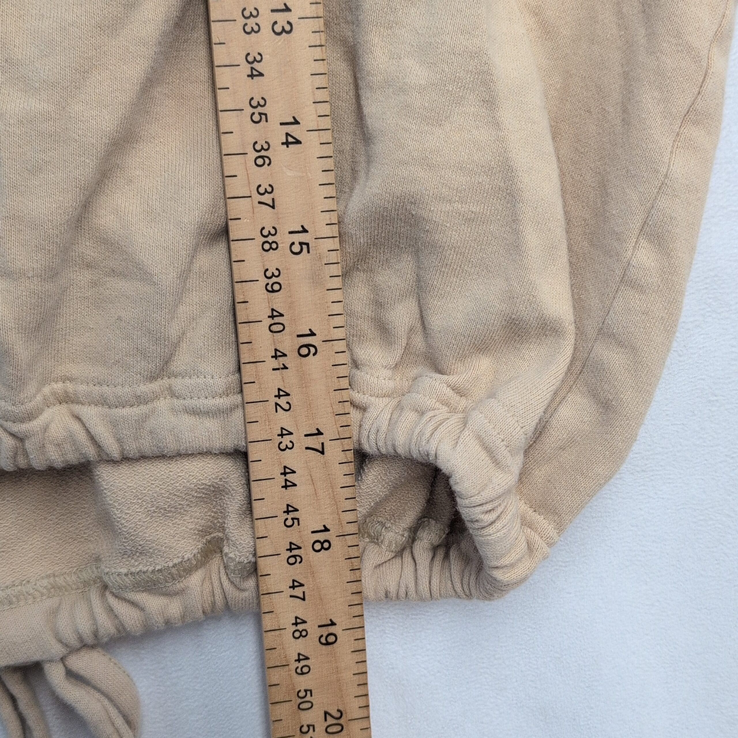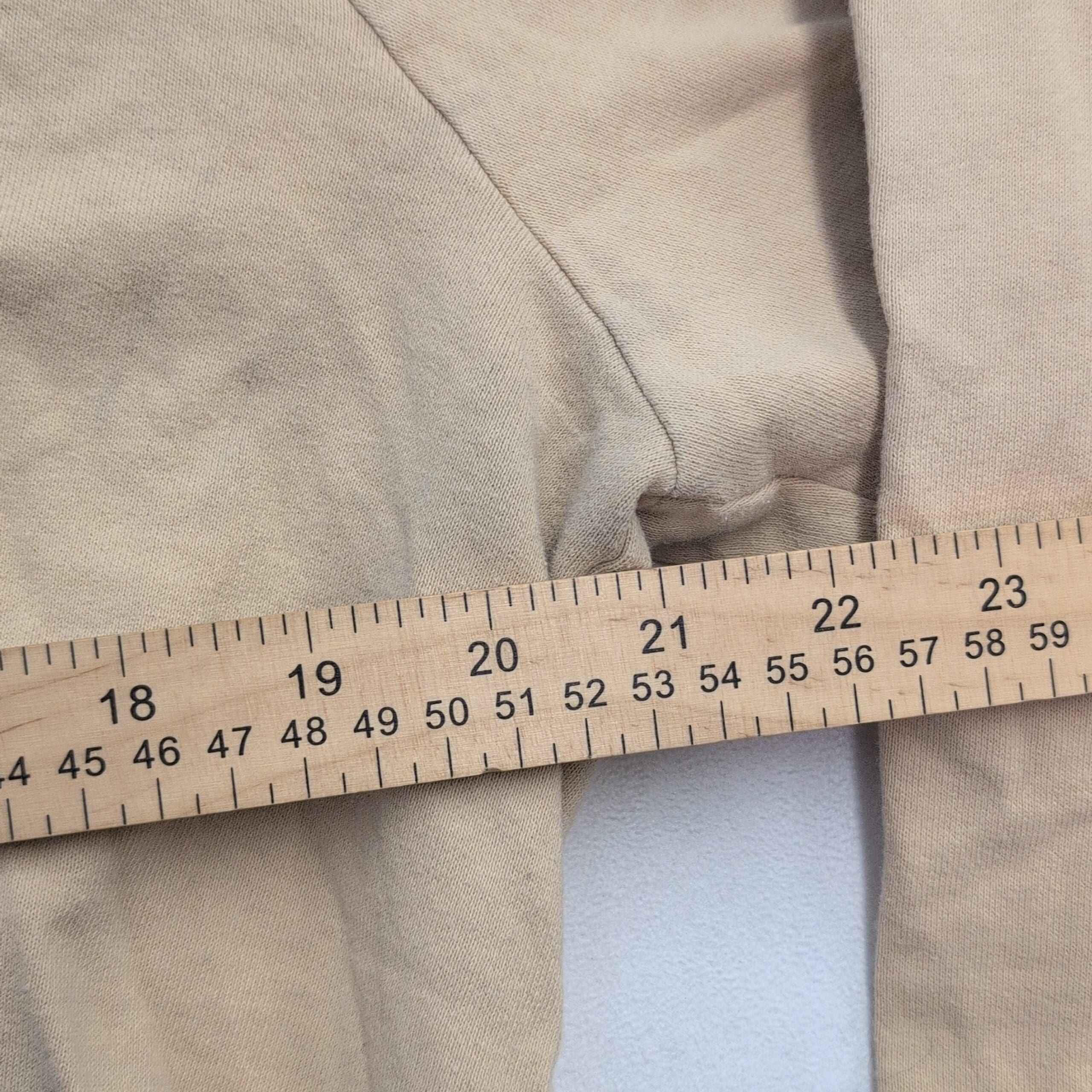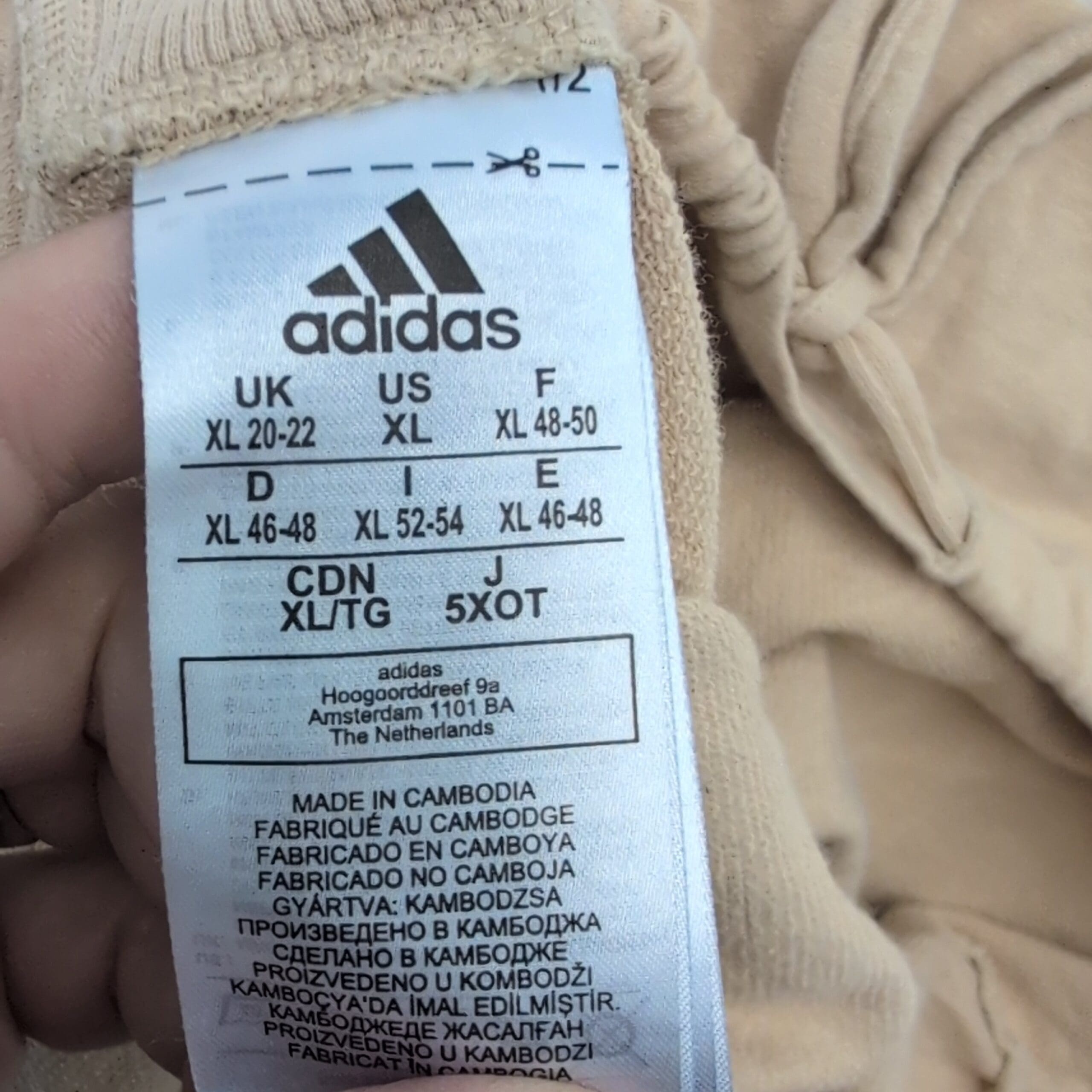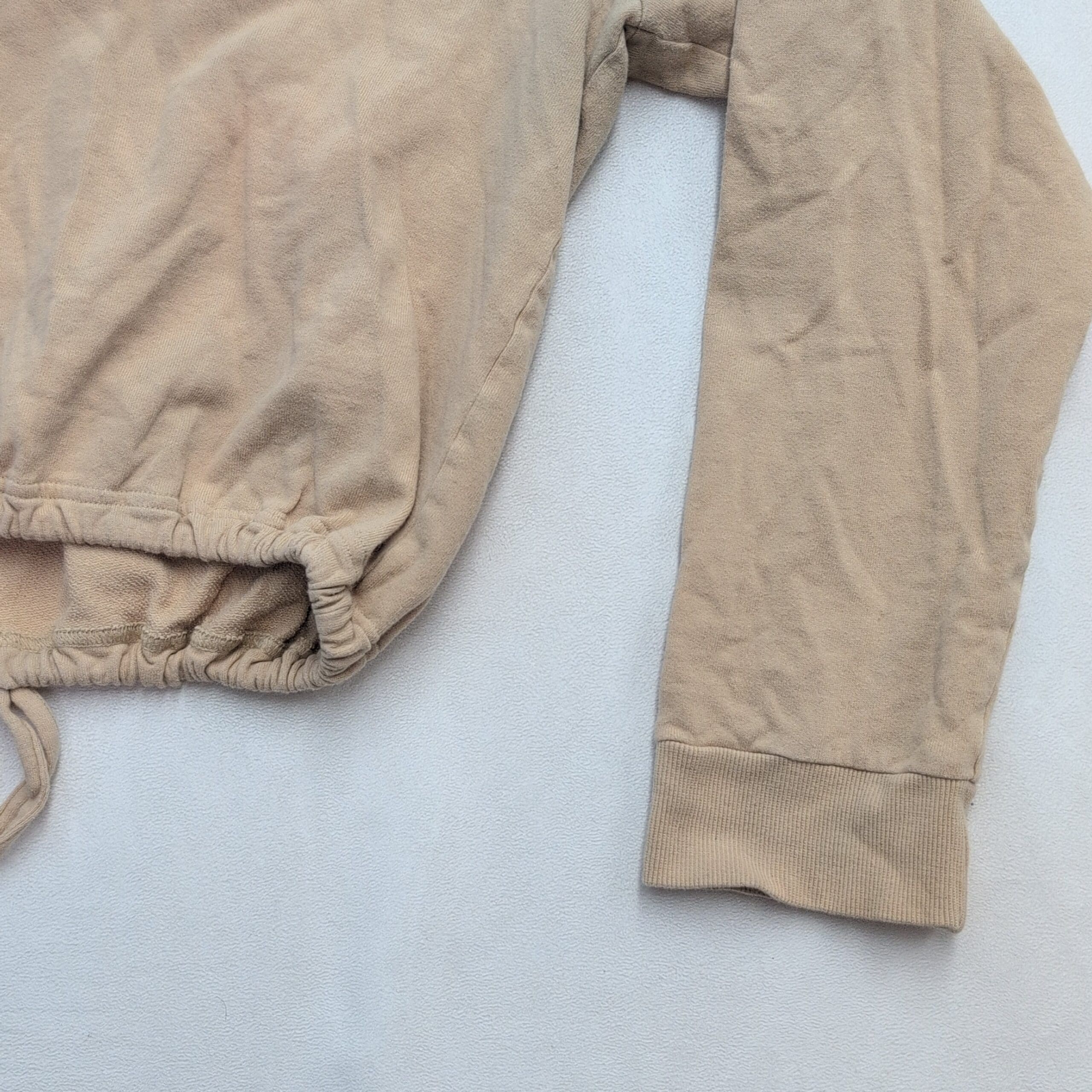 Adidas women’s cropped sweatshirt, size XL. Light beige/tan with small embroidered Adidas logo on front left. Features a cropped silhouette with adjustable drawstring hem, long raglan sleeves, wide neckline in front, and a V-neck detail at the back for a stylish twist. Excellent used condition — free of major rips, tears, or stains; may show typical light wear and natural softening. Versatile for layering or casual athleisure outfits.