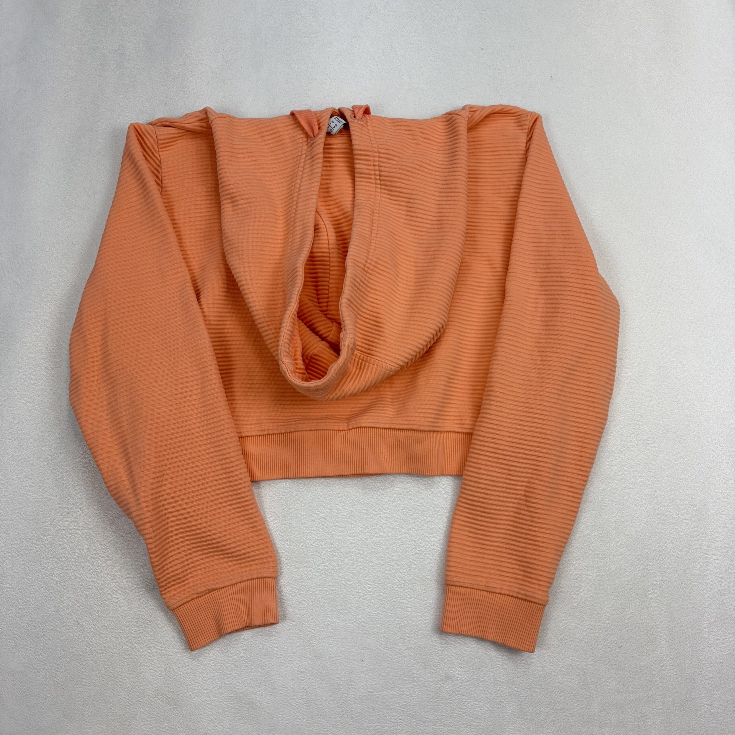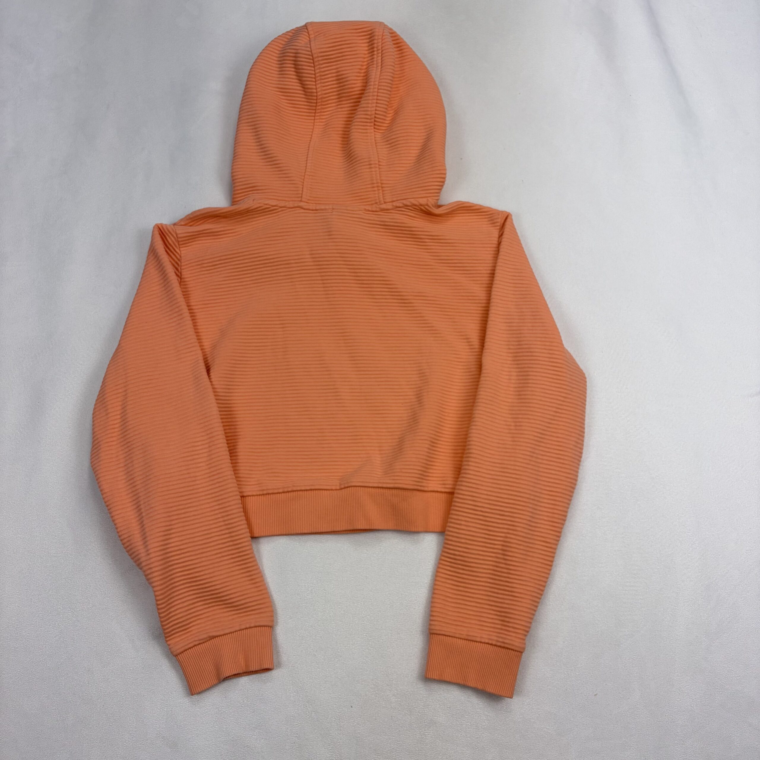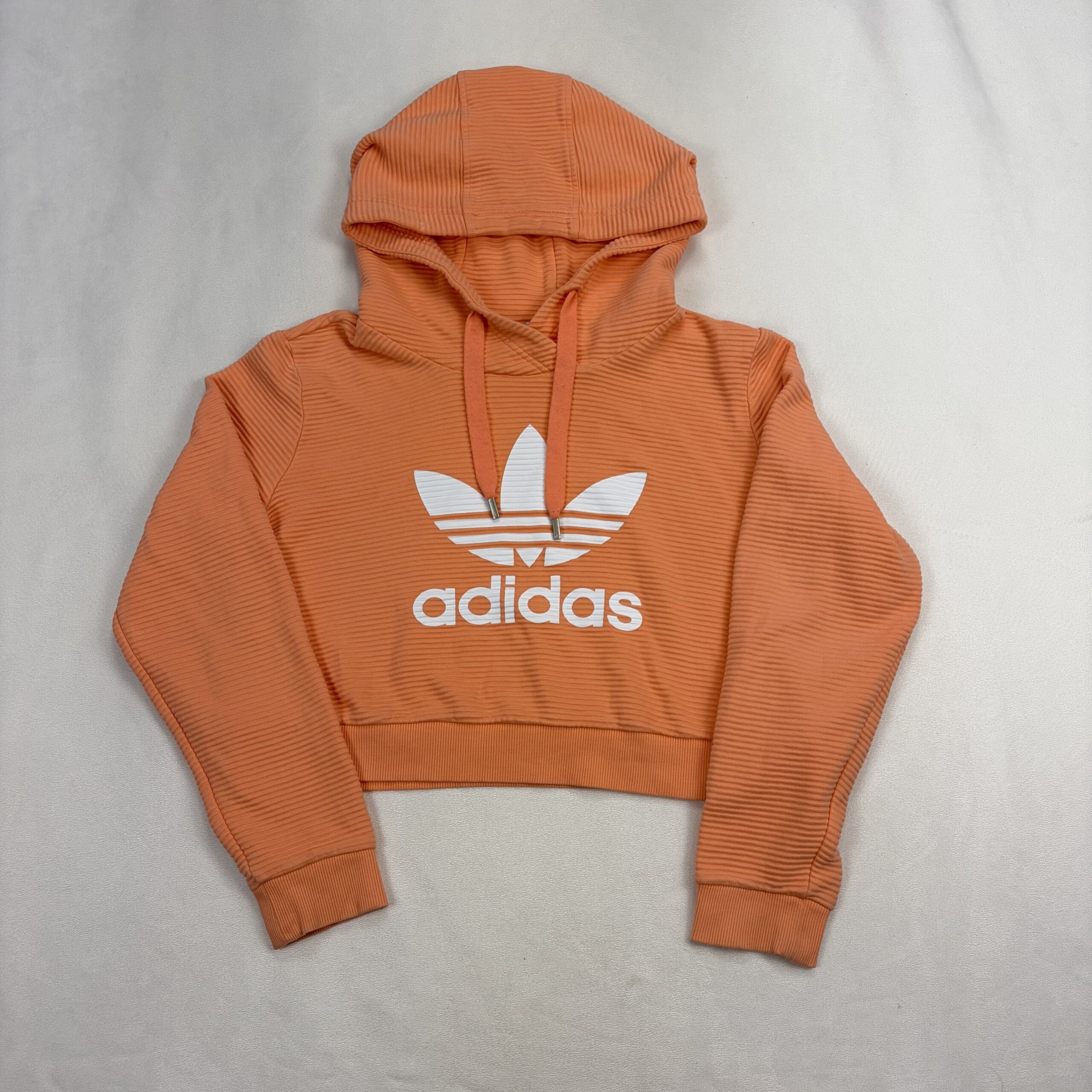 Adidas Originals women’s cropped hoodie in coral pink with bold white Trefoil logo. Size M (standard). Ribbed textured fabric with a drawstring hood, long sleeves with ribbed cuffs, and a fitted cropped hem — perfect for layering or pairing with high-waist bottoms. Excellent used condition; free of major rips, tears, stains, or flaws. Typical gentle wear may be present.