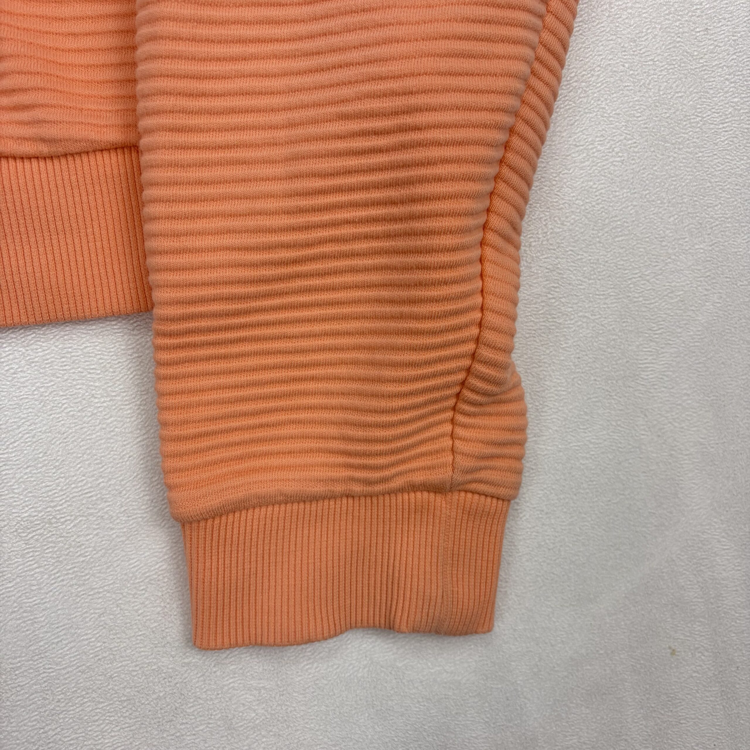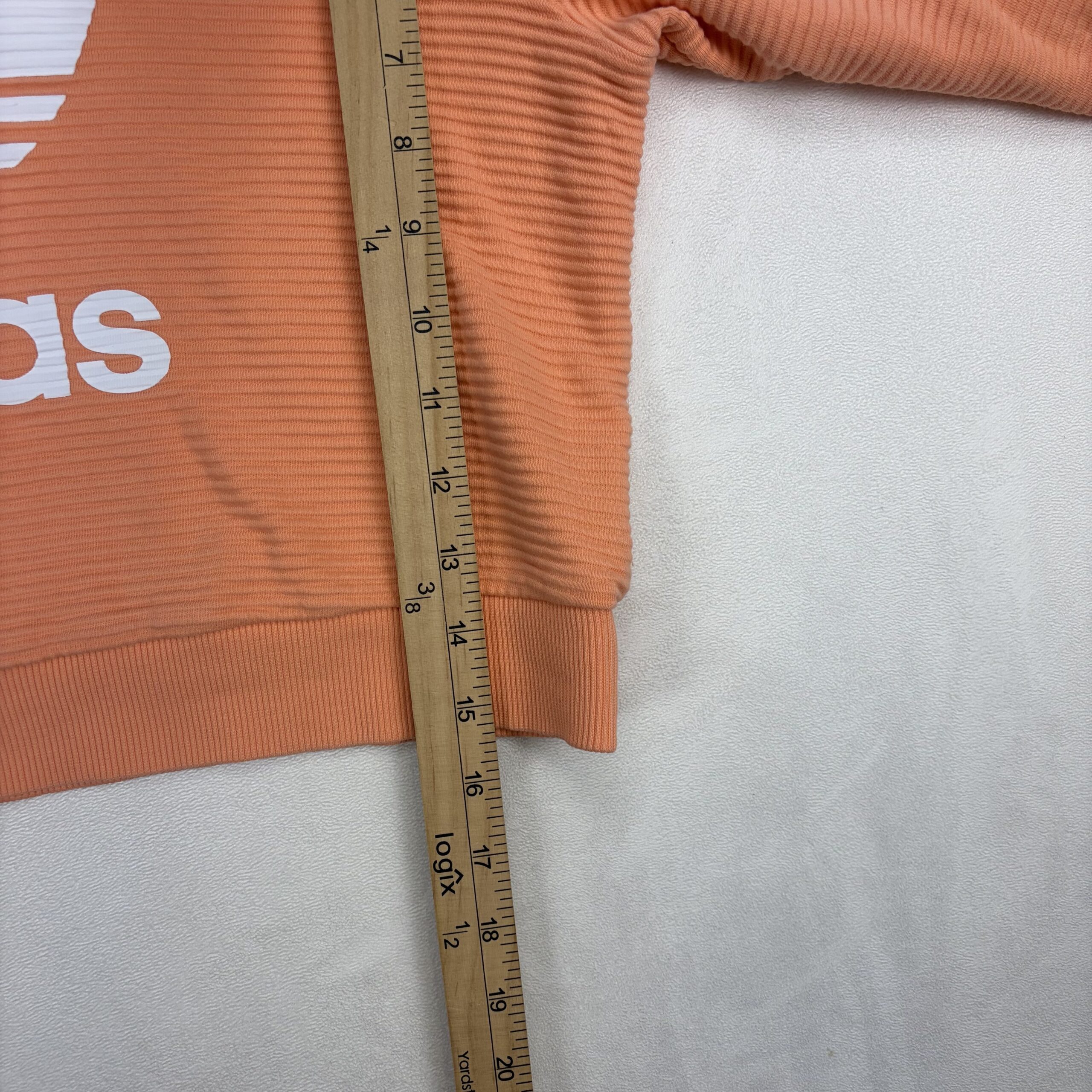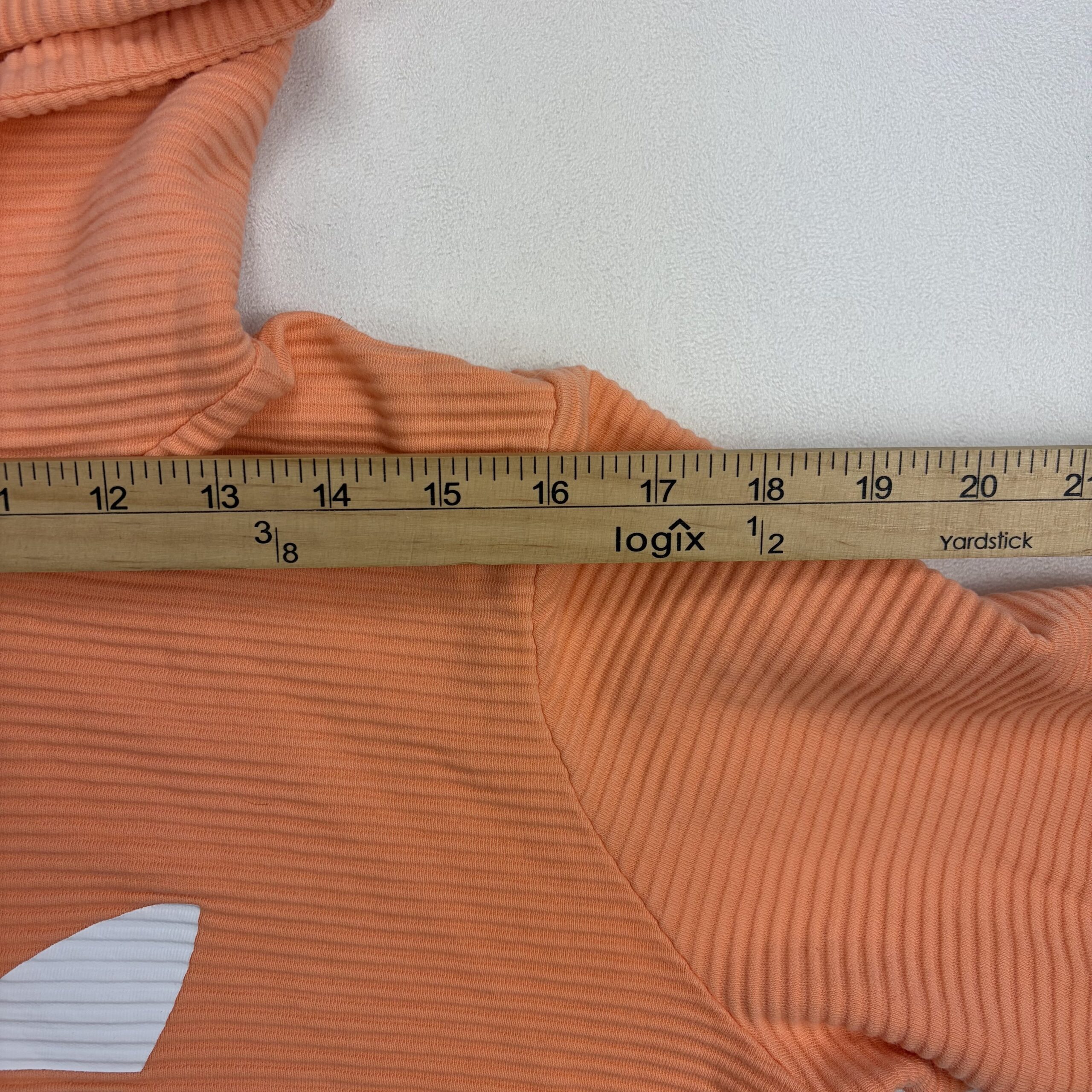 Adidas Originals women’s cropped hoodie in coral pink with bold white Trefoil logo. Size M (standard). Ribbed textured fabric with a drawstring hood, long sleeves with ribbed cuffs, and a fitted cropped hem — perfect for layering or pairing with high-waist bottoms. Excellent used condition; free of major rips, tears, stains, or flaws. Typical gentle wear may be present.