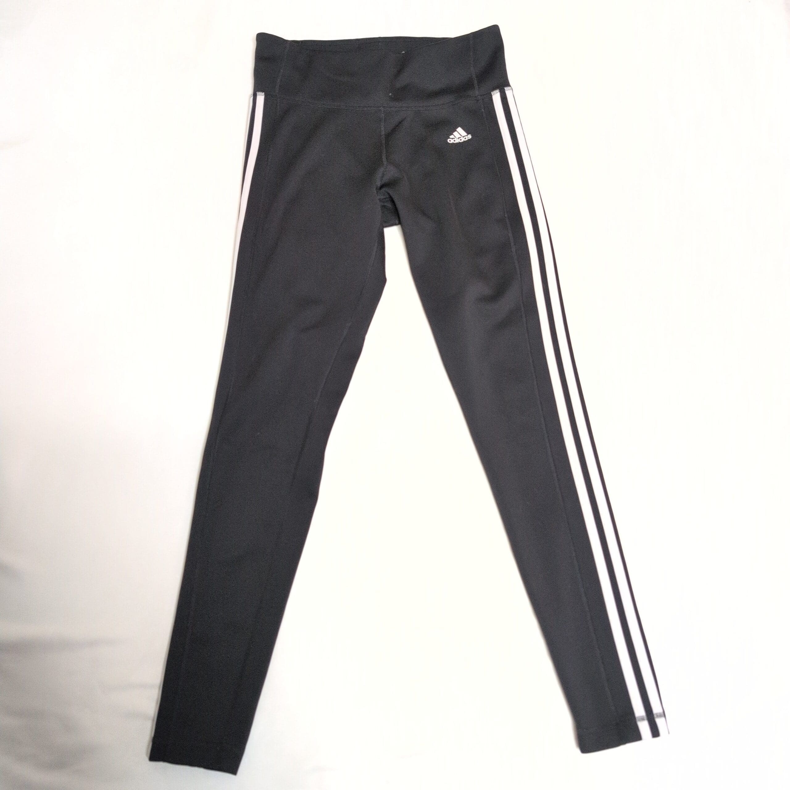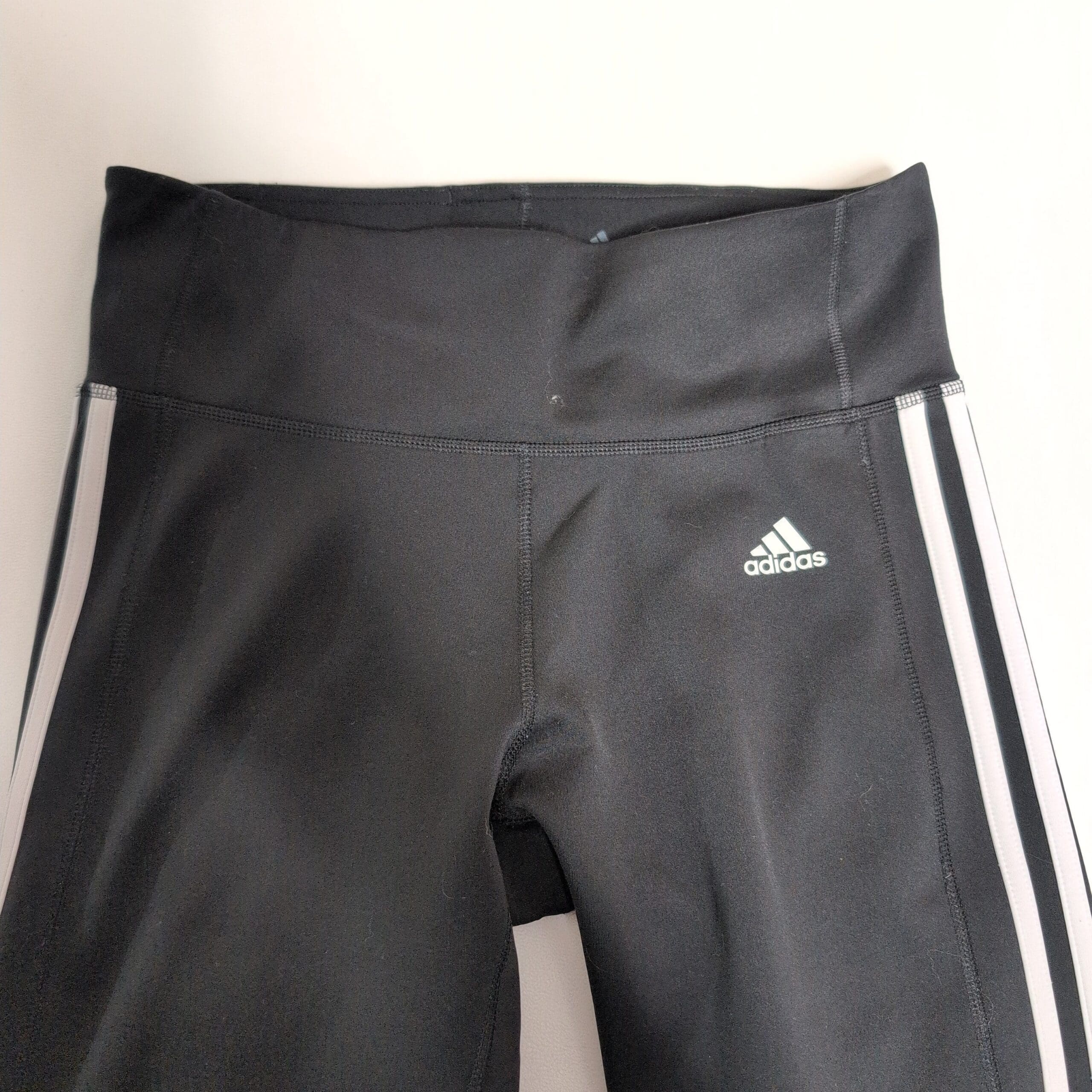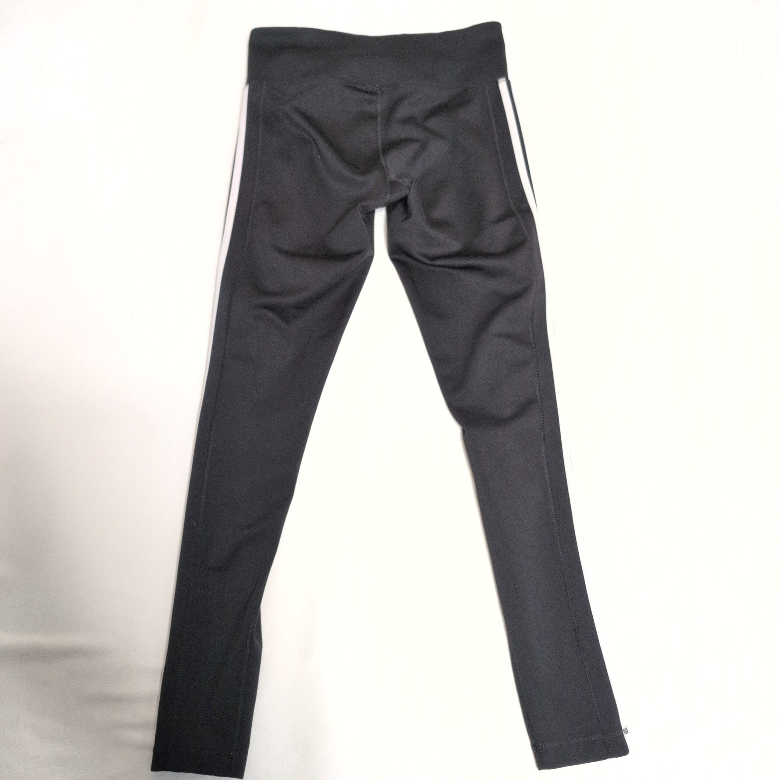 Adidas women’s black 3-stripe leggings in size M. Slim, figure-hugging fit with a wide high-rise waistband for a secure, flattering shape — great for workouts, yoga, or everyday athleisure. Classic white three-stripe detailing runs down each leg with a small Adidas logo on the hip. Stretchy, comfortable fabric with good recovery and flatlock seams for reduced chafing. Good used condition with light signs of wear consistent with gentle use; no holes or visible stains.