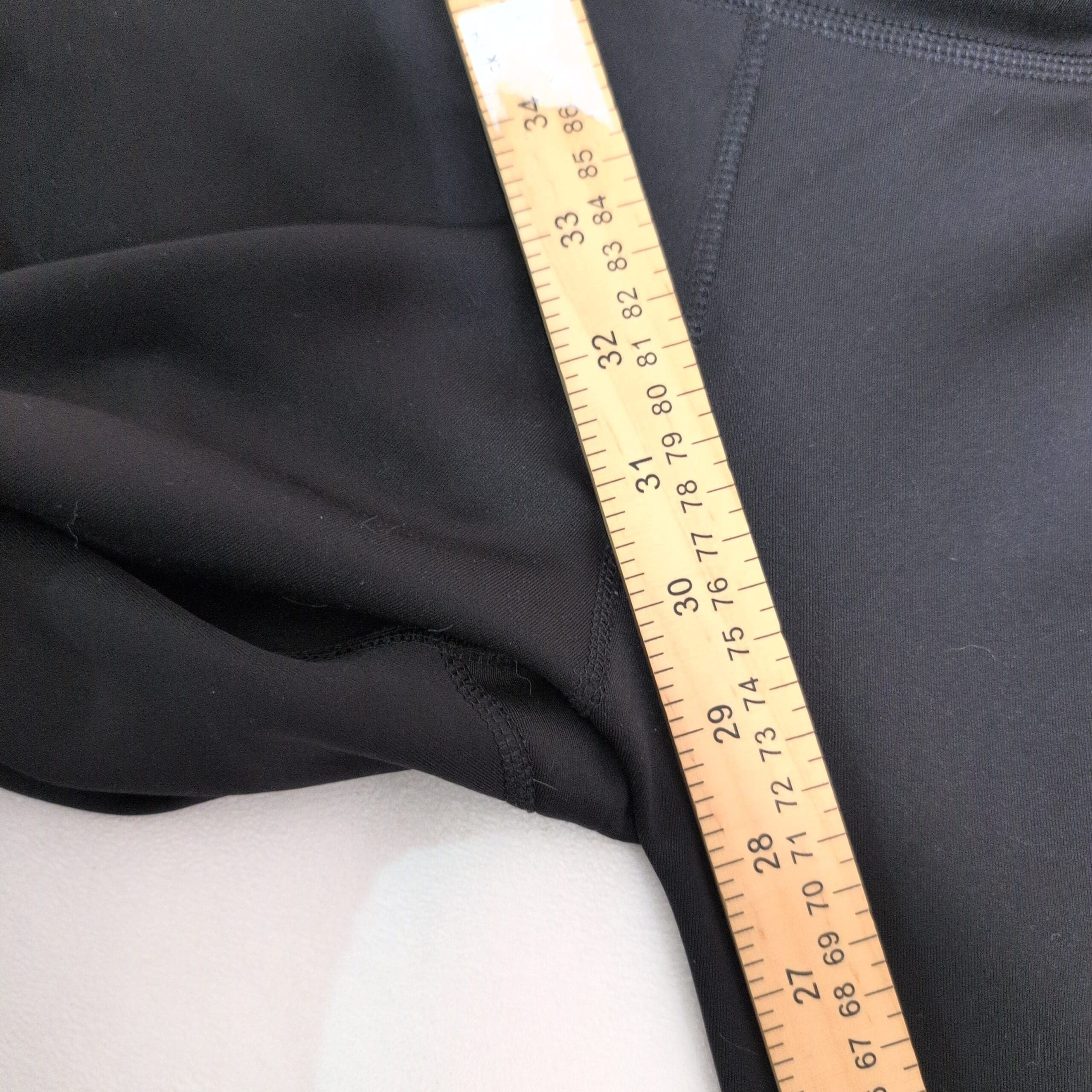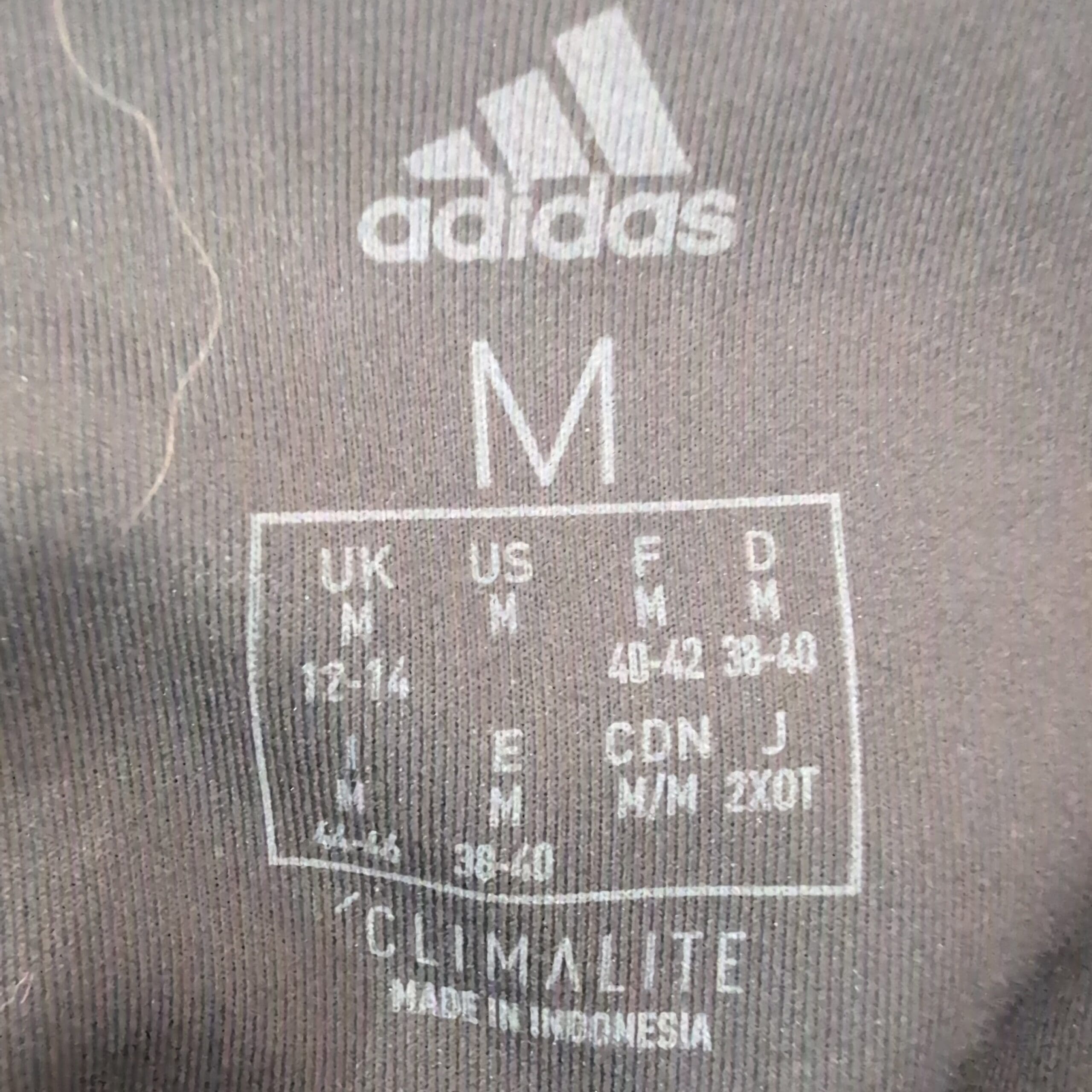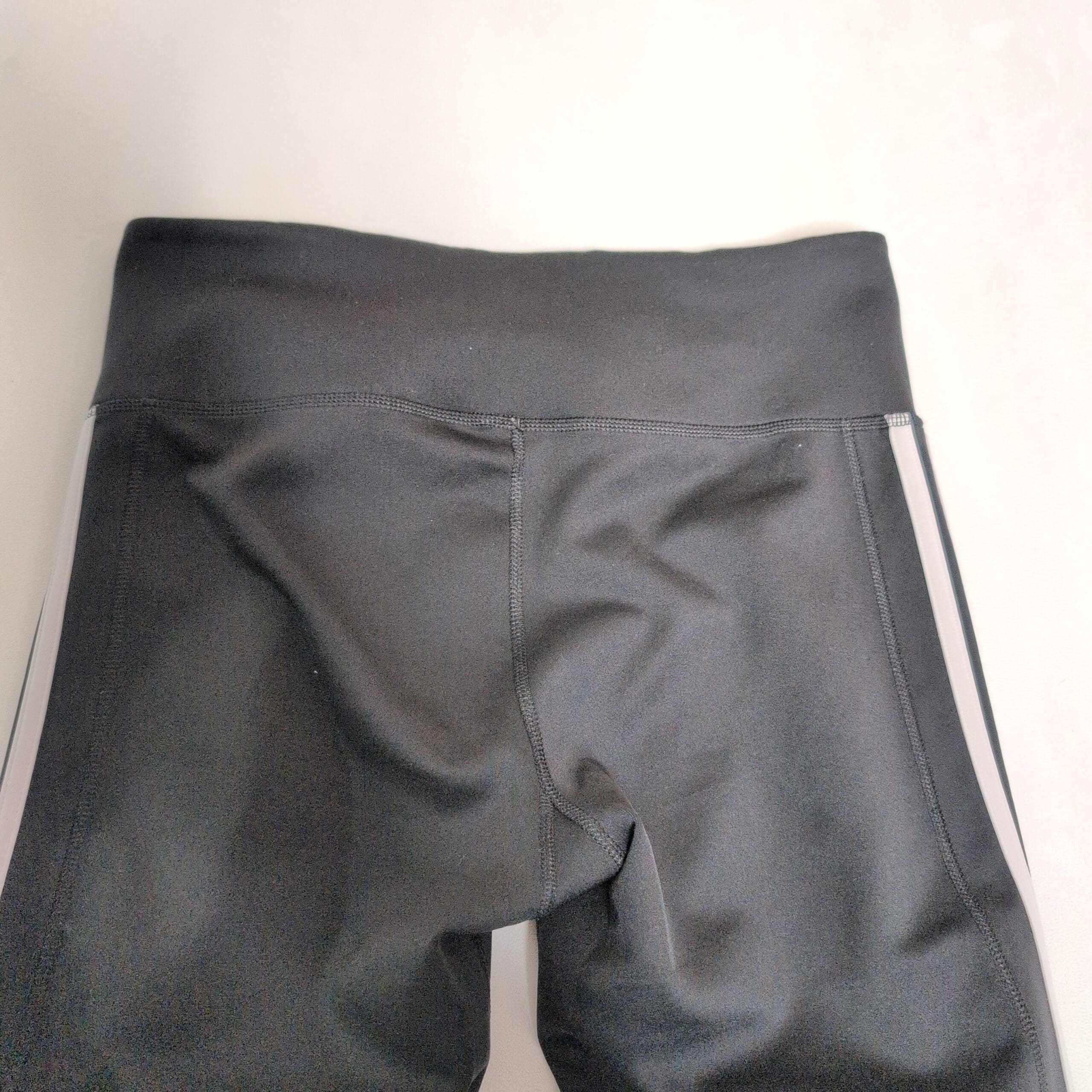 Adidas women’s black 3-stripe leggings in size M. Slim, figure-hugging fit with a wide high-rise waistband for a secure, flattering shape — great for workouts, yoga, or everyday athleisure. Classic white three-stripe detailing runs down each leg with a small Adidas logo on the hip. Stretchy, comfortable fabric with good recovery and flatlock seams for reduced chafing. Good used condition with light signs of wear consistent with gentle use; no holes or visible stains.