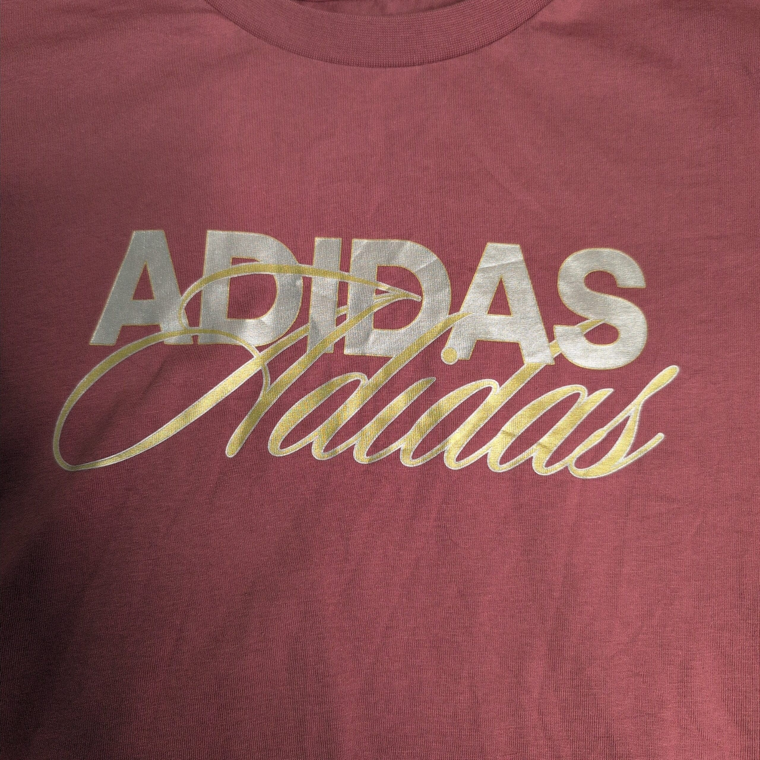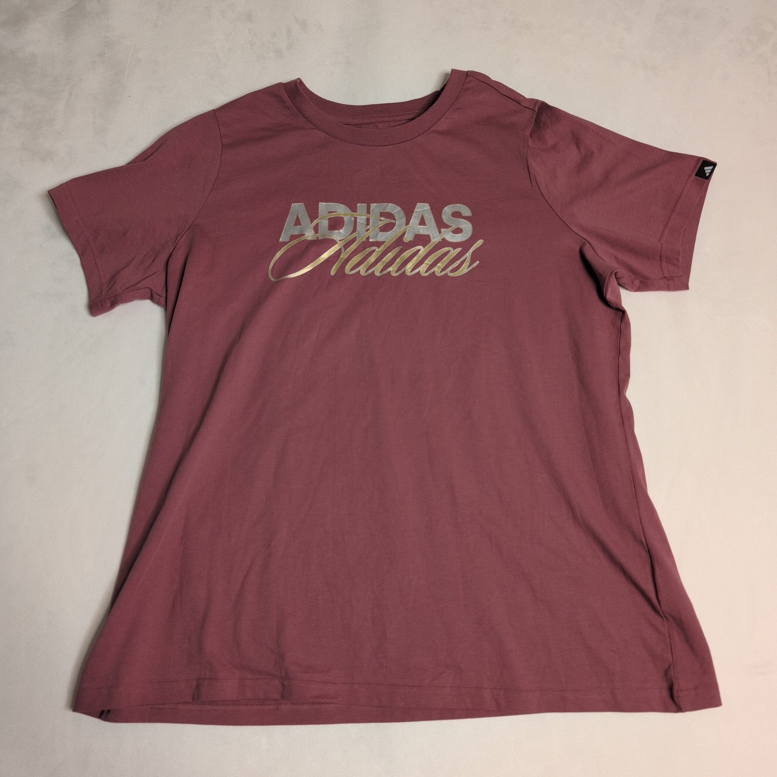 Adidas women’s short sleeve logo tee in dusty rose with a metallic script logo at the chest. Classic crew neckline and relaxed fit — great for everyday athleisure or casual wear. Pre-owned; overall good condition with light, normal wear visible in photos. Size not listed (no size shown) — please request exact measurements if you need fit details. Fabric content not provided.