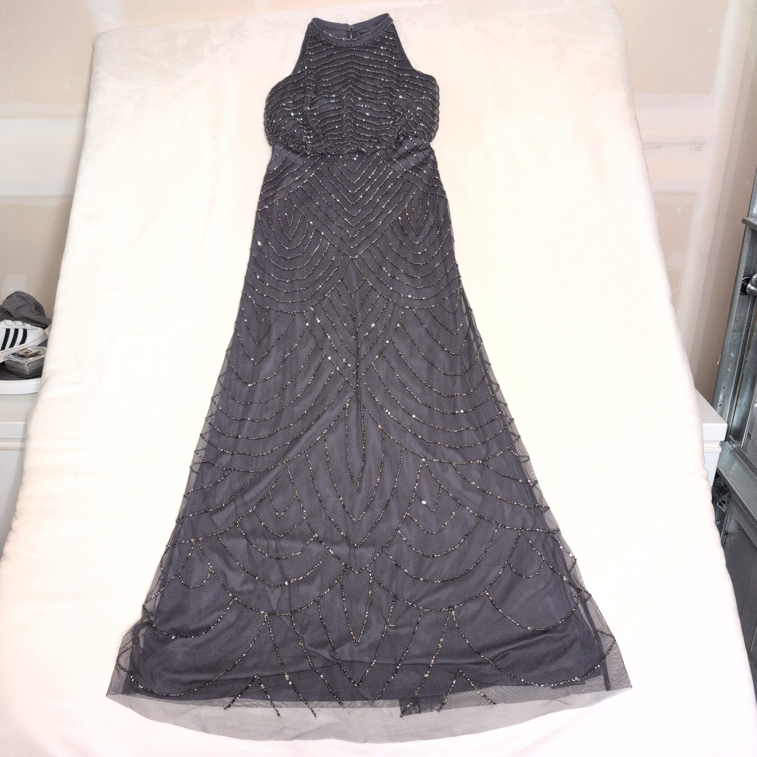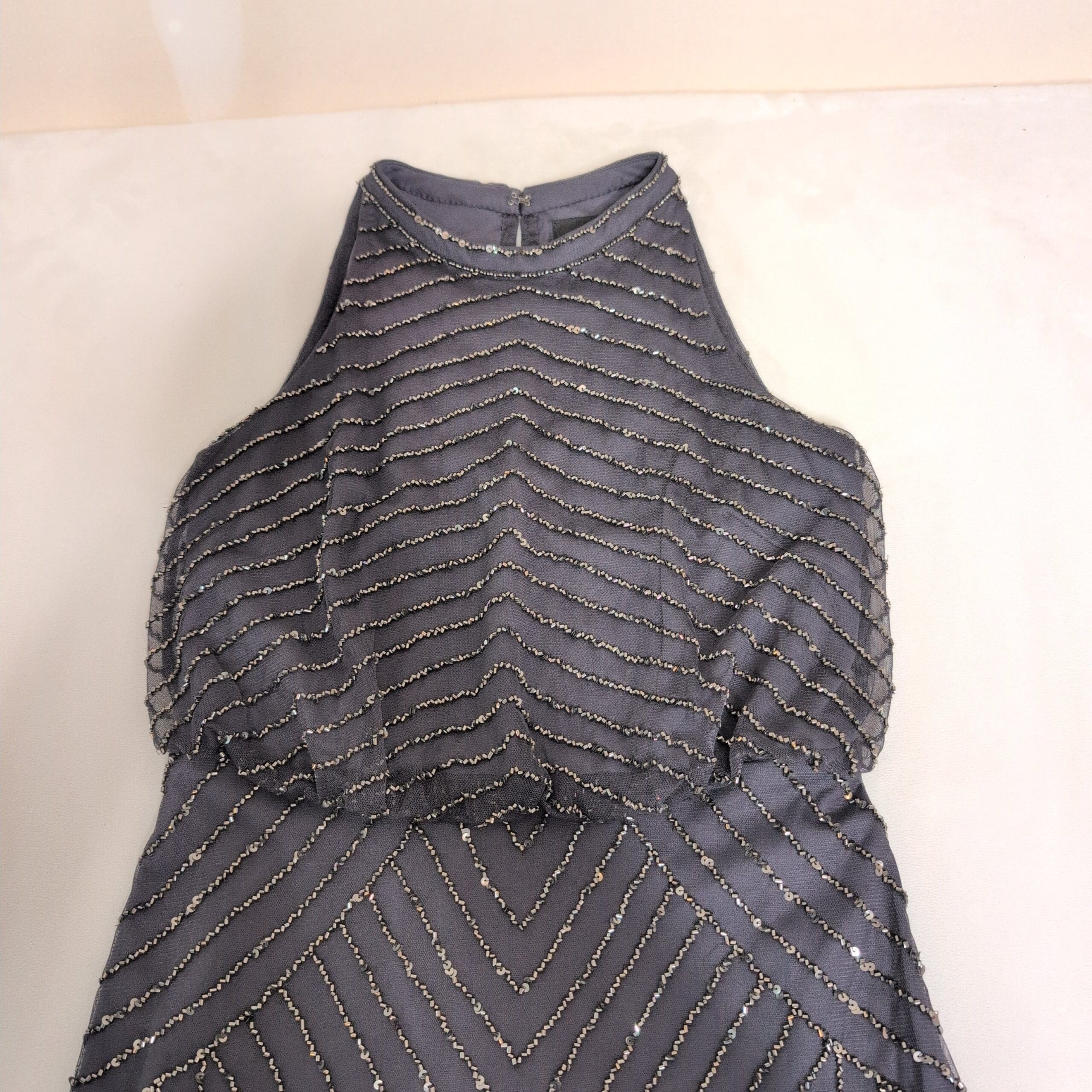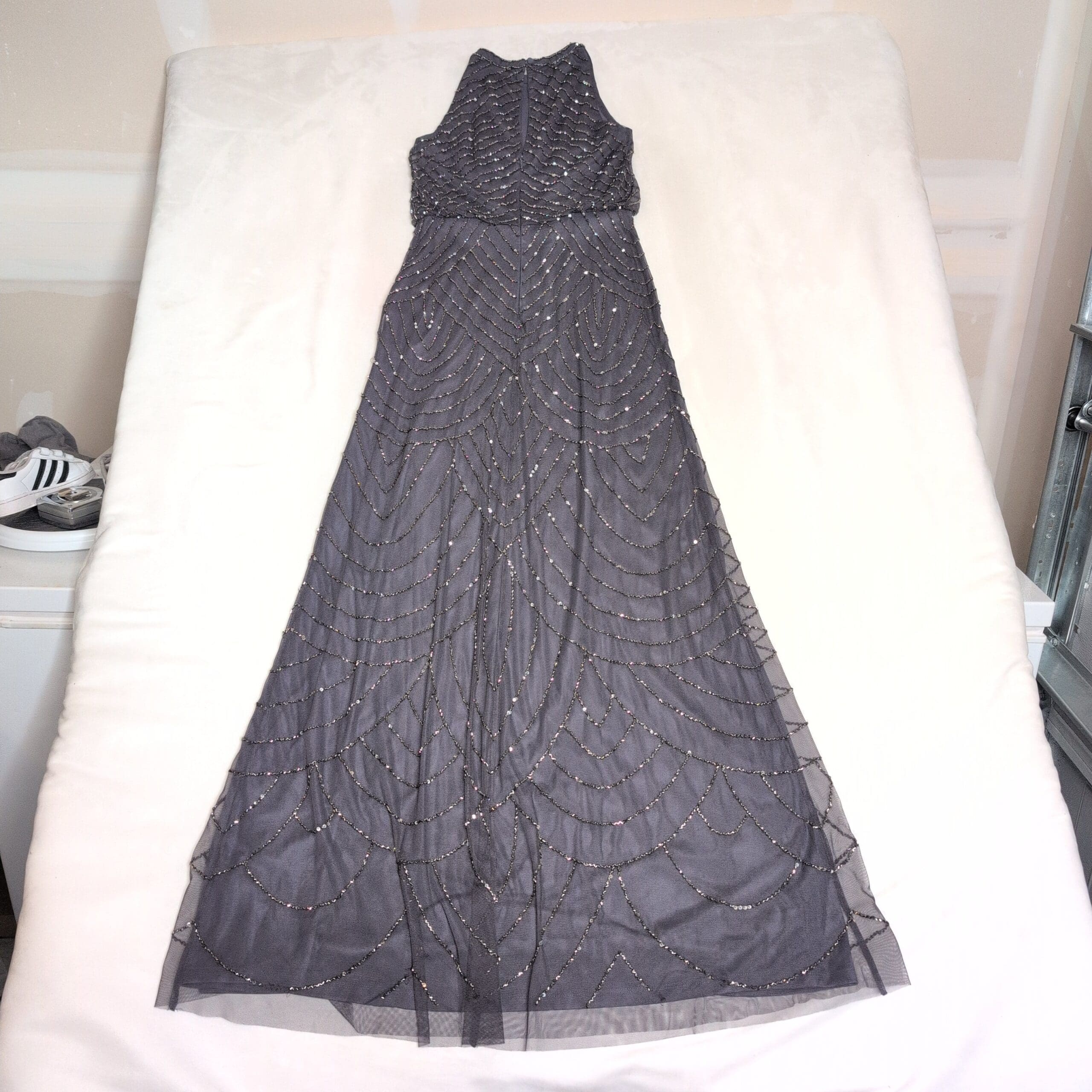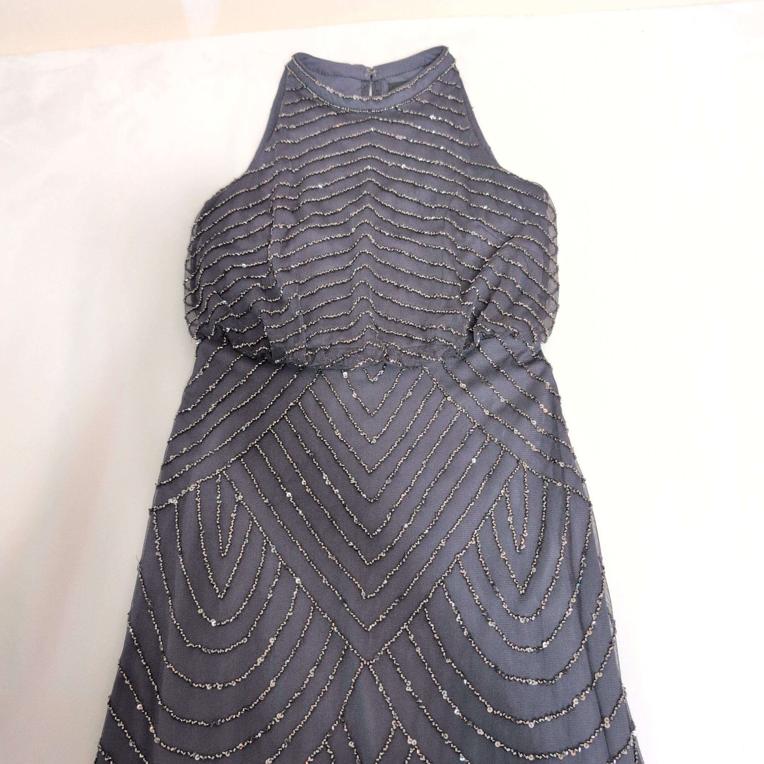Adrianna Papell gray beaded maxi dress in a size 2. Features a high halter-style neckline and fitted bodice that flows into a full-length skirt. Intricate beadwork arranged in scalloped and chevron-inspired patterns on a delicate mesh overlay gives a vintage-inspired, elegant evening look.