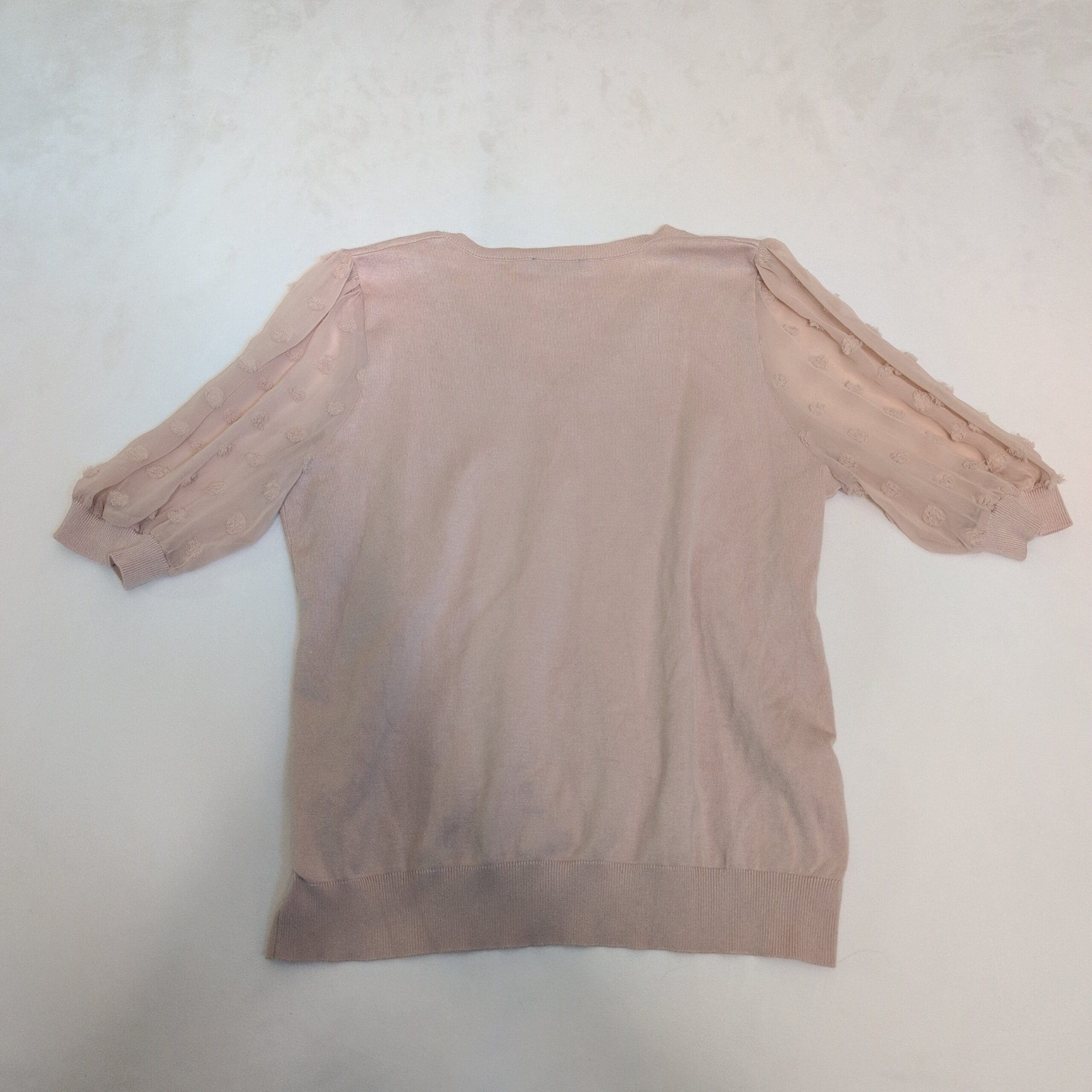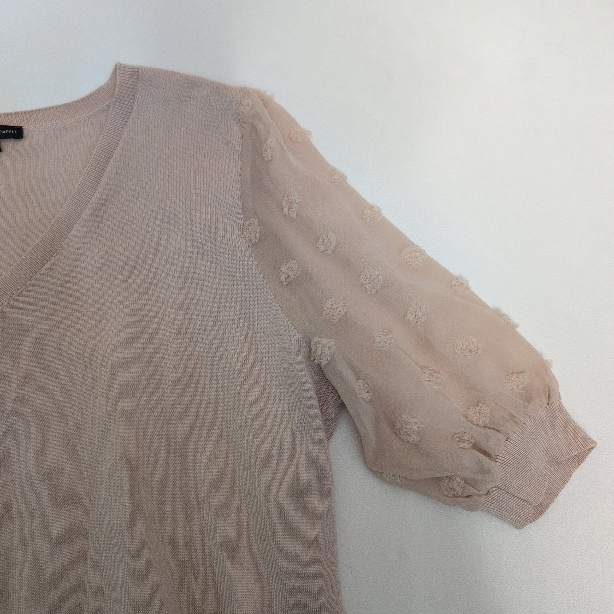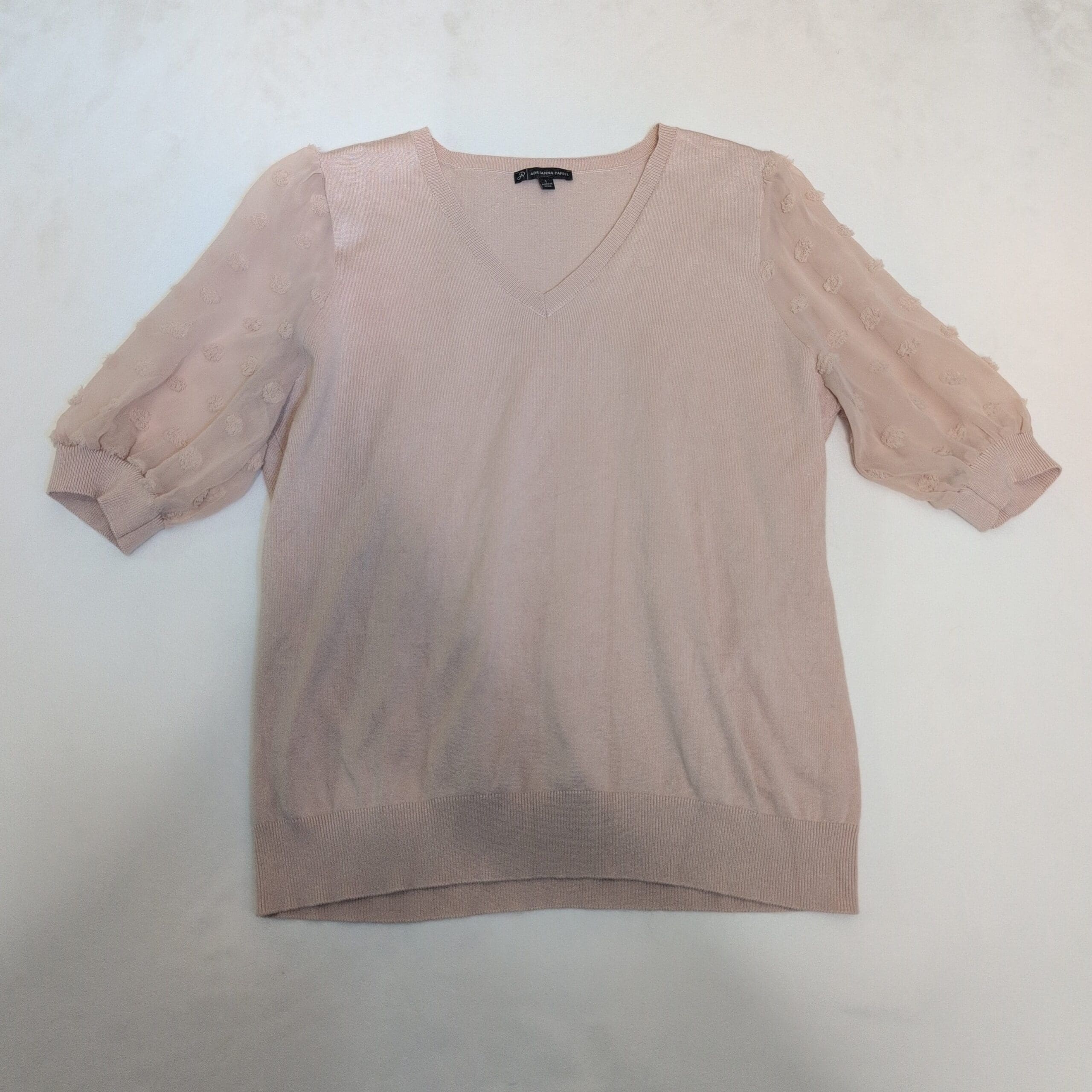 Adrianna Papell women’s V-neck sweater in soft pink, size L. Knit body with sheer textured puff sleeves featuring raised dot details. Ribbed V-neck, cuffs and hem for a polished finish. Versatile piece that dresses up with skirts or pairs casually with jeans.
