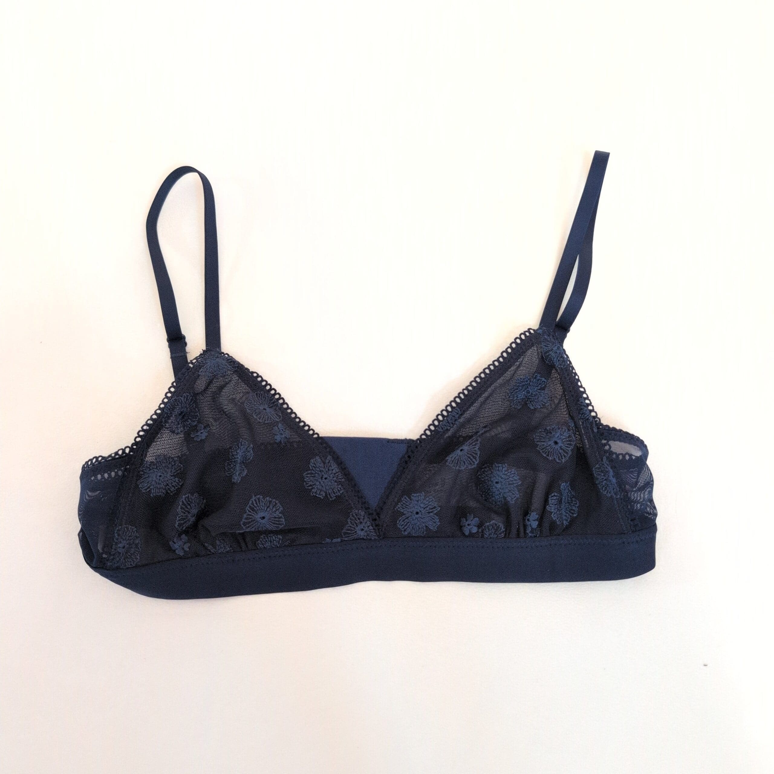 Aerie embroidered mesh triangle bralette in deep blue. Sheer floral embroidery overlays soft mesh cups with a supportive elastic underband and adjustable shoulder straps for a customizable fit. Wire-free, lightweight design ideal for layering or everyday wear. Size: XS. Department: Women.