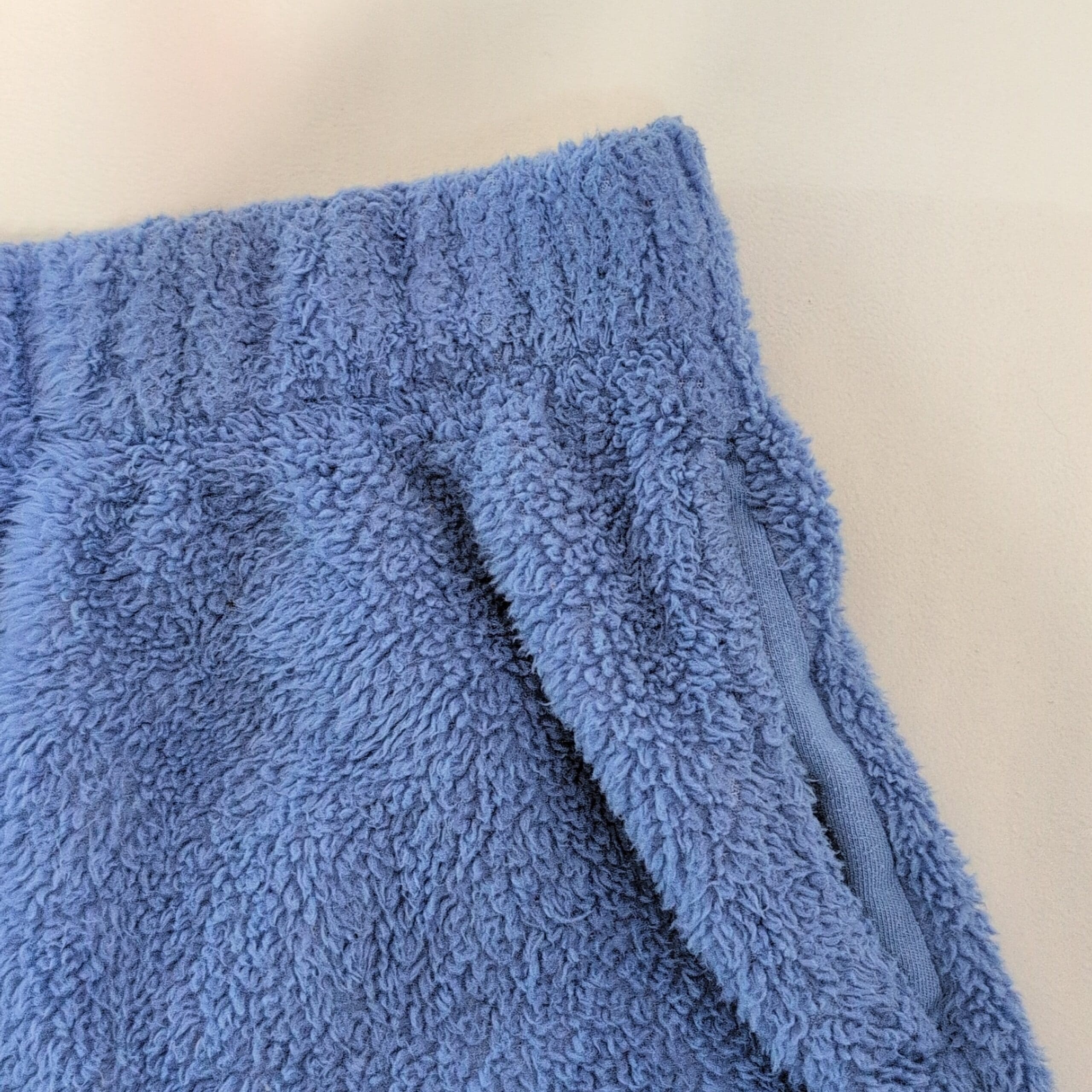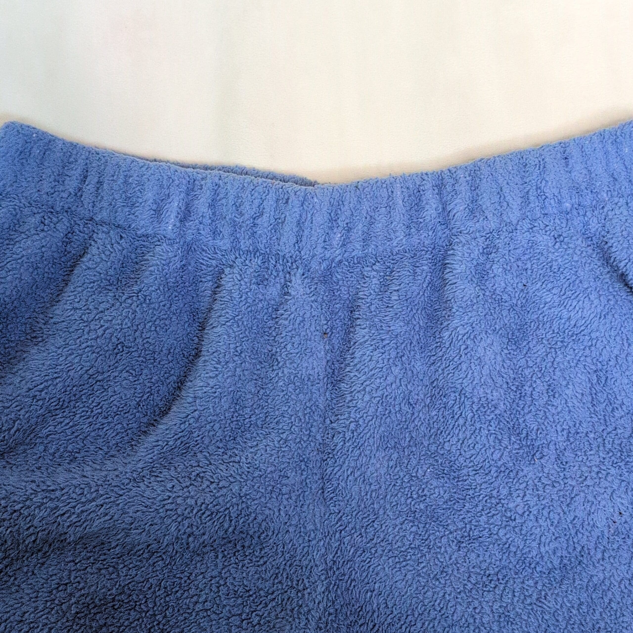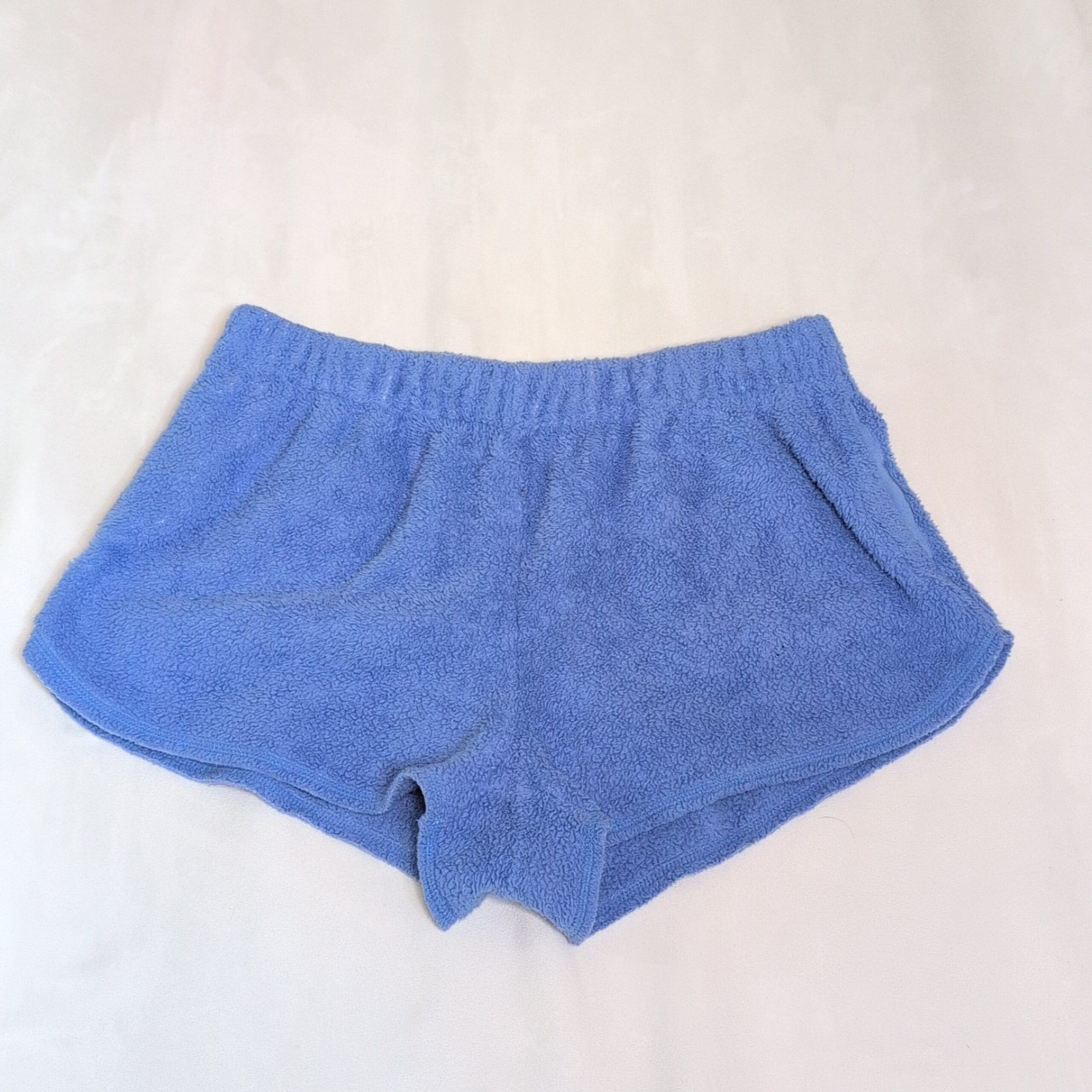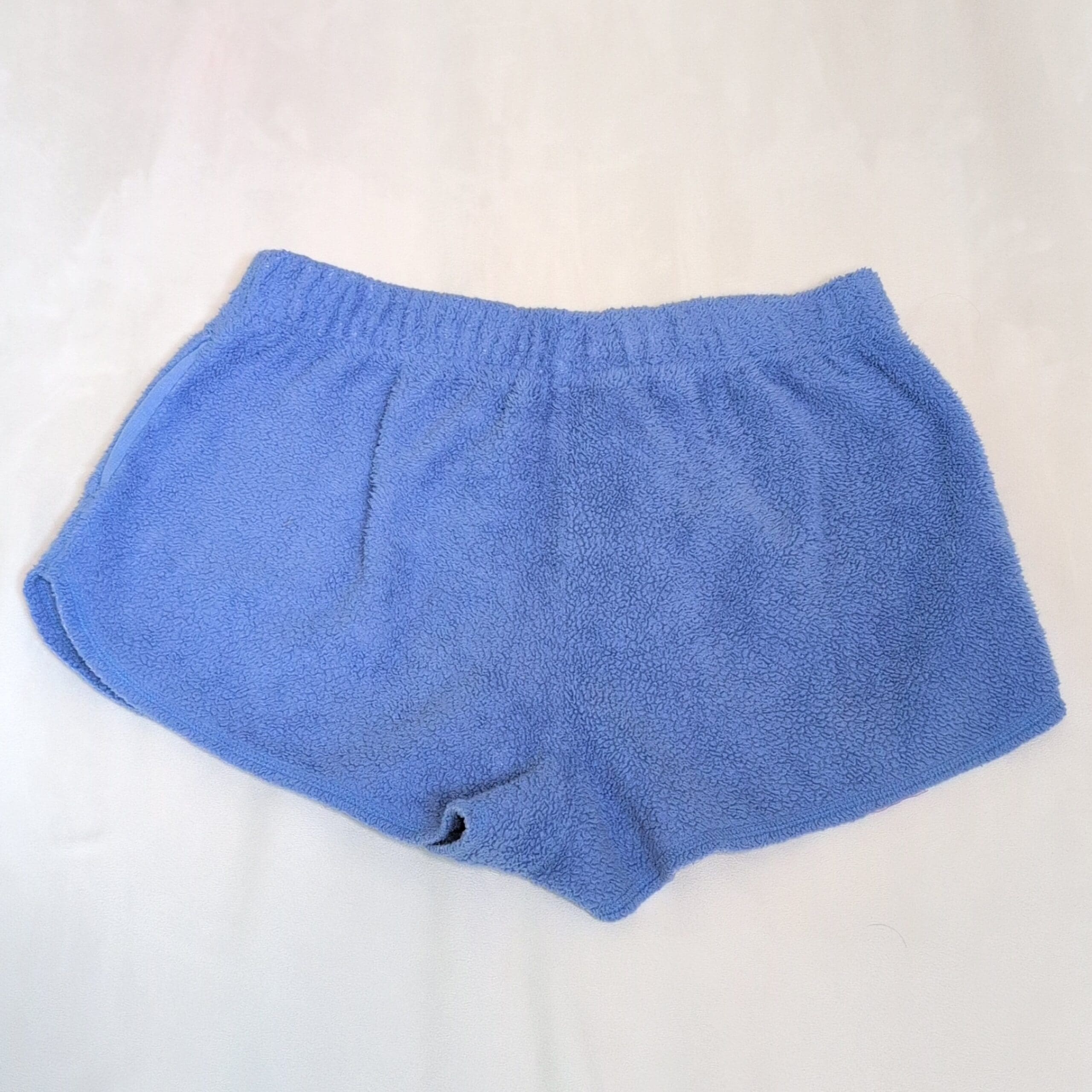 Soft blue terry cloth lounge shorts by Aerie in women’s size L. Features an elastic waistband, side pockets, and a relaxed curved-hem silhouette—perfect for lounging, beach days, or as a cozy after-shower layer. Gently used and free of major rips, tears, stains, or flaws; may show light, normal wear such as minor surface pilling. Color and texture are shown in photos.