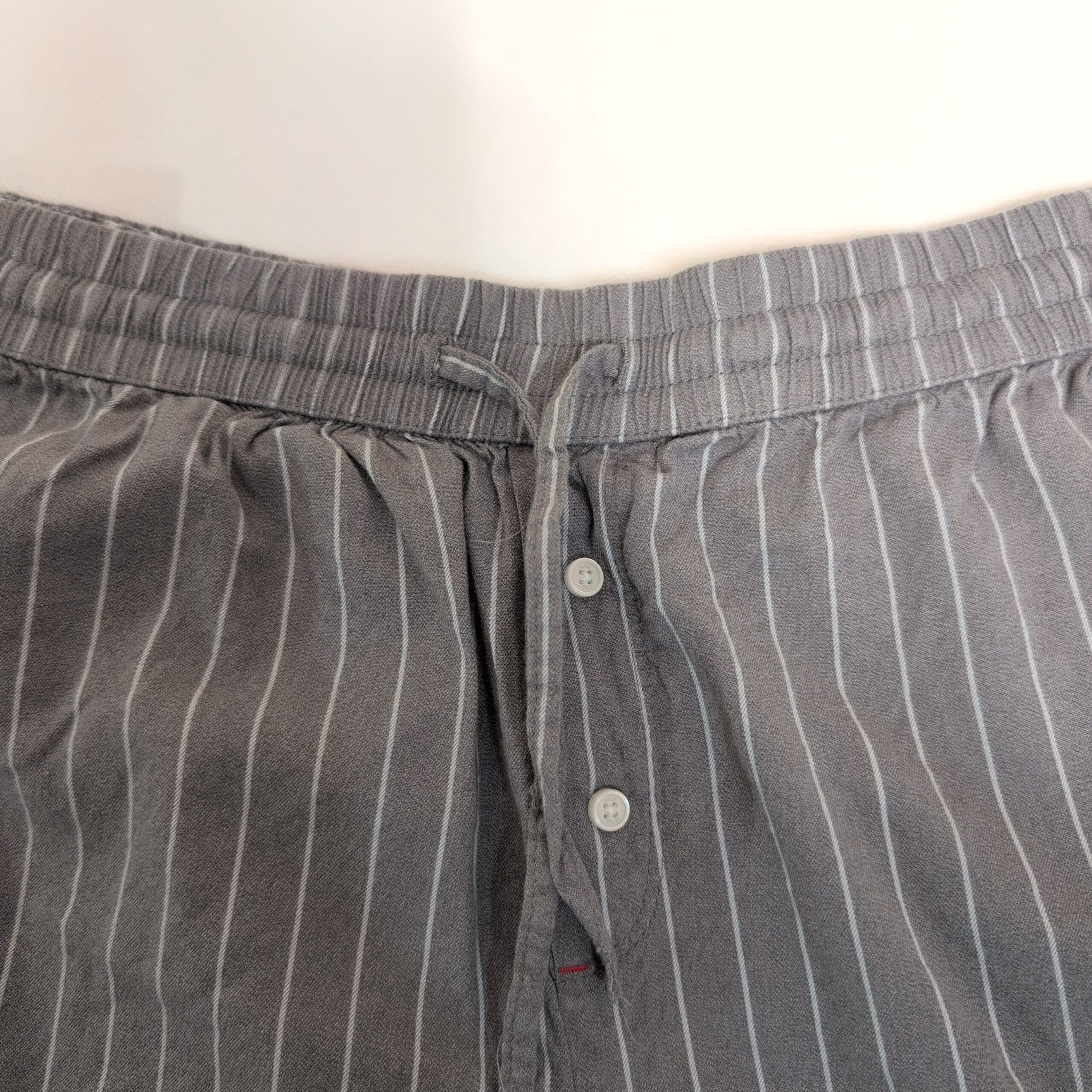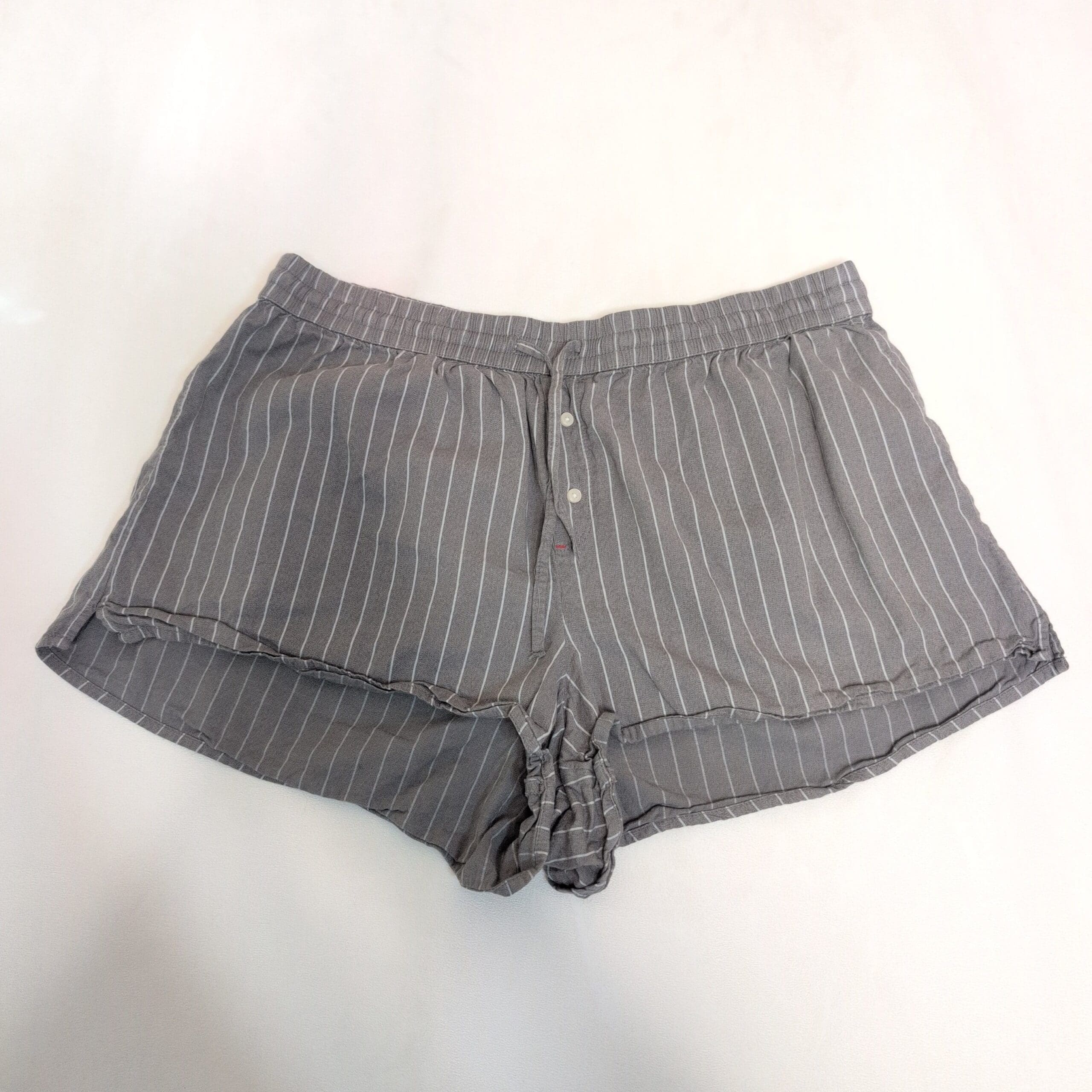 Aerie women’s sleep shorts in size L. Gray with thin white vertical pinstripes; lightweight, relaxed fit that’s perfect for lounging or bedtime. Features an elastic waistband with adjustable drawstring, a front two-button placket, and a curved hem for a flattering silhouette. Gently used — normal light wear consistent with pre-loved items; no noticeable stains or holes seen in photos. Please review all photos for details and measurements.