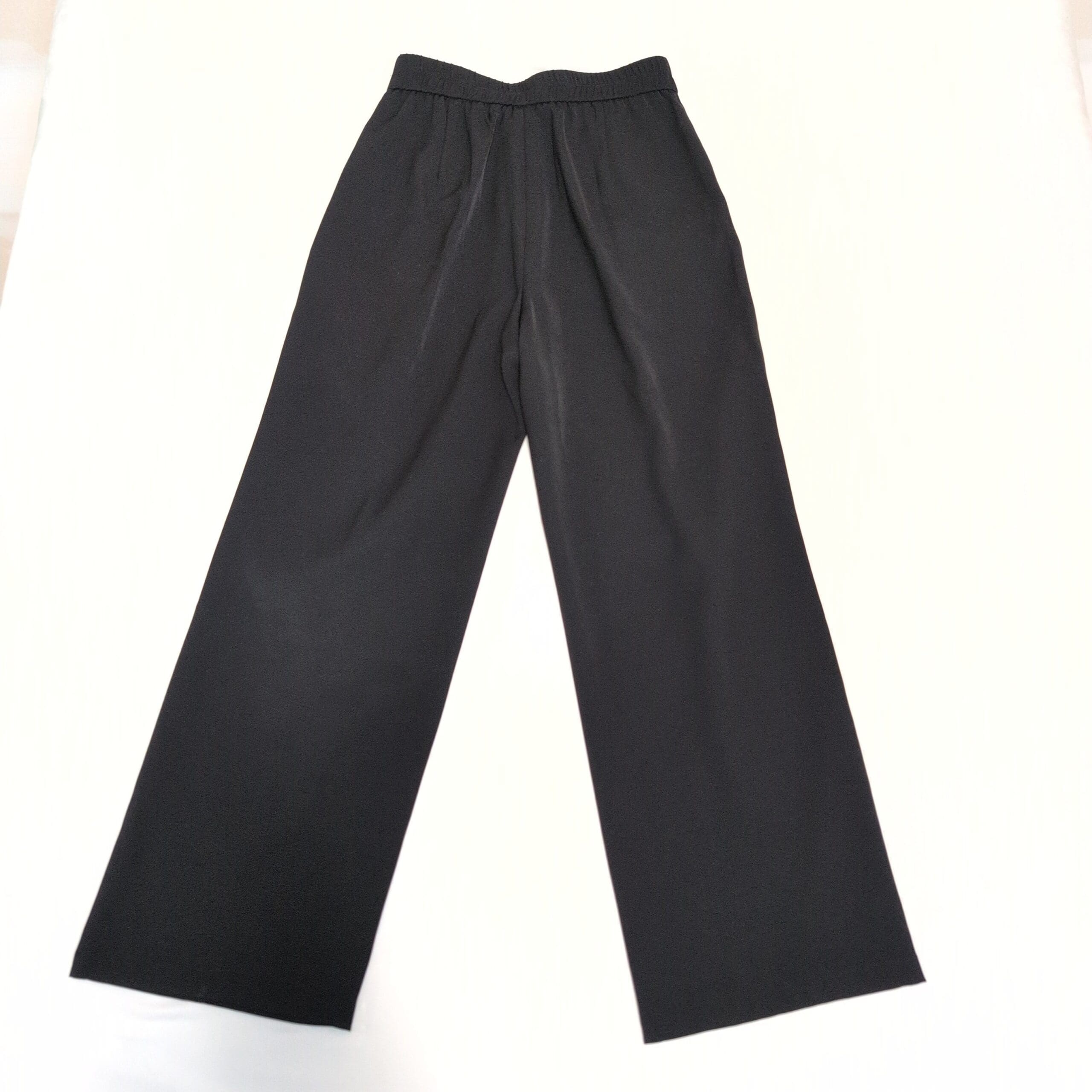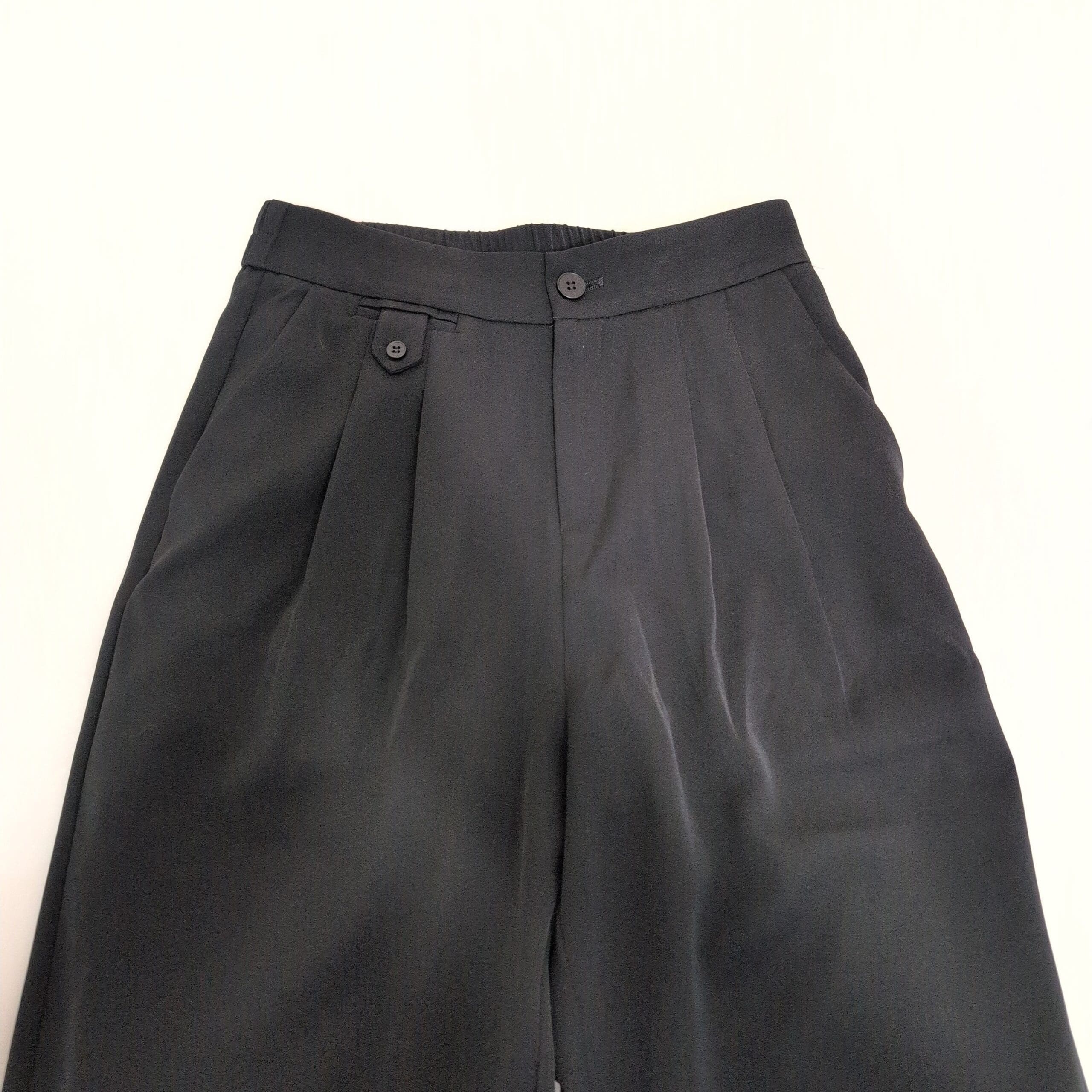 Classic Aha Selected black trousers in size S featuring a high-rise waist and elegant wide-leg silhouette. Tailored with soft front pleats and a buttoned waistband for a polished look, these versatile trousers drape smoothly for office or dressier occasions. Pre-owned — please review photos for condition details and see the garment label for fabric content and care instructions.