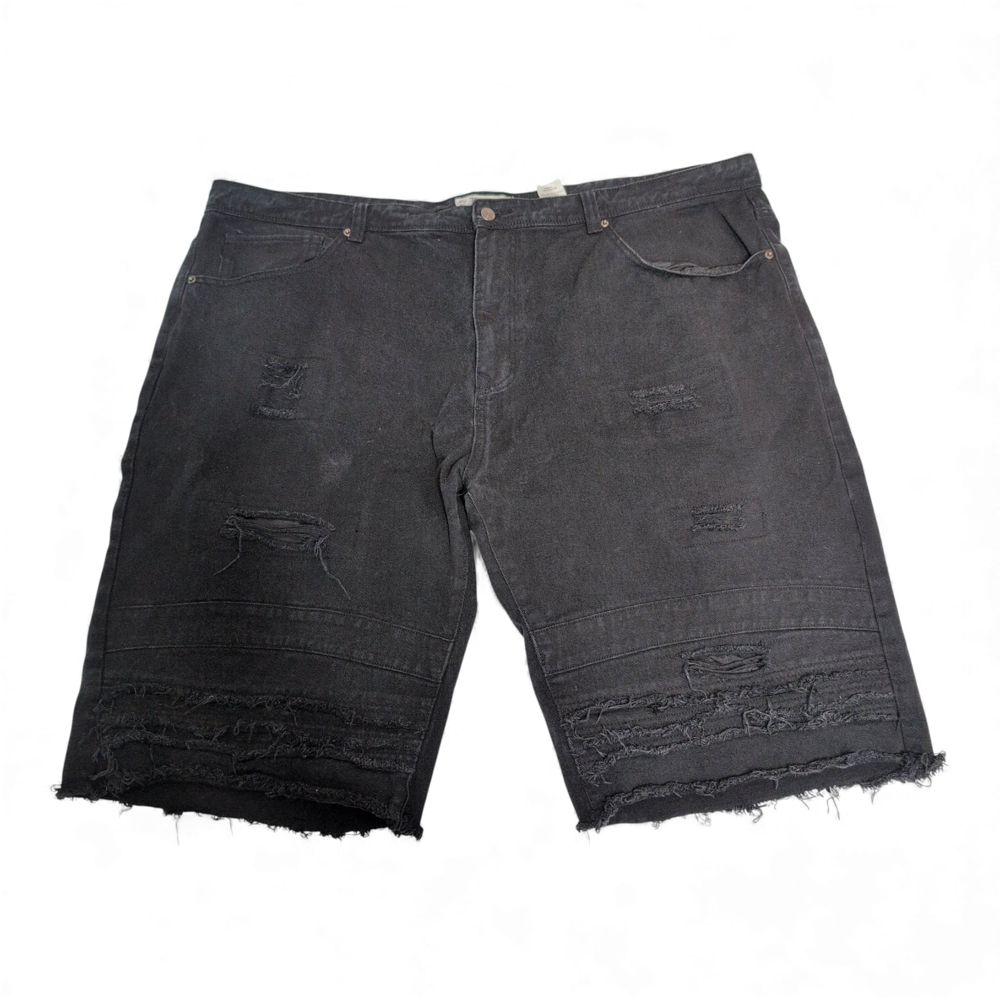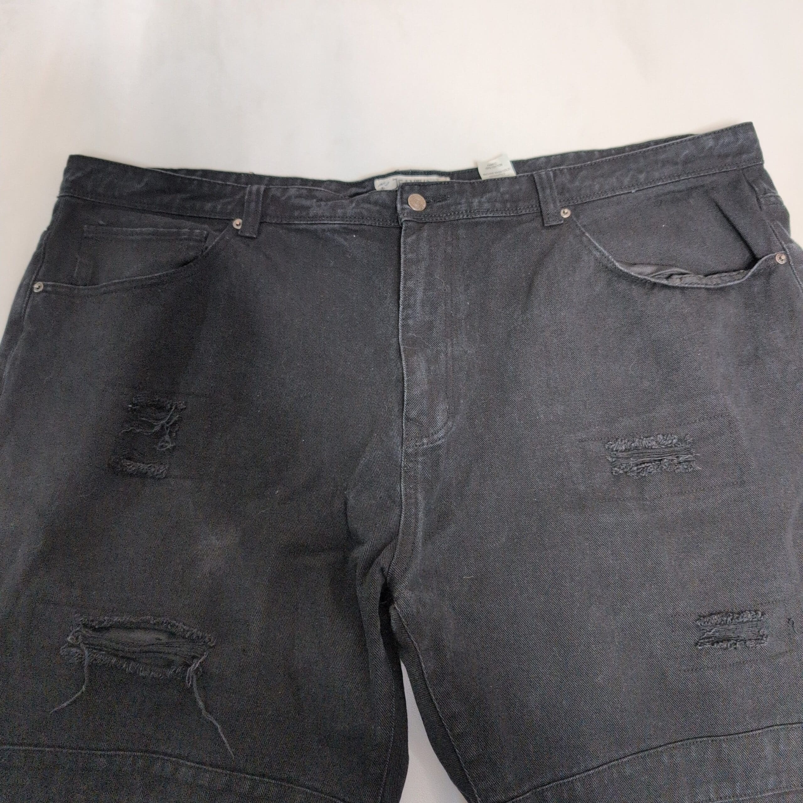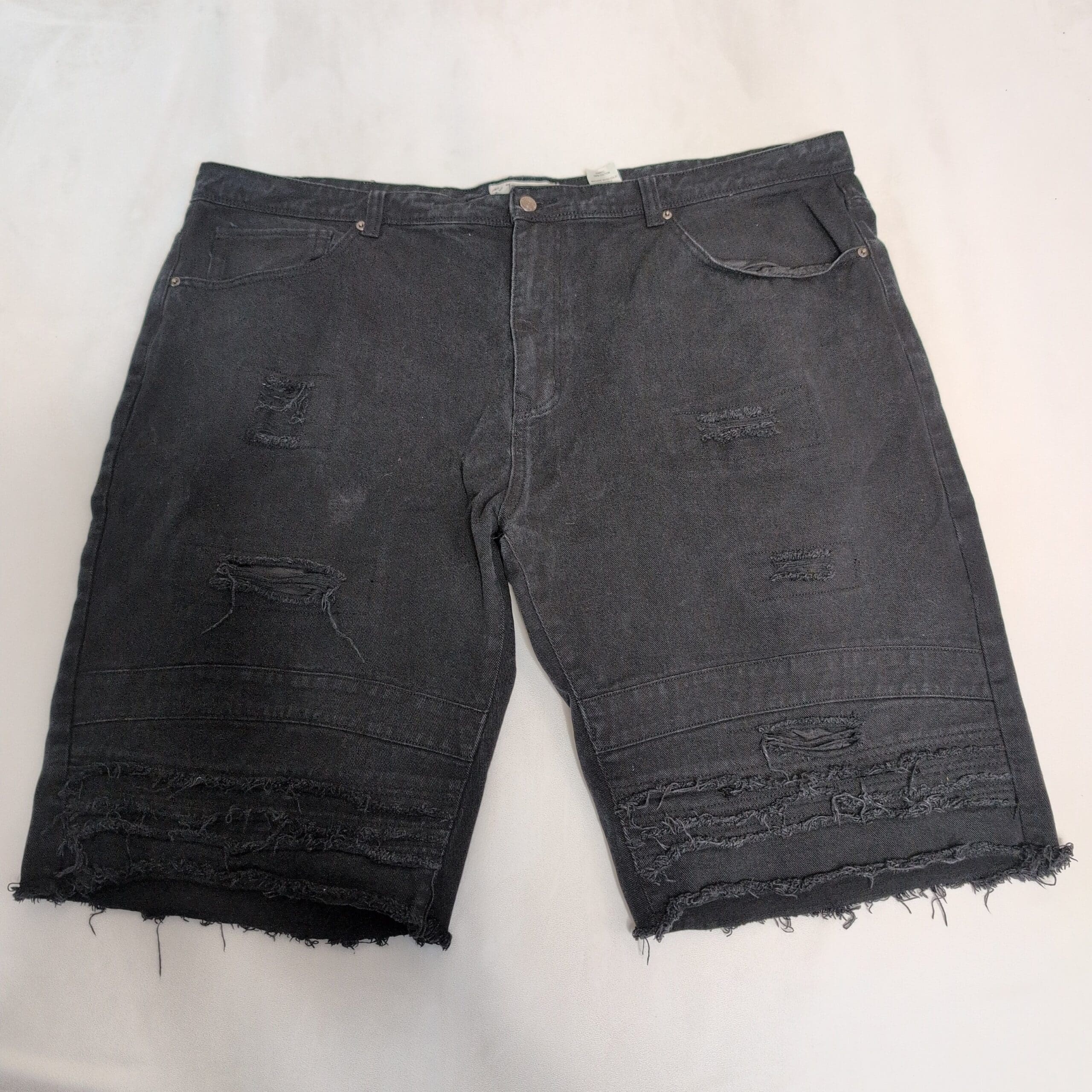Akademiks men’s black distressed denim jean shorts in Big & Tall size 50. Classic five-pocket styling with intentional distressing and frayed raw hem for an urban, lived-in look. Relaxed fit through the seat and thigh; labeled size 50. Slight faded wash and scattered rips add character — great for streetwear and casual summer rotation. Pre-owned with normal wear consistent with the distressed design; please review photos for details.