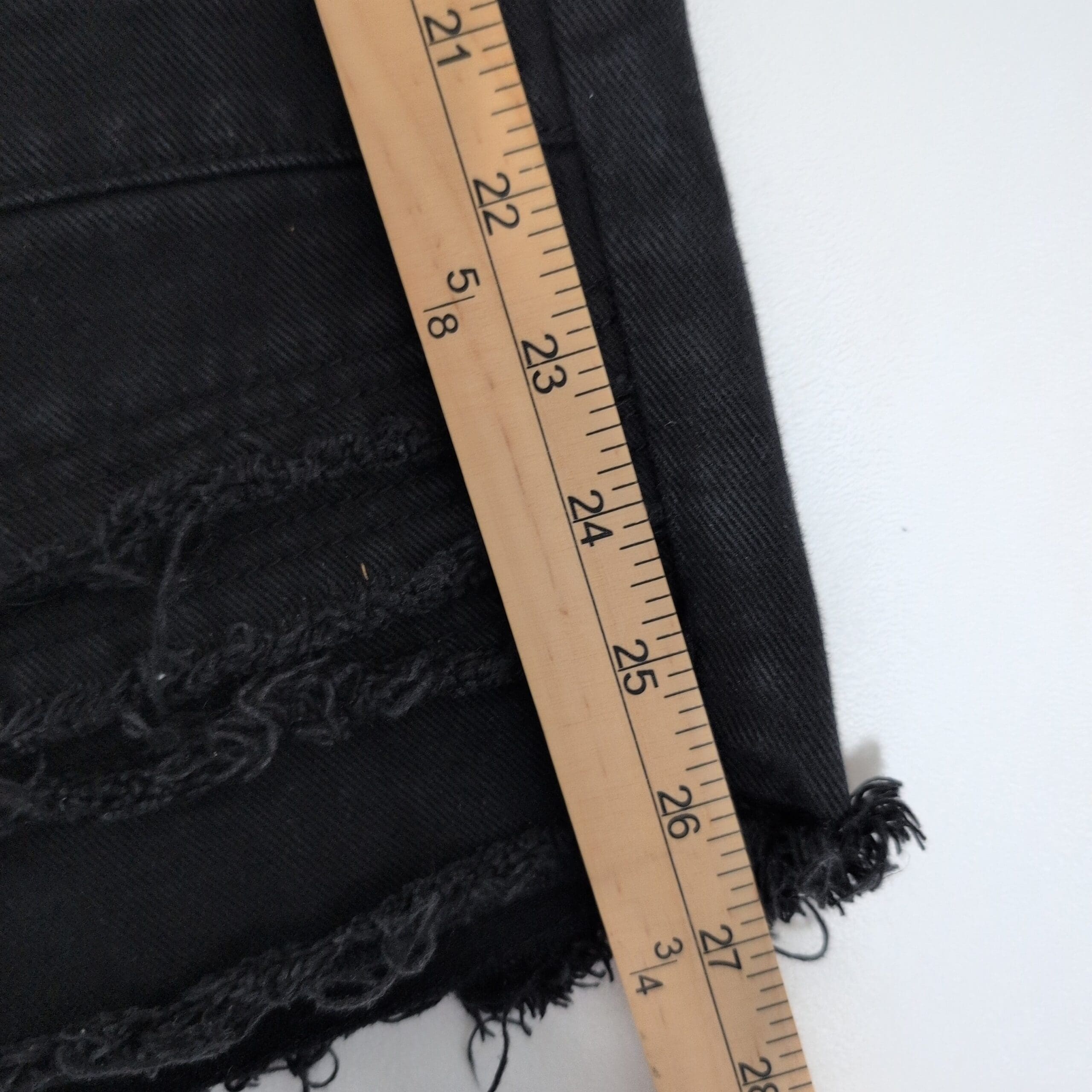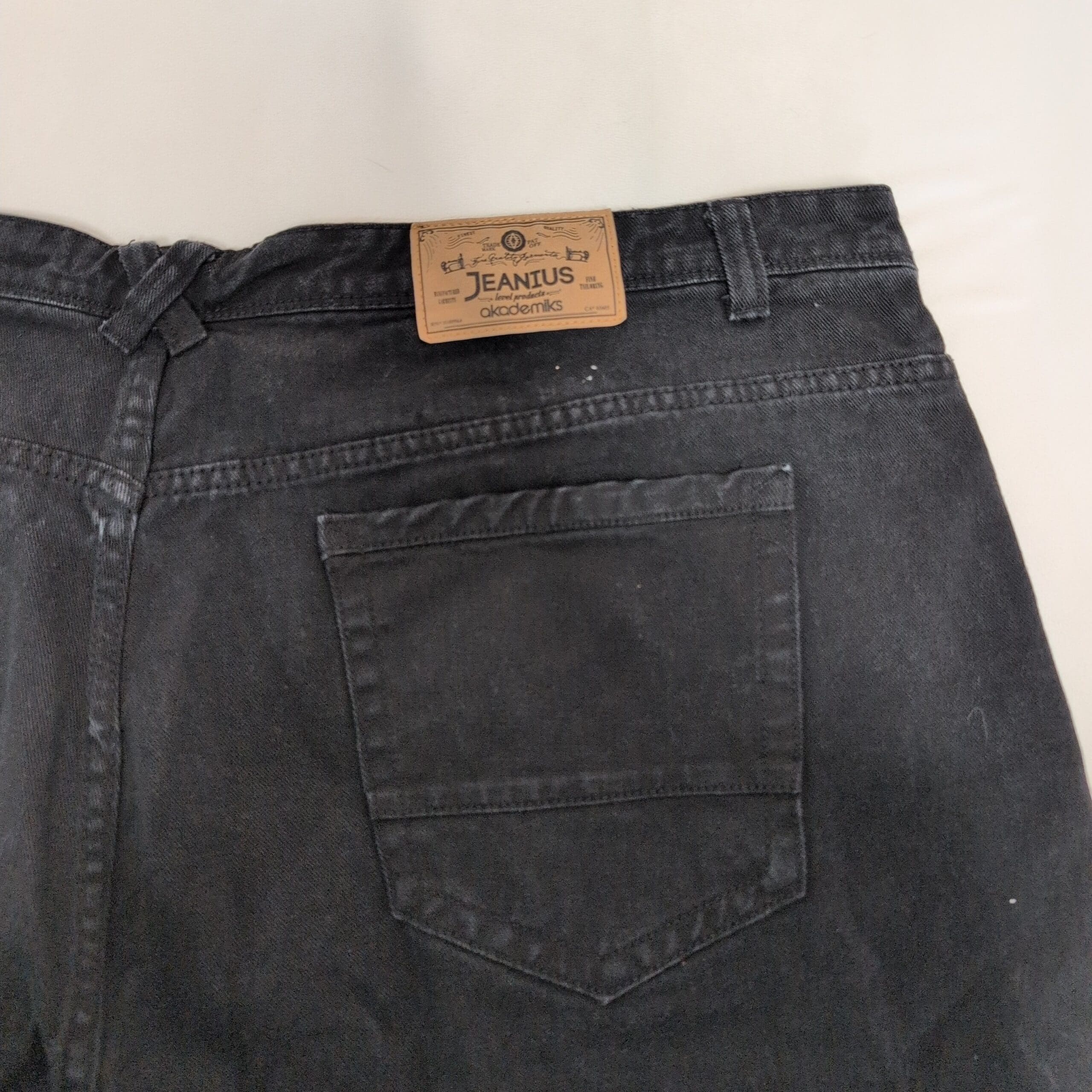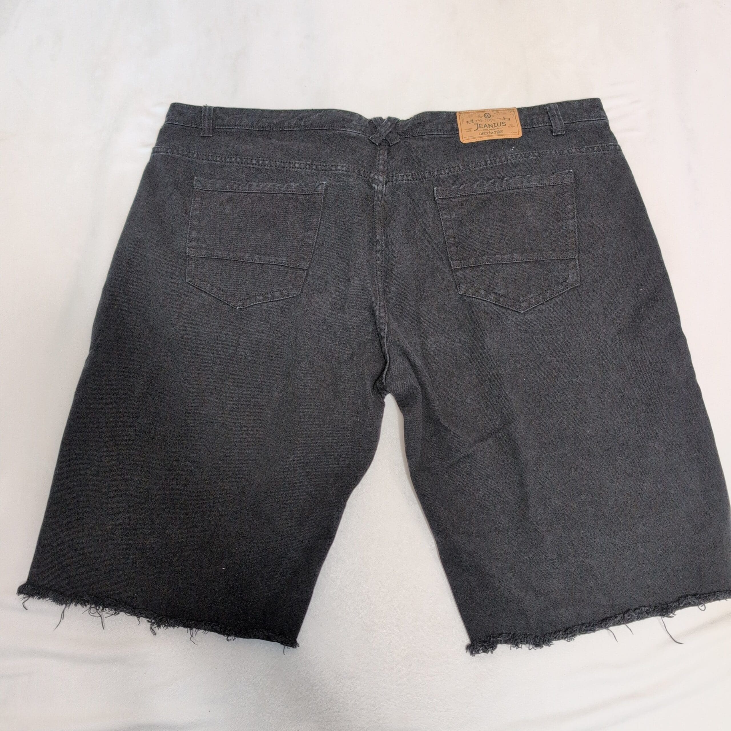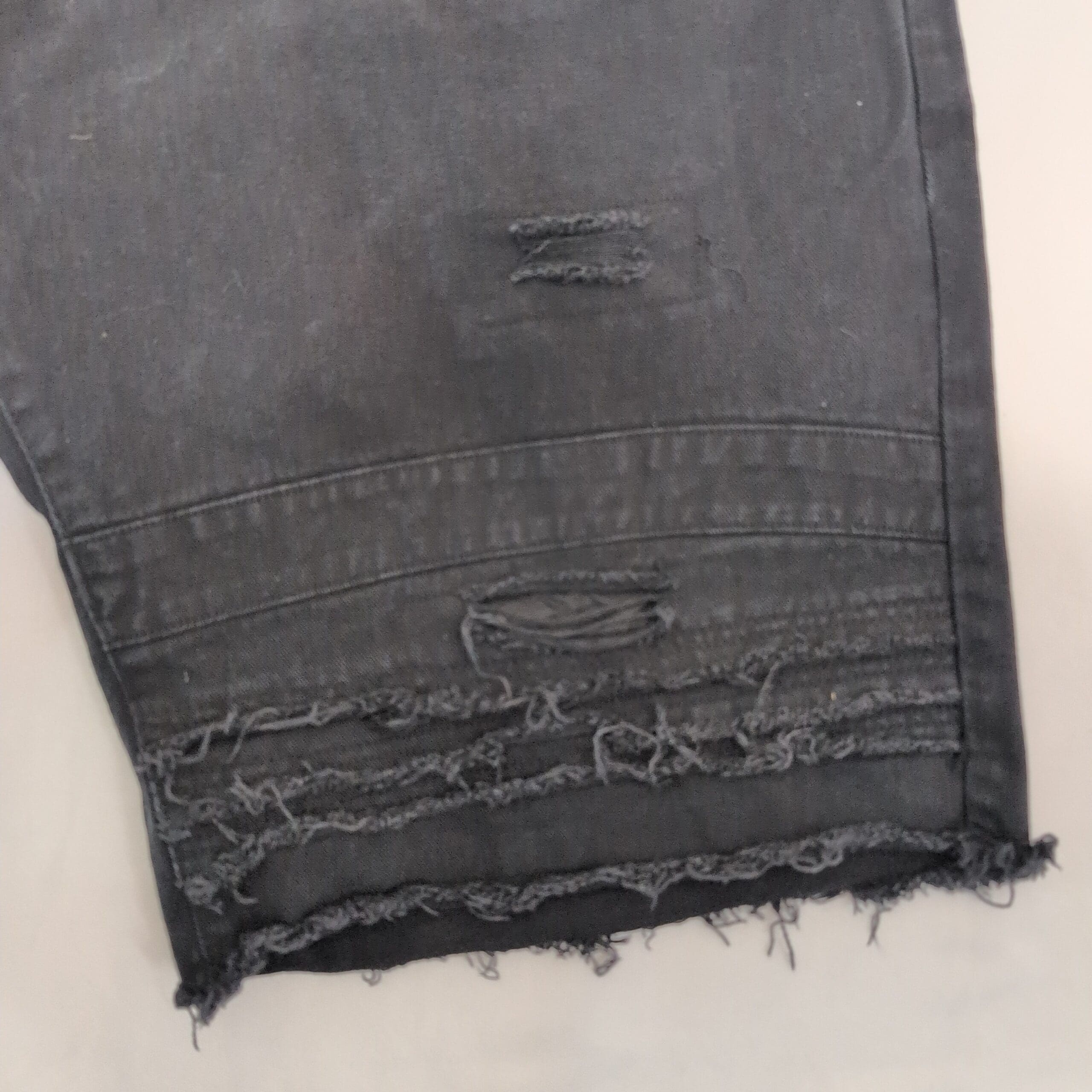 Akademiks men’s black distressed denim jean shorts in Big & Tall size 50. Classic five-pocket styling with intentional distressing and frayed raw hem for an urban, lived-in look. Relaxed fit through the seat and thigh; labeled size 50. Slight faded wash and scattered rips add character — great for streetwear and casual summer rotation. Pre-owned with normal wear consistent with the distressed design; please review photos for details.