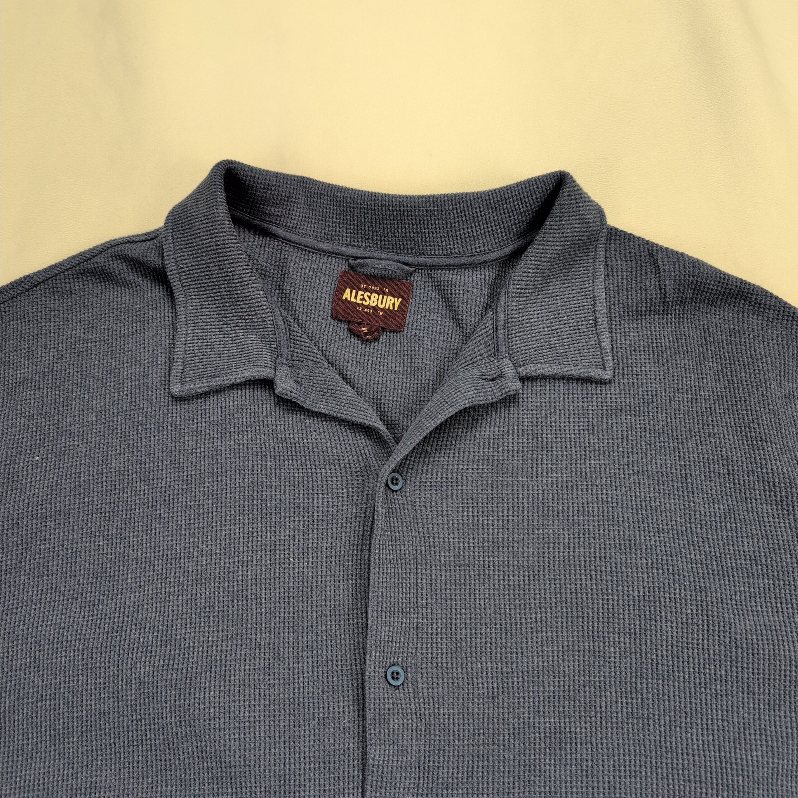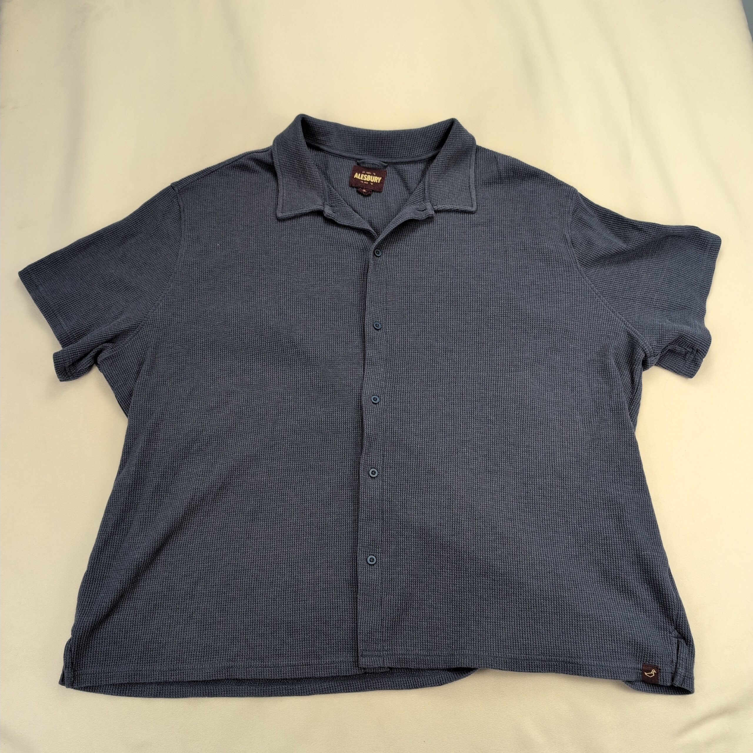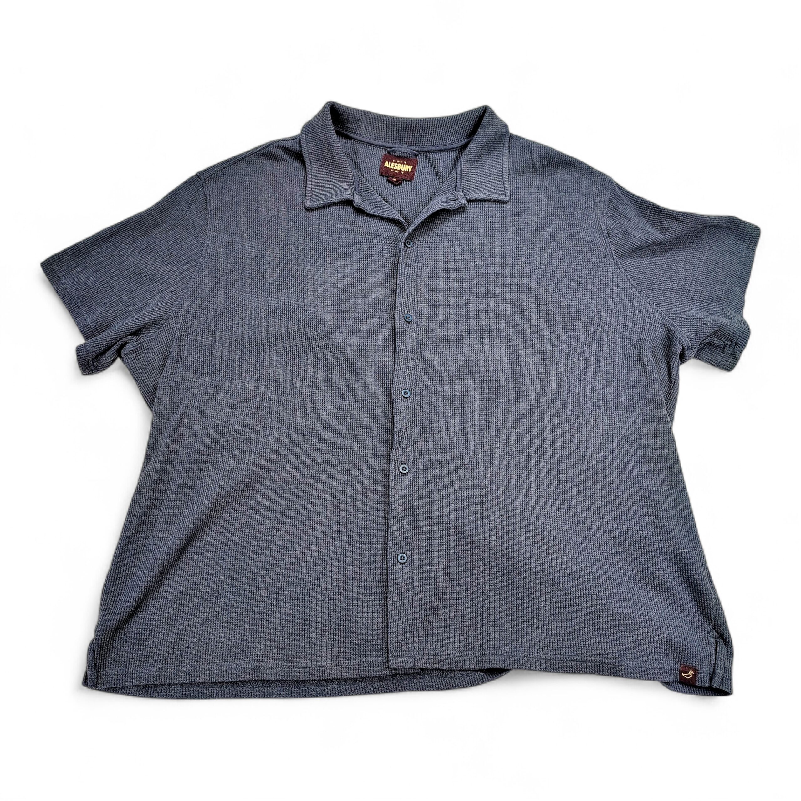 Blue Alesbury men’s short-sleeve button shirt in 3XL (Big & Tall). Soft waffle-knit texture with a relaxed camp-style collar and full button-front placket. Lightweight, breathable casual style good for everyday wear or layering. Label shows Alesbury brand. Excellent used condition — free of major rips, tears, or stains; typical light wear may be present.