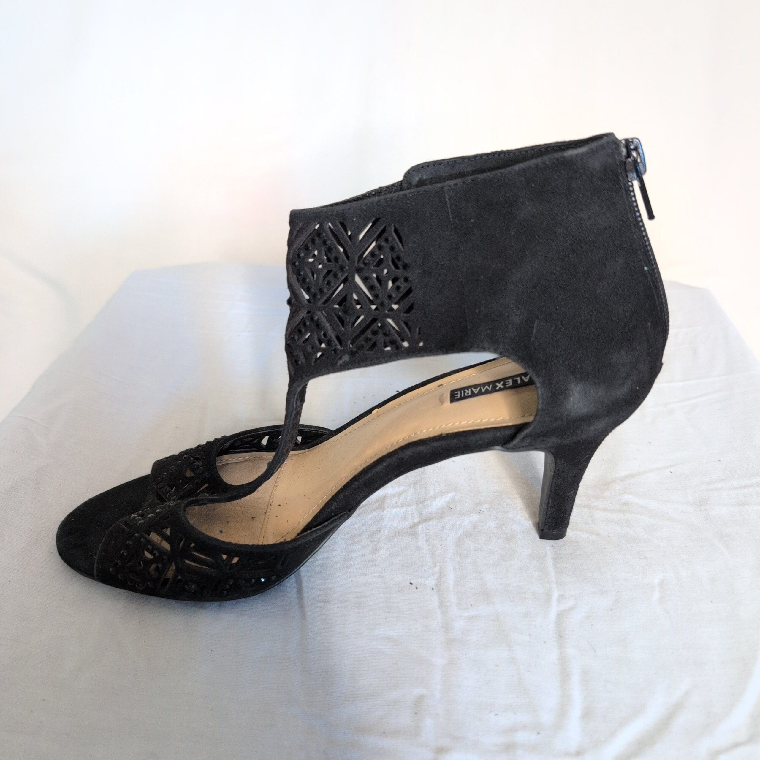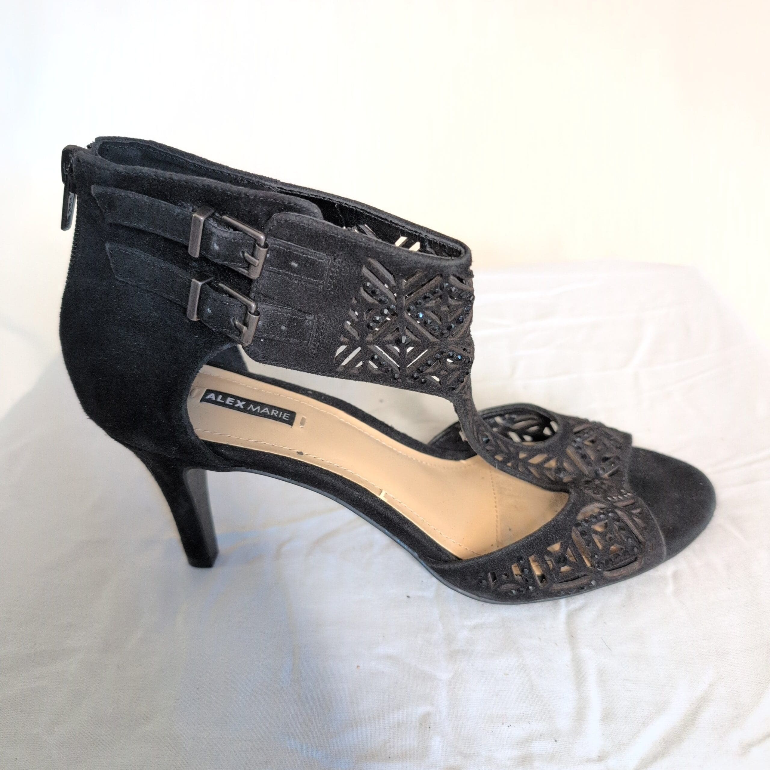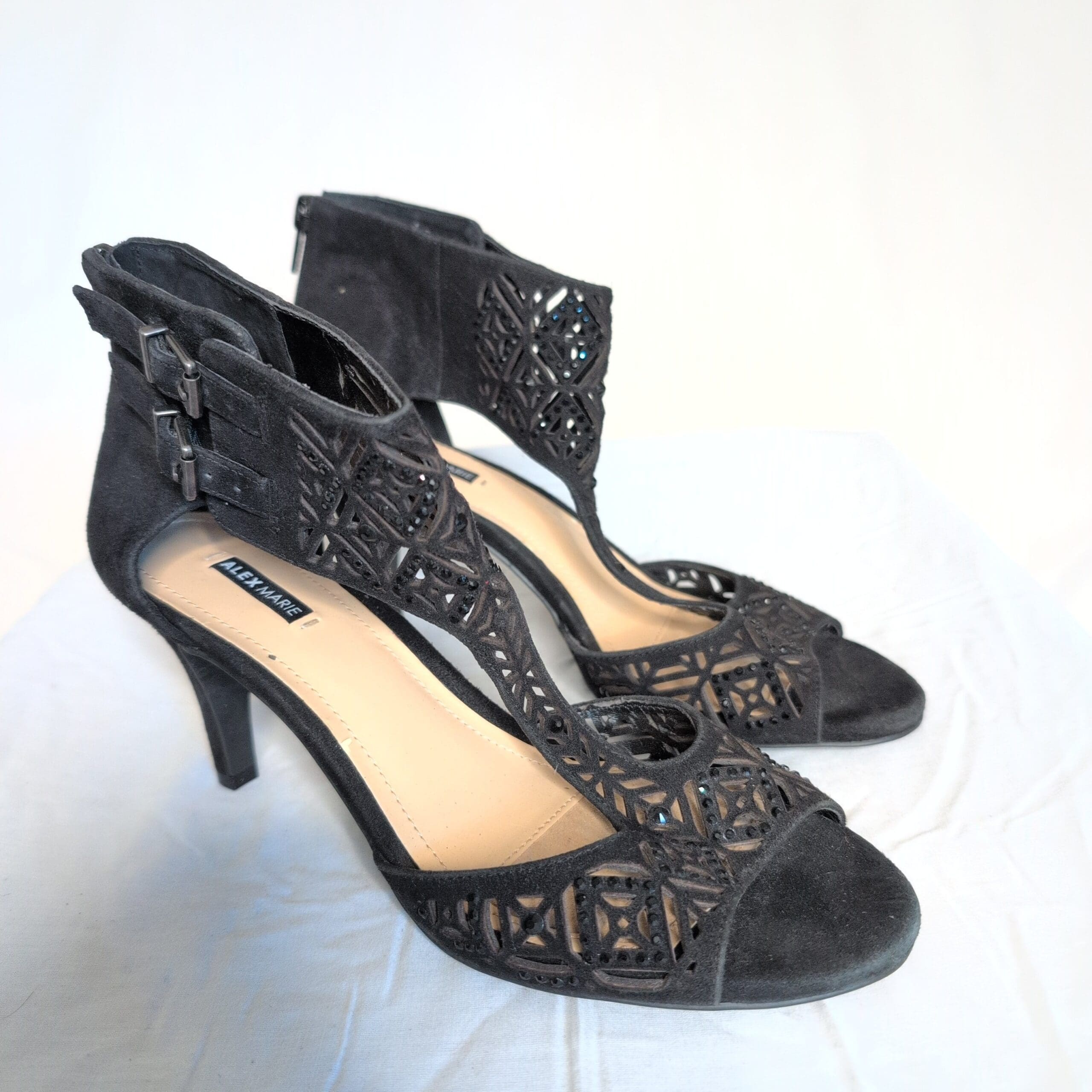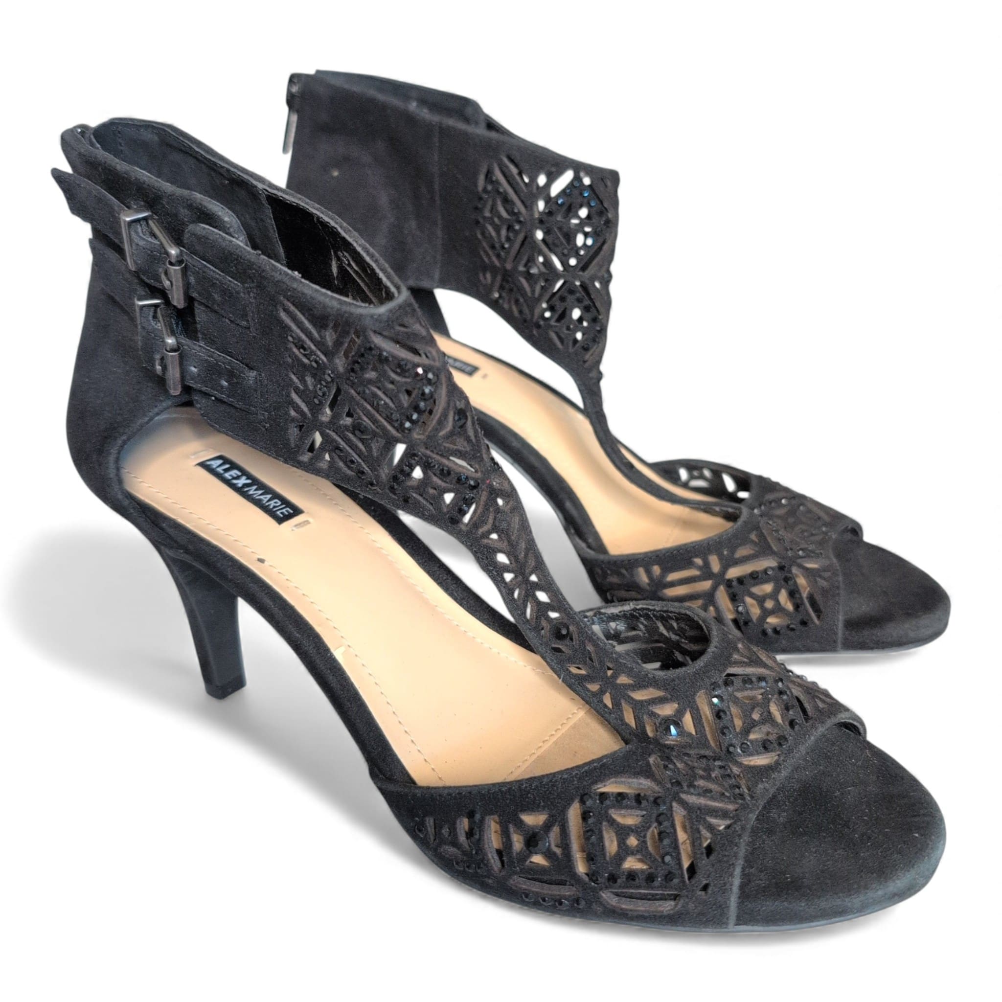 Alex Marie women’s black heels in size 7.5. Open-toe design with an intricate laser-cut geometric upper and subtle sparkle accents for a dressy, elegant look. Ankle cuff features dual buckle straps and a back zip for easy on/off. Beige insole and mid-height heel make these a versatile choice for evenings or special occasions.