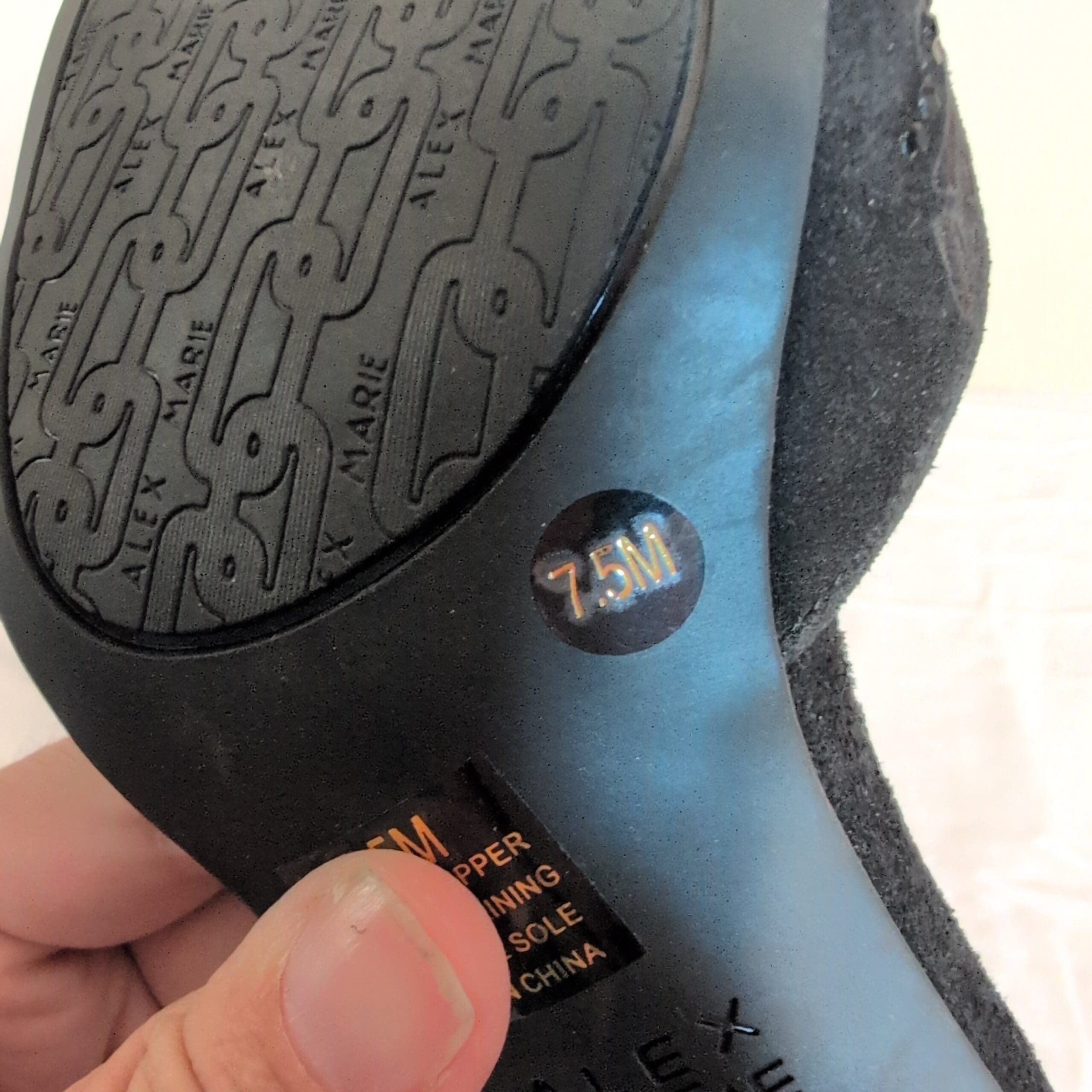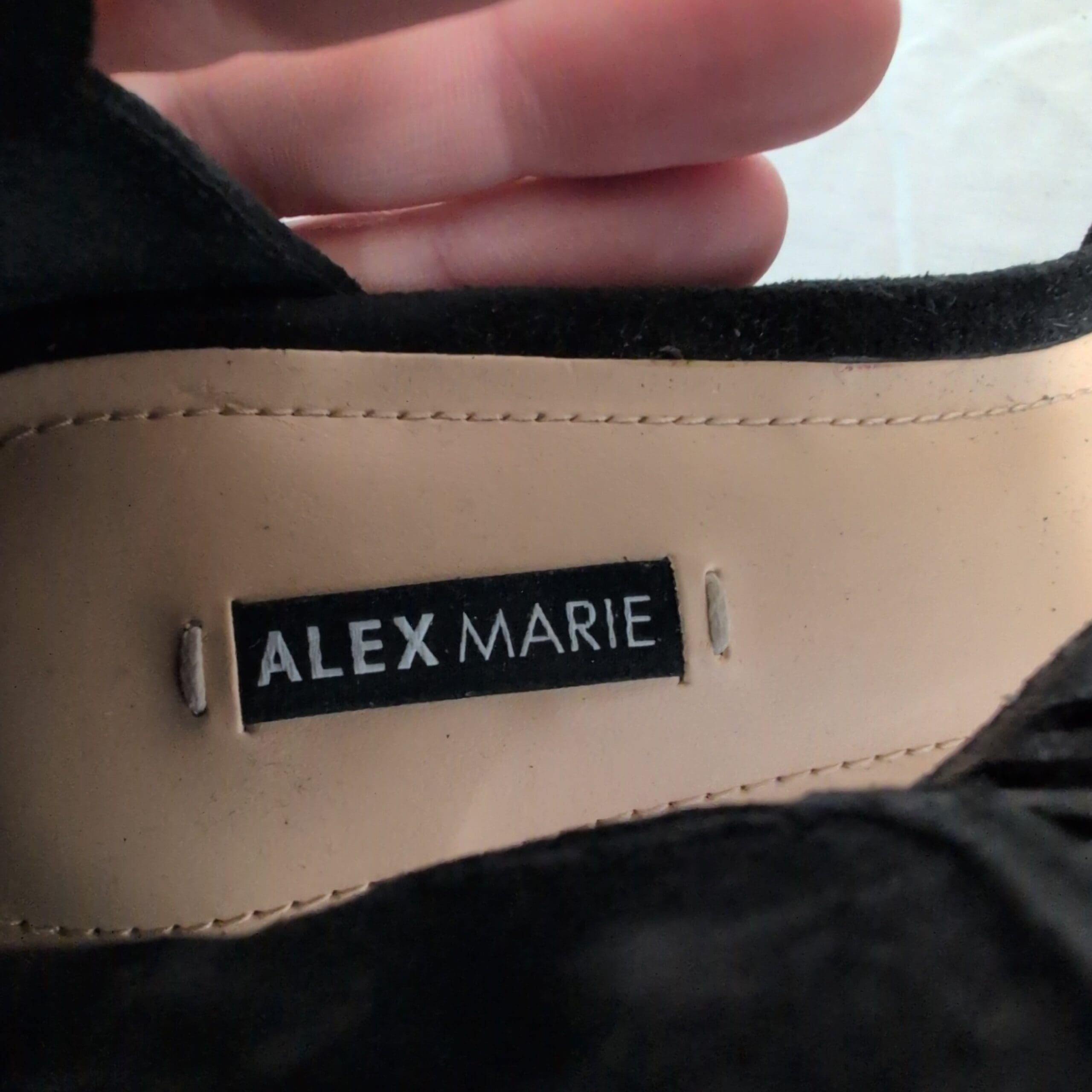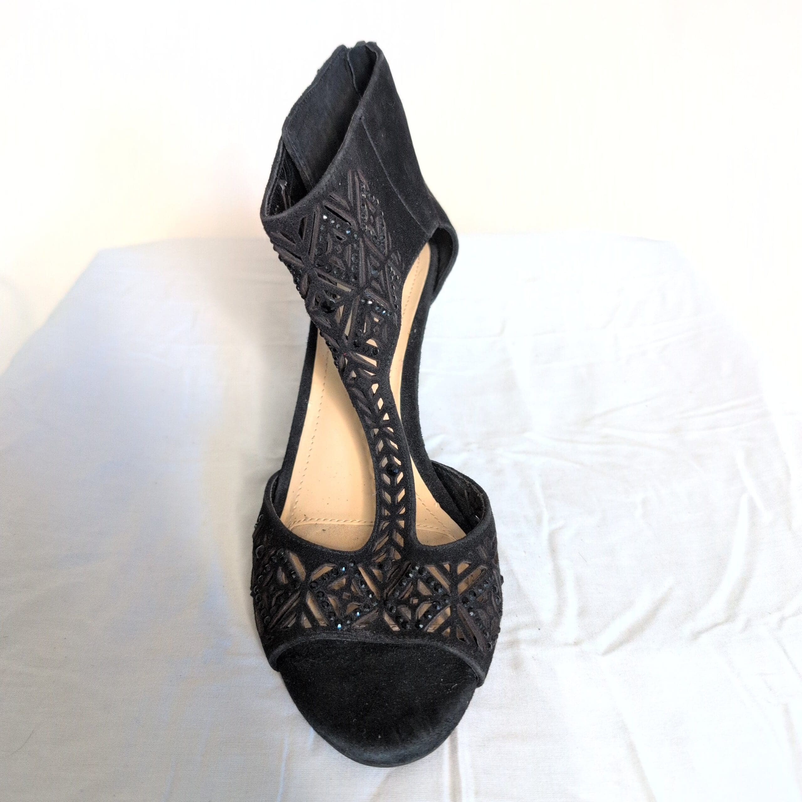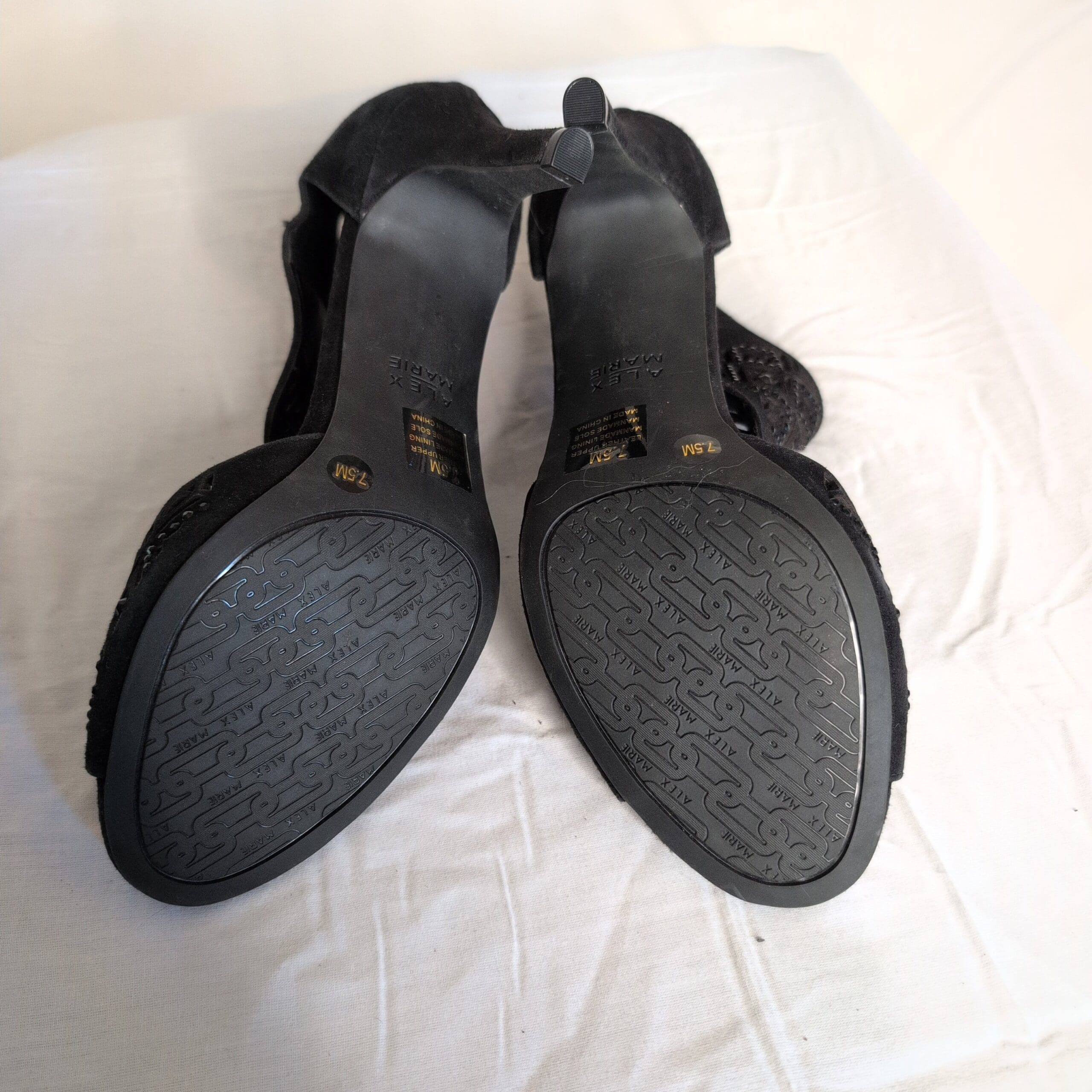 Alex Marie women’s black heels in size 7.5. Open-toe design with an intricate laser-cut geometric upper and subtle sparkle accents for a dressy, elegant look. Ankle cuff features dual buckle straps and a back zip for easy on/off. Beige insole and mid-height heel make these a versatile choice for evenings or special occasions.