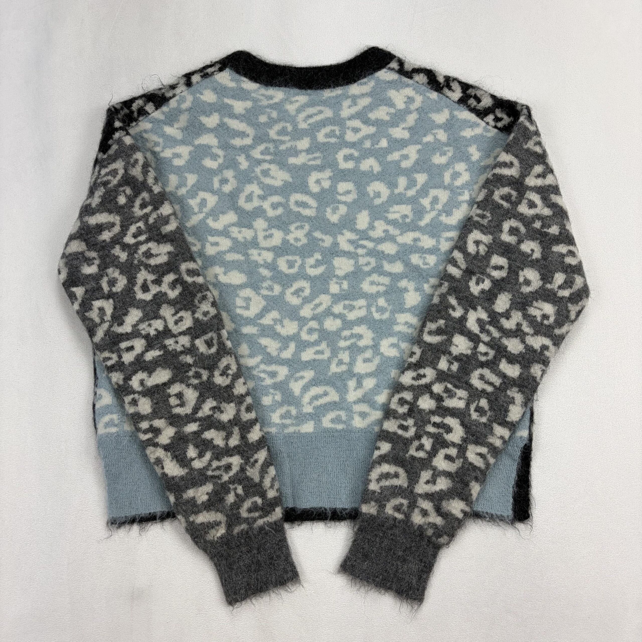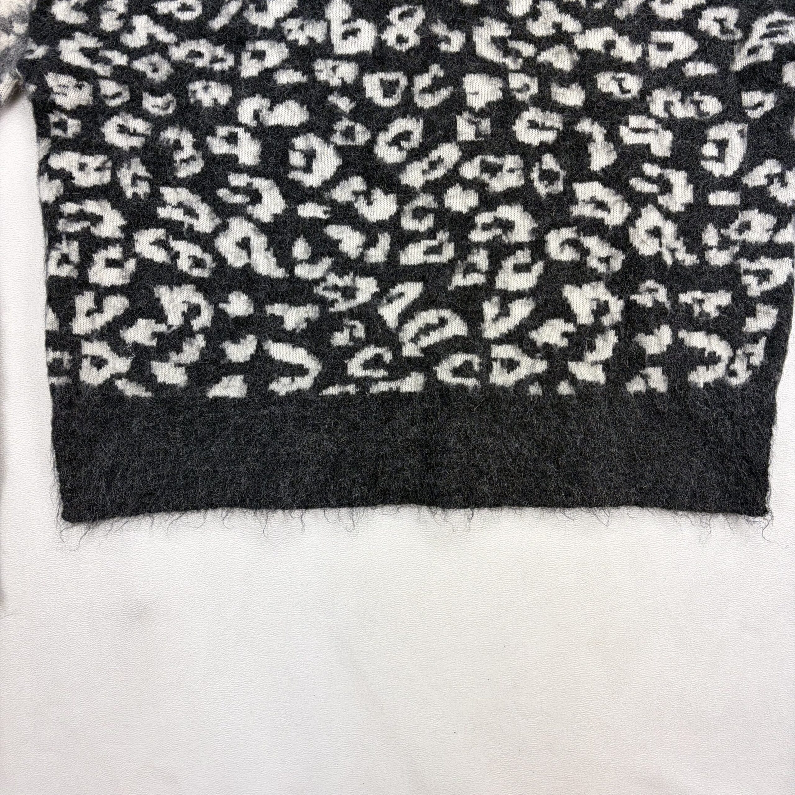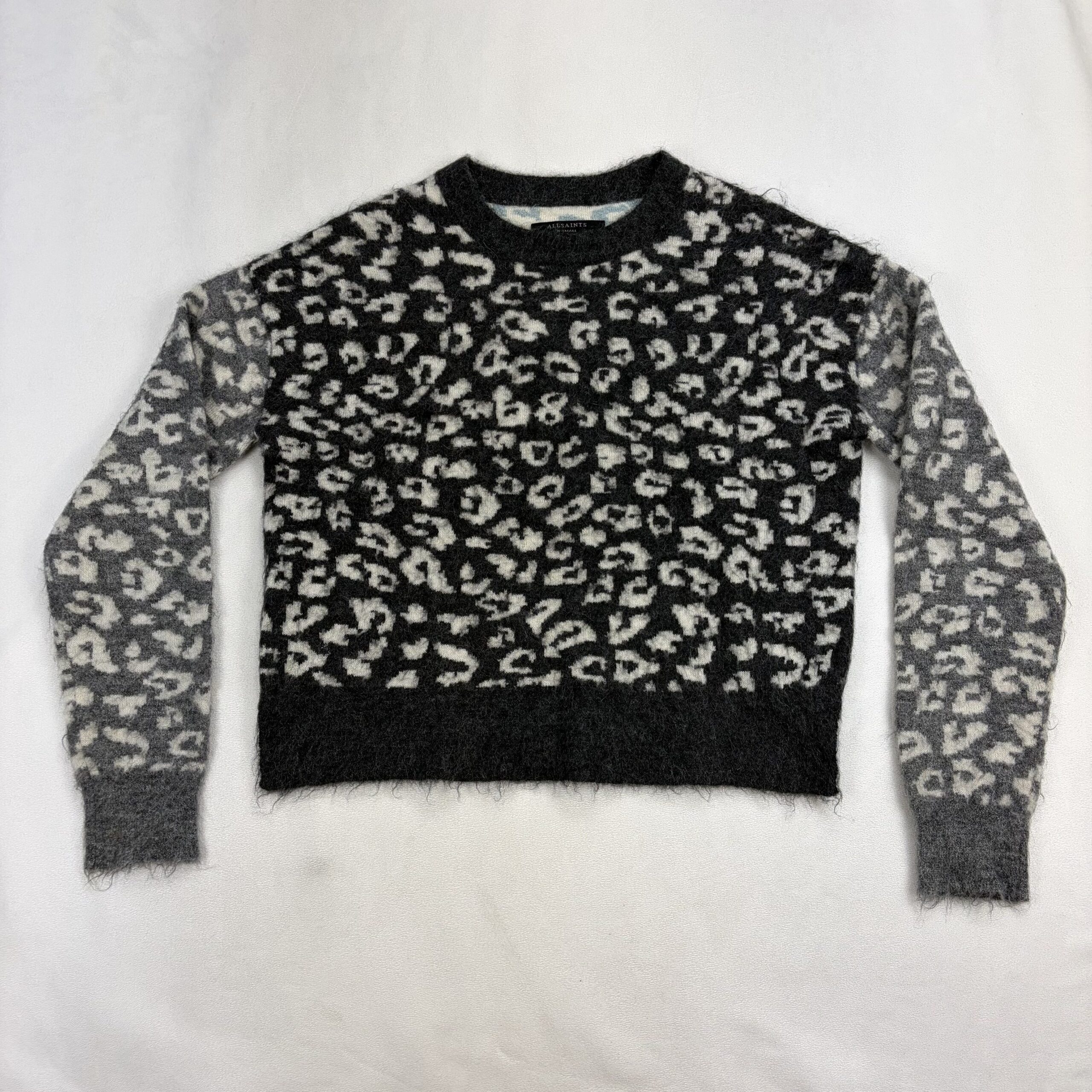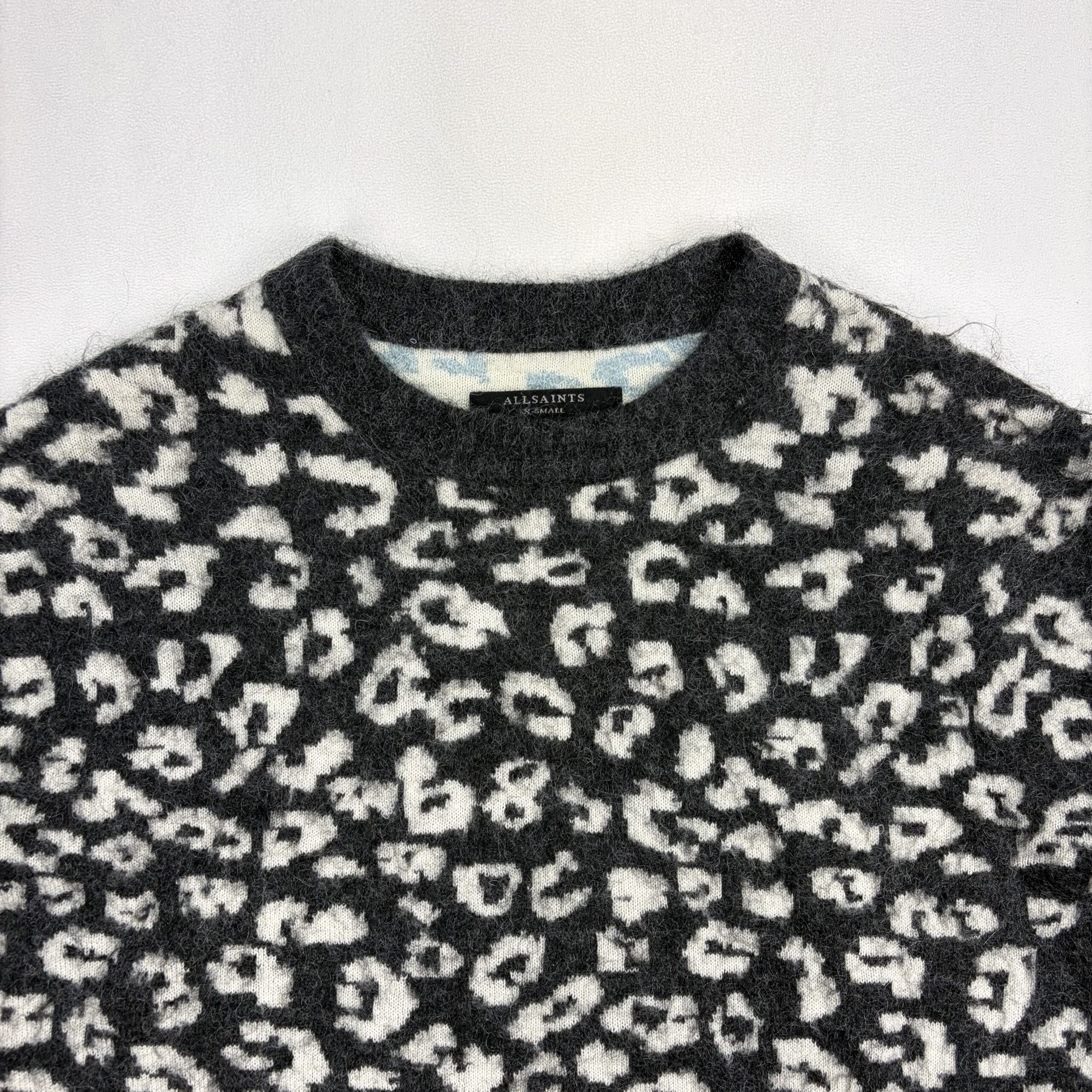 AllSaints women’s crewneck sweater in size XS featuring a soft mohair-wool blend and bold leopard pattern in black and grey. Crew neckline with long sleeves, ribbed cuffs and hem, and a slightly boxy, cozy silhouette — great for layering. Fabric: 59% wool, 27% mohair (remaining fiber content not specified).