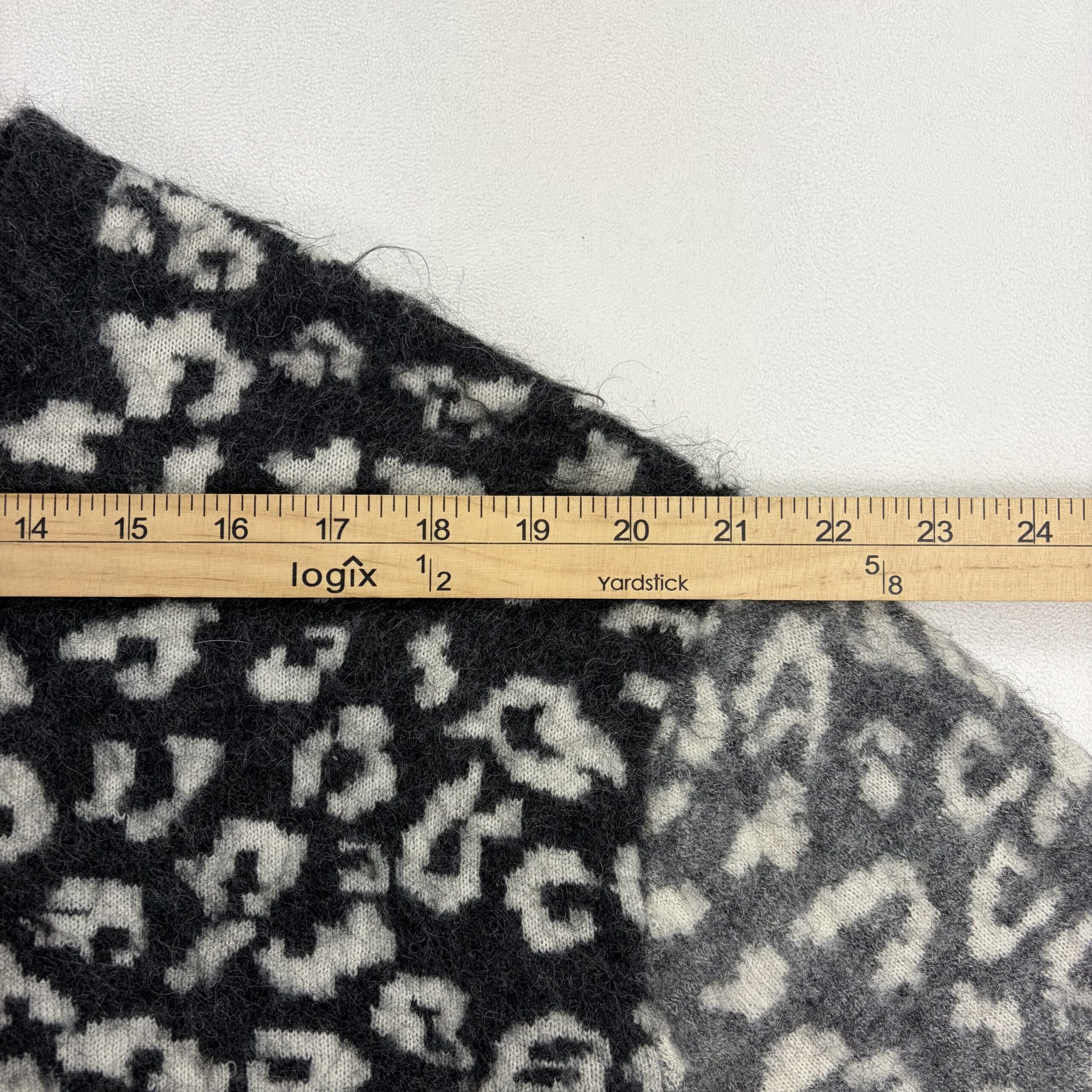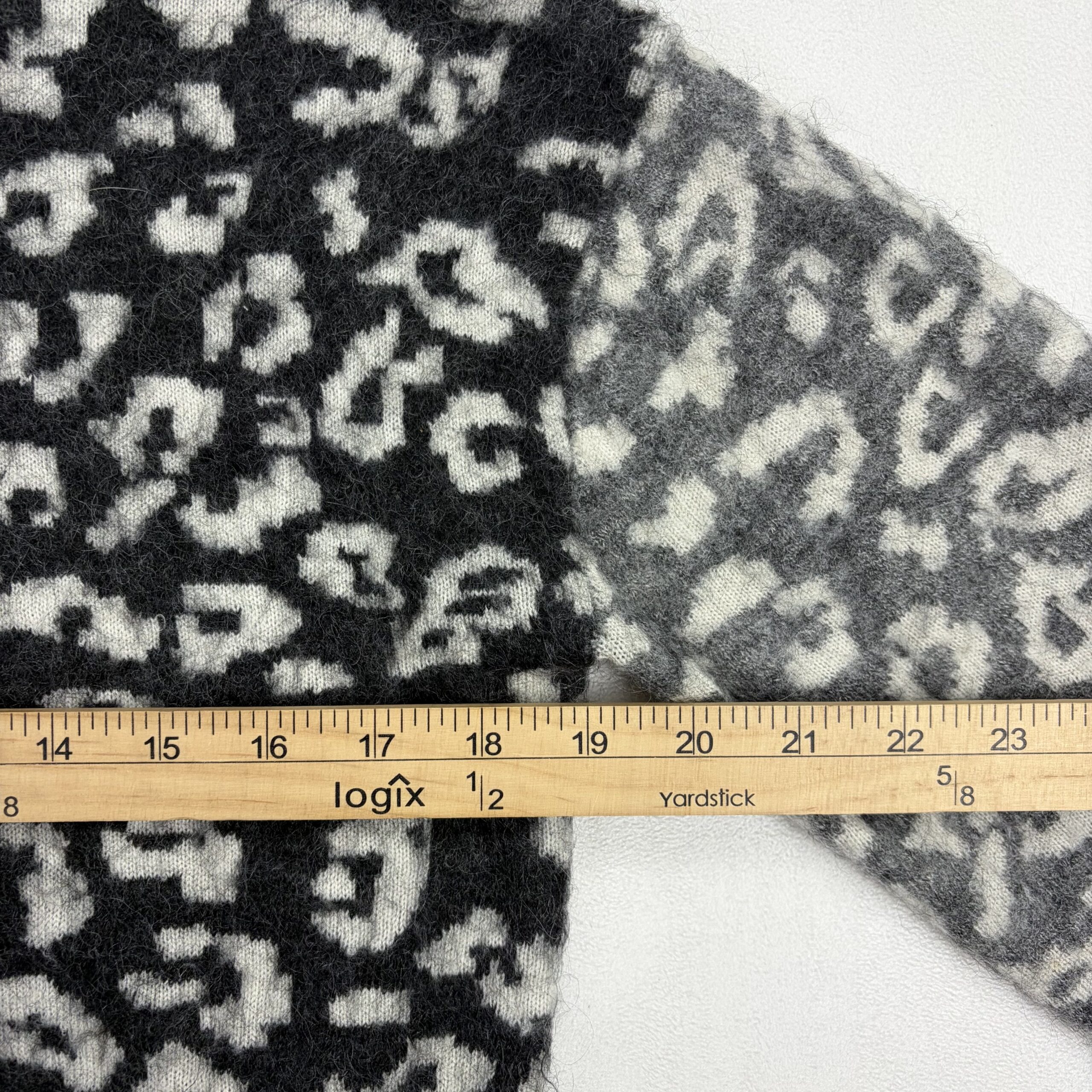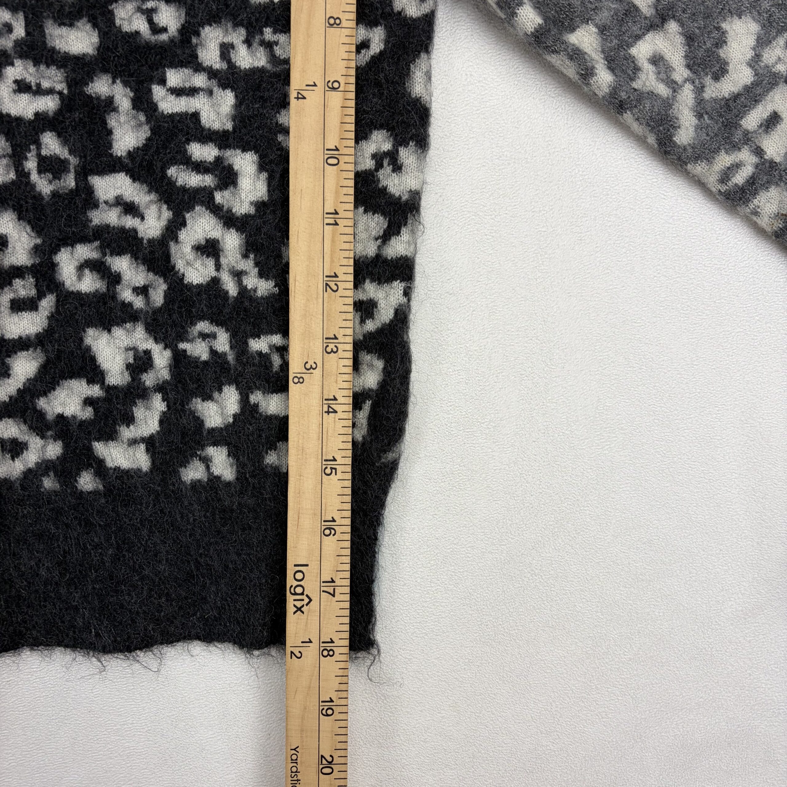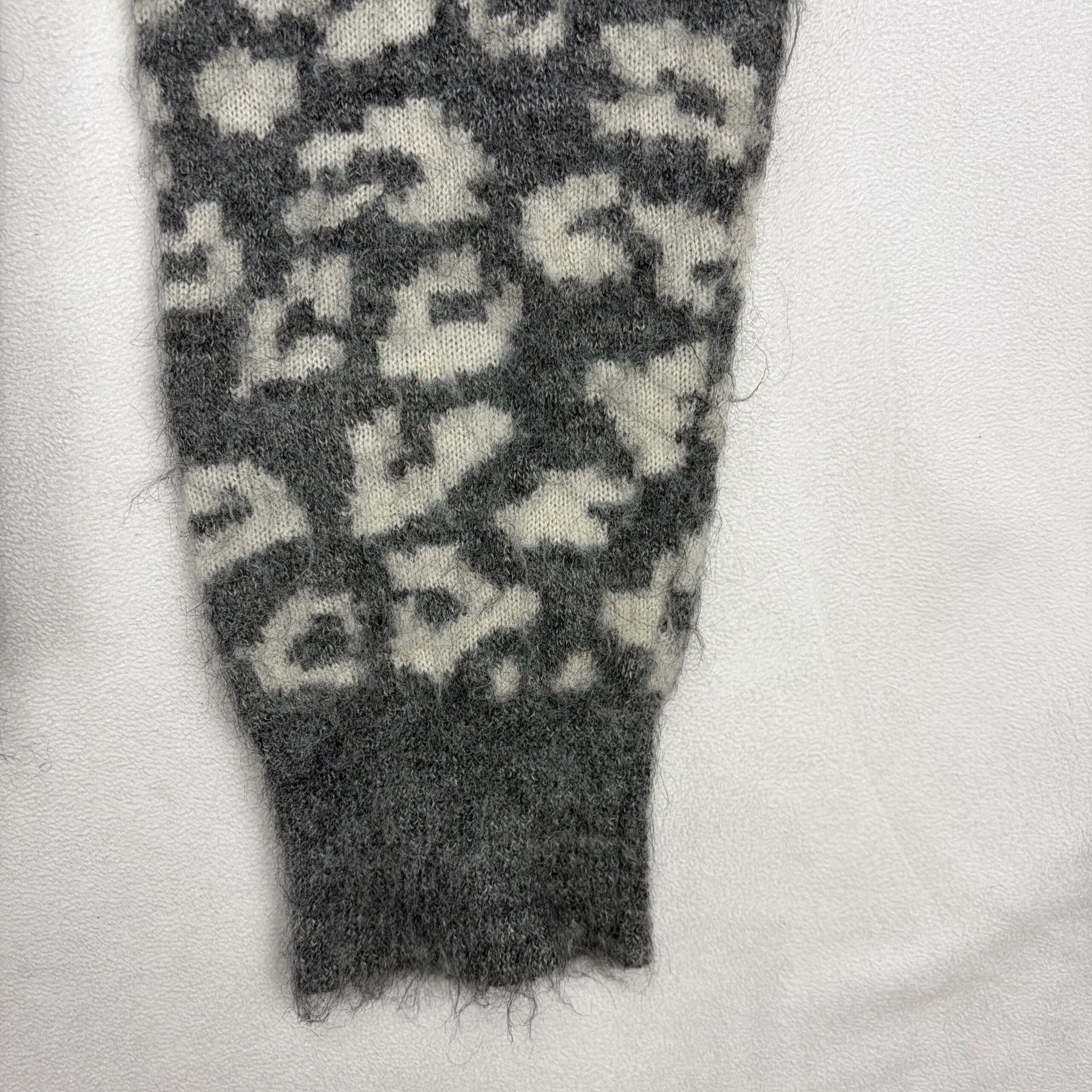AllSaints women’s crewneck sweater in size XS featuring a soft mohair-wool blend and bold leopard pattern in black and grey. Crew neckline with long sleeves, ribbed cuffs and hem, and a slightly boxy, cozy silhouette — great for layering. Fabric: 59% wool, 27% mohair (remaining fiber content not specified).