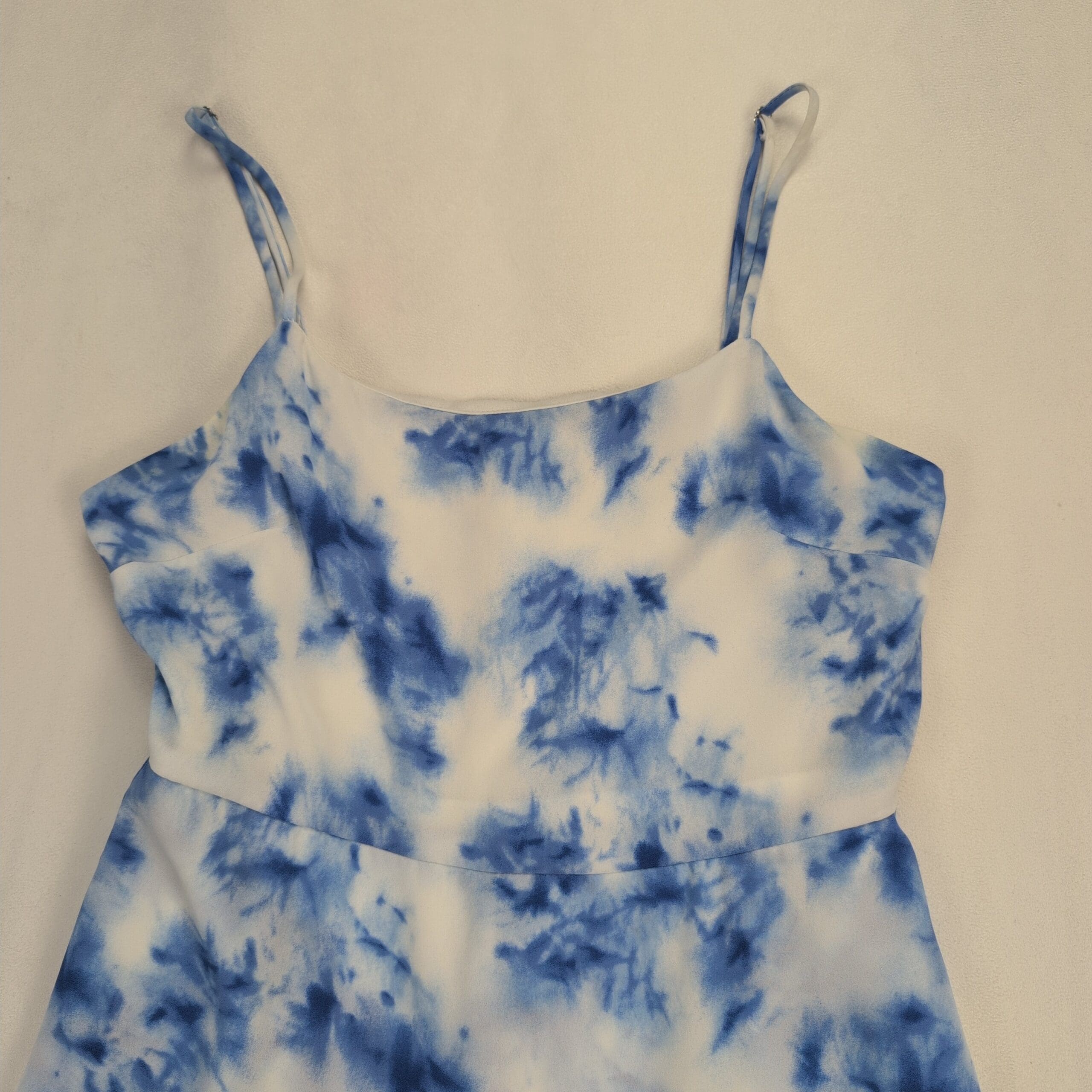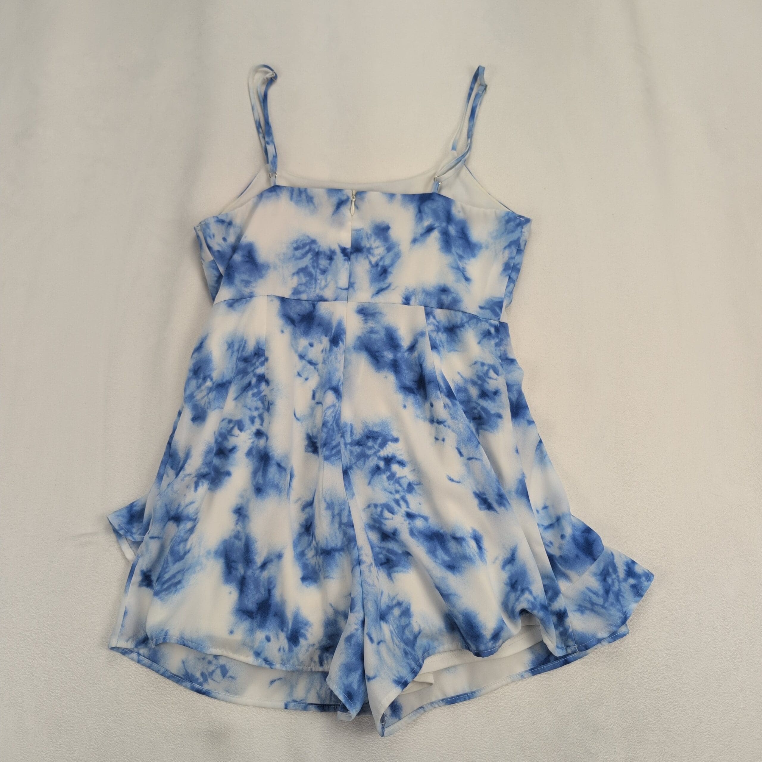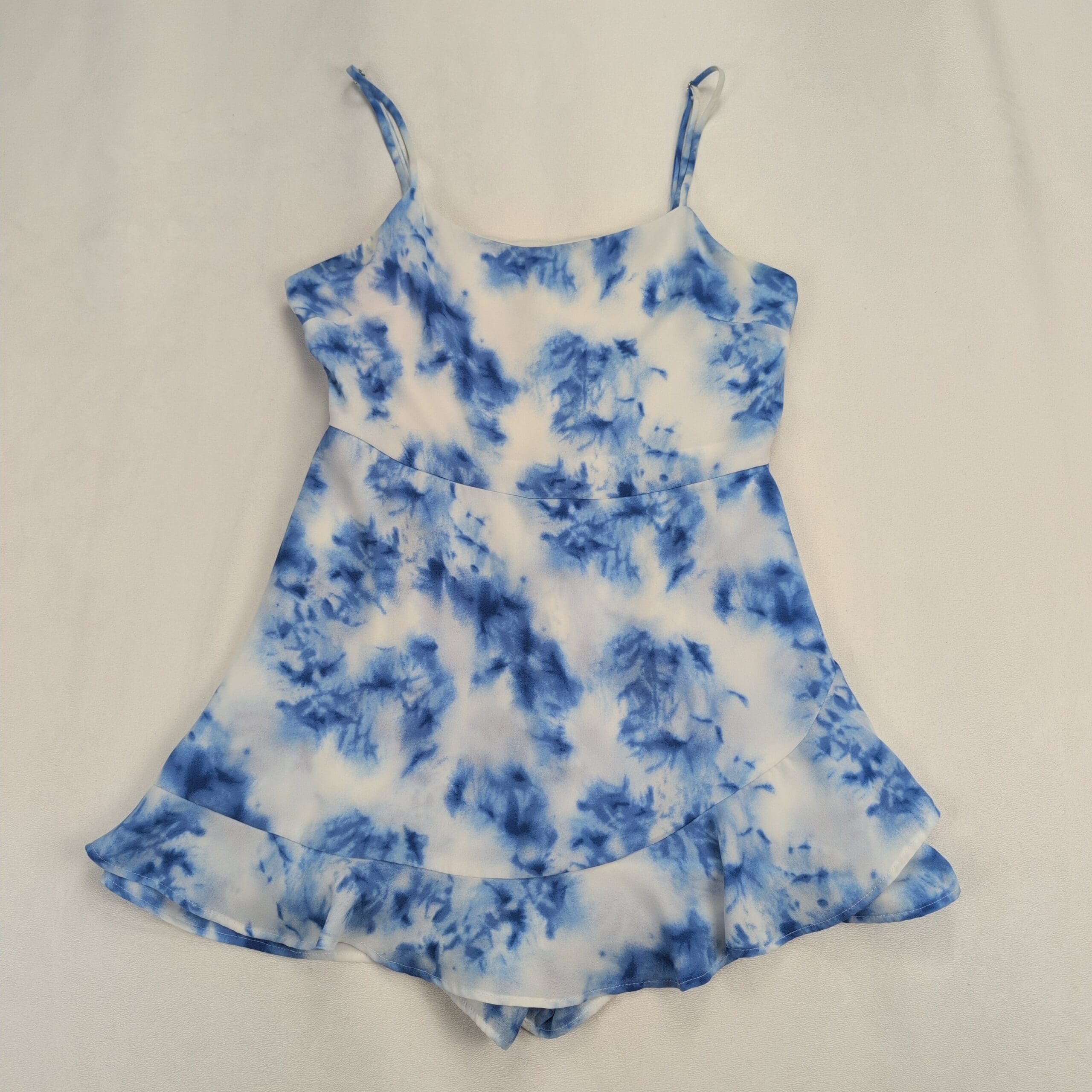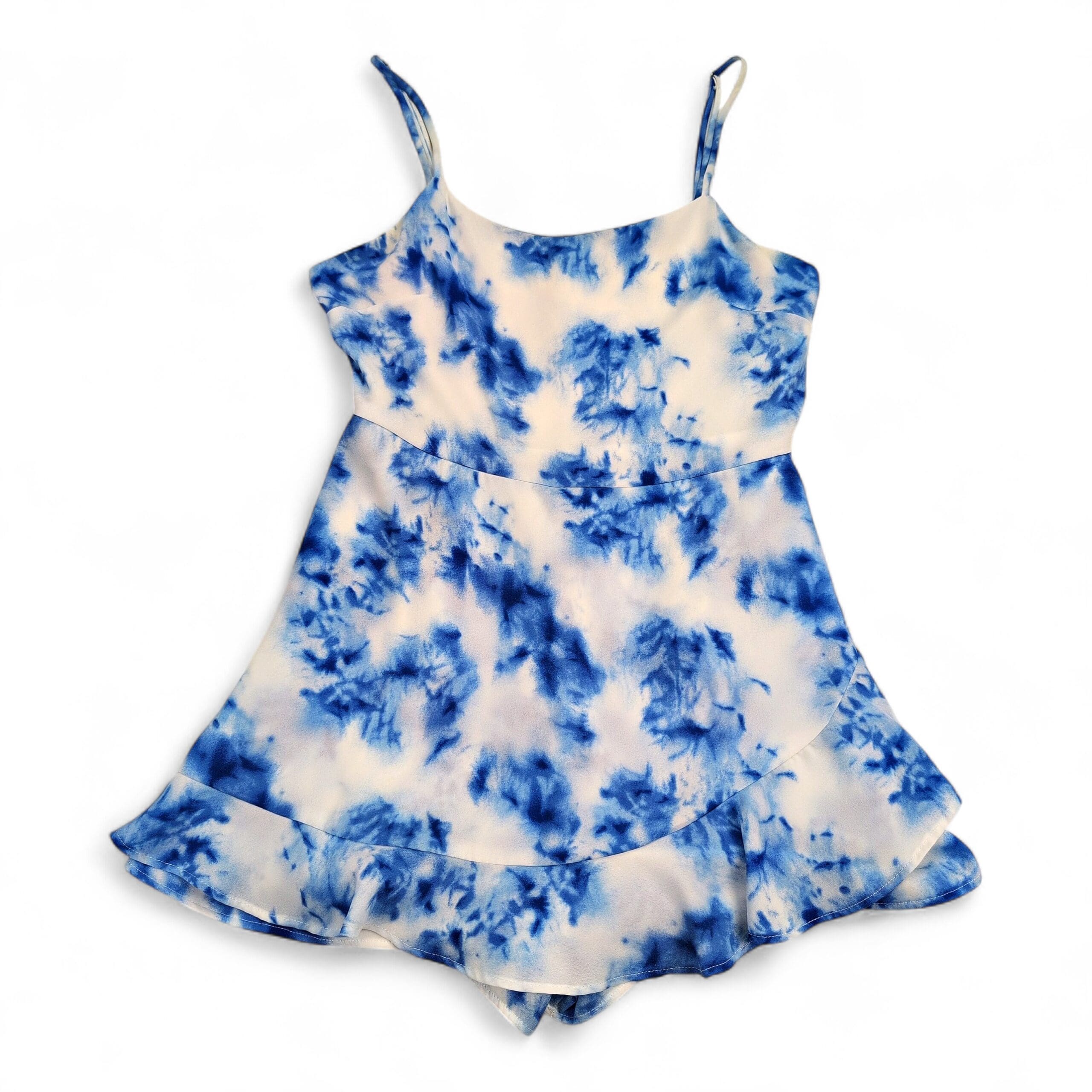 Altar’d State romper in size S featuring a blue and white tie-dye print. Spaghetti straps, fitted bodice, and a faux-wrap ruffle skirt with built-in shorts for a flirty, feminine look. Lightweight and easy to style for summer outings, beach days, or casual date nights. Excellent used condition — free of rips, stains, or major flaws; typical gentle wear may be present.