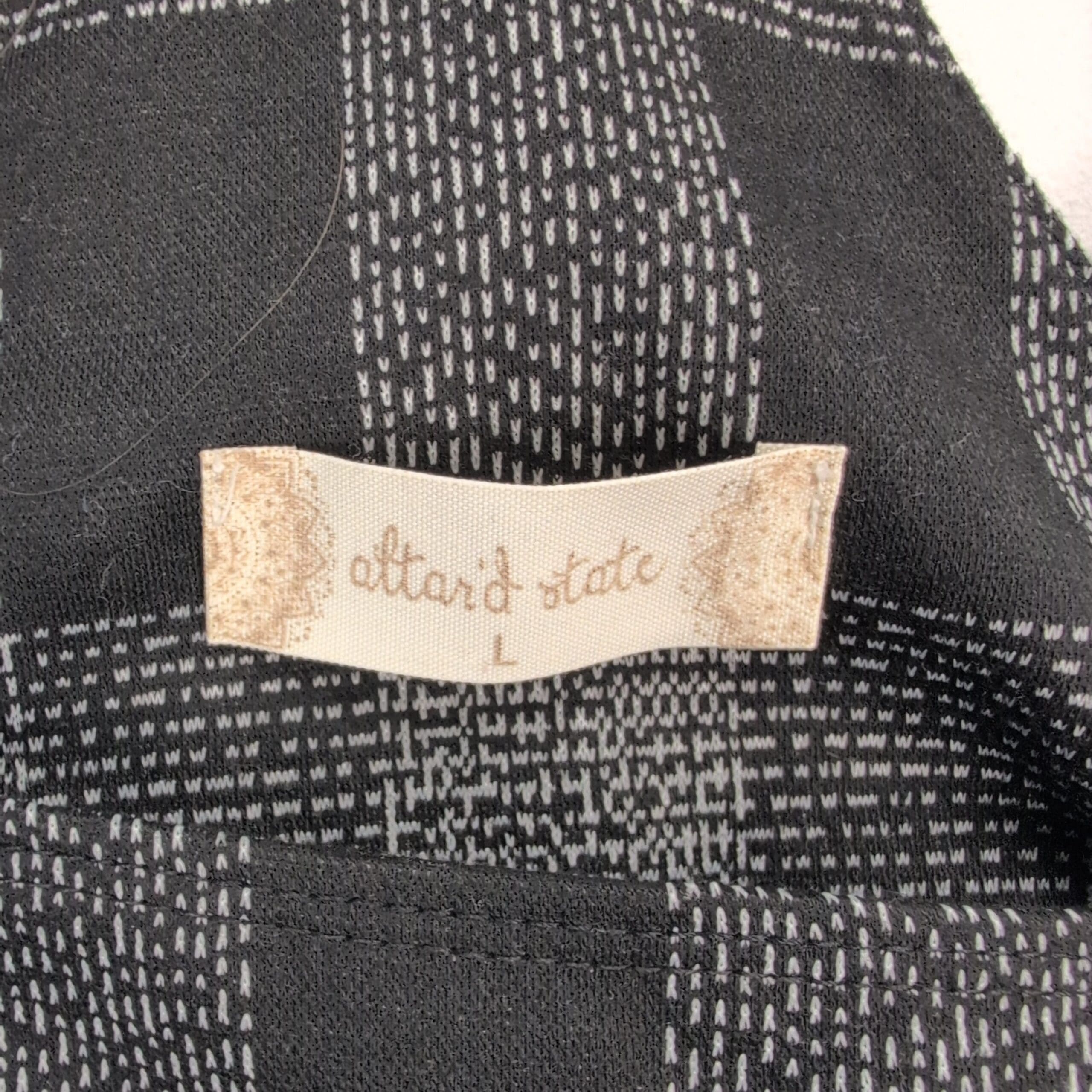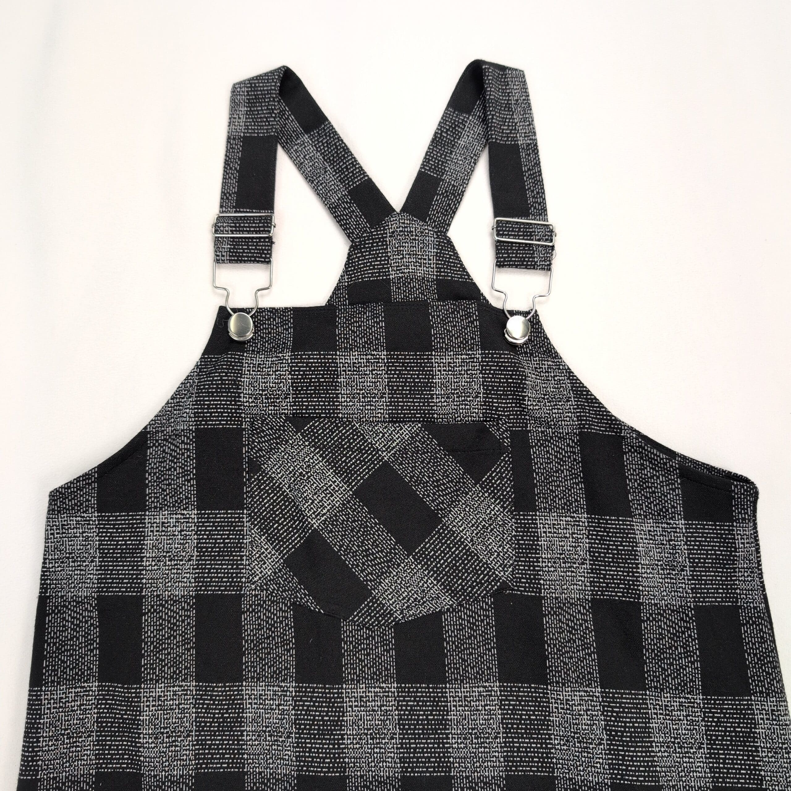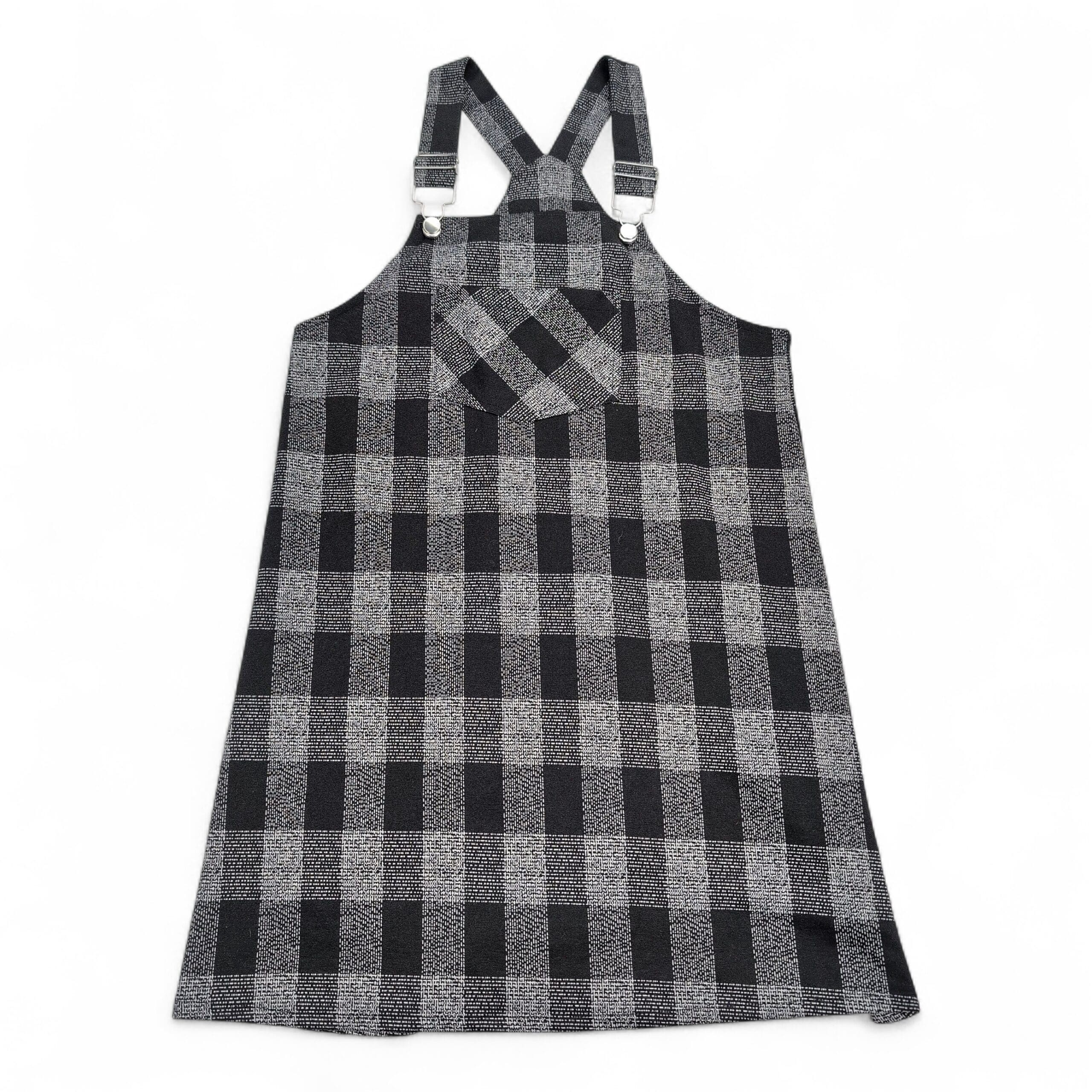 Altar’d State women’s pinafore/jumper dress in size L featuring a black and gray buffalo check pattern. Adjustable metal buckle straps, a front chest pocket with diagonal plaid detail, and a relaxed A-line silhouette make this great for layering over tees or knitwear. Textured woven fabric with a structured drape — casual, versatile, and stylish.