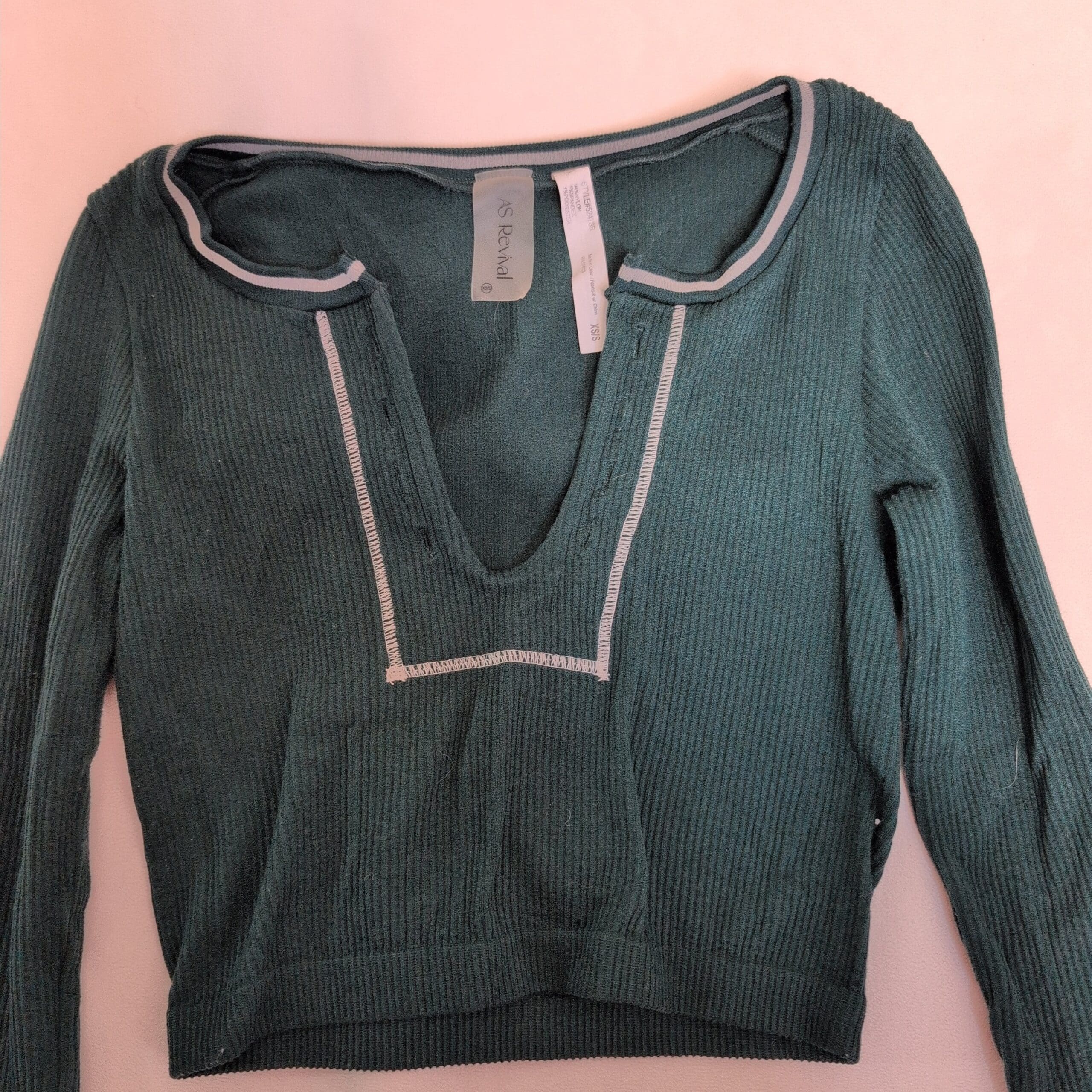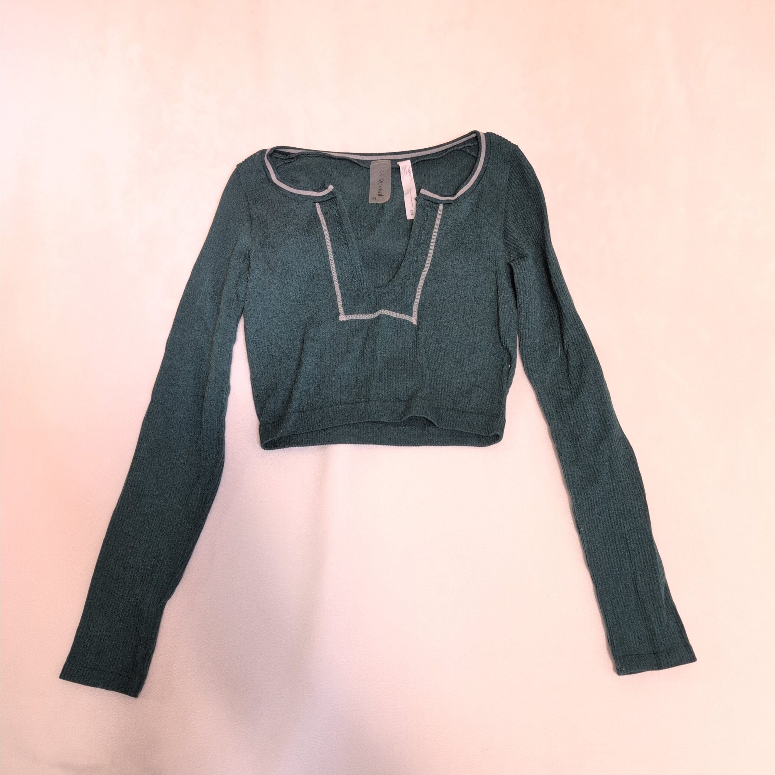 Altar’d State long-sleeve ribbed crop top in deep green. Size XS (fits S/XS). Lightweight rib-knit with a V-style neckline and front lace-up detail for a relaxed, boho-inspired look. Good used condition — free of major rips, tears, stains, or flaws. May be missing the lace/string to fully lace up the front. Typical wear may be present.