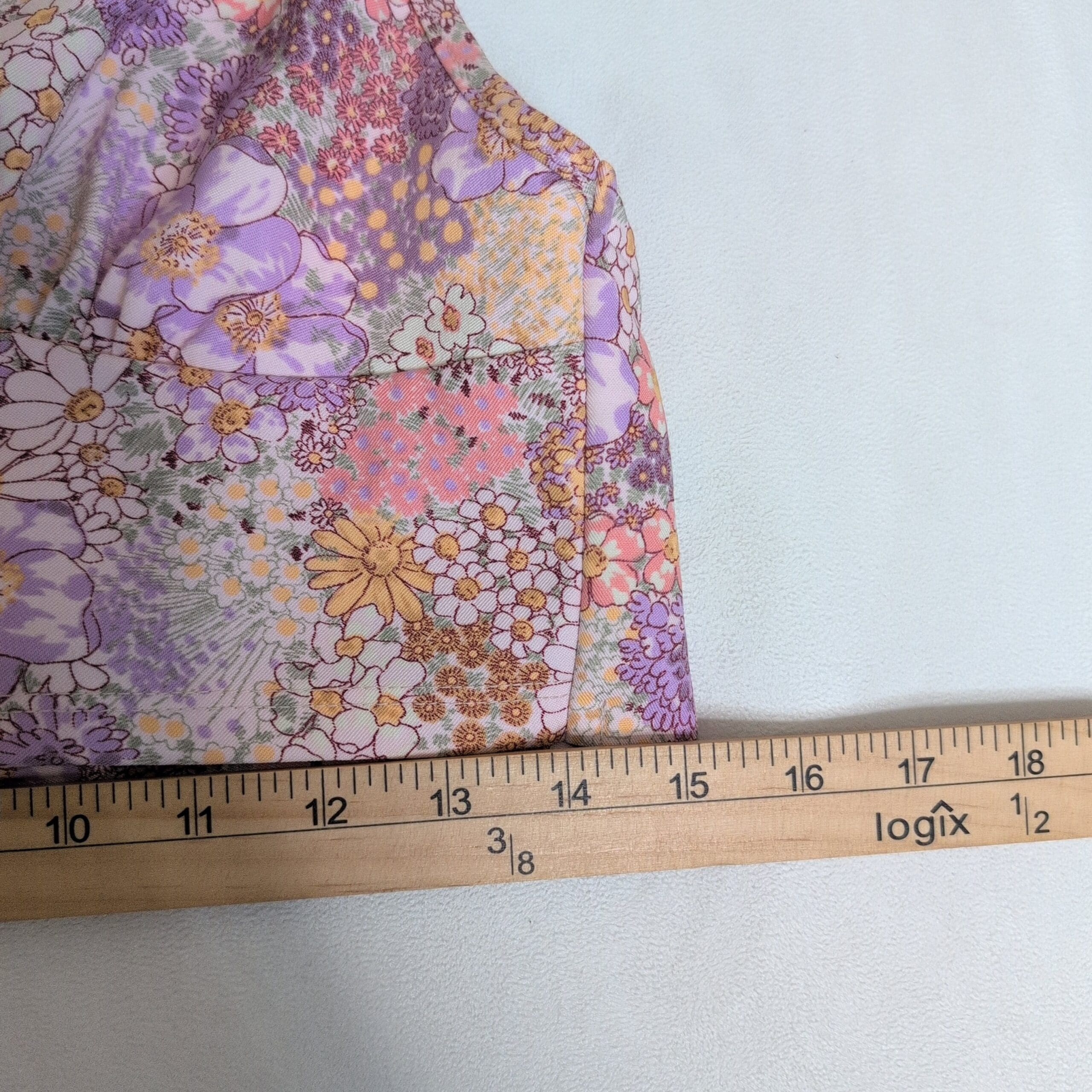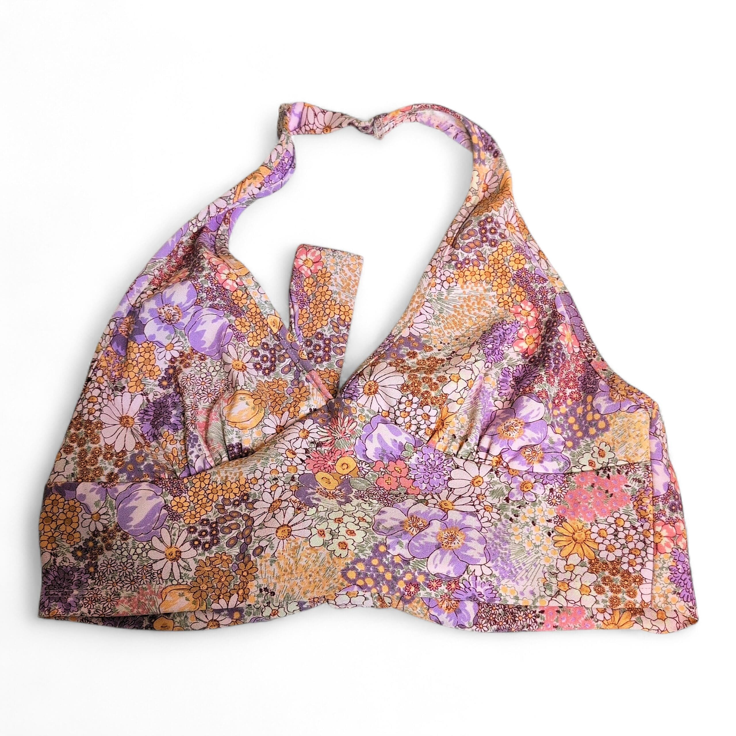 Altar’d State floral halter crop bra top in size M. Features a flattering V-neckline, supportive underband and an all-over ditsy floral print in soft pink, lavender and peach tones. Lightweight and great for layering or warm-weather wear. Gently used and in good condition with no major rips, stains, or tears; there are a few small loose threads at the hem as pictured.