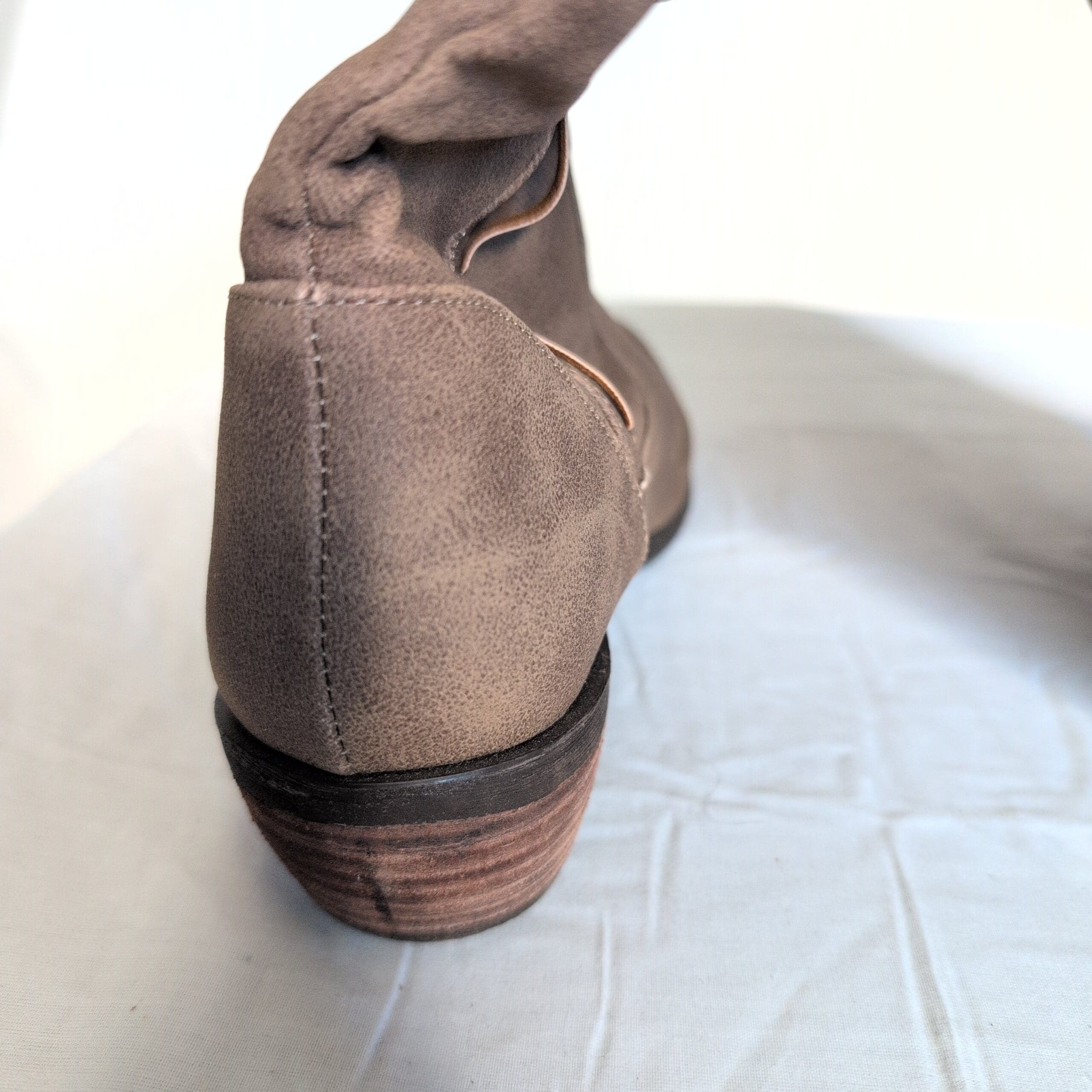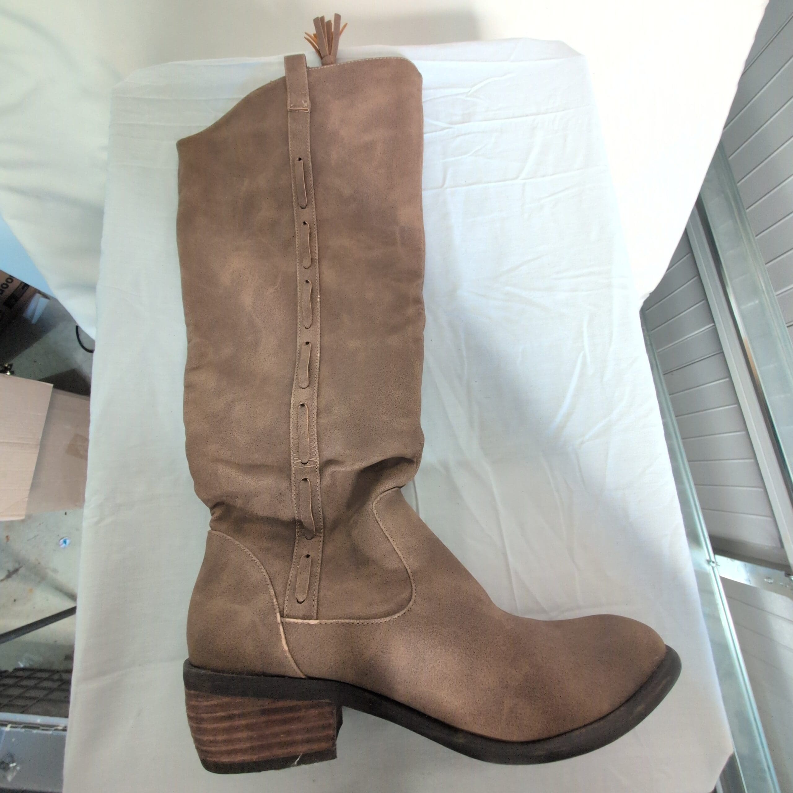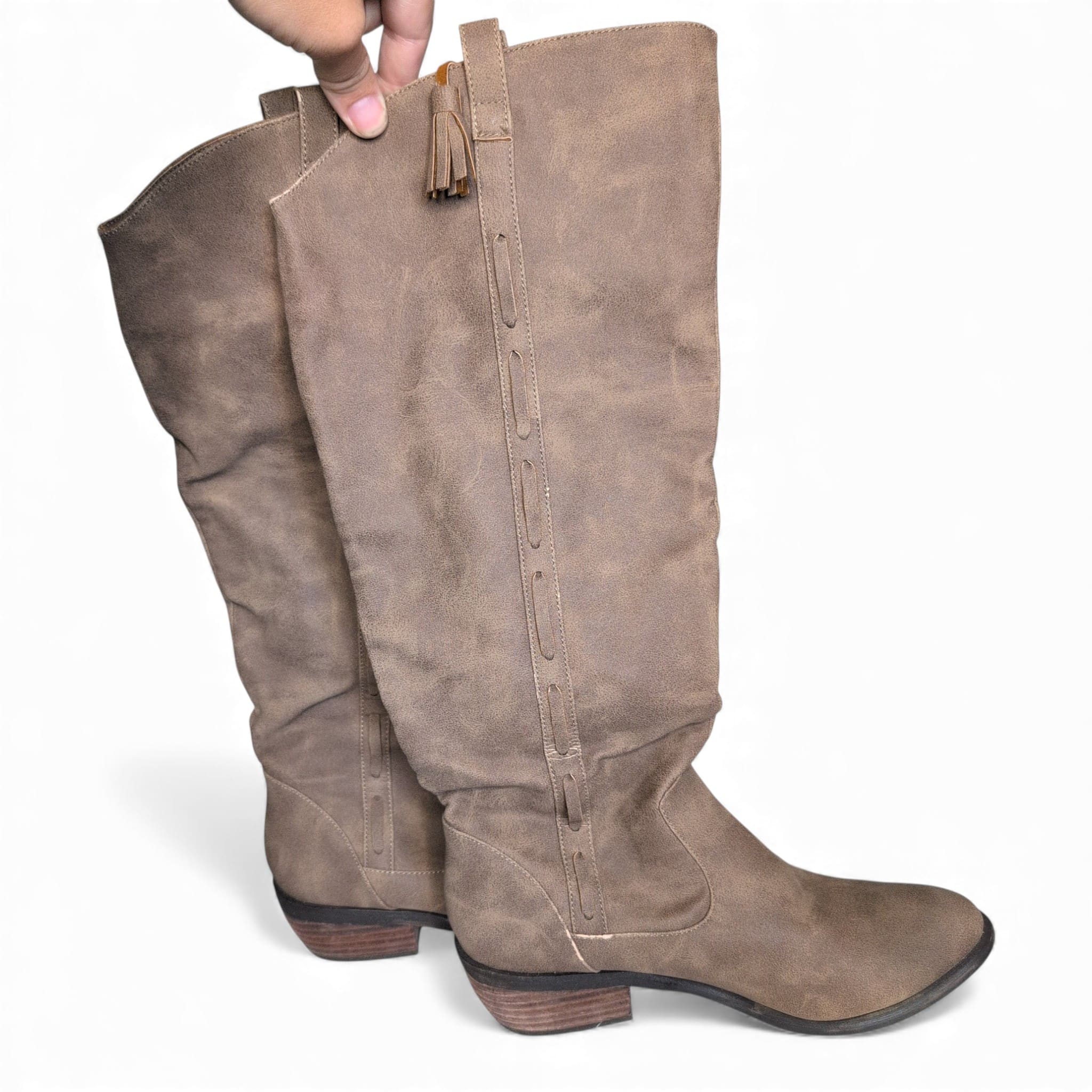 Altar’d State tan knee-high heeled boots in women’s size 8. Faux-suede look with a pull-on design, decorative tassel detail, and convenient top tabs for easy on/off. Low stacked heel offers comfortable, everyday wear and a classic western-inspired silhouette that pairs well with dresses, skirts, or skinny jeans. Gently used — well cared for with light, consistent wear and no major damage visible. Ready to wear and a versatile addition to your seasonal wardrobe.