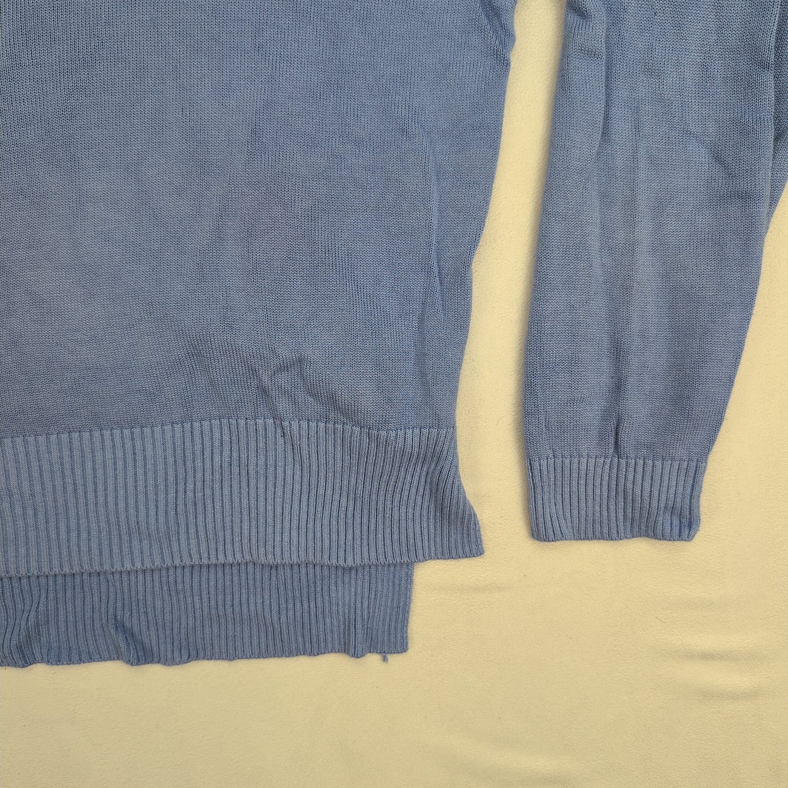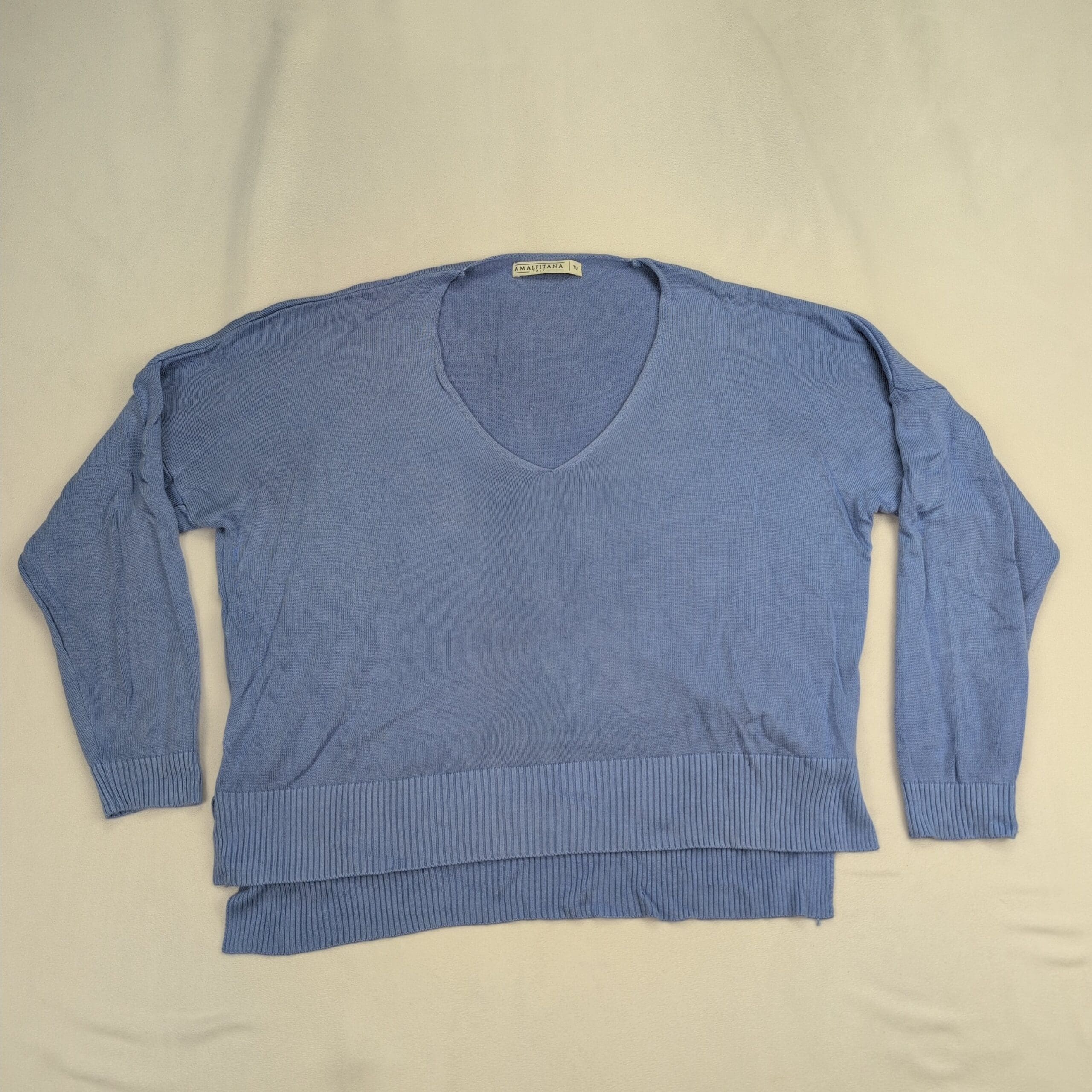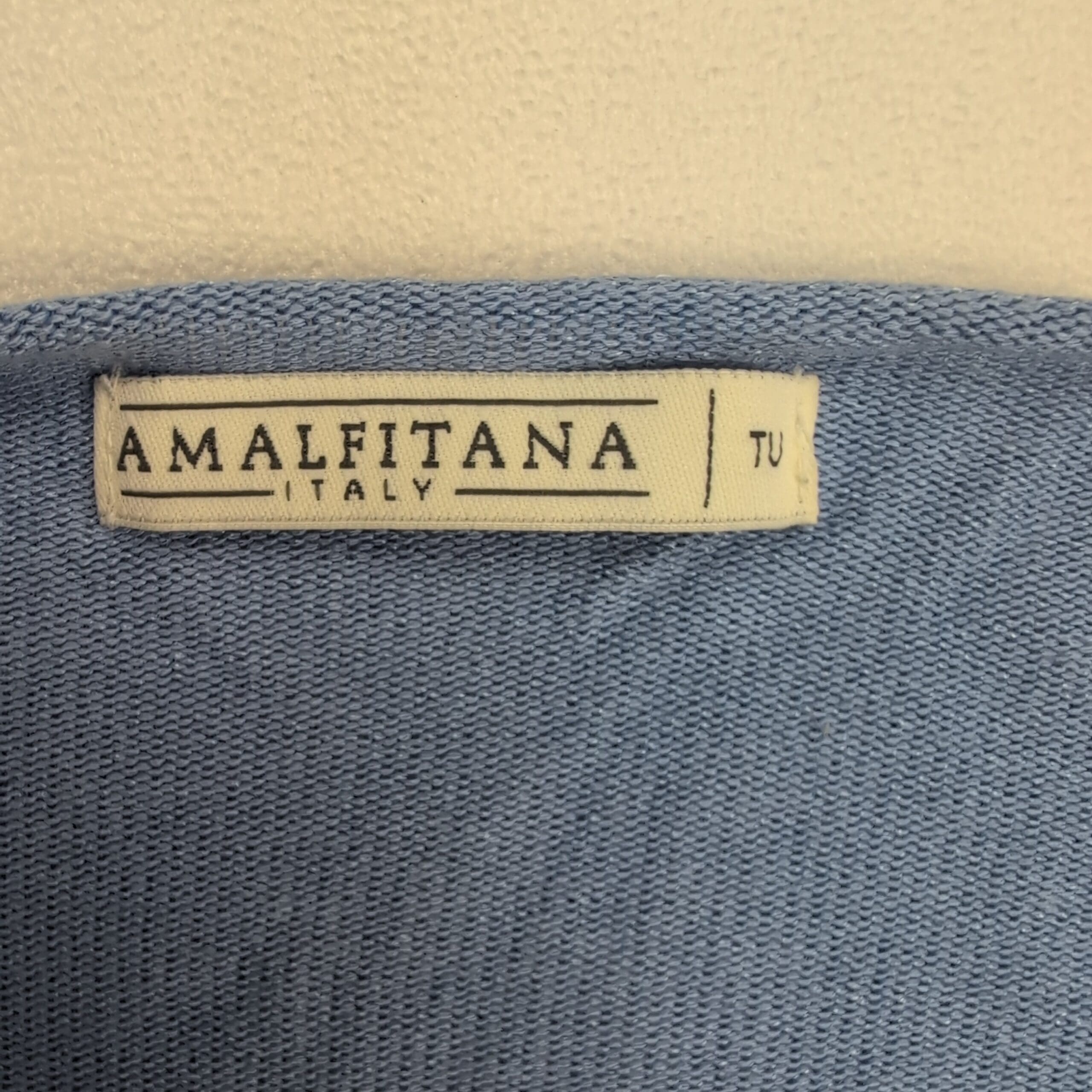 Amalfitana women’s lightweight V-neck sweater in a soft light blue. One size (Taglia Unica) with a relaxed, boxy silhouette, long sleeves and a double-layer ribbed hem for subtle detail. Fine-gauge knit that layers easily for transitional weather. Excellent used condition with typical light wear; free of major rips, stains, or flaws.
