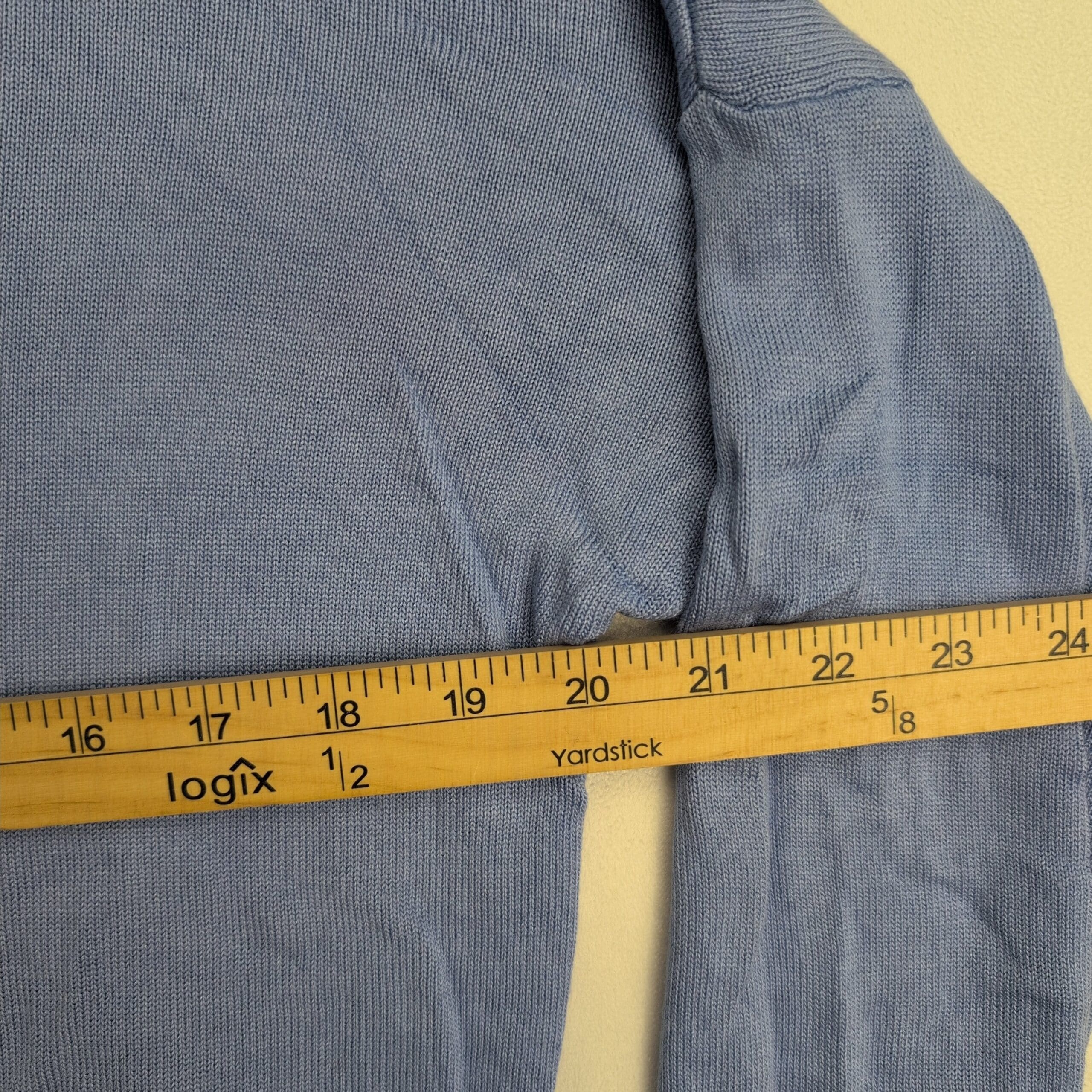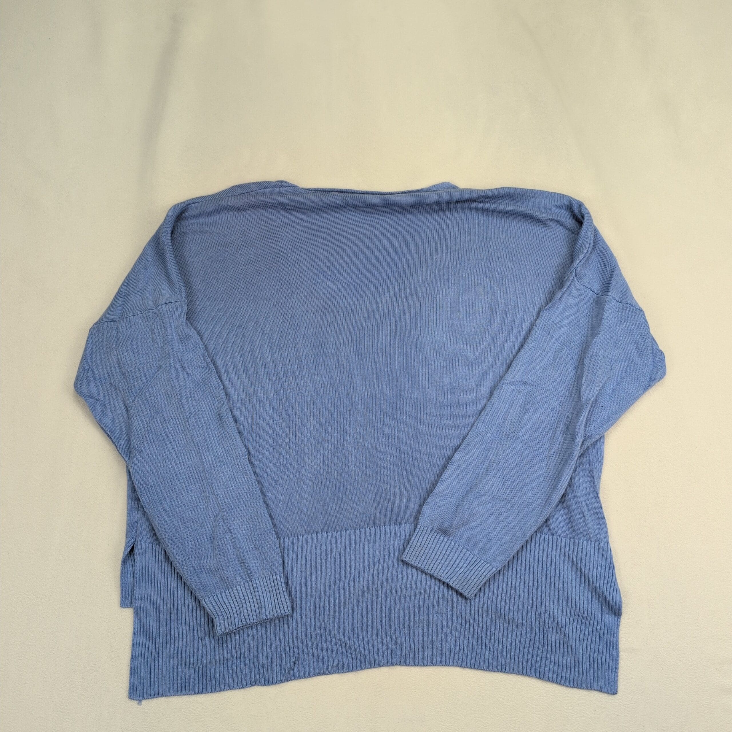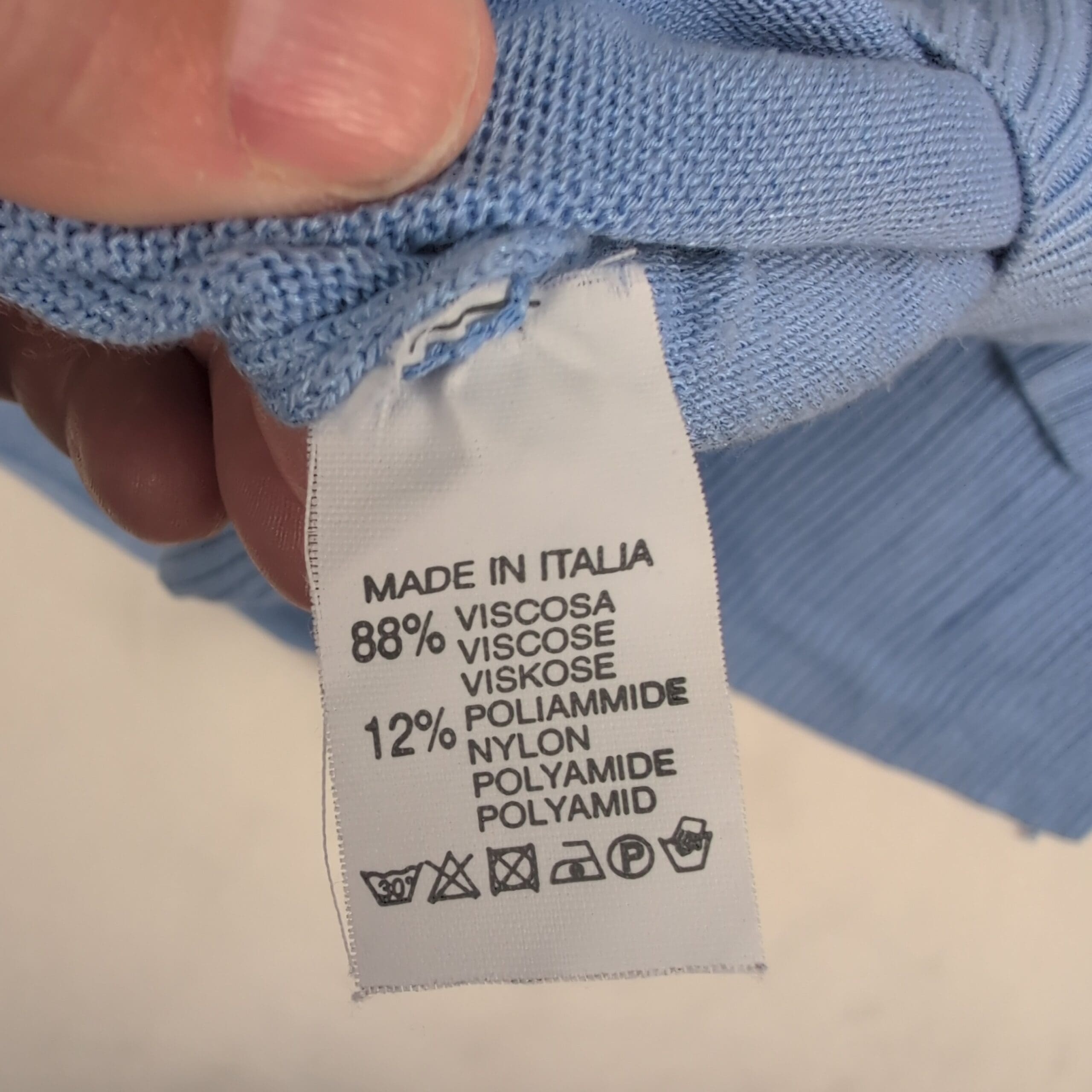 Amalfitana women’s lightweight V-neck sweater in a soft light blue. One size (Taglia Unica) with a relaxed, boxy silhouette, long sleeves and a double-layer ribbed hem for subtle detail. Fine-gauge knit that layers easily for transitional weather. Excellent used condition with typical light wear; free of major rips, stains, or flaws.
