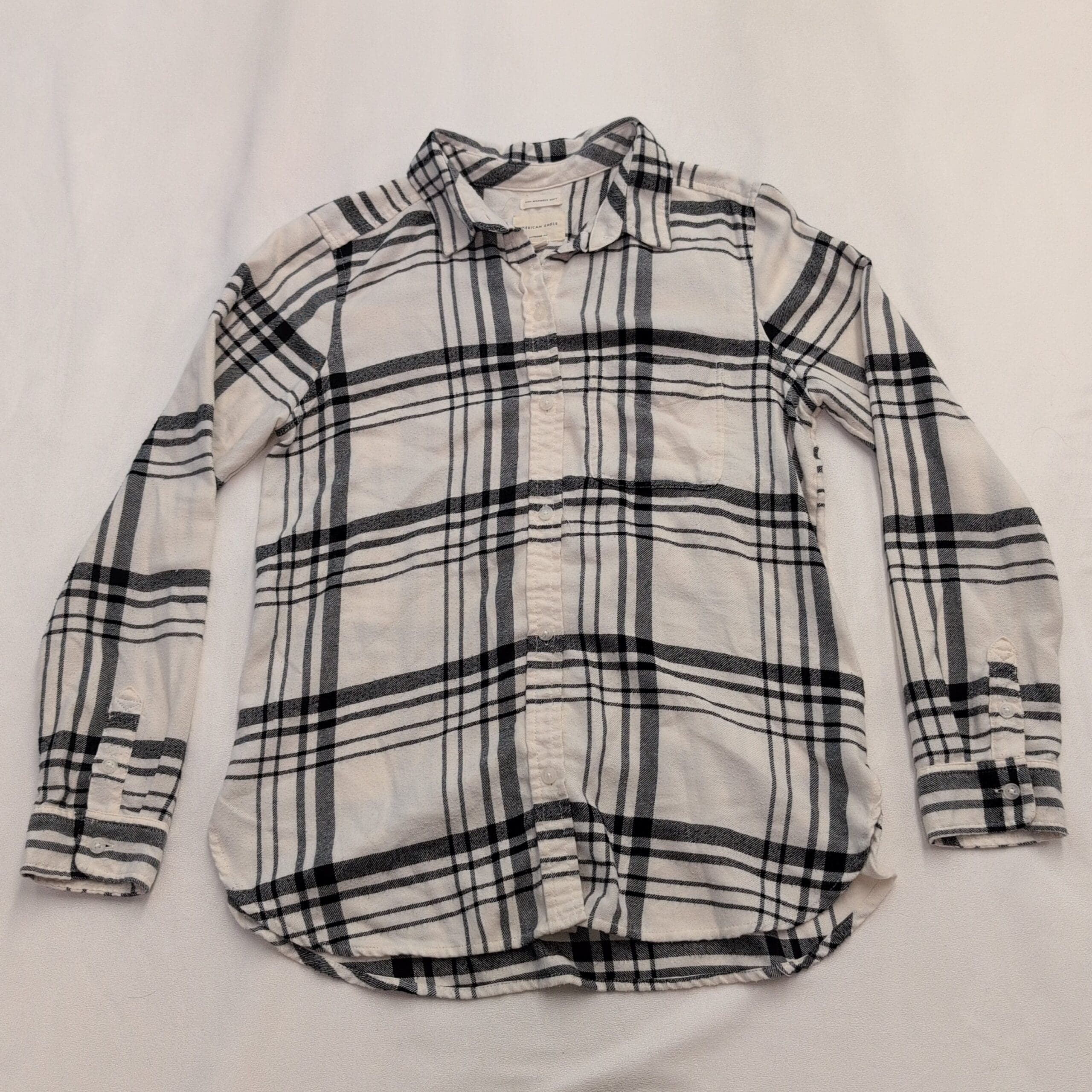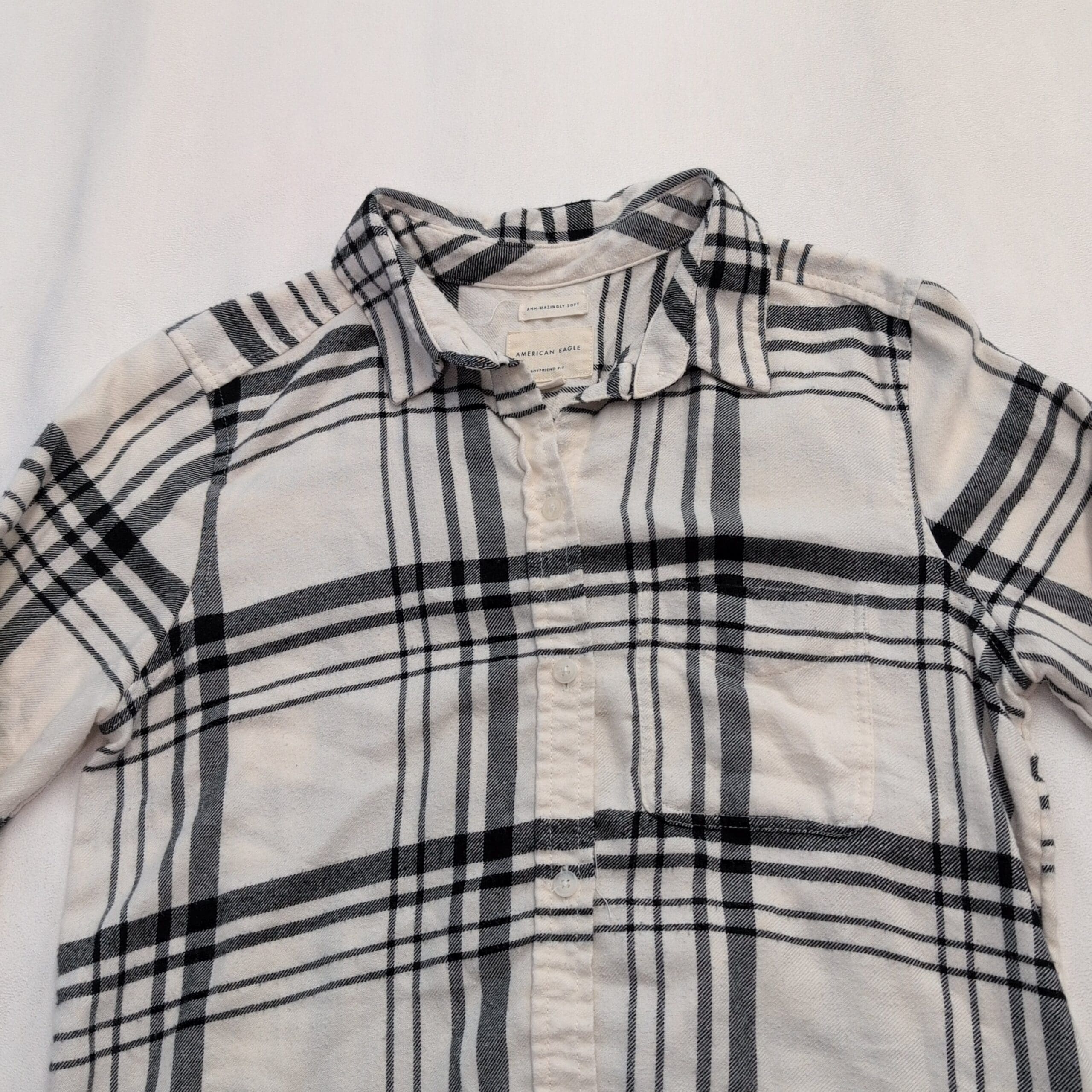 American Eagle Outfitters boyfriend-fit plaid button-down shirt in size M. White base with black and gray plaid pattern, single chest pocket, full button front, long sleeves, and a curved hem with a slightly longer back for a relaxed, layered look.