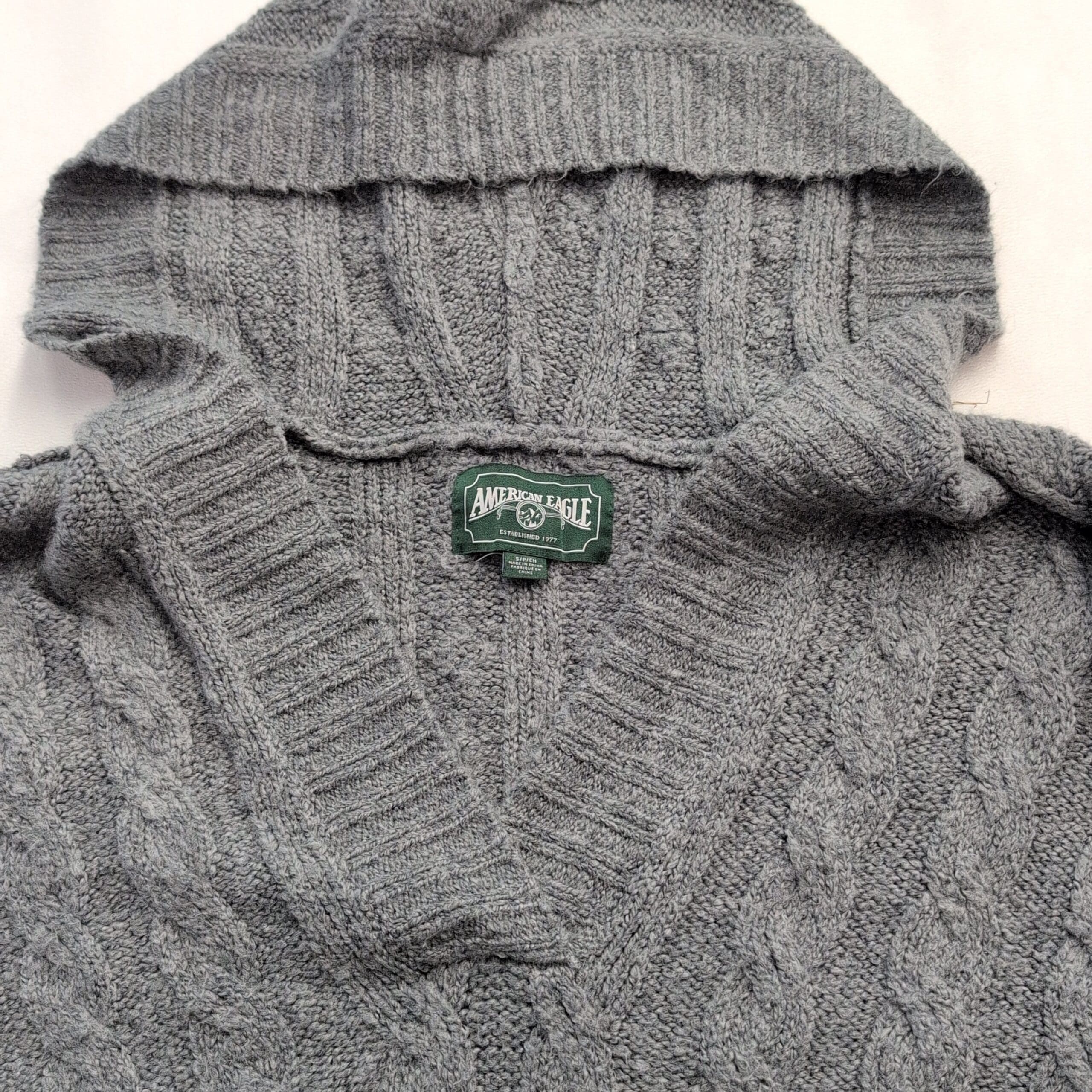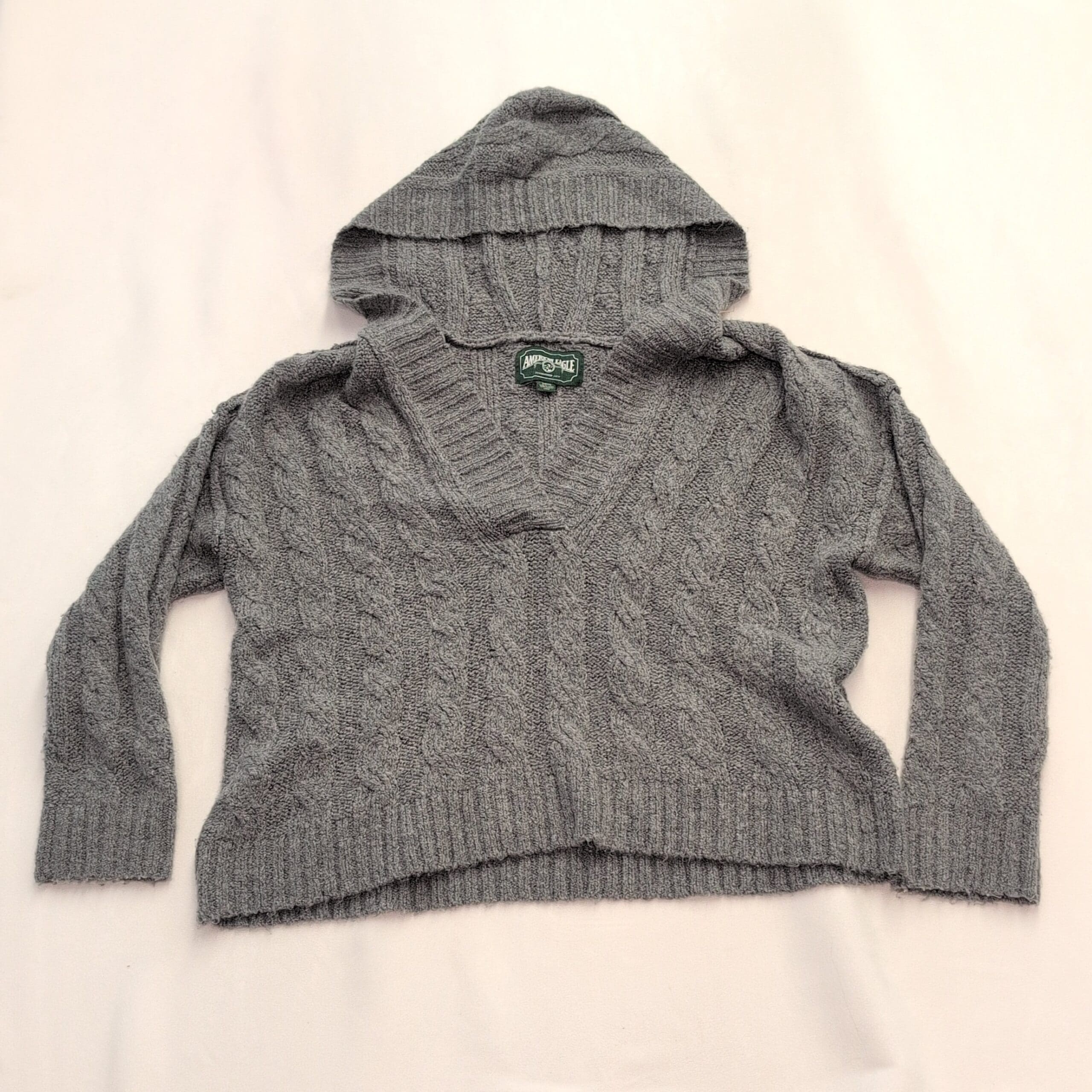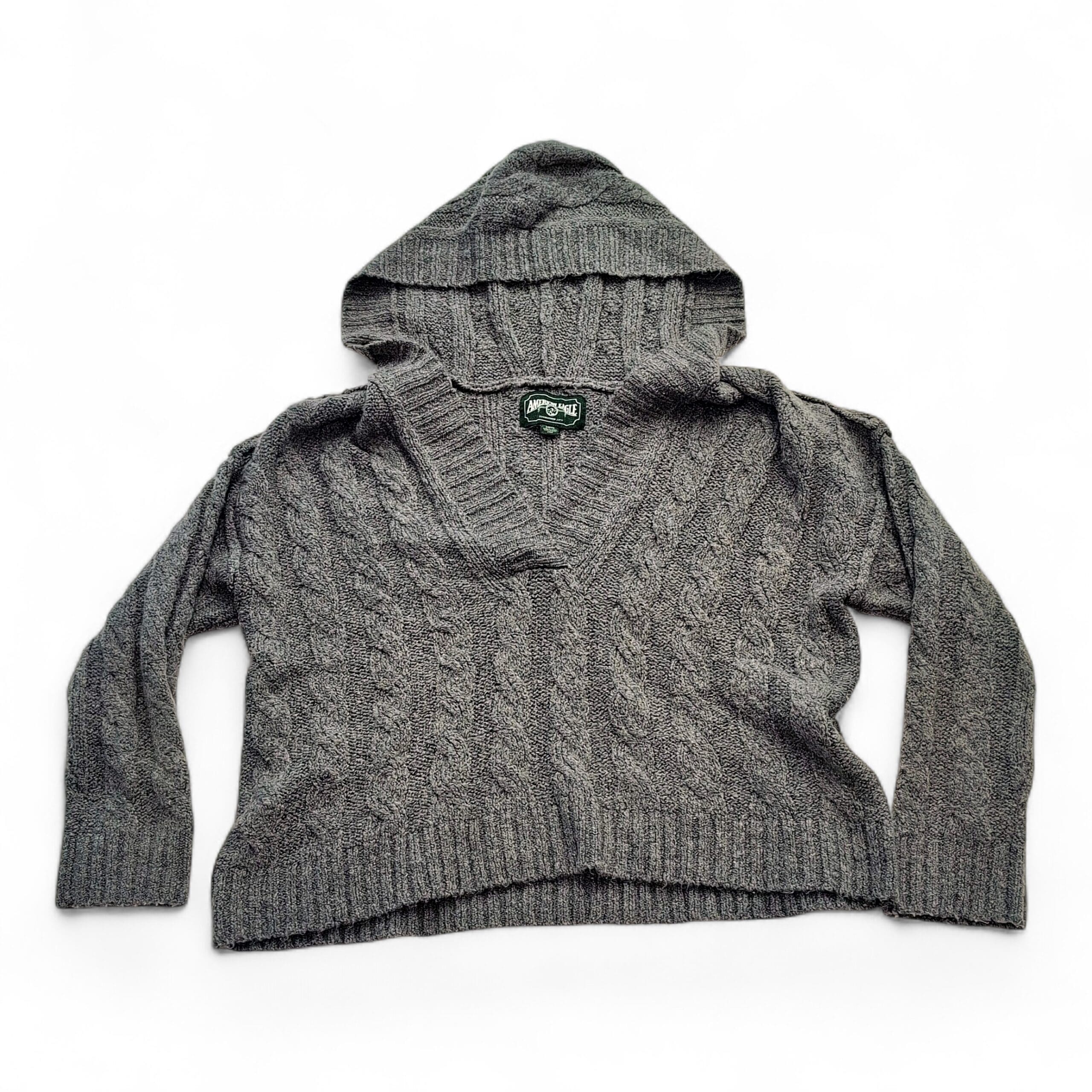 Excellent used condition — free of major rips, tears, stains, or flaws. American Eagle women’s cable knit hooded sweater in size S. Soft gray cable stitch with a V-neckline leading into an attached hood, ribbed cuffs and hem, and a relaxed slightly cropped silhouette. Cozy layering piece that pairs well with high-waist jeans or leggings. Fabric content not specified on tag. Typical light wear and minimal pilling may be present from normal use.
