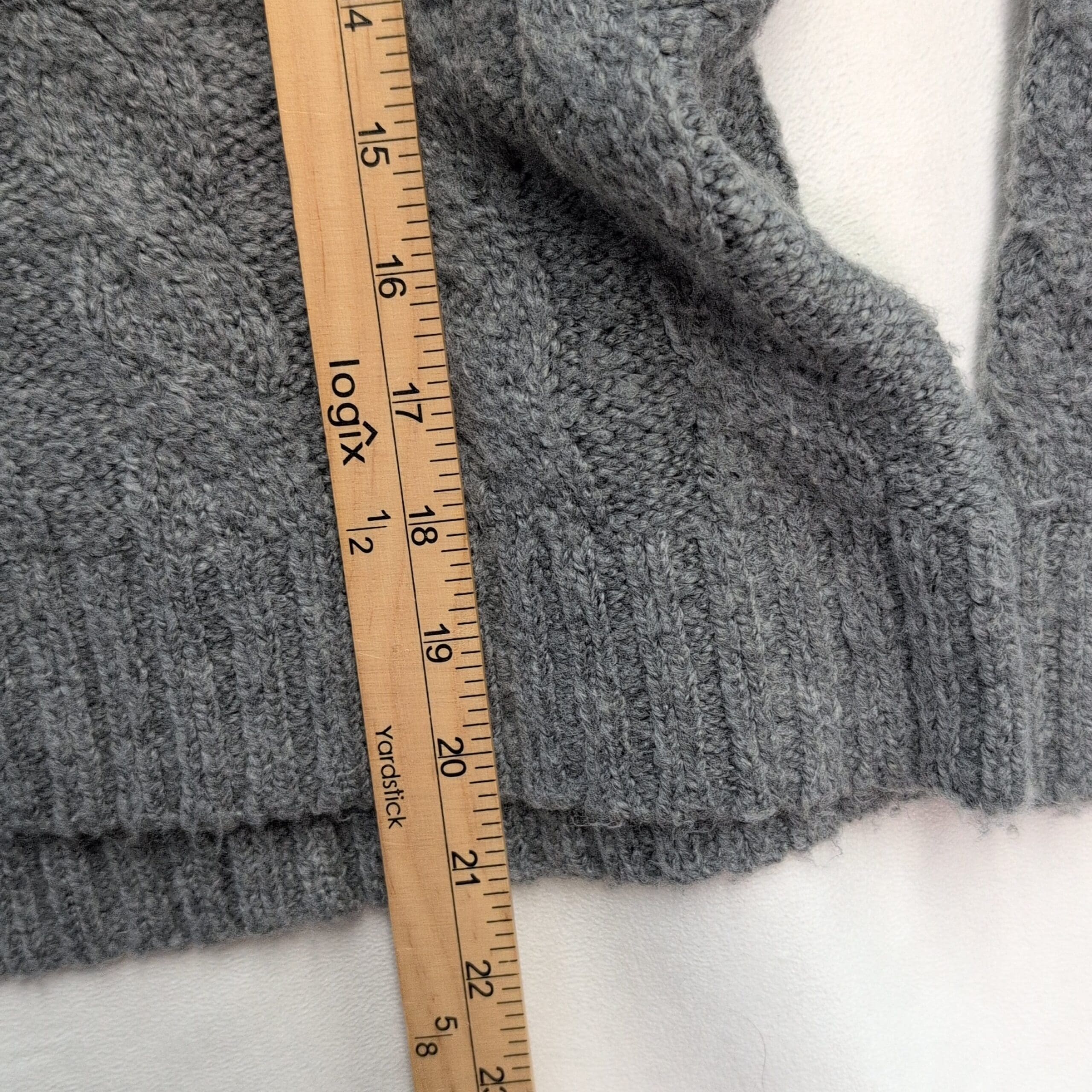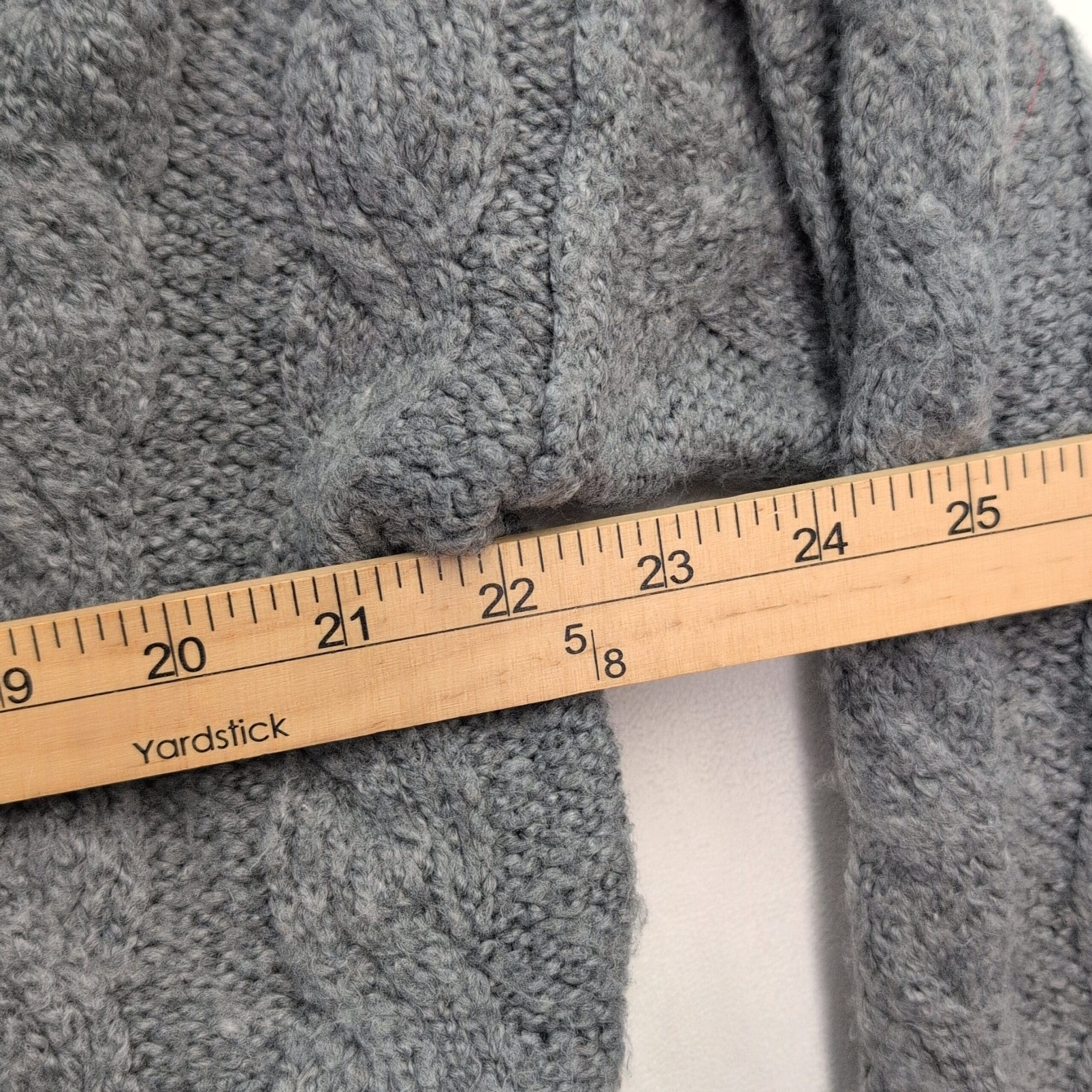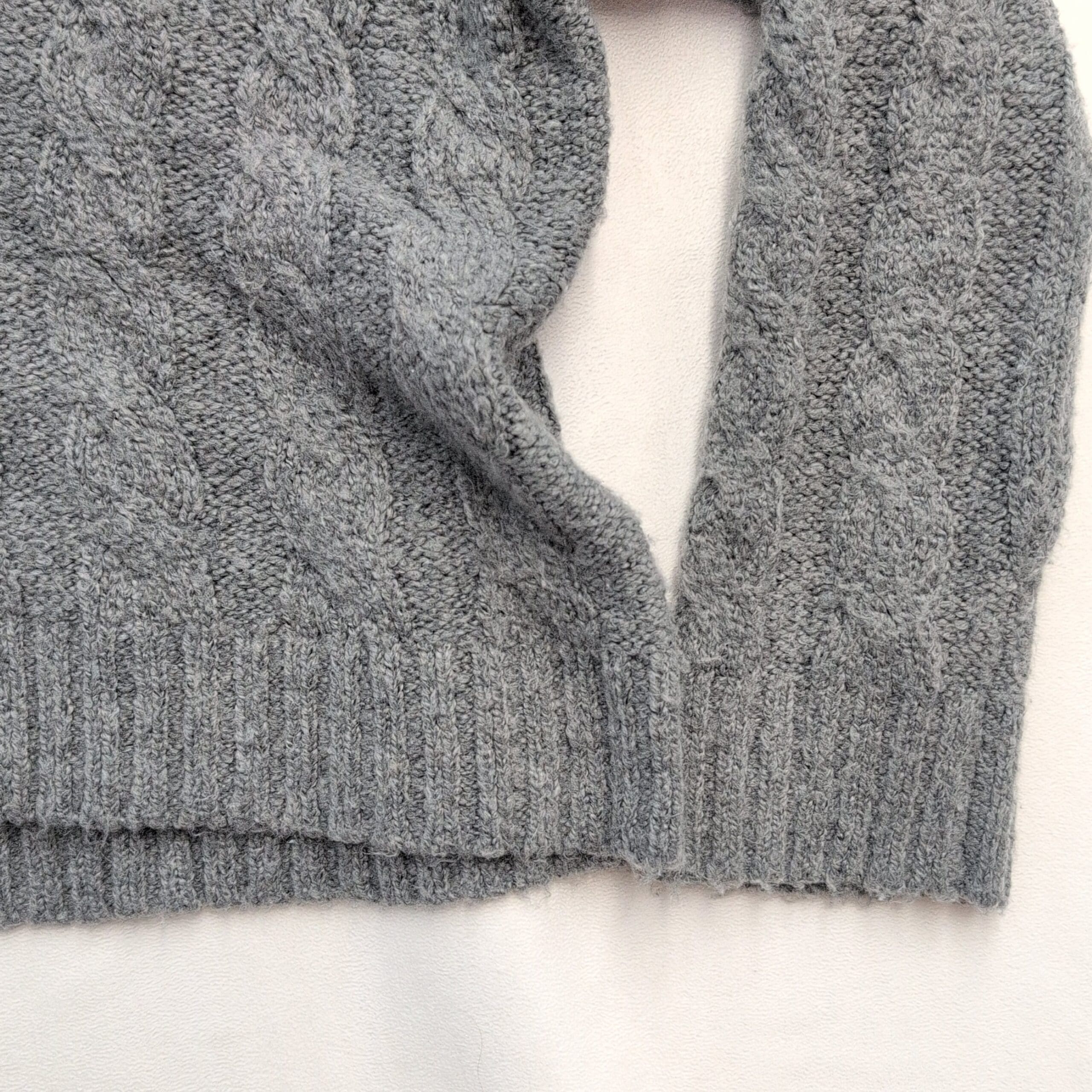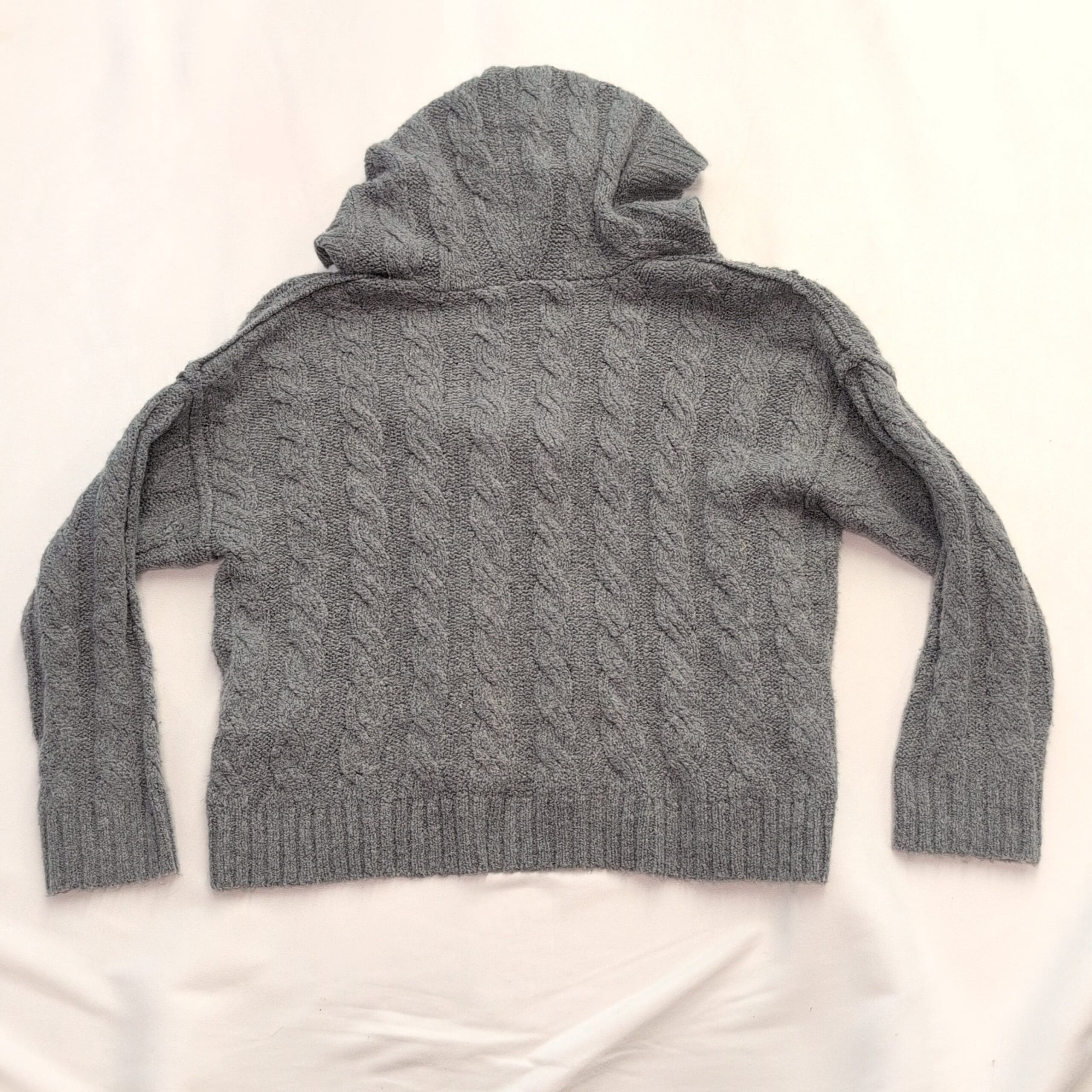Excellent used condition — free of major rips, tears, stains, or flaws. American Eagle women’s cable knit hooded sweater in size S. Soft gray cable stitch with a V-neckline leading into an attached hood, ribbed cuffs and hem, and a relaxed slightly cropped silhouette. Cozy layering piece that pairs well with high-waist jeans or leggings. Fabric content not specified on tag. Typical light wear and minimal pilling may be present from normal use.