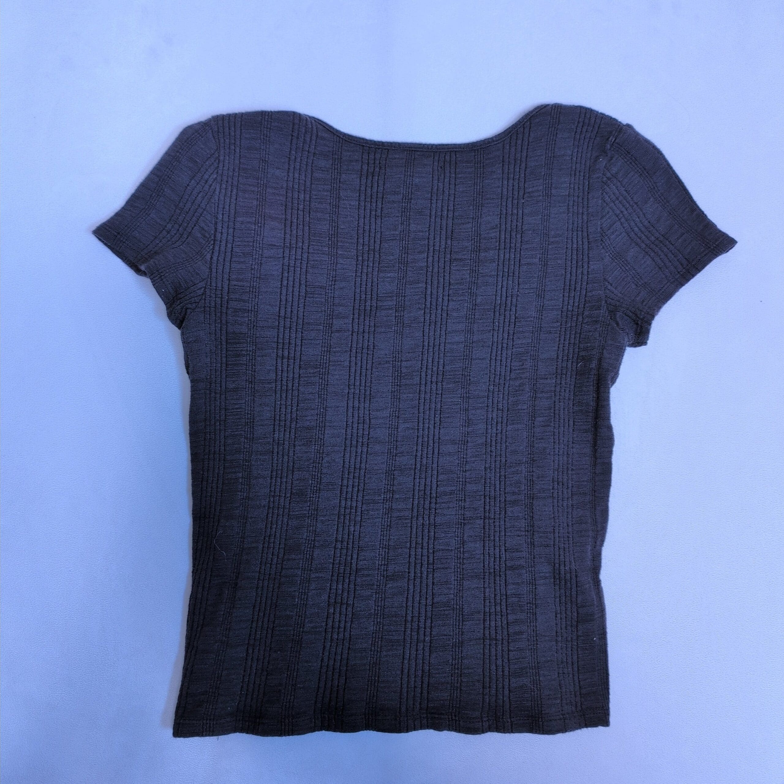 American Eagle Outfitters short sleeve scoop neck button-front tee in gray. Size S (women). Ribbed textured knit with five front buttons and a soft, slightly stretchy feel — great for layering or casual wear.