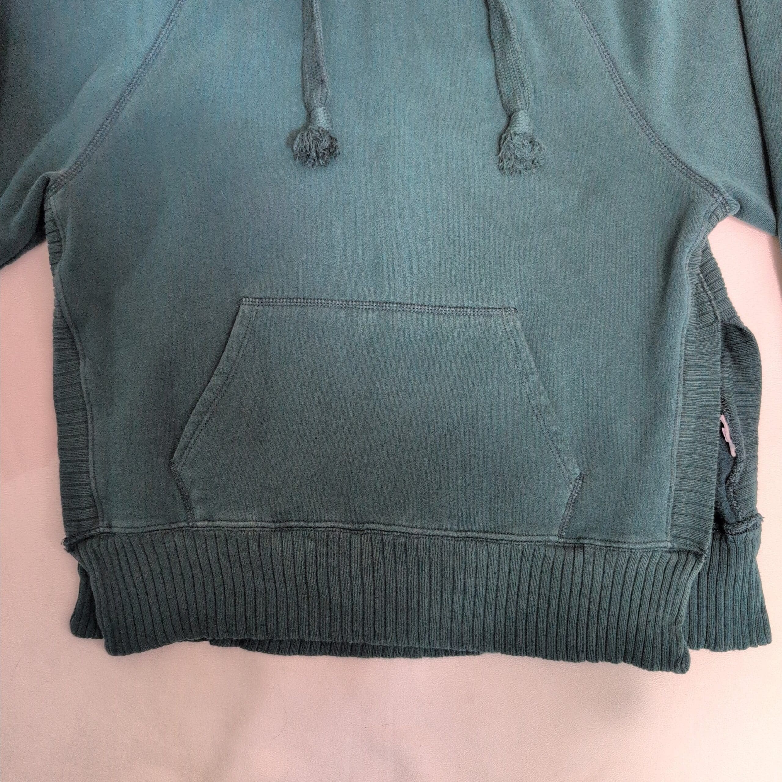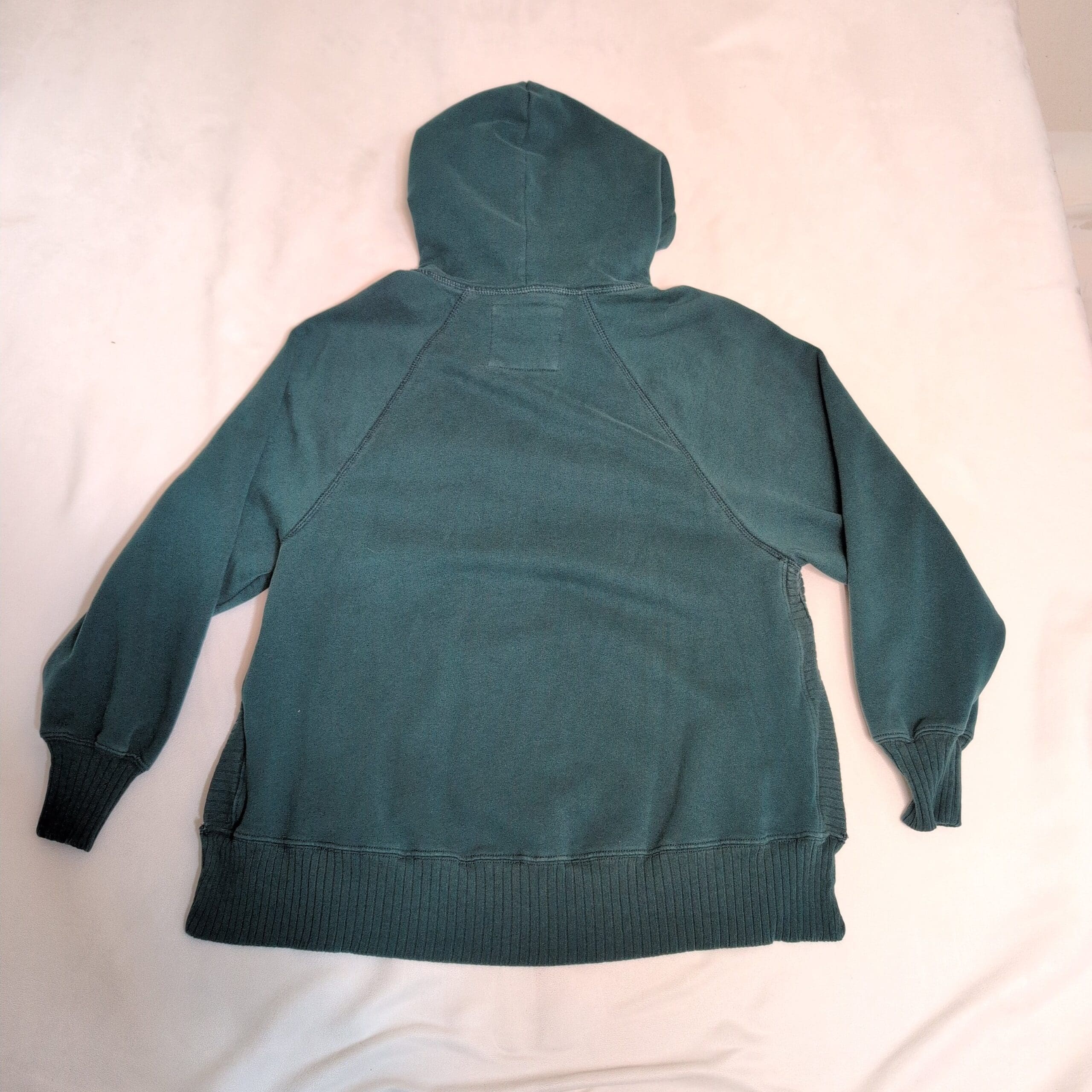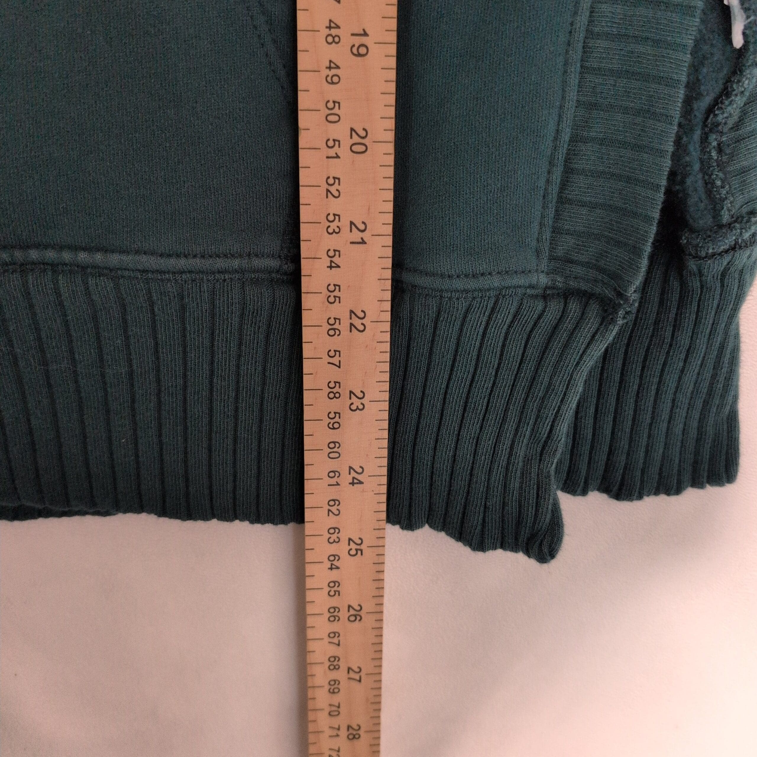 Deep green American Eagle pullover hoodie in men’s size S. Features a roomy hood with drawcords, kangaroo pocket, ribbed cuffs and hem, and subtle side rib-knit panels. Soft fleece interior for warmth and a relaxed, casual fit — great for layering and everyday wear.