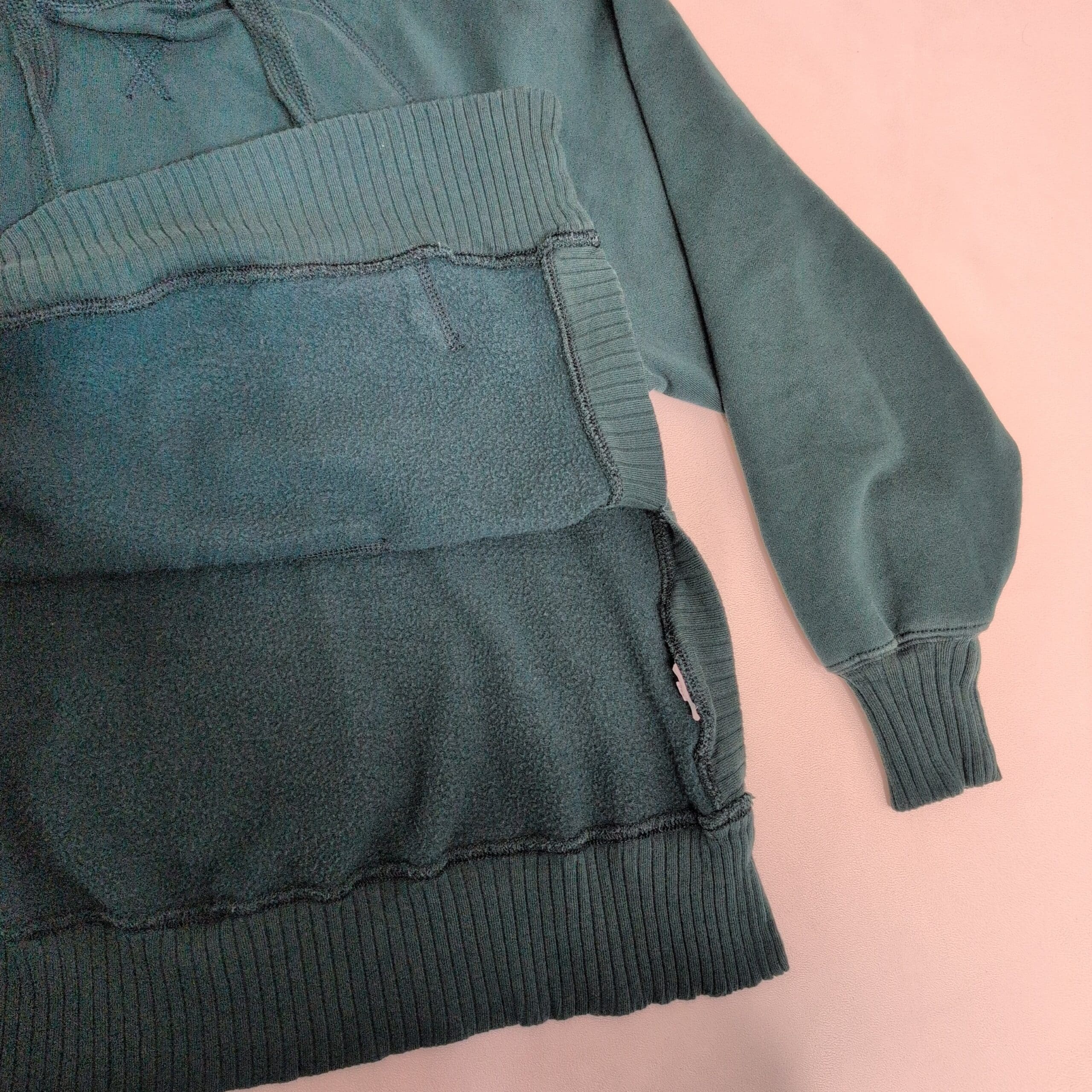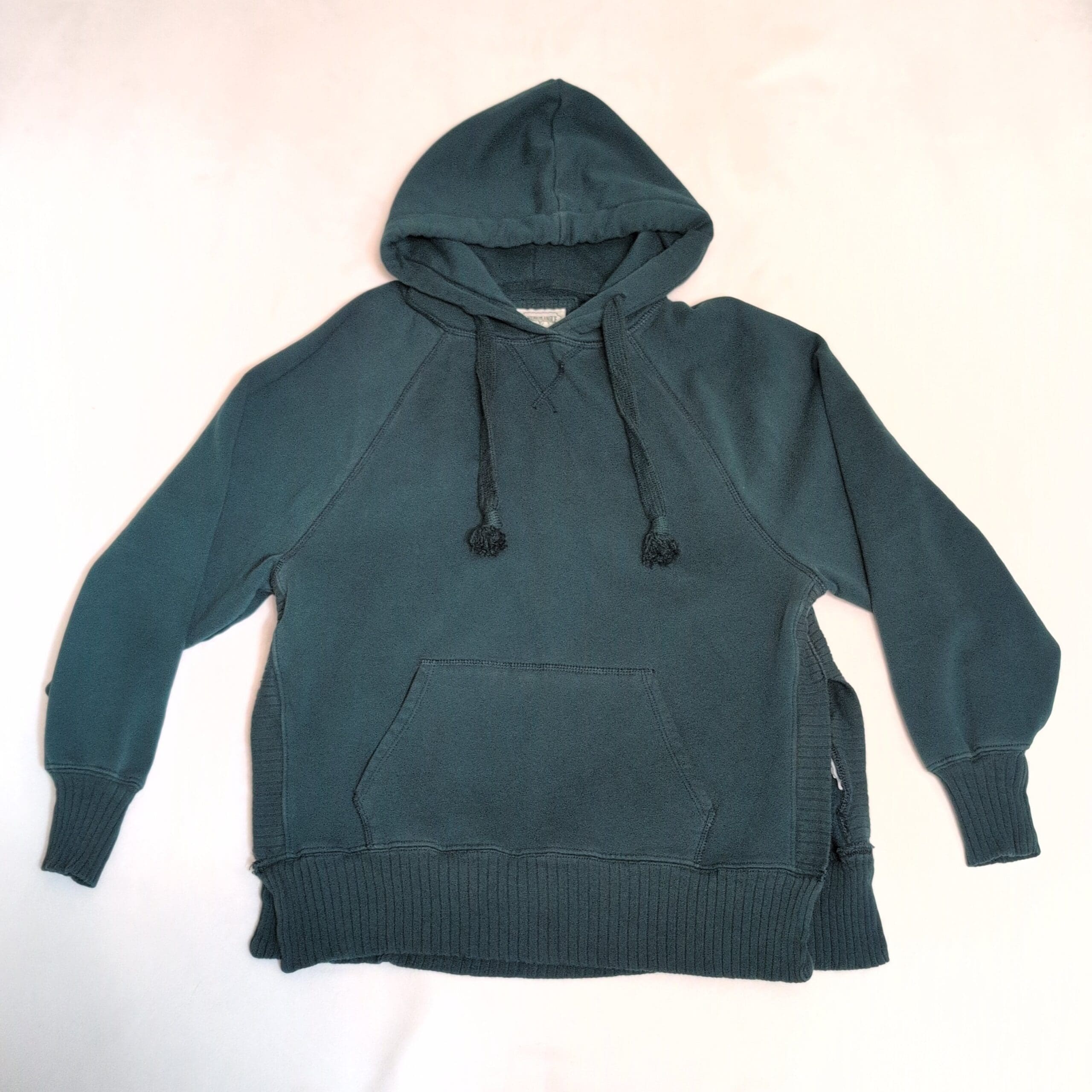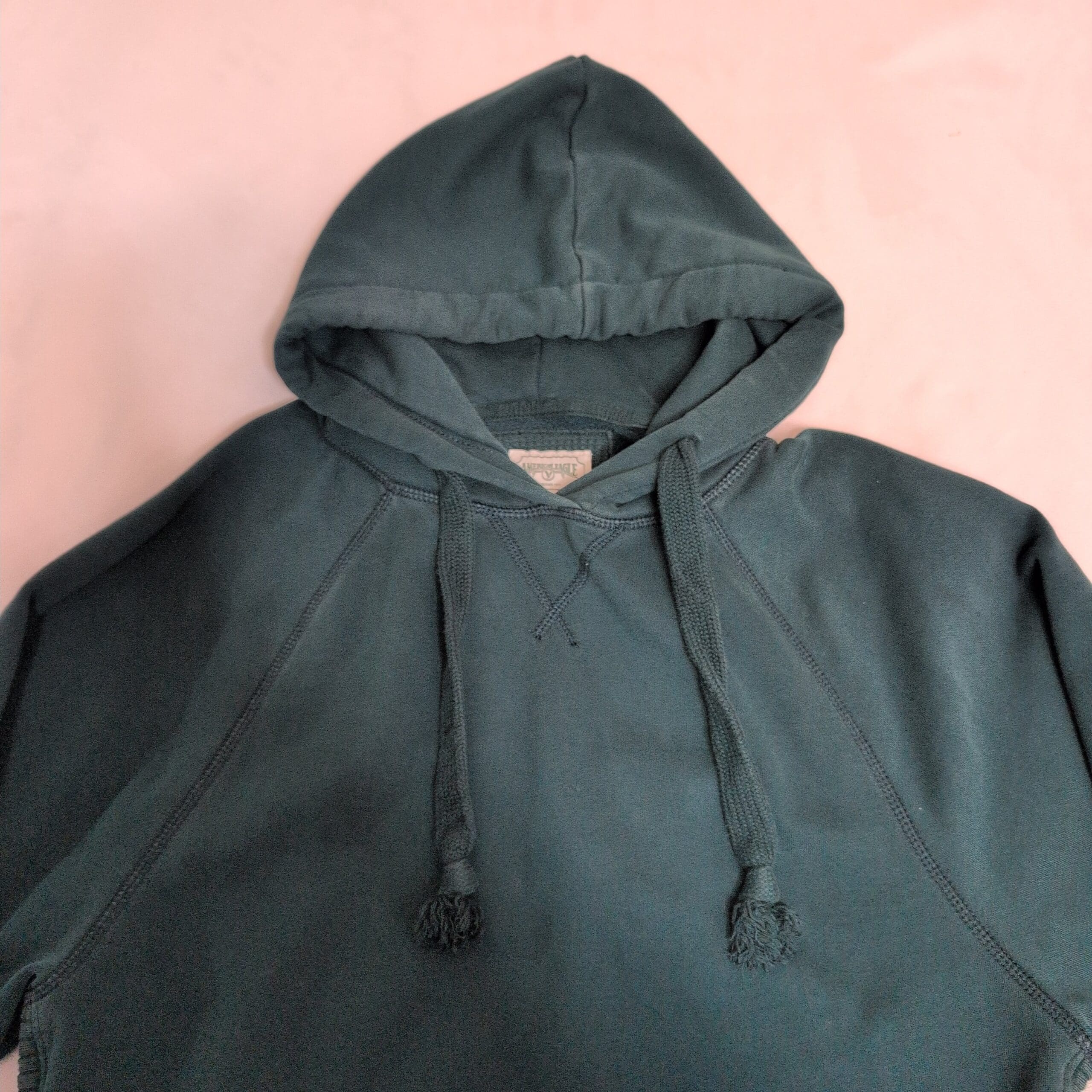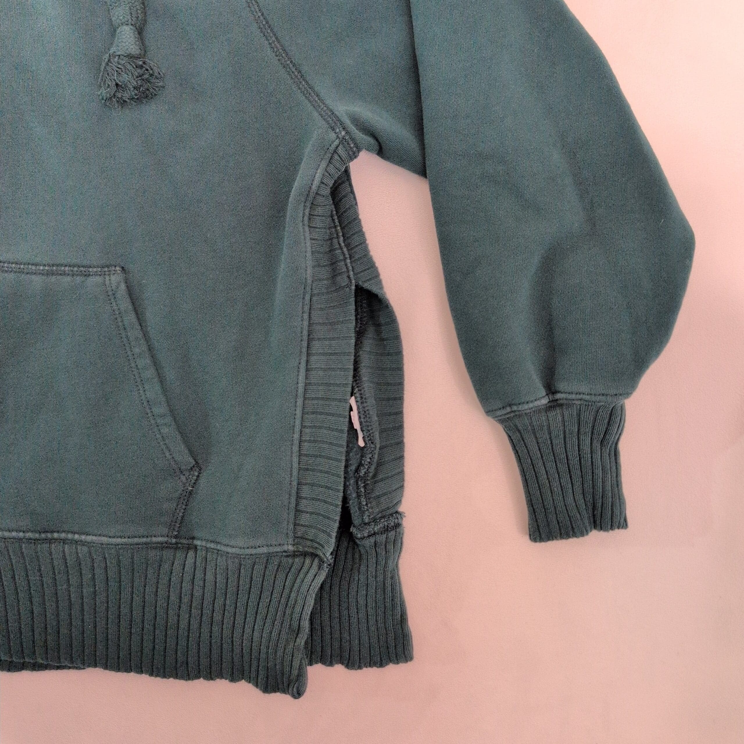 Deep green American Eagle pullover hoodie in men’s size S. Features a roomy hood with drawcords, kangaroo pocket, ribbed cuffs and hem, and subtle side rib-knit panels. Soft fleece interior for warmth and a relaxed, casual fit — great for layering and everyday wear.