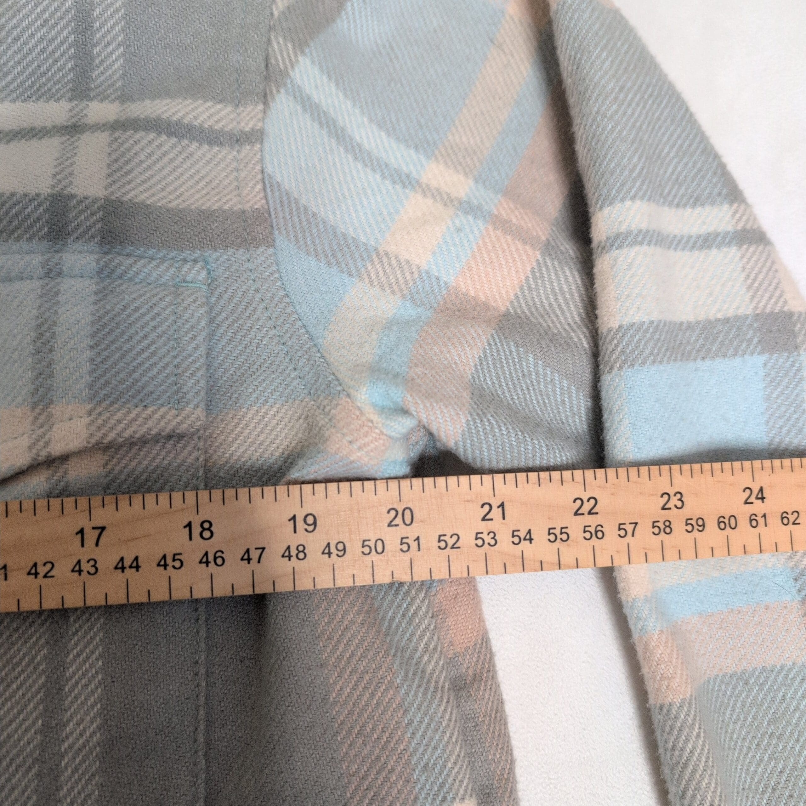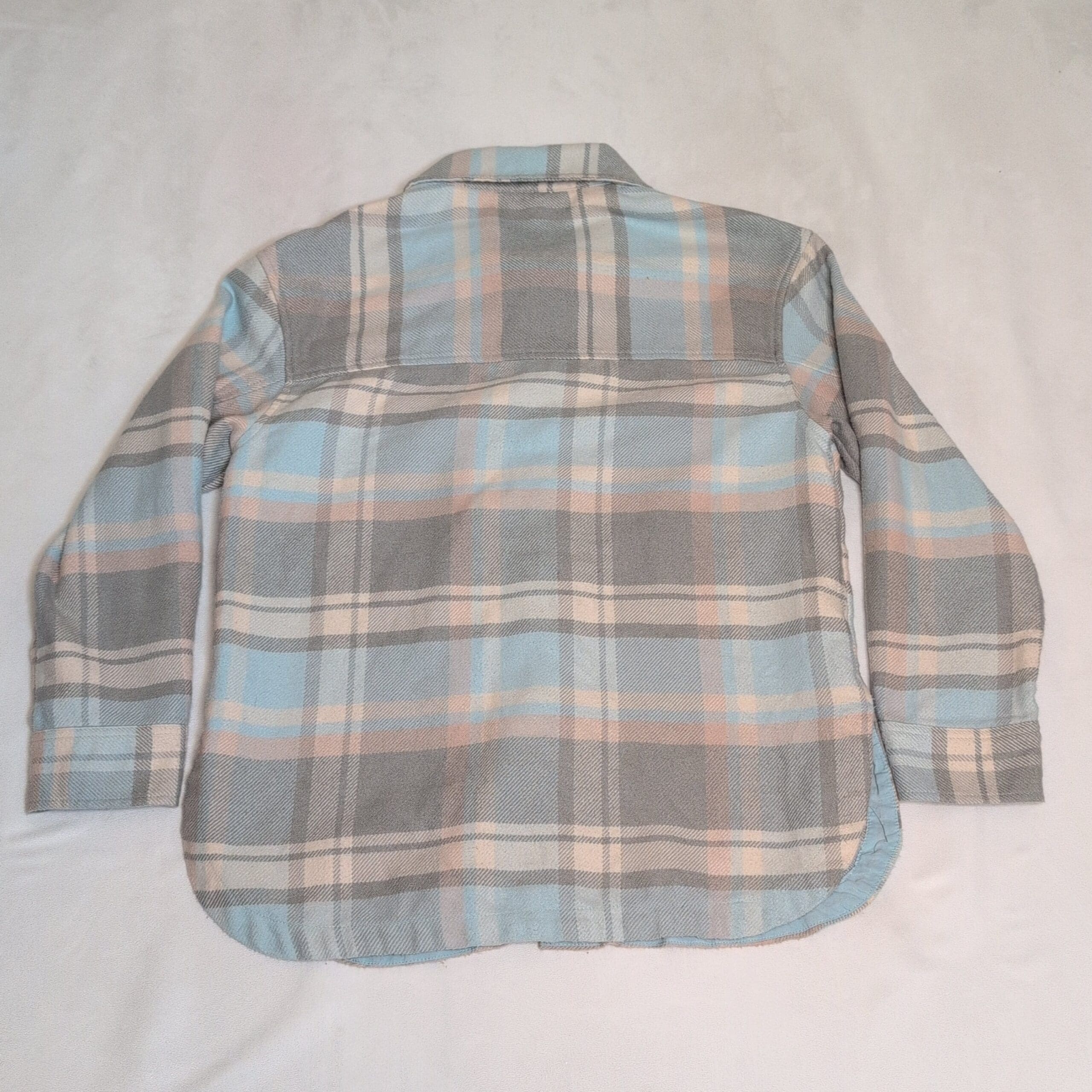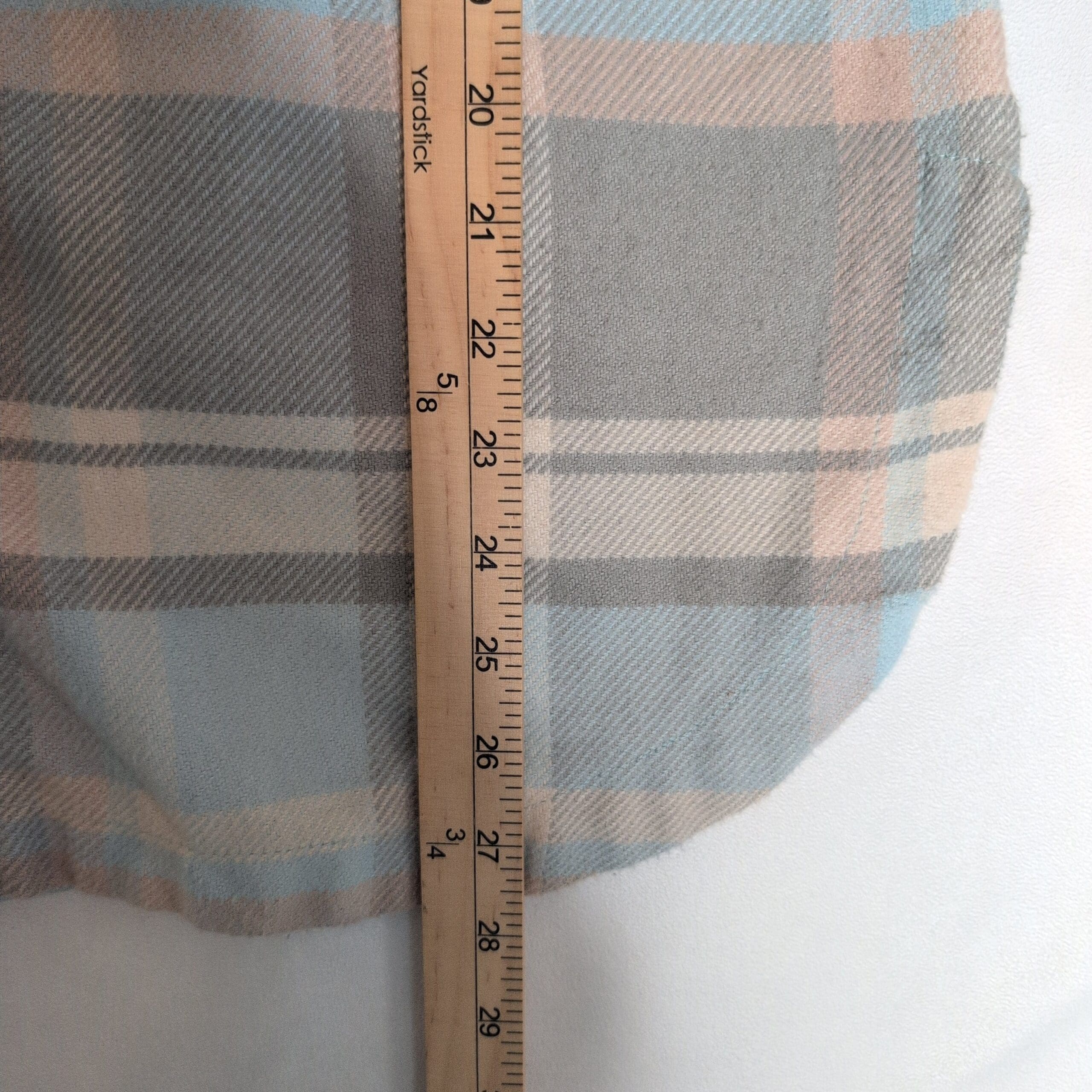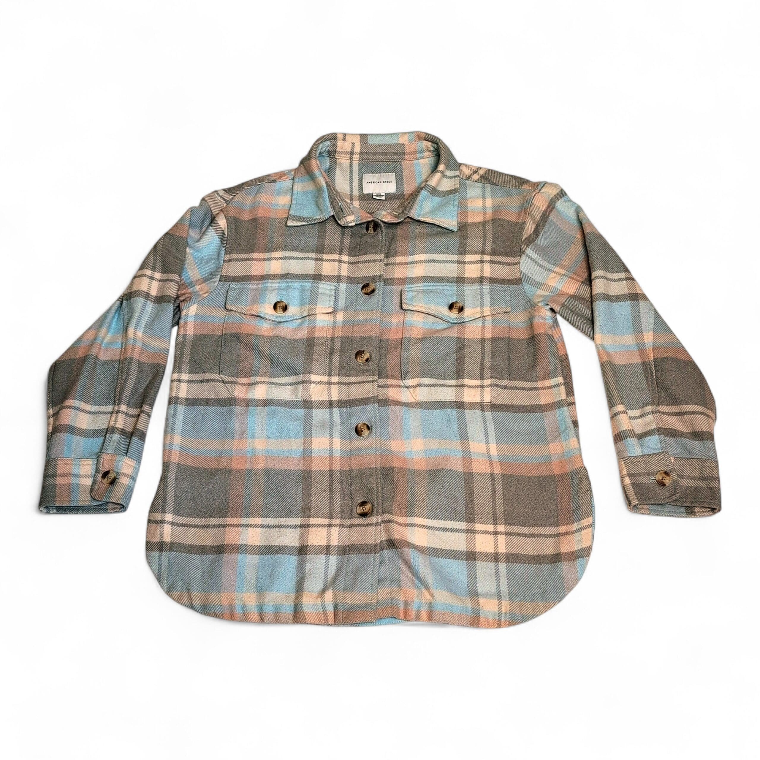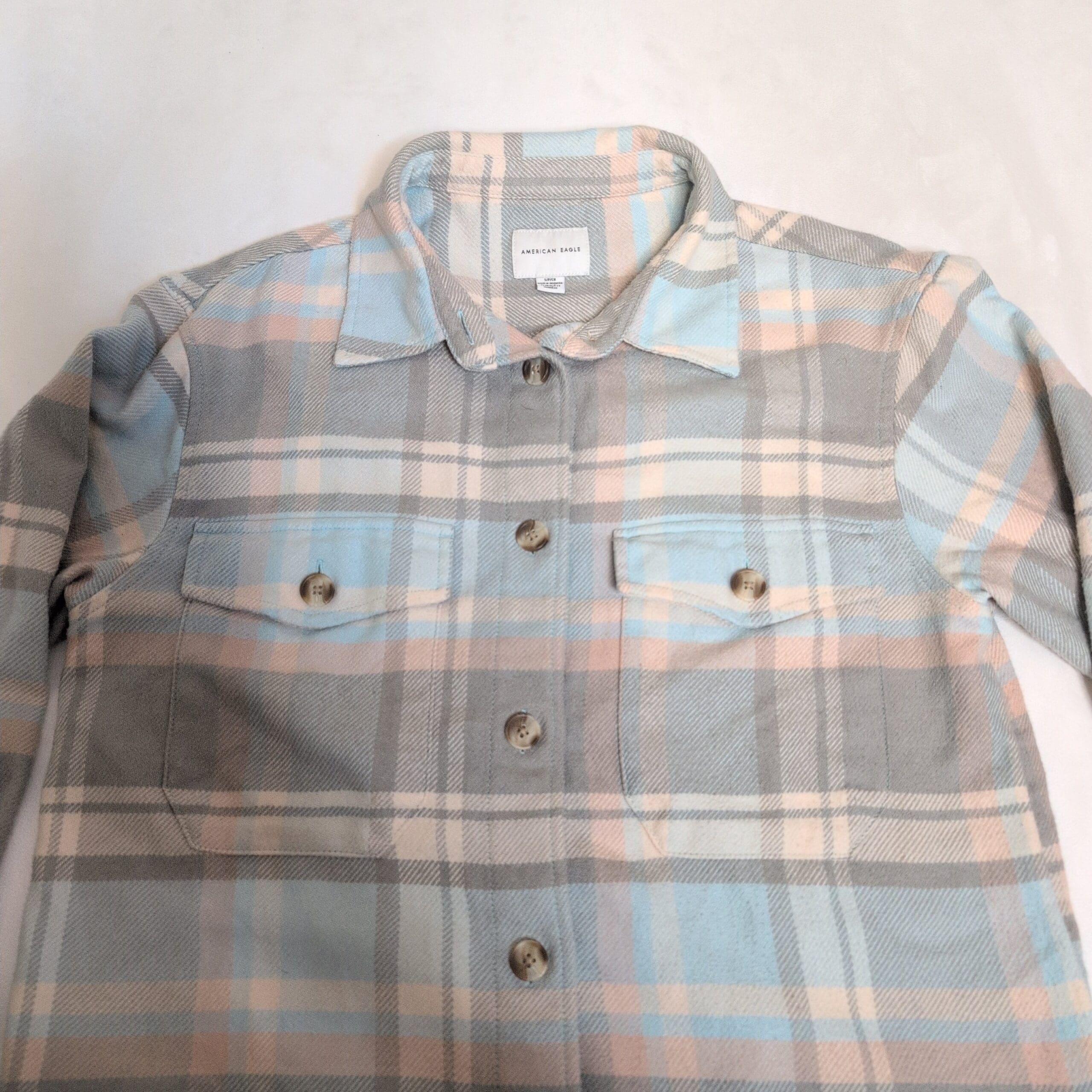 American Eagle button-down plaid shirt in soft blue, gray, and cream tones. Collared with a full button placket, long sleeves with button cuffs, and two flap chest pockets. Relaxed, easy-to-layer silhouette — a versatile casual staple for cooler days.
