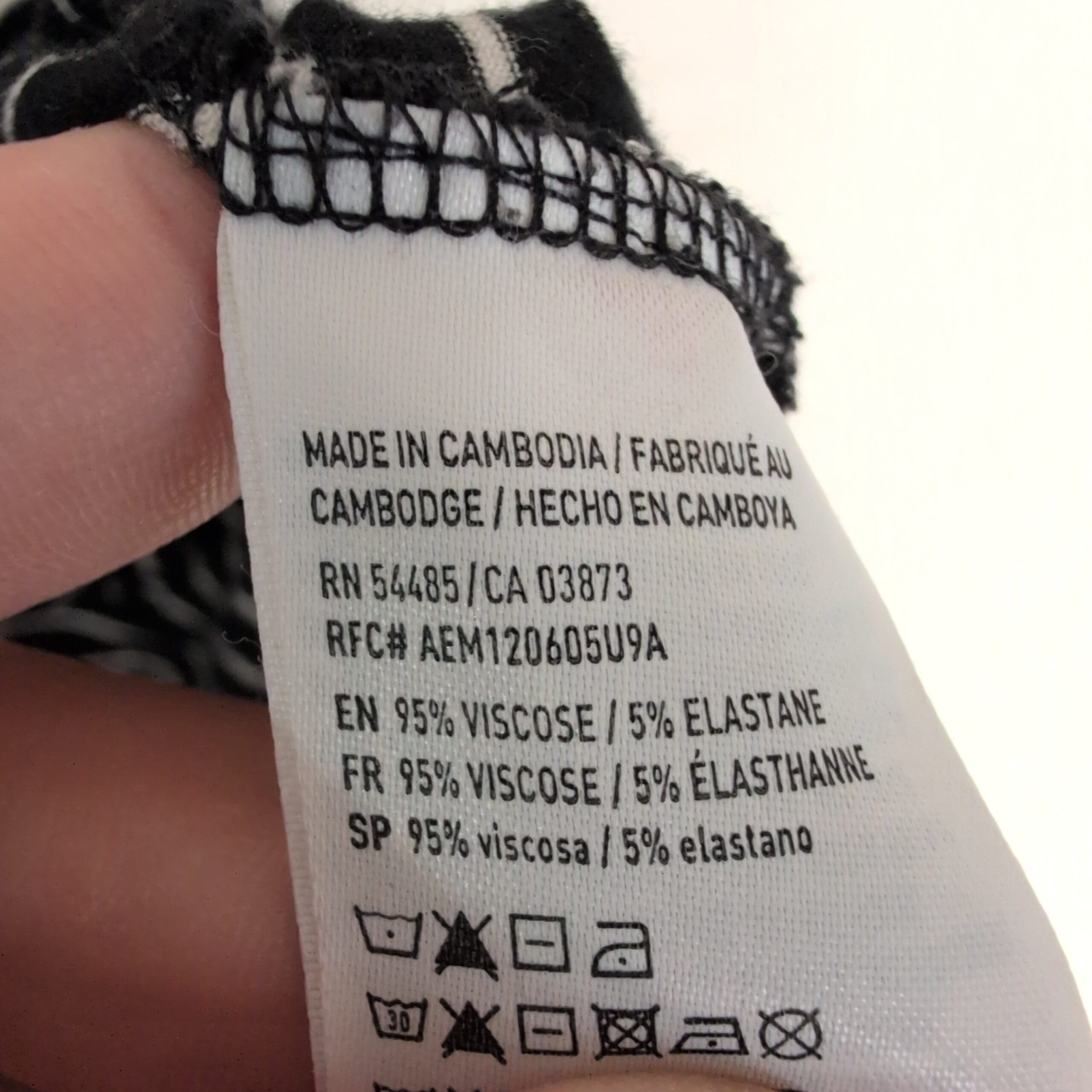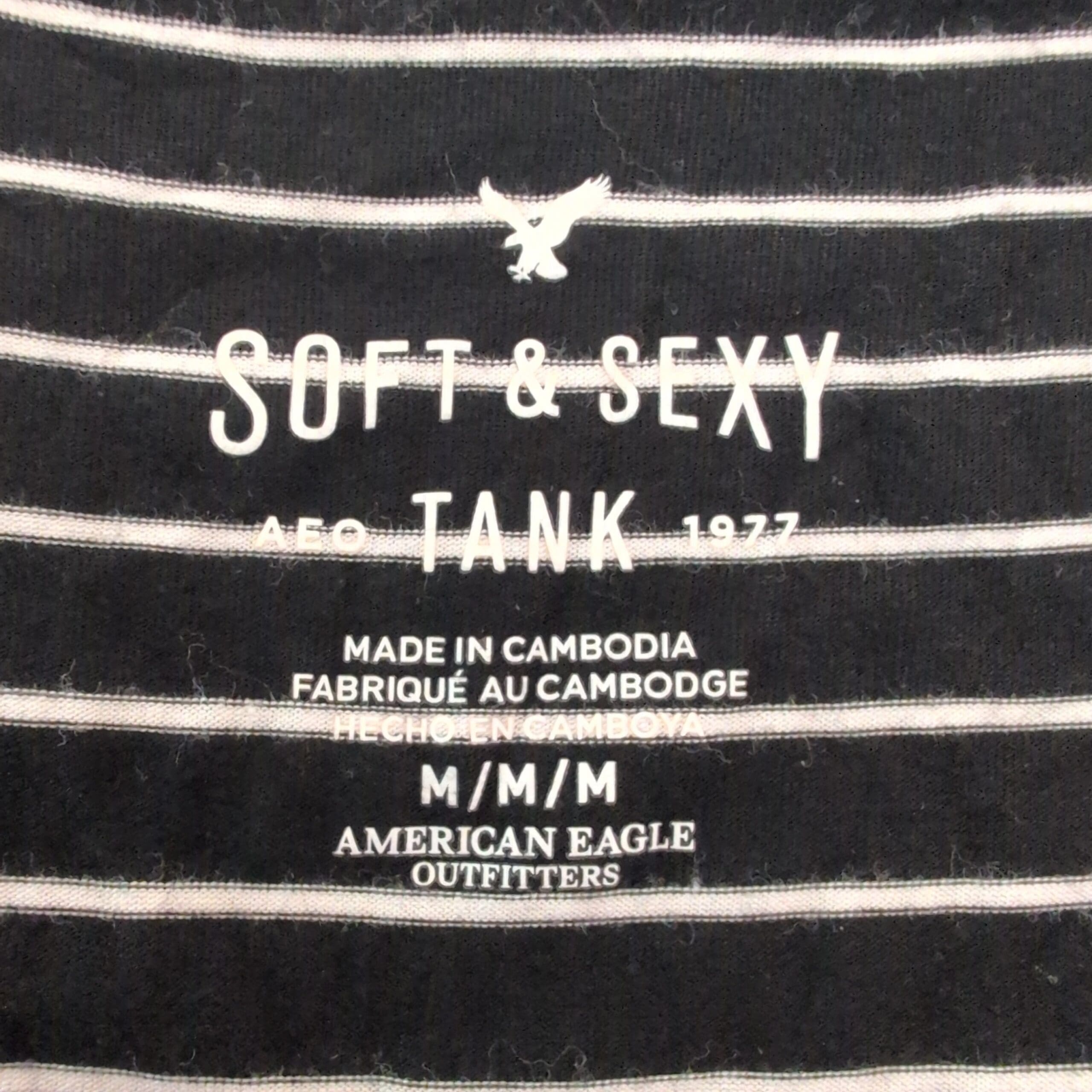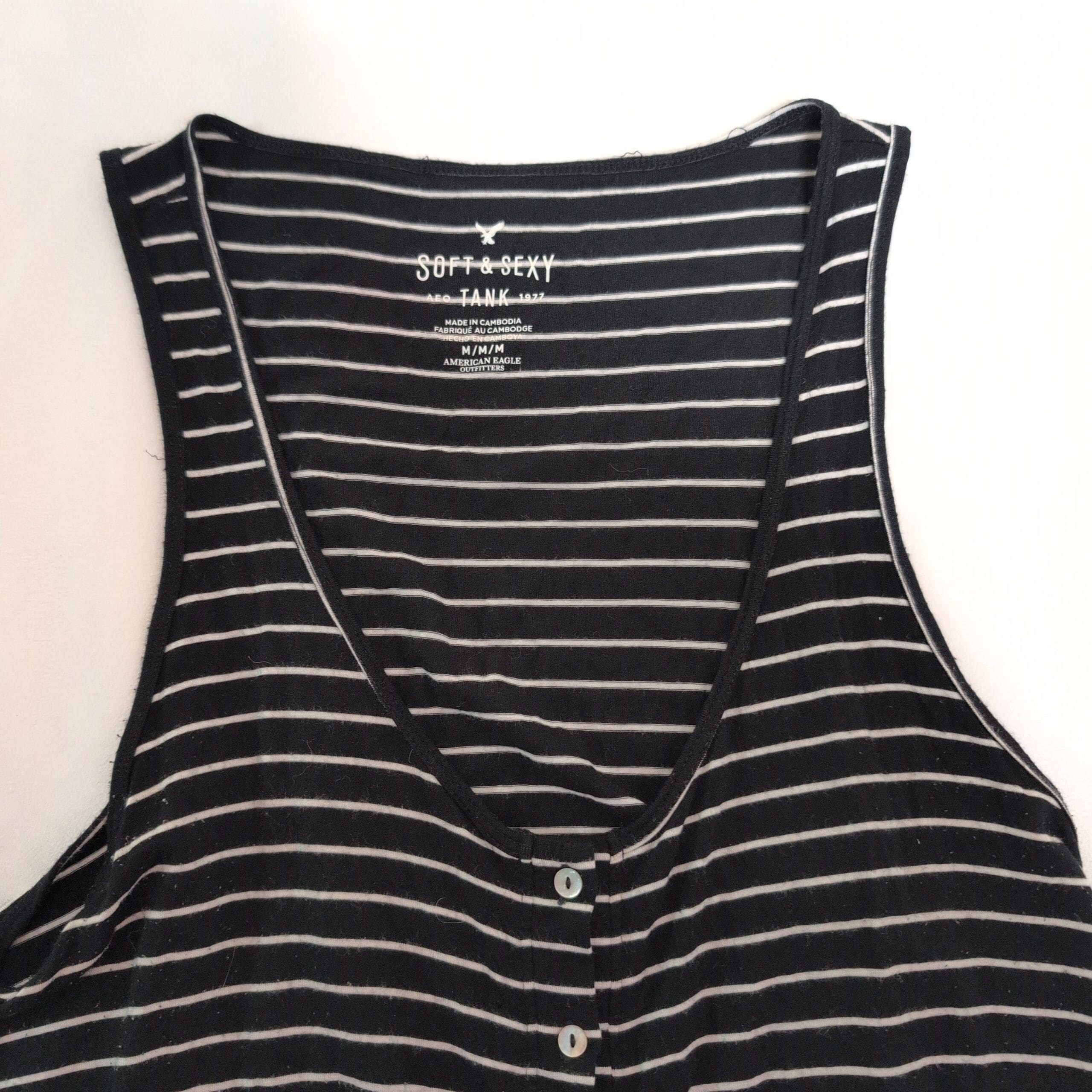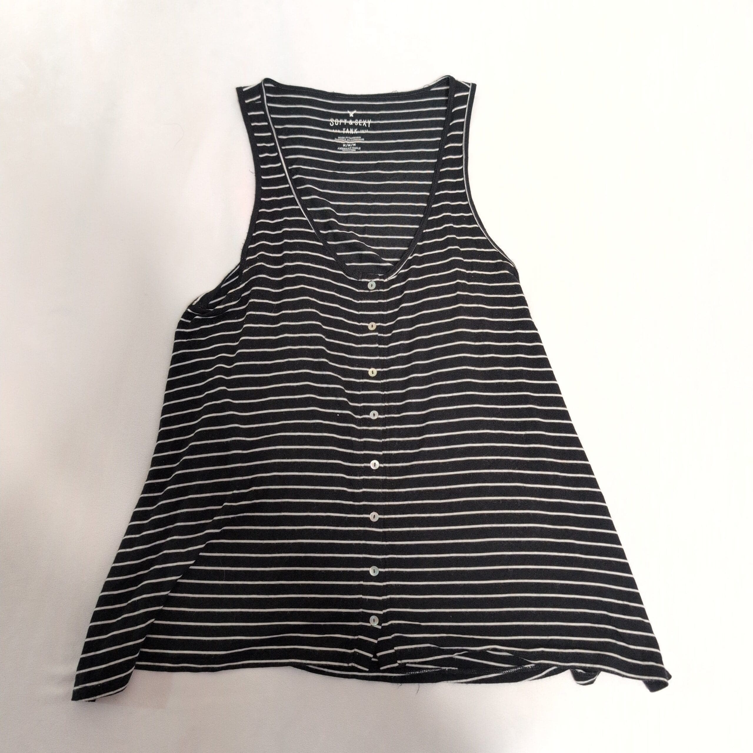 American Eagle Outfitters “Soft & Sexy” black and white striped tank with button-front detail and scoop neckline. Relaxed, flowy A-line silhouette in size M (standard). Lightweight, soft knit—great for layering or warm-weather wear. Condition: gently used with some thread fraying at the neckline; see photos for details.