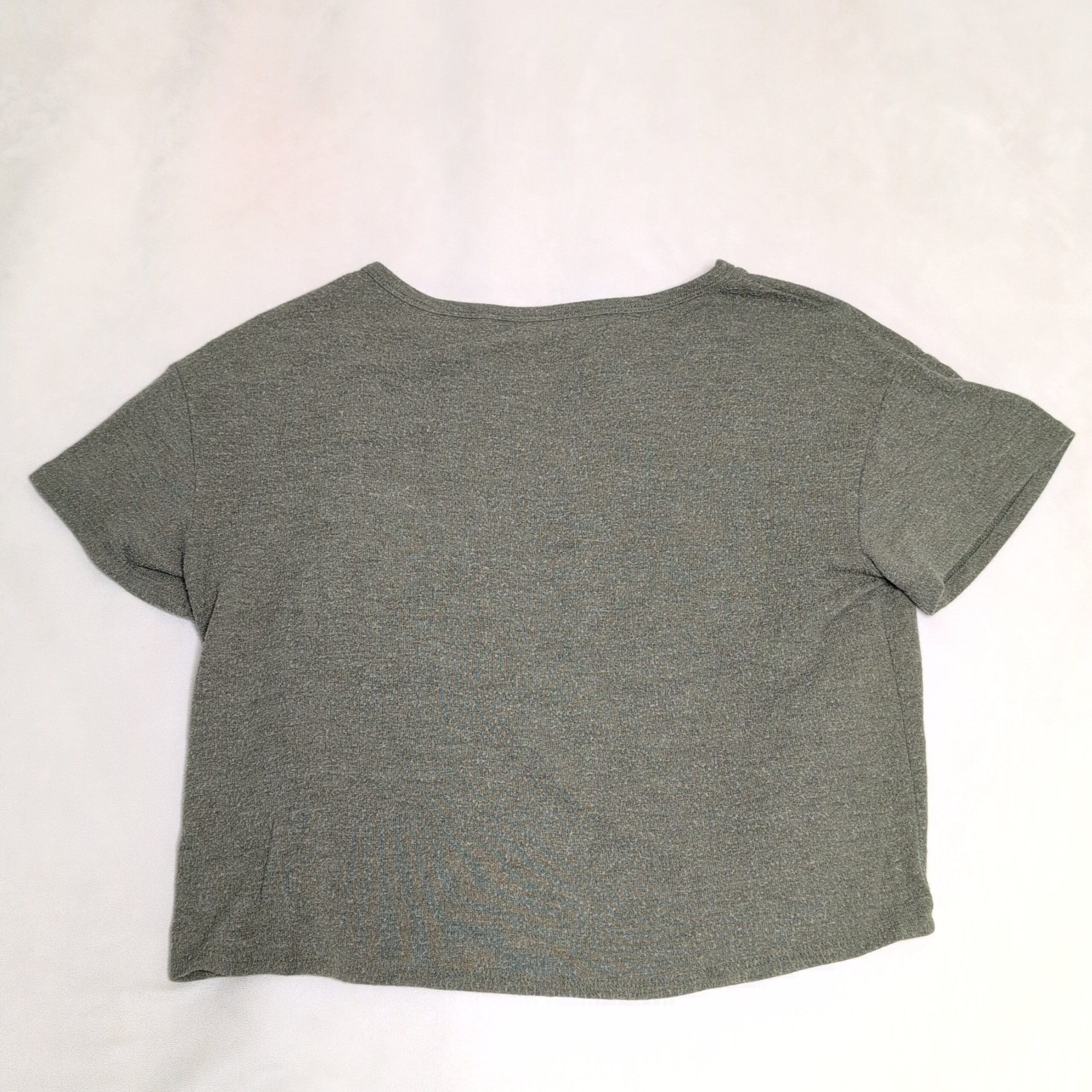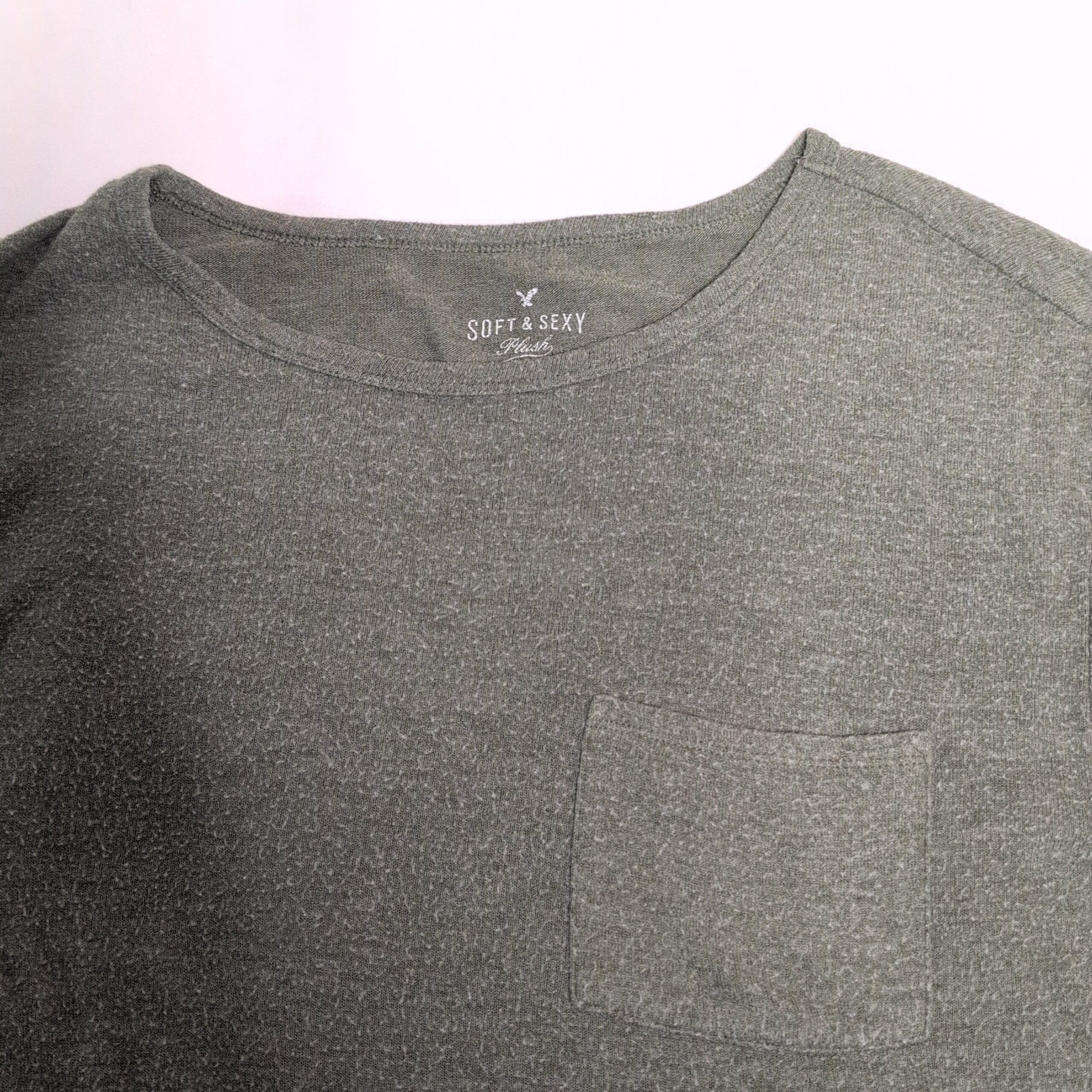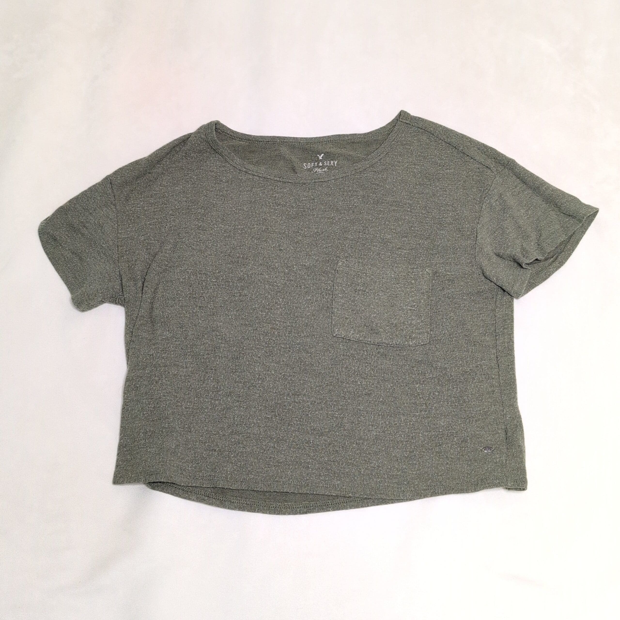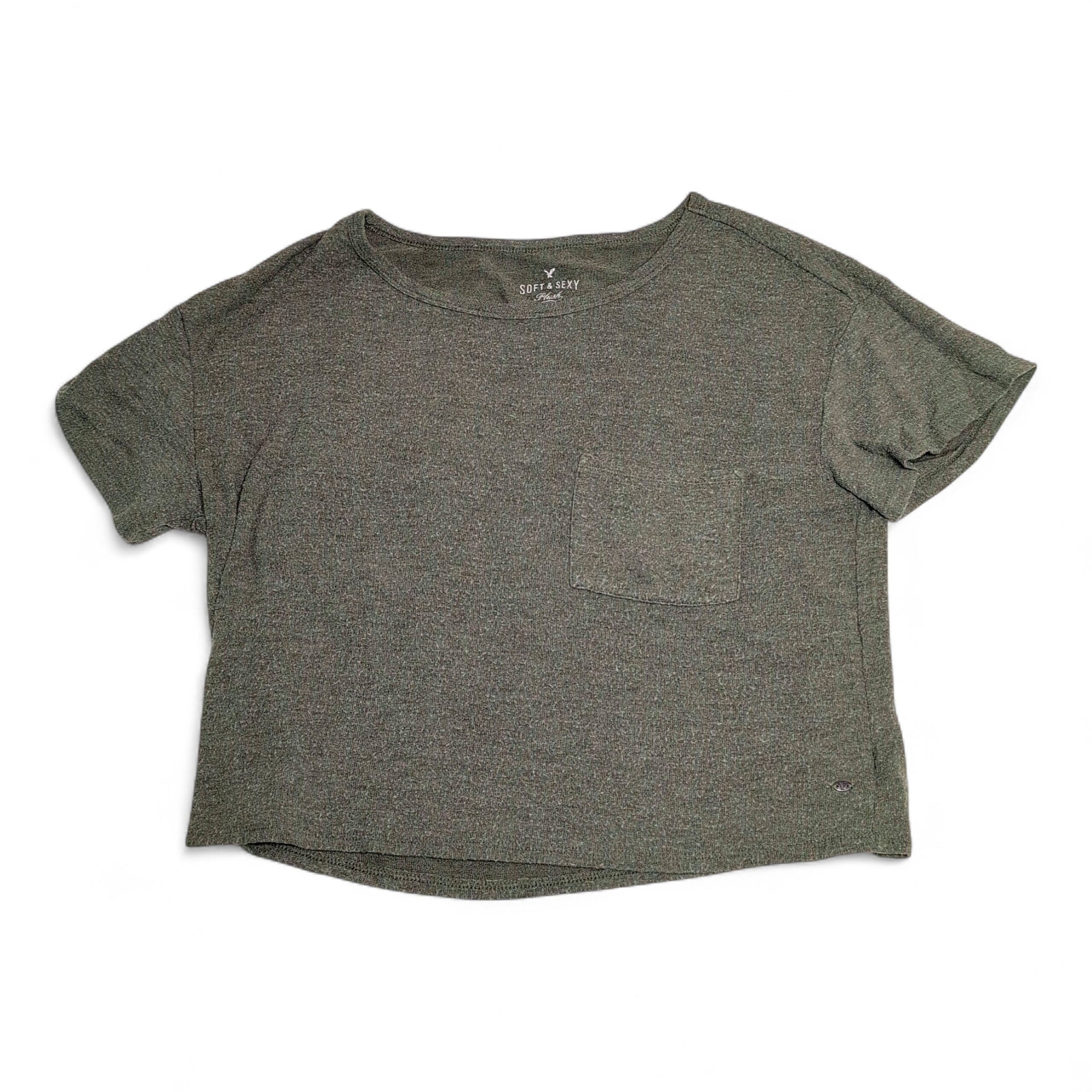American Eagle Outfitters “Soft & Sexy” short-sleeve tee in muted green. Features a relaxed, boxy silhouette with a crew neckline, chest patch pocket, and a slightly cropped hem — an easy everyday staple for layering or casual wear. Size: M (Women’s).