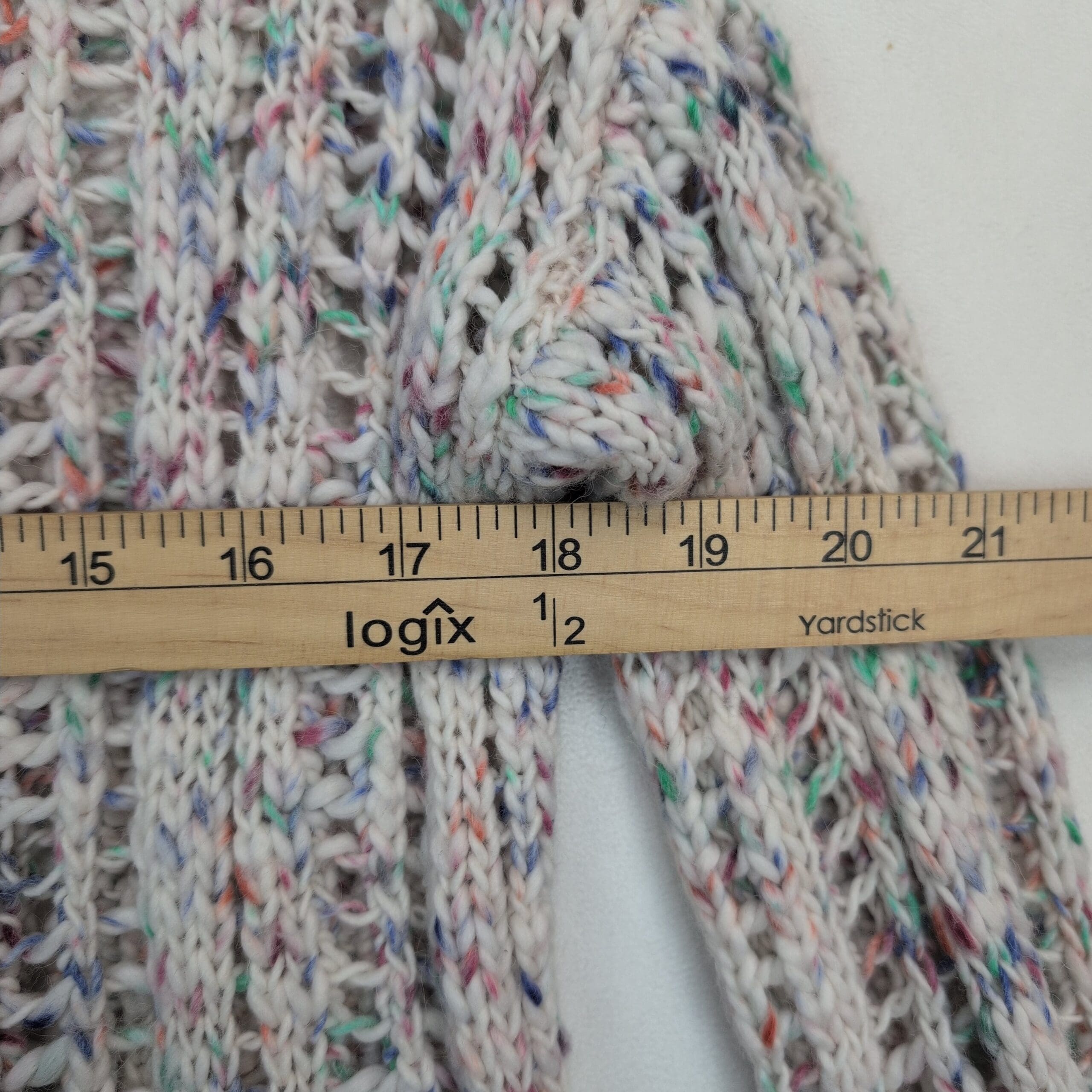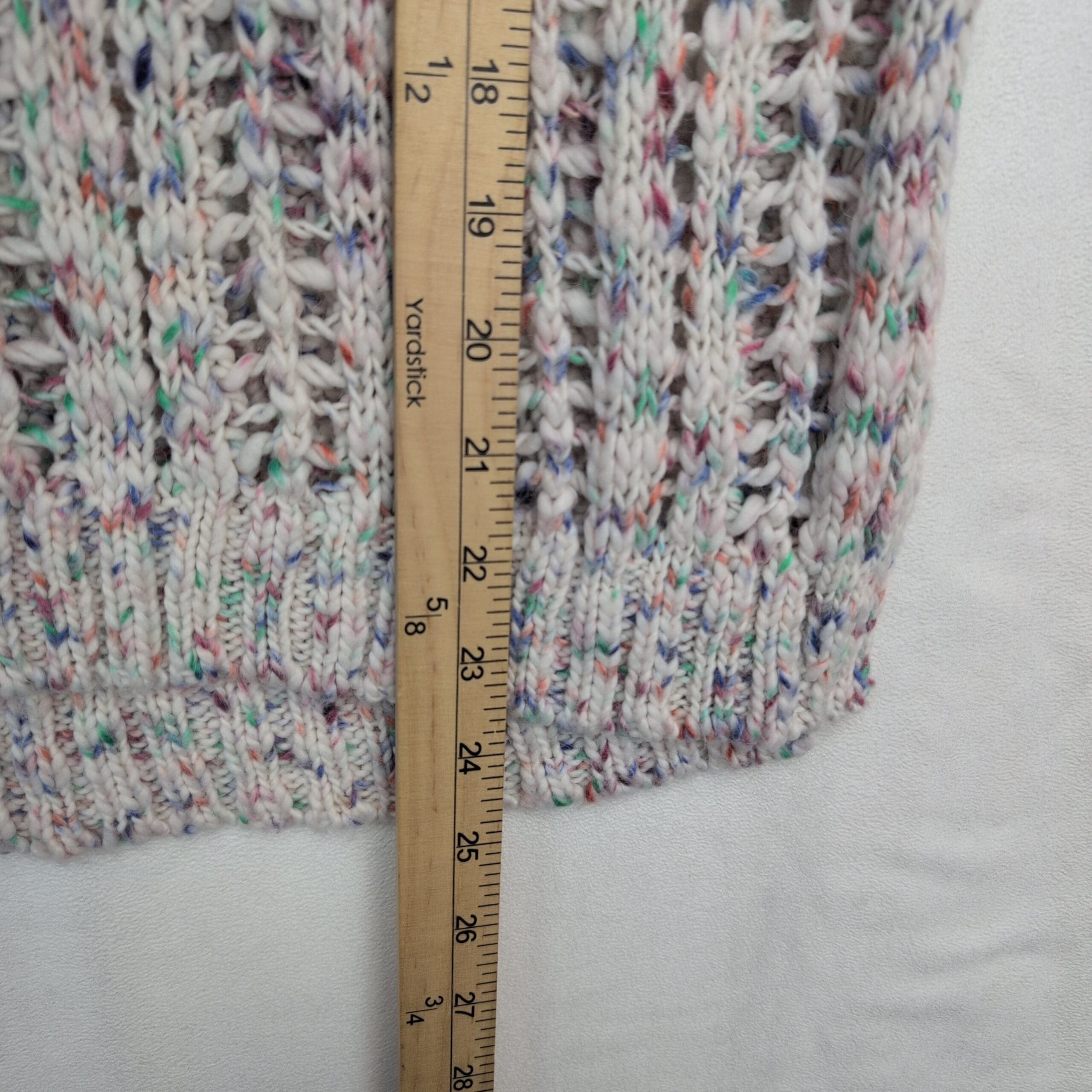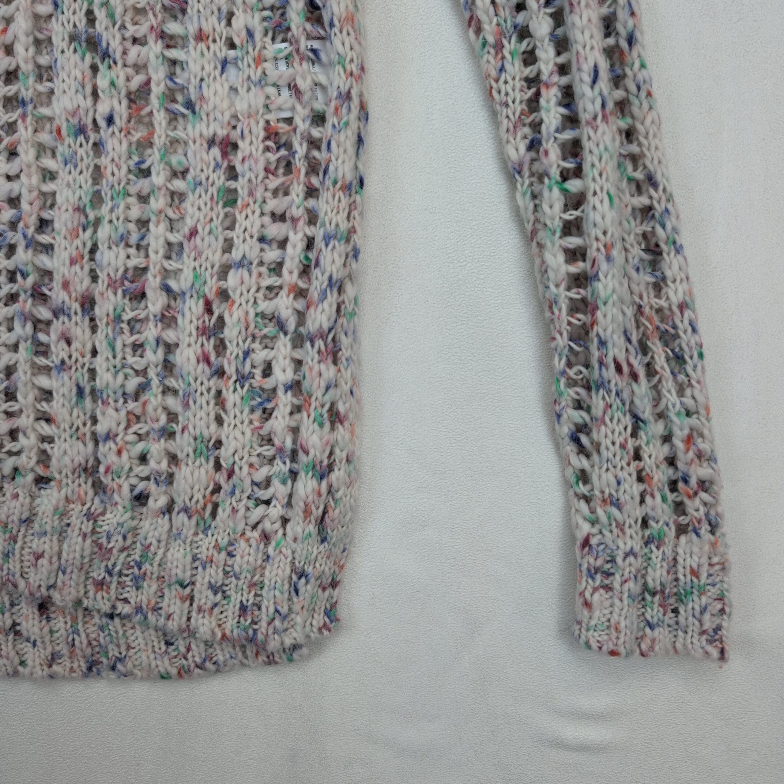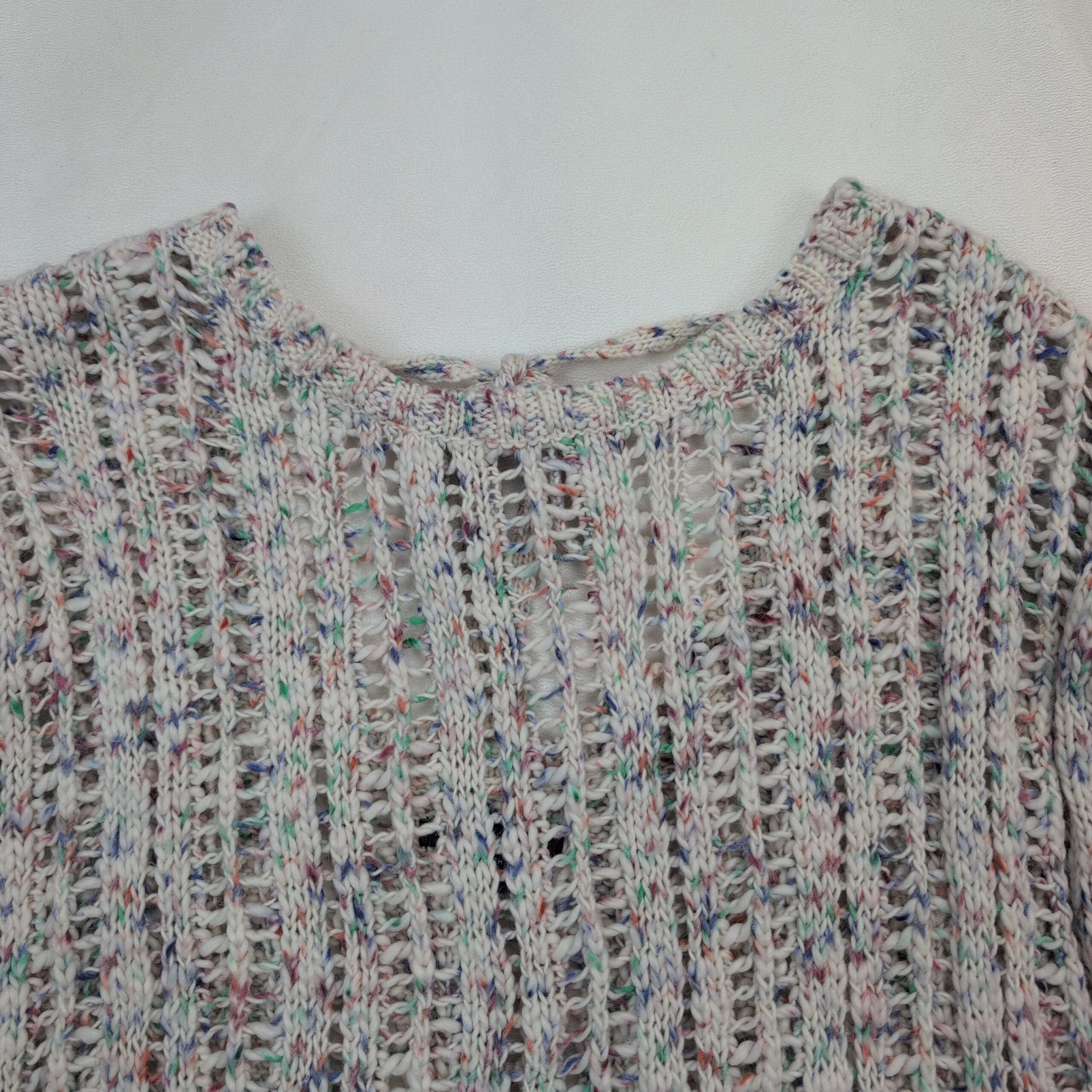 American Eagle Outfitters women’s sweater in size S. Cream/ivory open-knit with multicolor speckled flecks throughout for a subtle confetti look. Lightweight, slightly sheer ribbed crewneck with long sleeves and ribbed hem (slightly longer in back). Great for layering over tanks or pairing with jeans for a casual, cozy look. Condition: Excellent used condition — free of major rips, tears, stains, or flaws; may show gentle, typical wear consistent with normal use. Composition and original tags not listed.