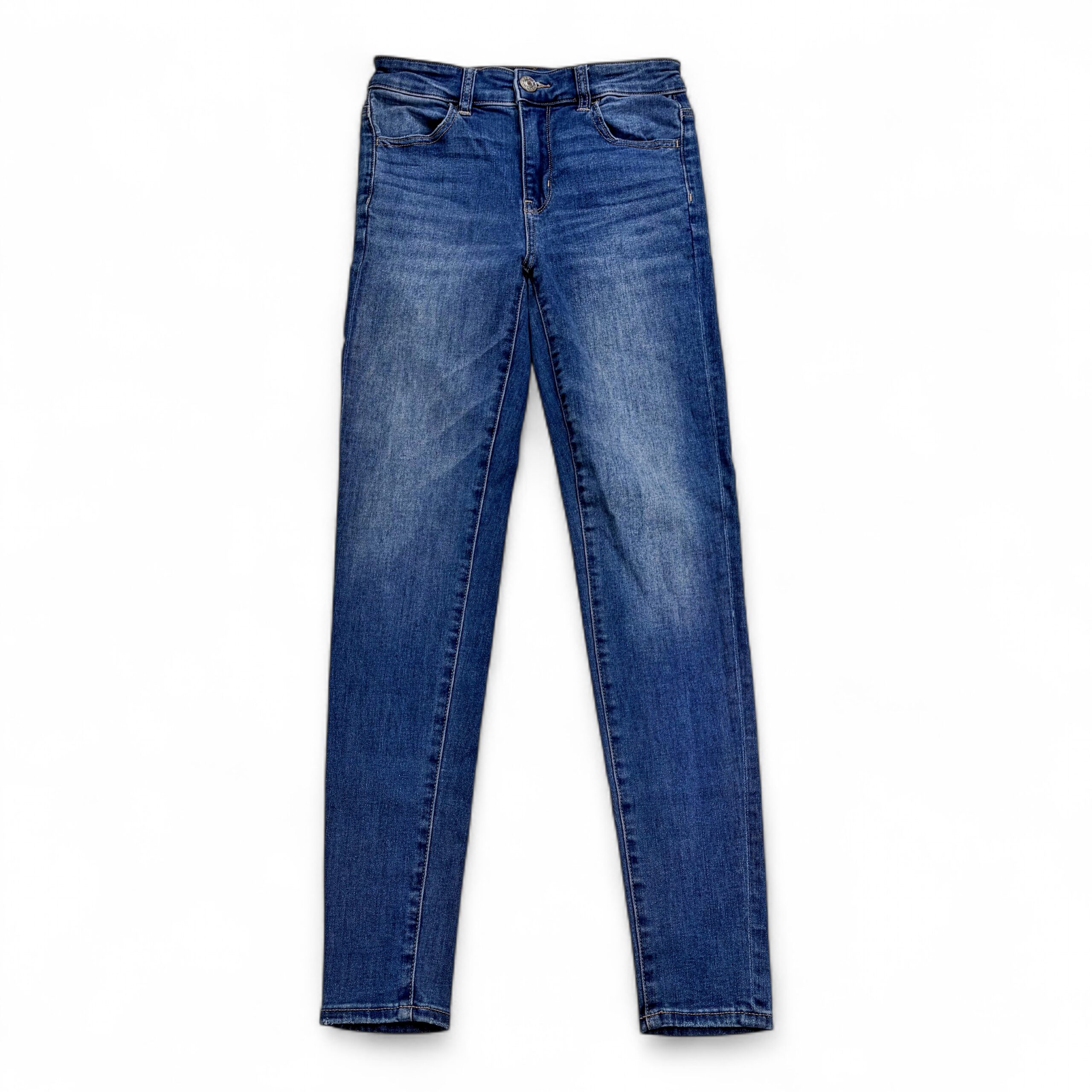 American Eagle Outfitters women’s skinny jeans, Size 2. Medium blue wash with subtle whiskering and light fading at the thighs for a lived-in look. Stretch denim offers a snug, comfortable skinny fit with classic five-pocket styling and zip-button closure. Condition: Excellent used condition — free of major rips, tears, or stains; shows typical light wear and fading consistent with prior wear.