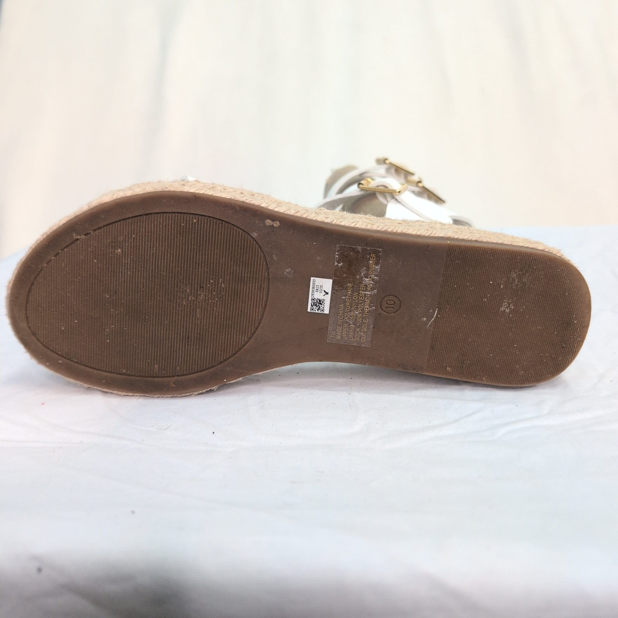 American Eagle Outfitters white multi-strap espadrille gladiator sandals in women’s size 10. Features ankle buckles, braided jute-wrapped platform sole, and a cushioned footbed for casual summer wear. Gently used and free of major rips, tears, or stains; typical wear may be present. Noted condition: light discoloration on the footbed, faint scuffing on a few straps, and minor soiling on the jute platform. Buckles and straps are intact and functional.
