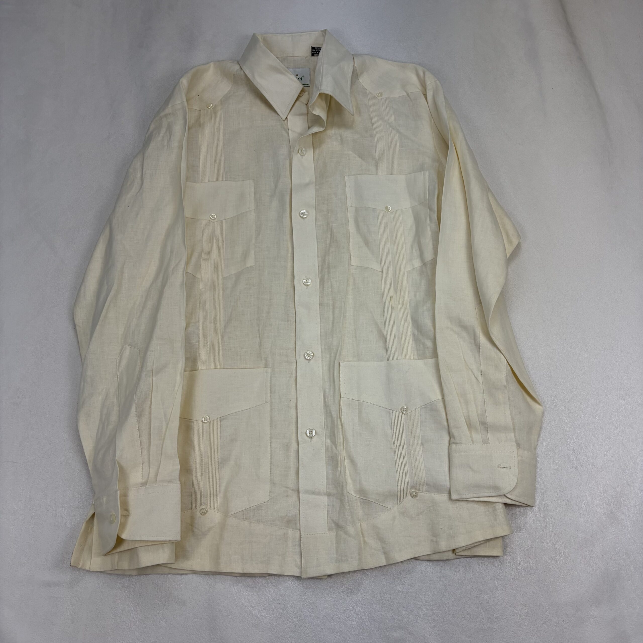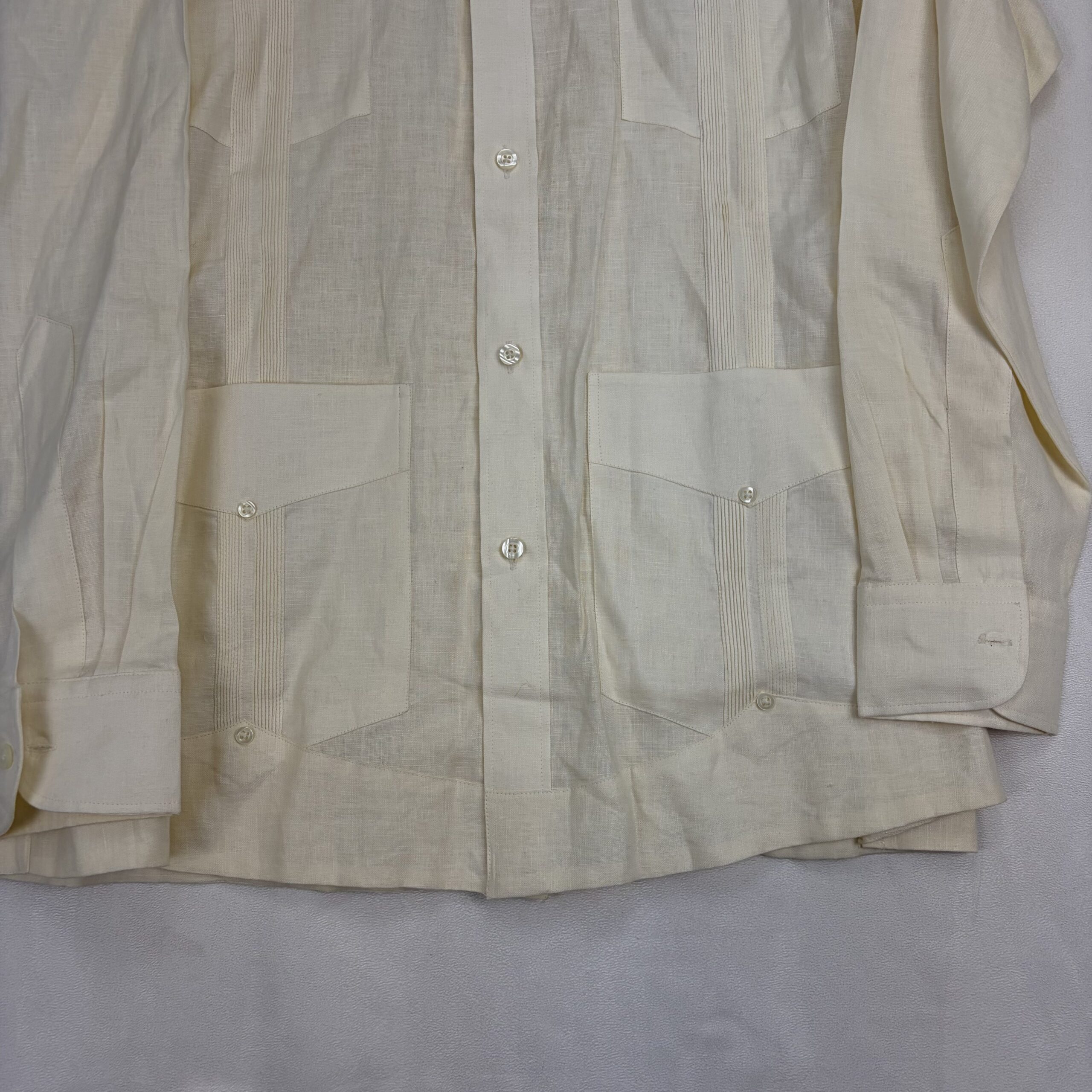 Classic Anabrisa men’s guayabera dress shirt in size L. Ivory/cream lightweight woven fabric with traditional details: four front patch pockets with button closures, vertical pintuck pleats on the front panels, full button-front closure, long sleeves with button cuffs, and a spread collar. Excellent used condition — clean and free of major rips, tears, or stains; shows light signs of normal wear consistent with gentle use. See photos for close-up details and fabric texture.