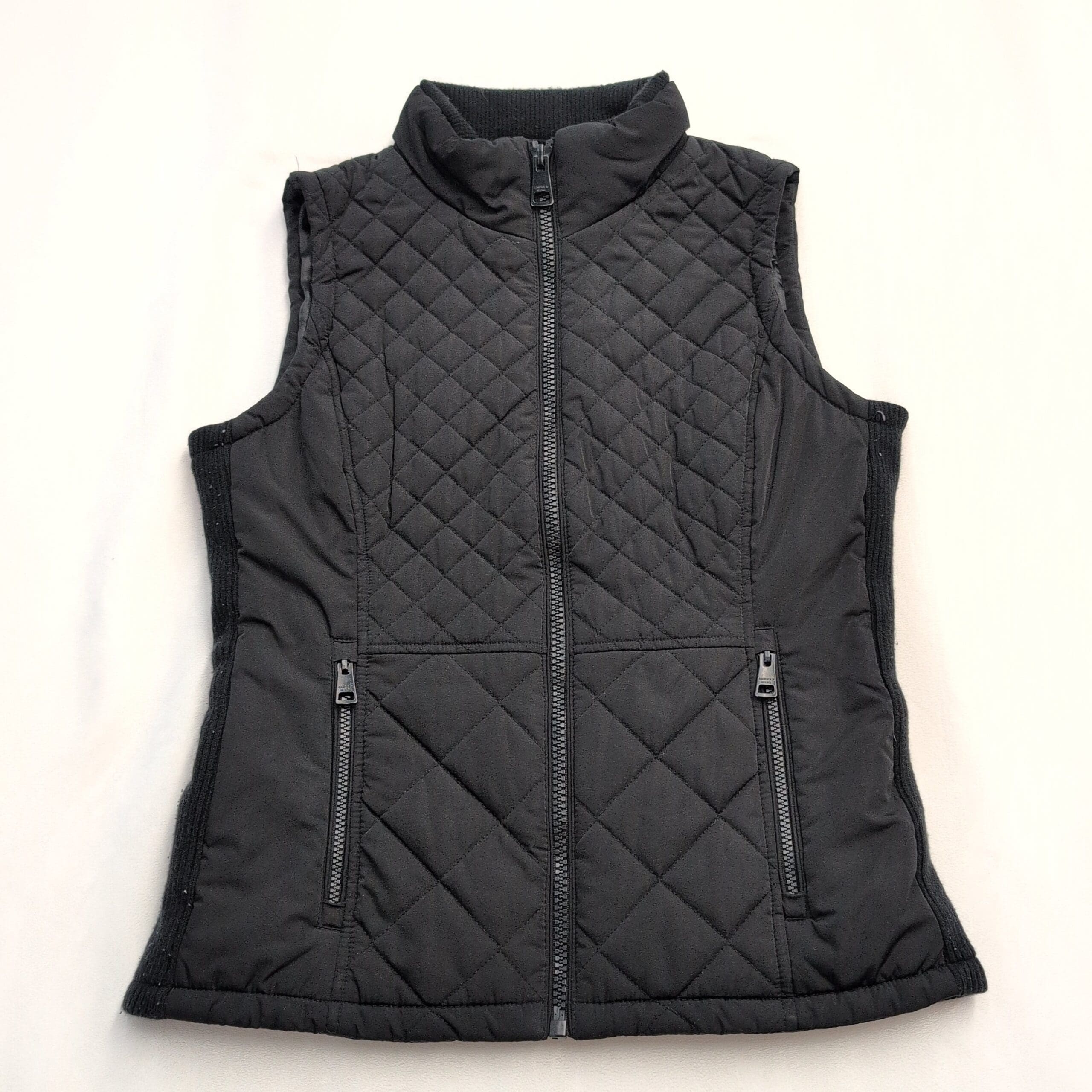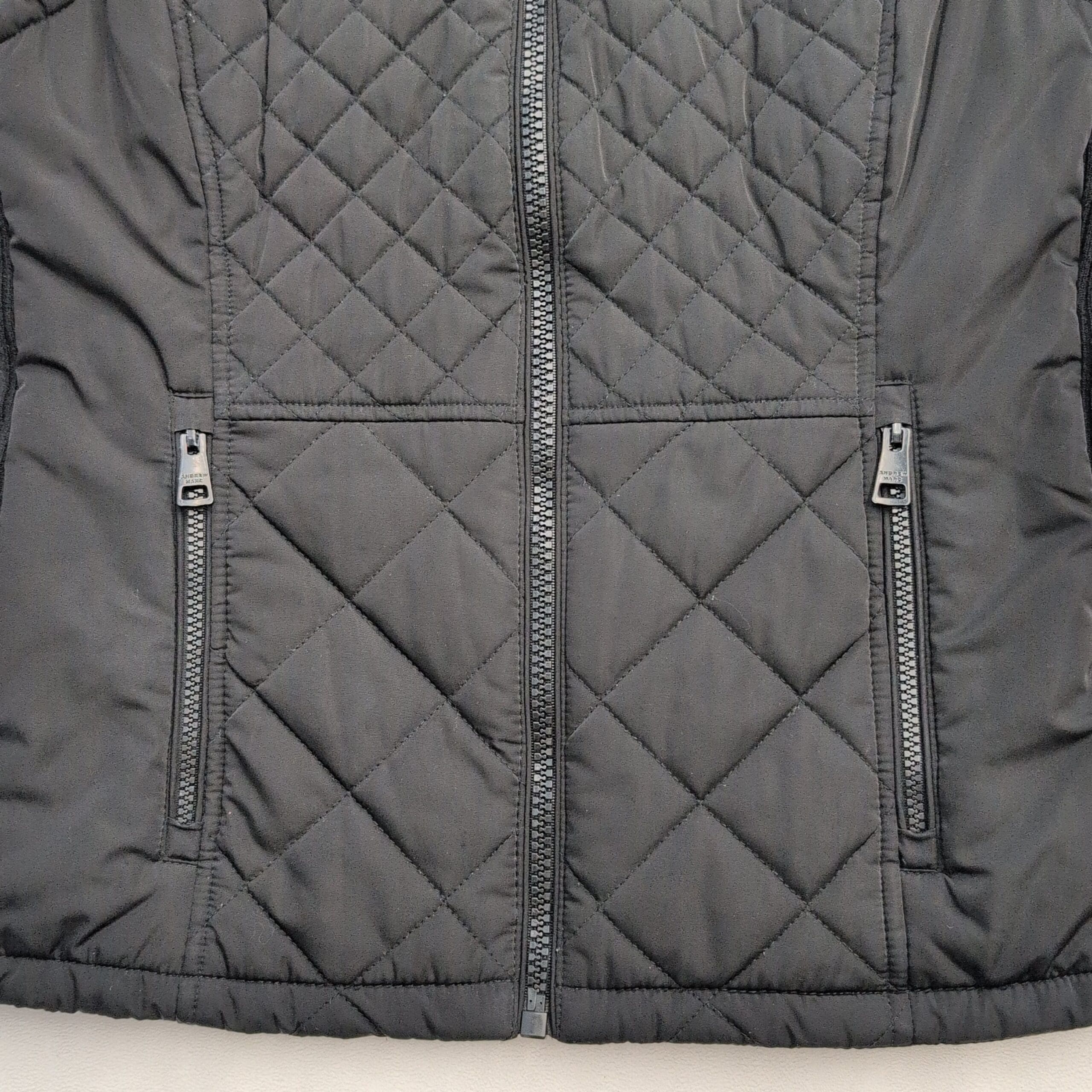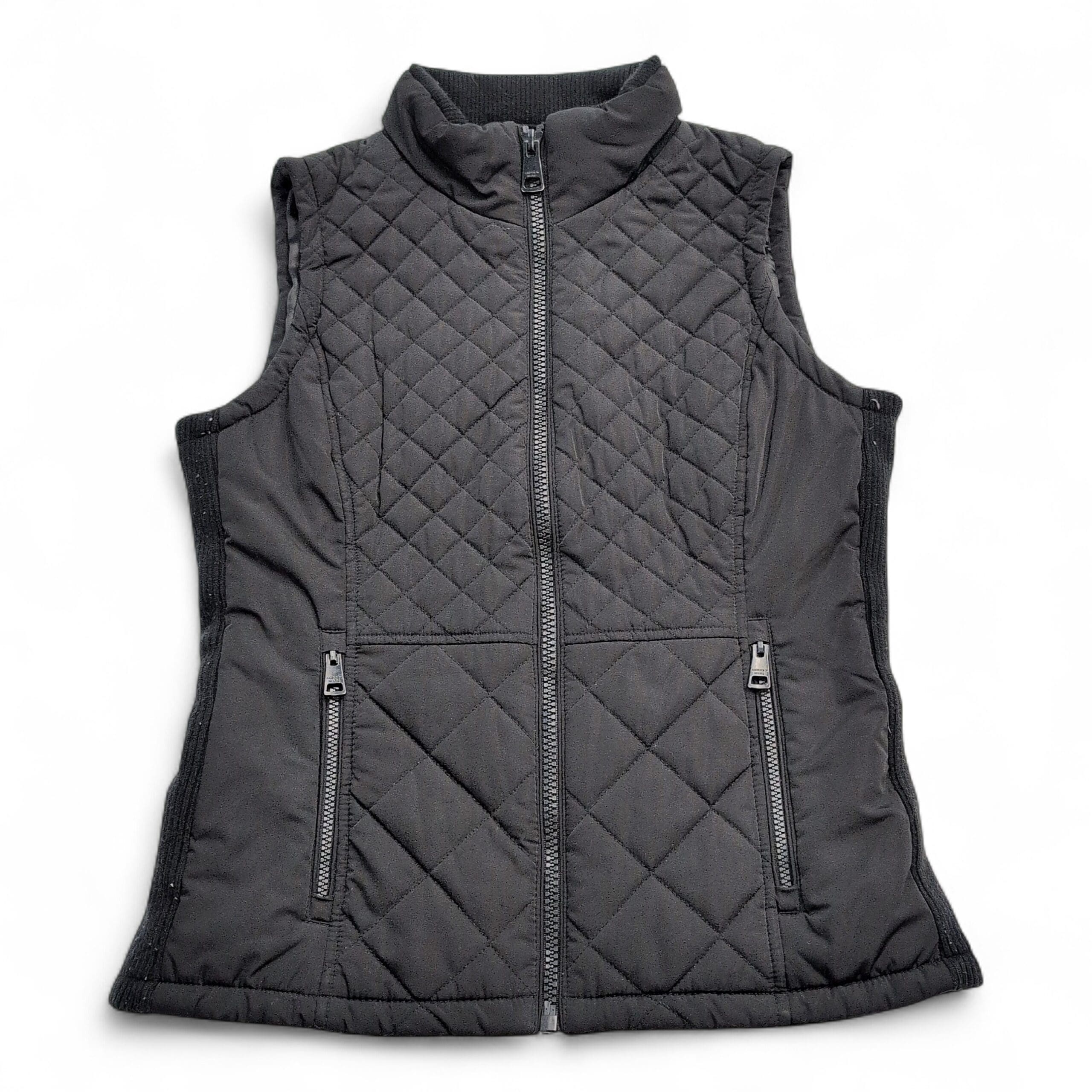 Black quilted Andrew Marc women’s vest in size S. Diamond-quilted front with lightweight insulation, full-length center zip, stand-up collar, knit side panels for a contoured fit, and two zippered front pockets. Versatile layering piece for fall/spring or travel. Excellent used condition — clean and free of major rips, tears, or stains; typical light wear consistent with previous use. Fabric content not listed; please review photos for details.